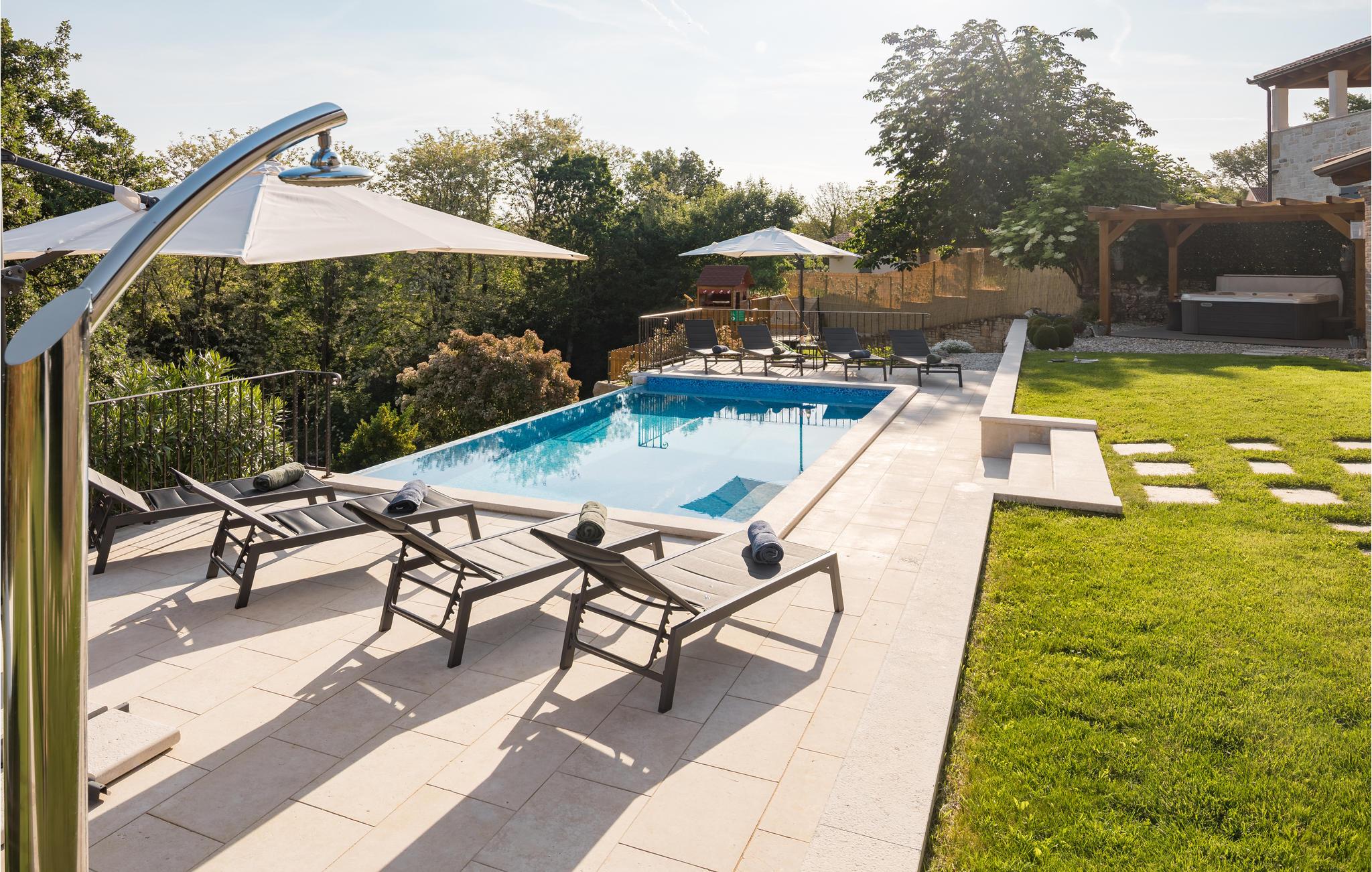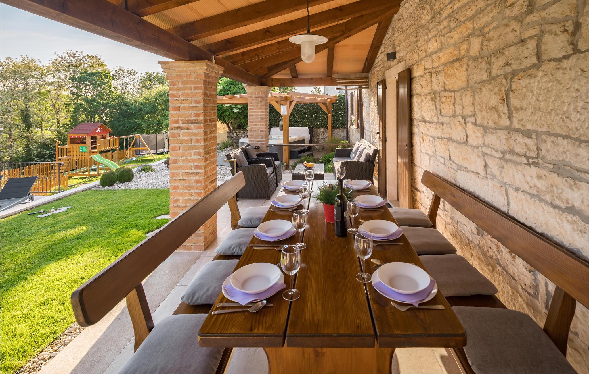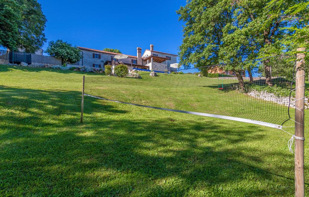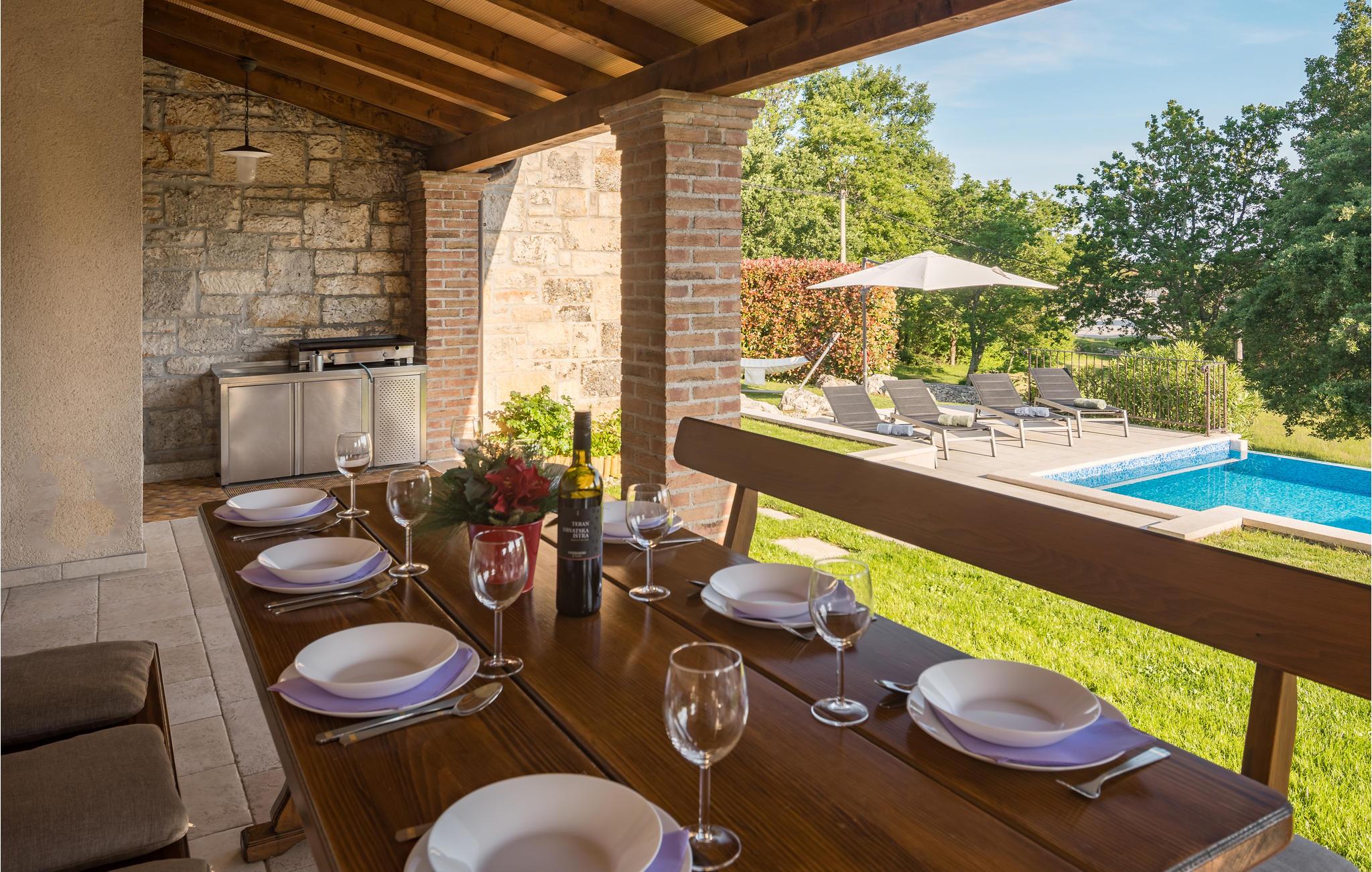 Dette skønne feriehus er gennemrenoveret med bevarelse af husets helt originale og unikke stil. Huset er både komfortabelt og har en skøn atmosfære. I stueplan er der et køkken med spisehjørne, et stort opholdsrum med kamin og et aktivitetsrum med billardbord. Indre trapper fører op til første sal med soveværelser og et legerum med PlayStation. Grunden er delt i to. Den mindste del er en overdækket parkeringsplads, mens dens største del er anlagt i flere planer, med pool og en stor overdækket terrasse. Til denne del af haven er der adgang fra stuen. Der er femten minutter i bil til Porec.