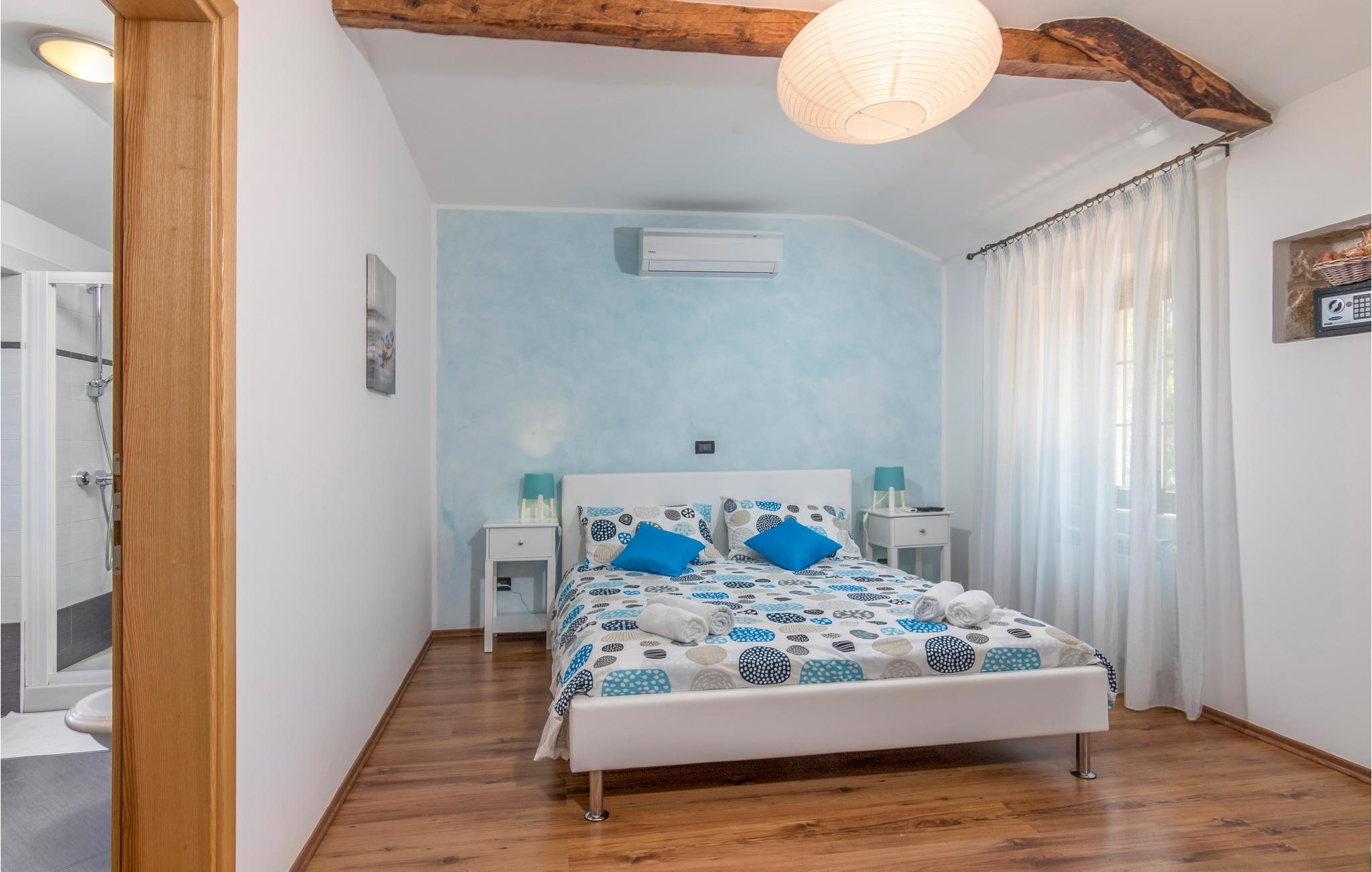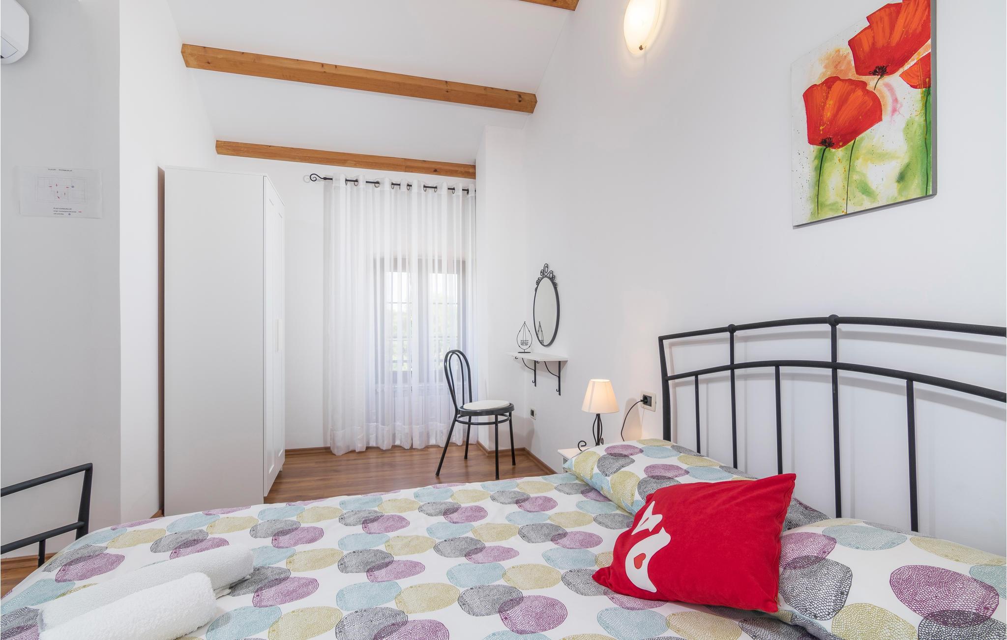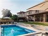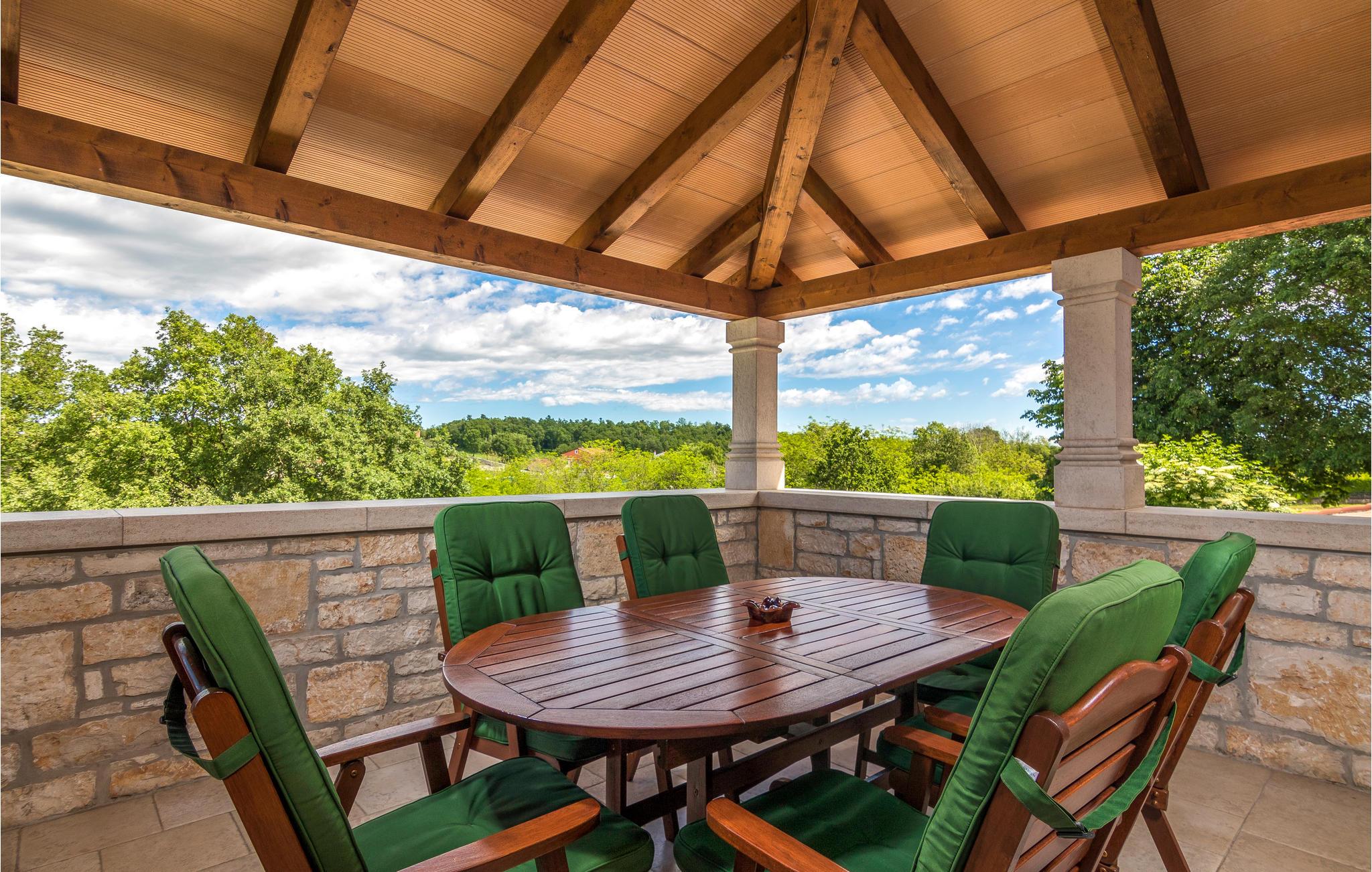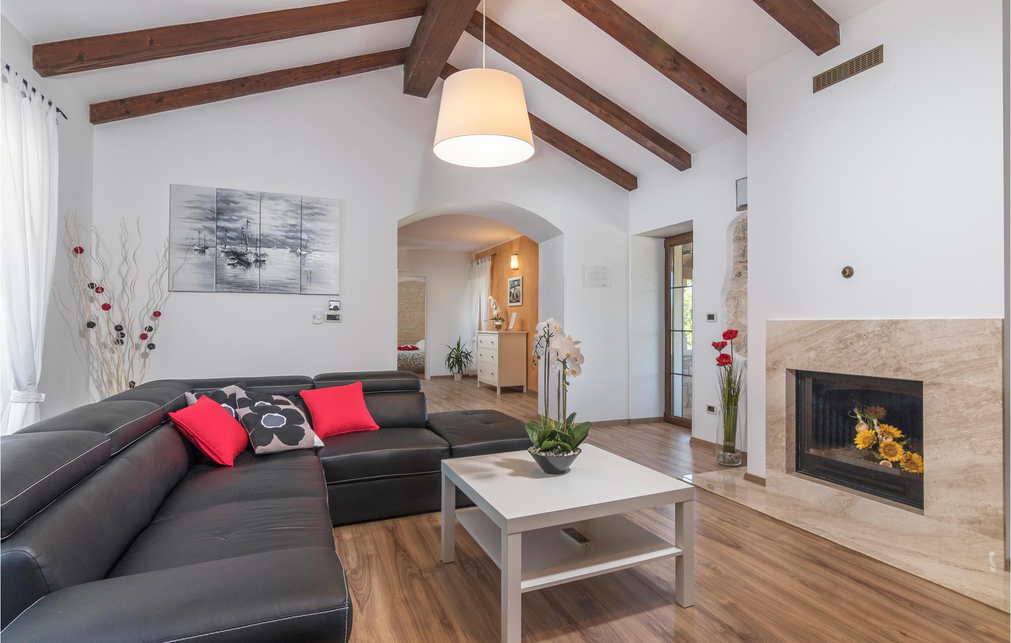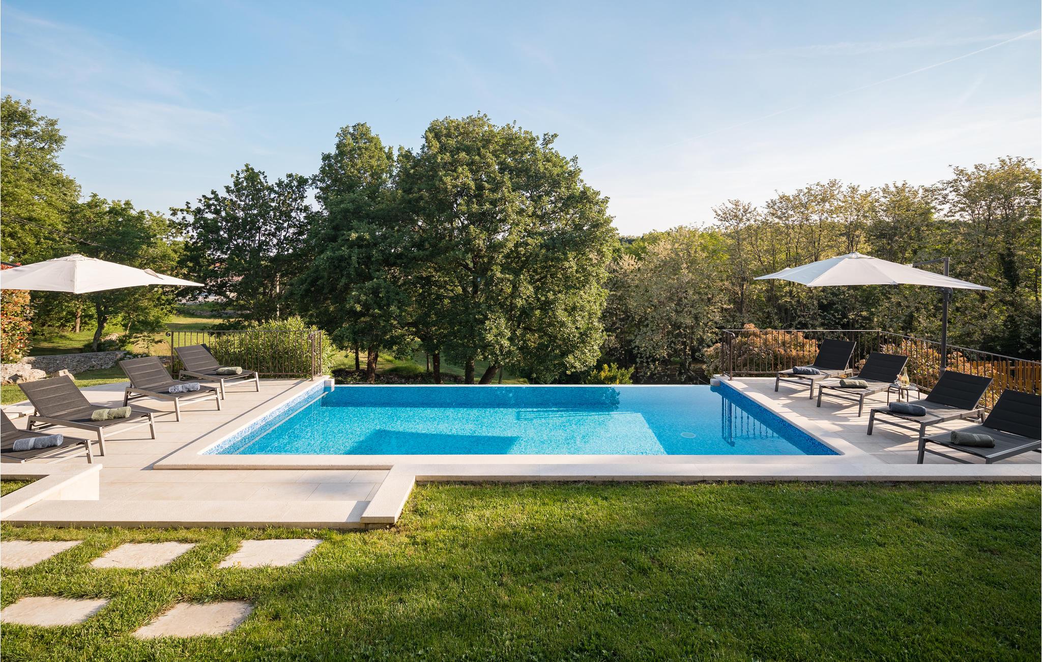 Dette skønne feriehus er gennemrenoveret med bevarelse af husets helt originale og unikke stil. Huset er både komfortabelt og har en skøn atmosfære. I stueplan er der et køkken med spisehjørne, et stort opholdsrum med kamin og et aktivitetsrum med billardbord. Indre trapper fører op til første sal med soveværelser og et legerum med PlayStation. Grunden er delt i to. Den mindste del er en overdækket parkeringsplads, mens dens største del er anlagt i flere planer, med pool og en stor overdækket terrasse. Til denne del af haven er der adgang fra stuen. Der er femten minutter i bil til Porec.