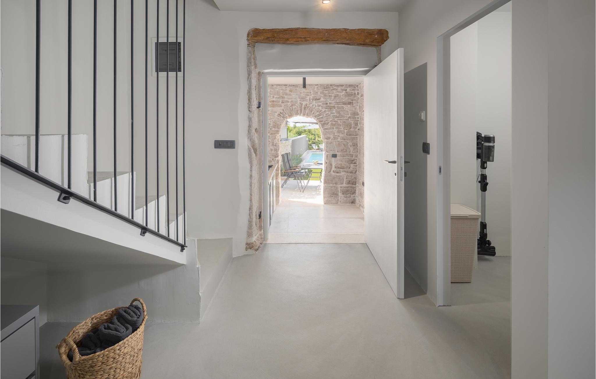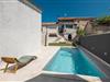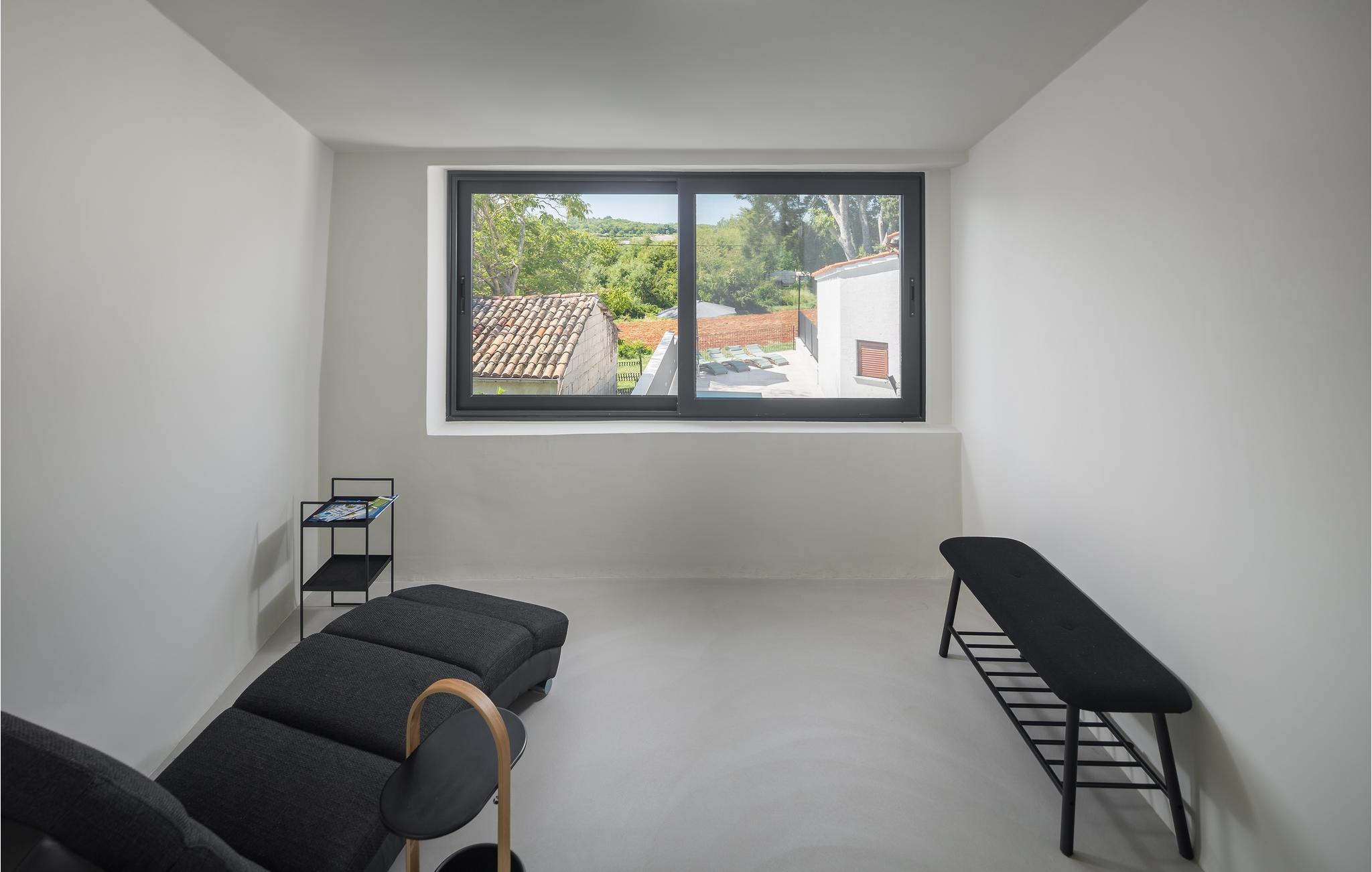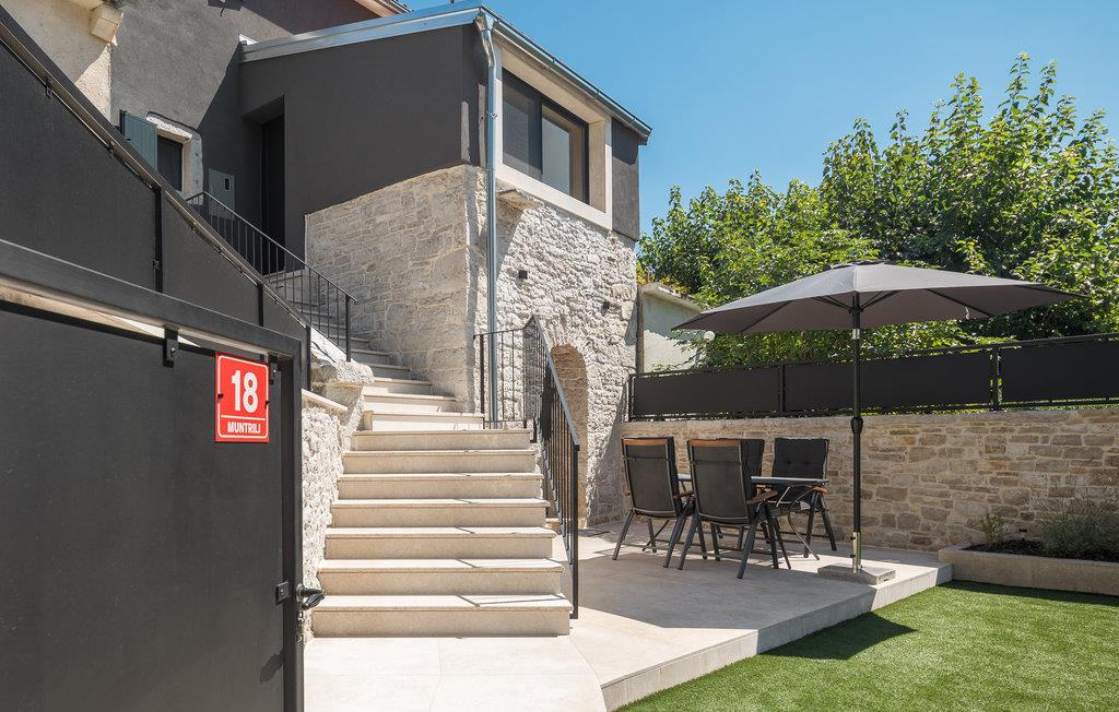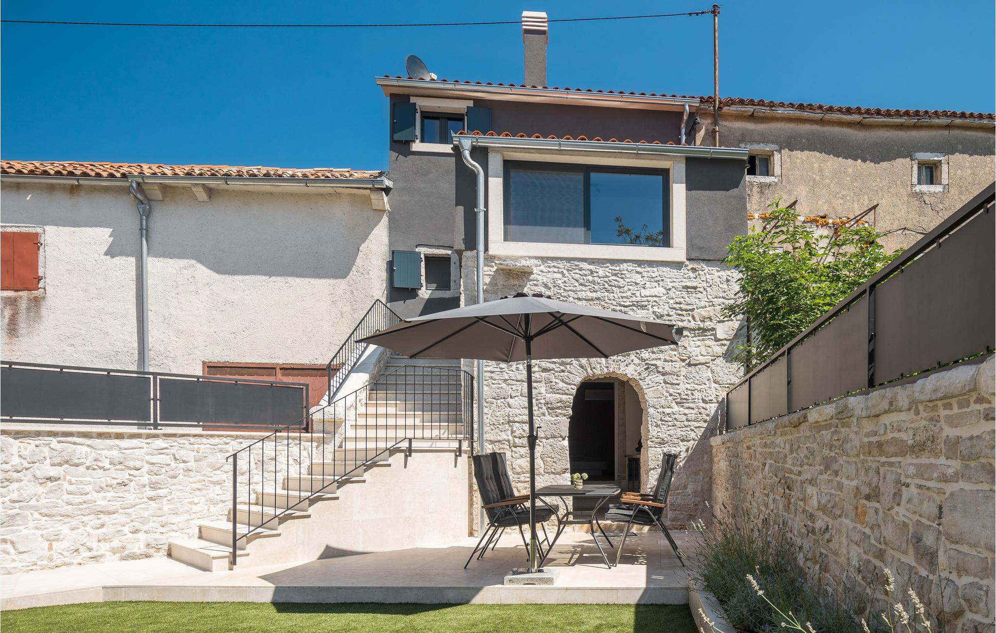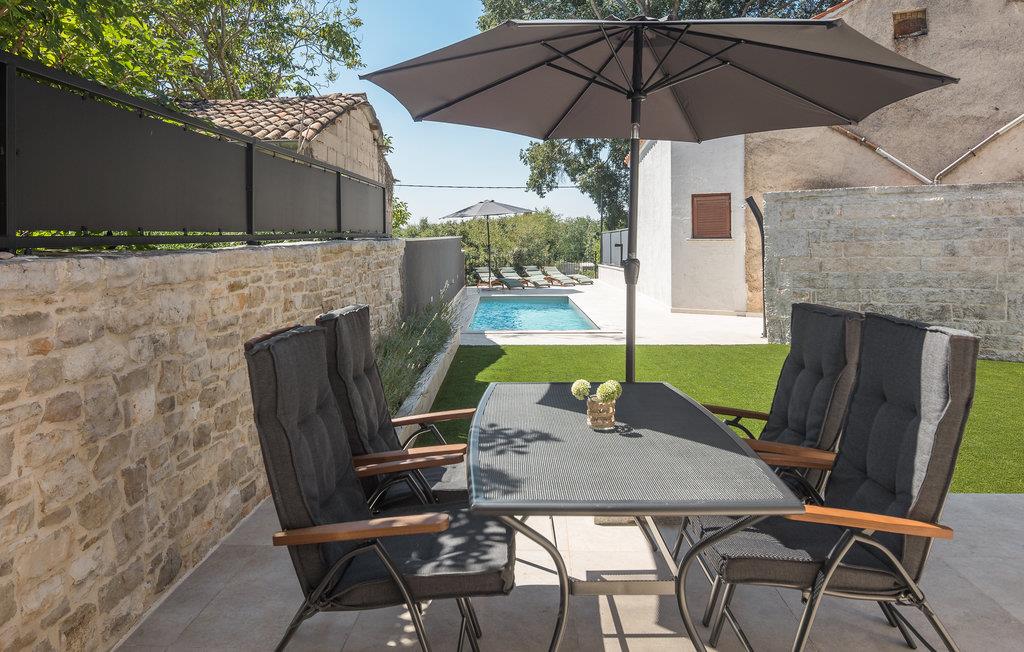 Rækkehus i istrisk stil med pool og udsigt over landskabet.