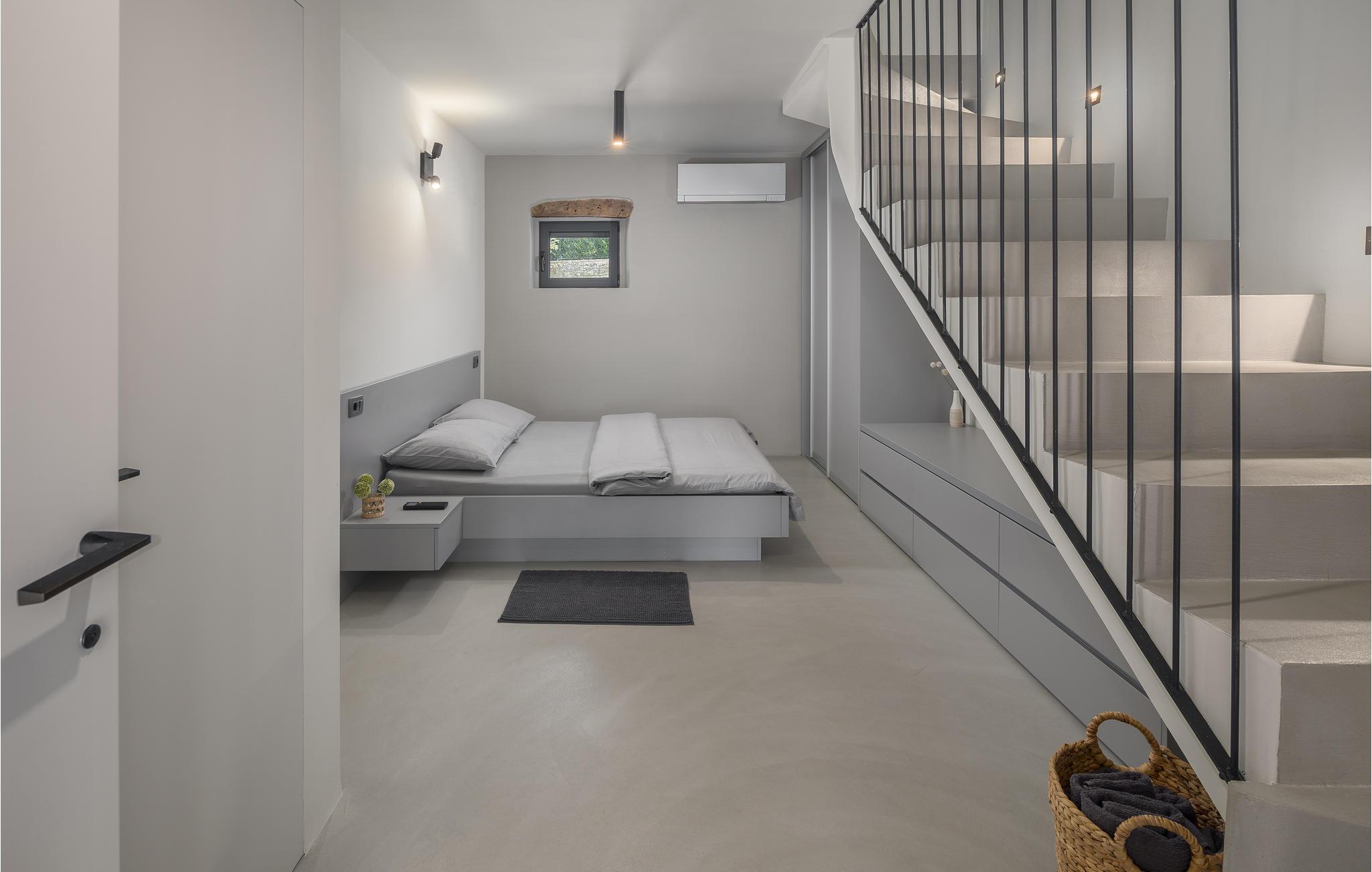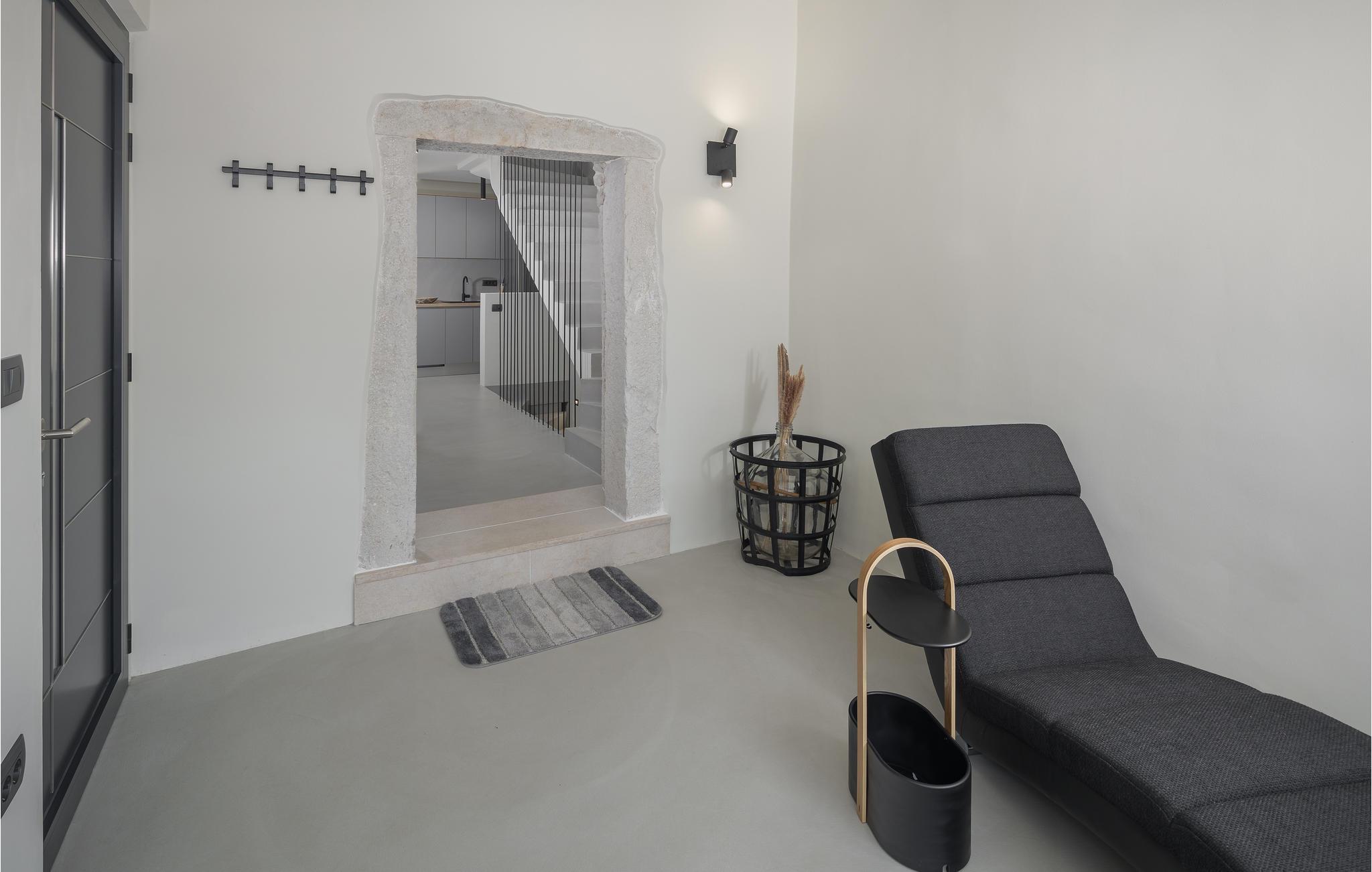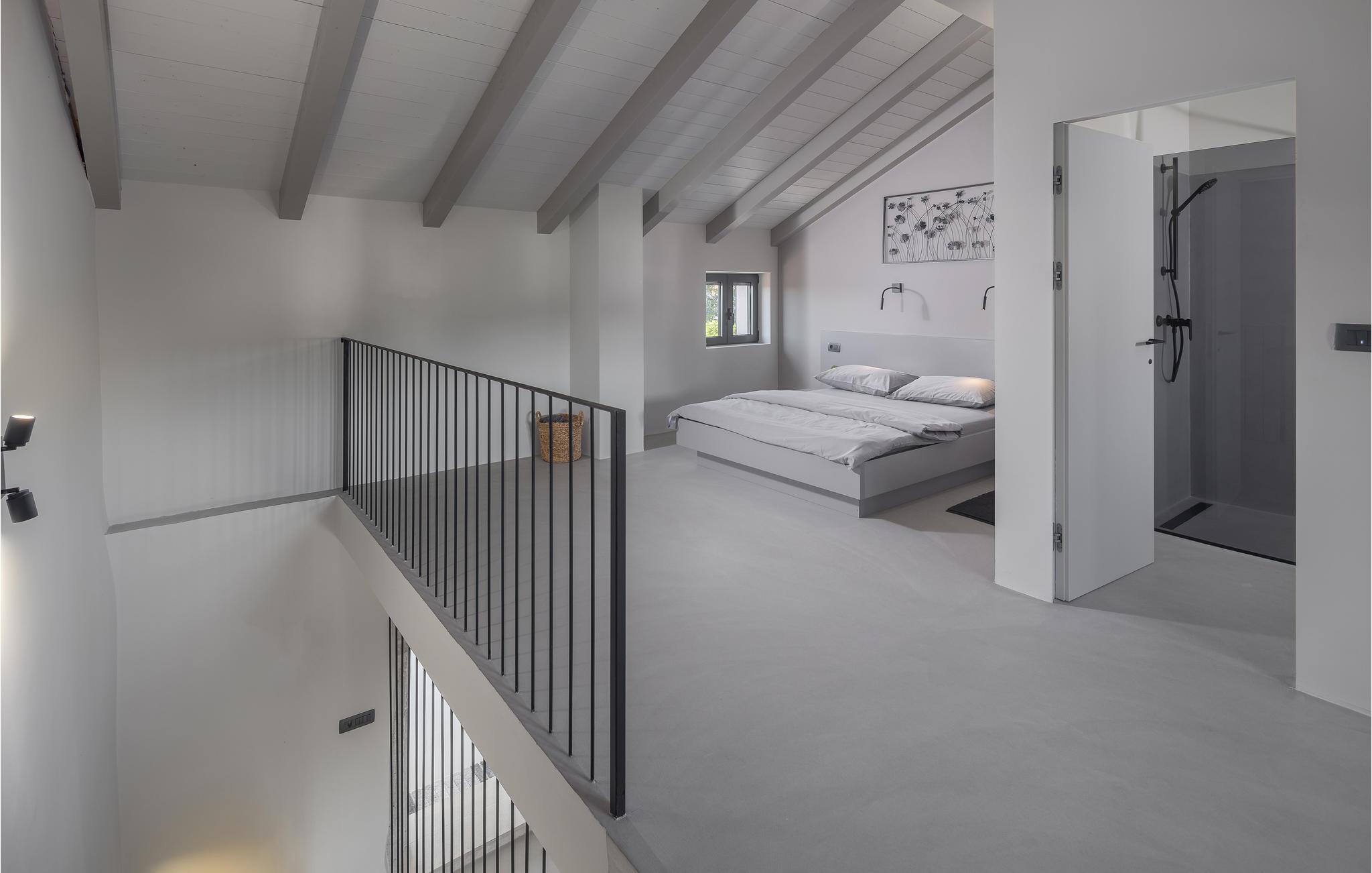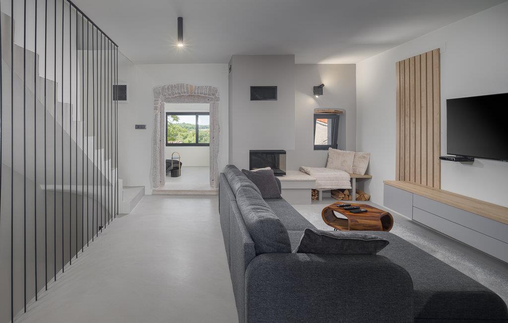 Rækkehus i istrisk stil med pool og udsigt over landskabet.