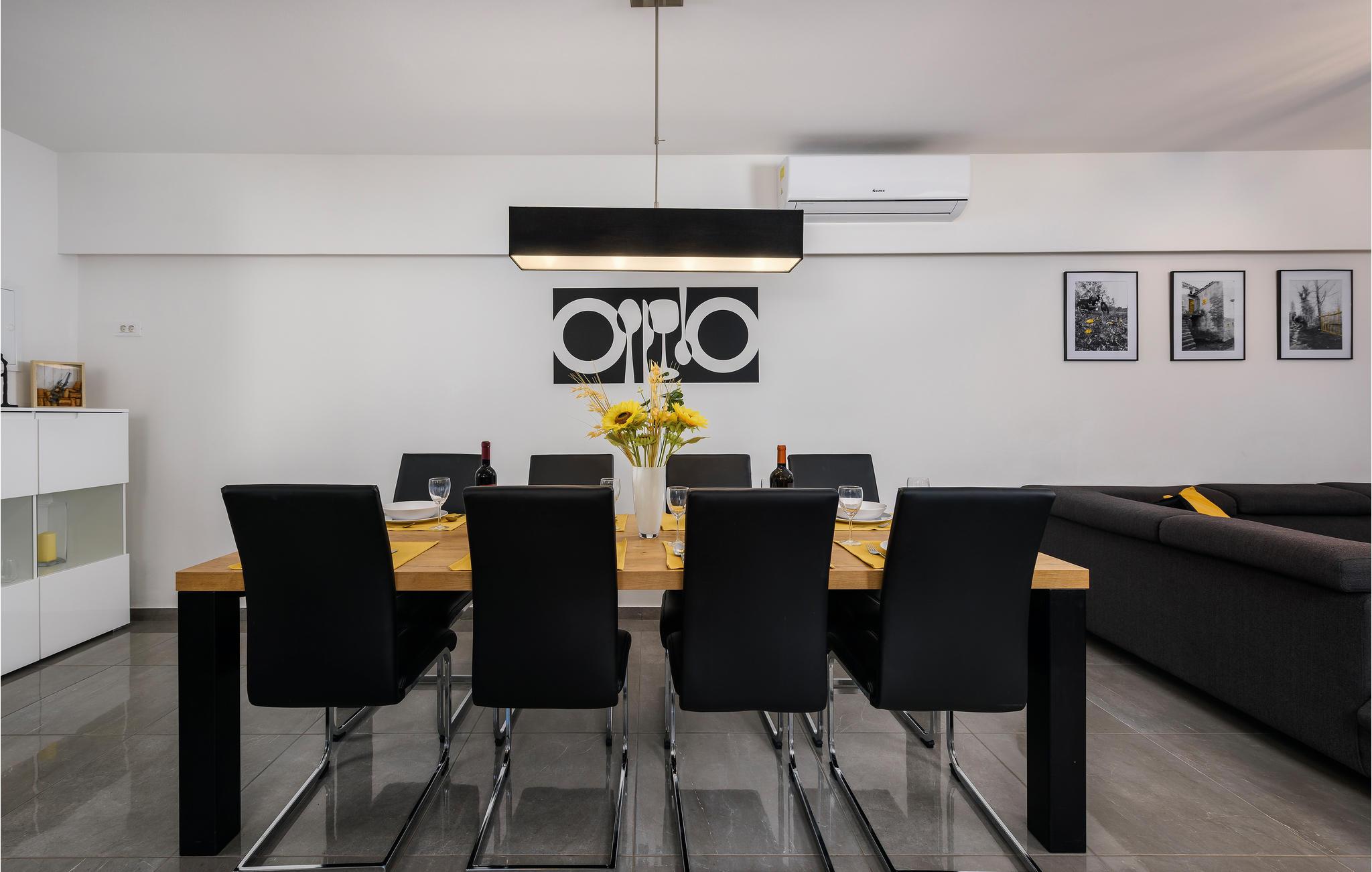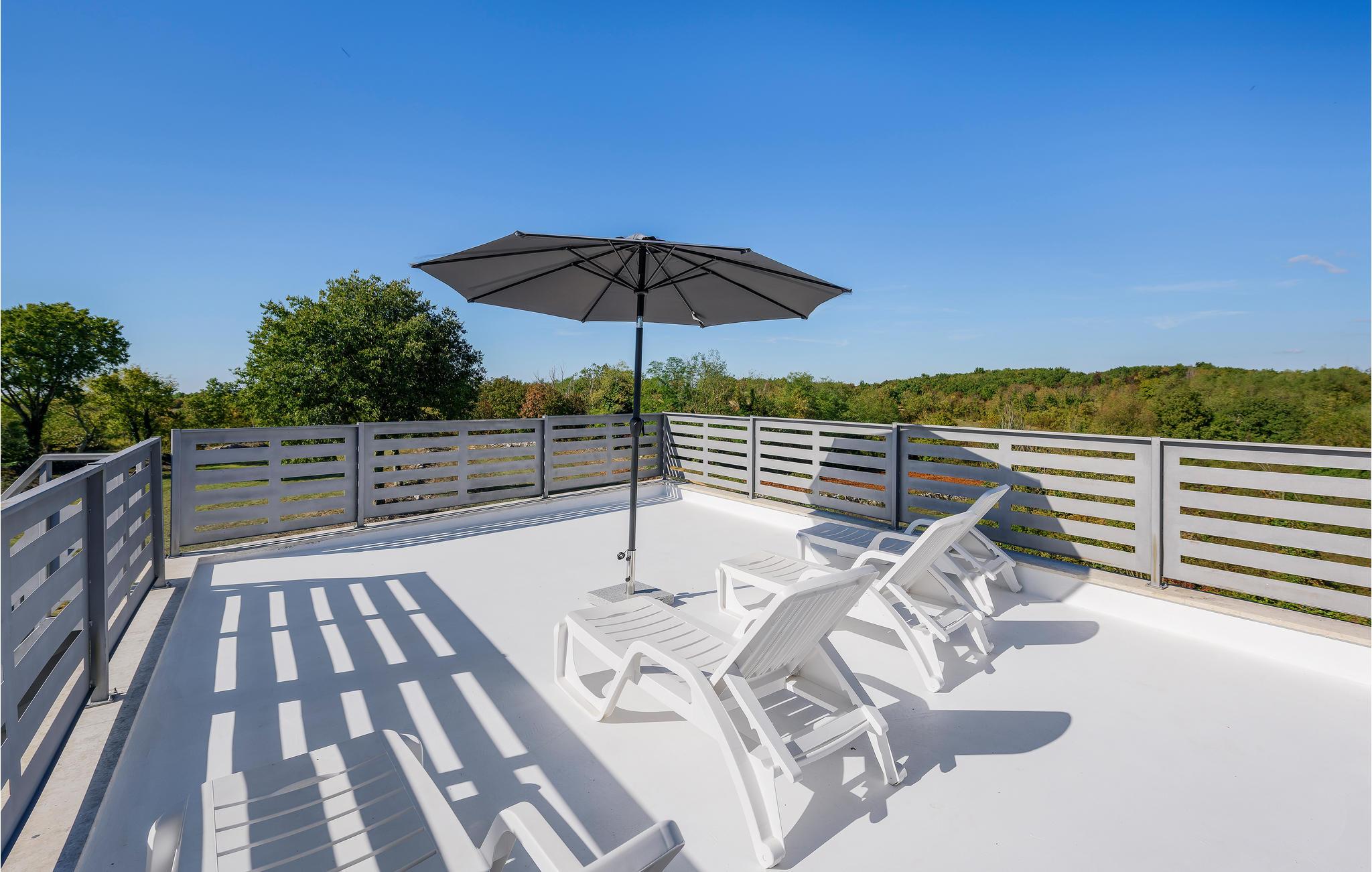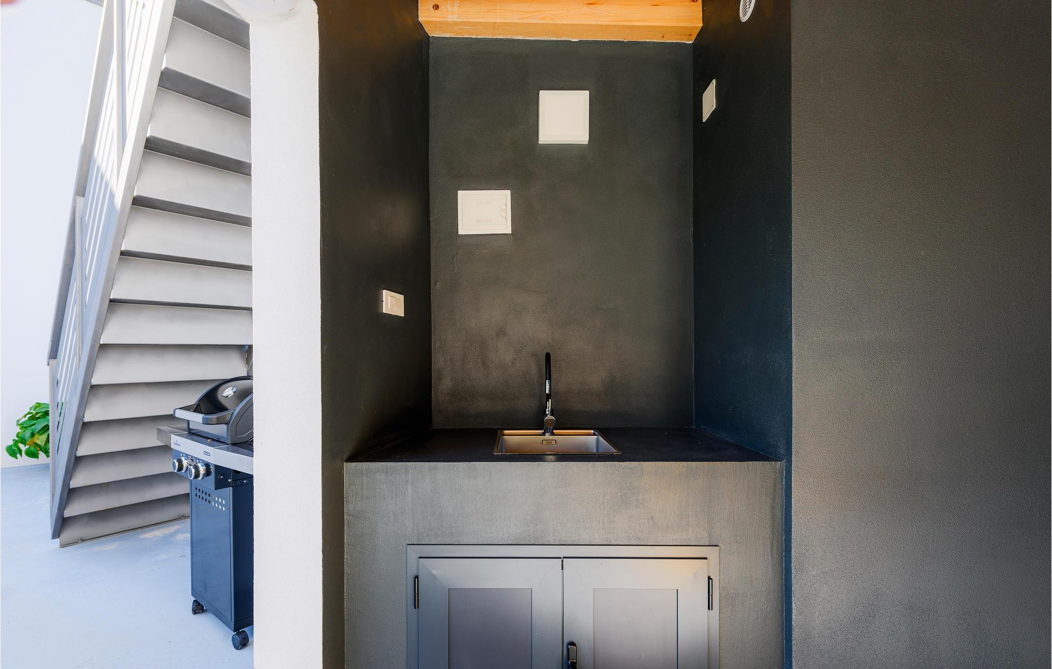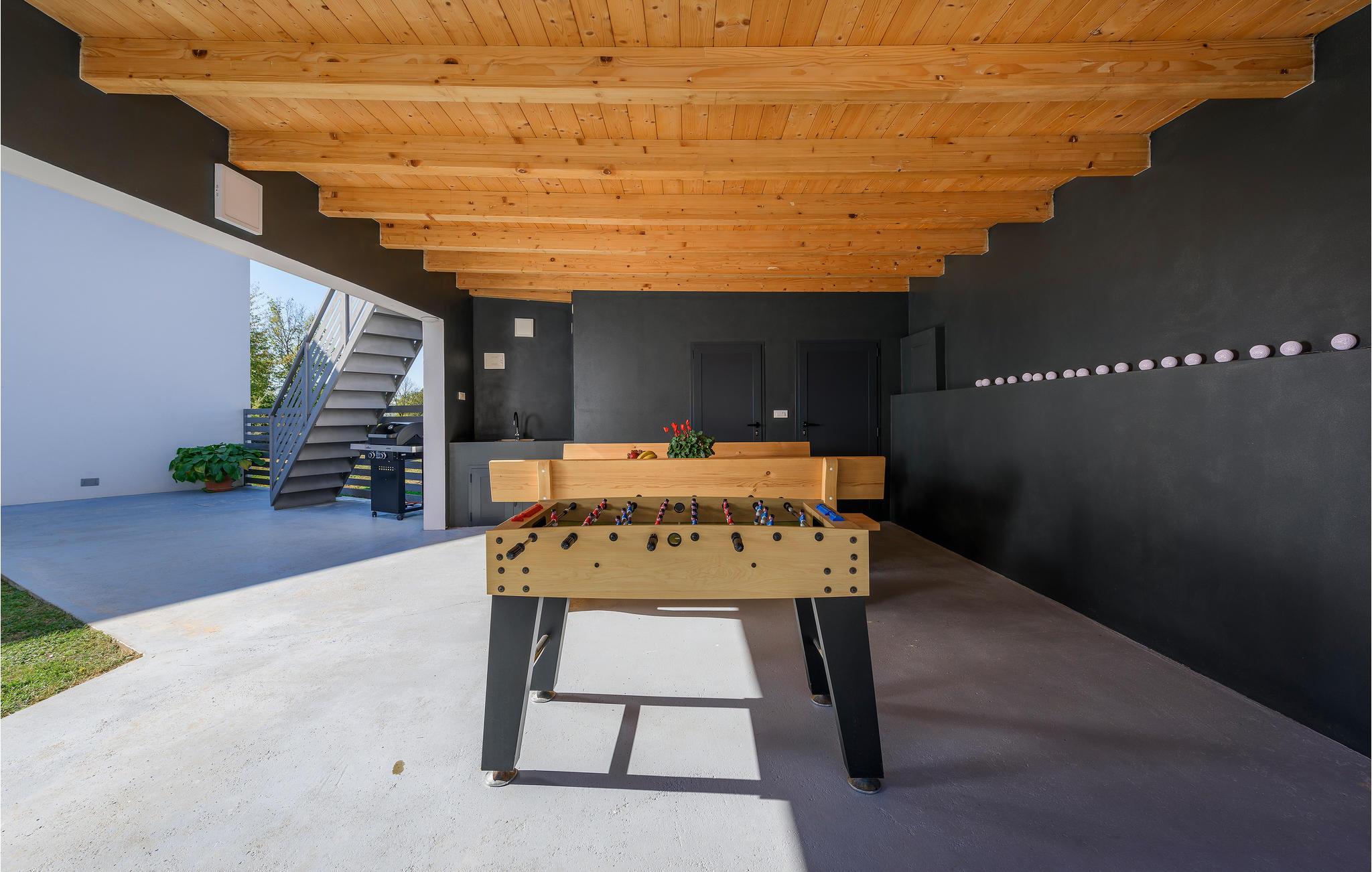 Selvom huset er utroligt lækkert indvendigt, er det udvendigt at det meste af jeres ferie kommer til at foregå. Et højdepunkt er den lækre solterrasse på en hævet platform. Her kan I ligge og bage i solen, og når det bliver for varmt, er der ikke langt ned til poolen eller et spil bordfodbold i skyggen i loungeområdet under solterrassen.