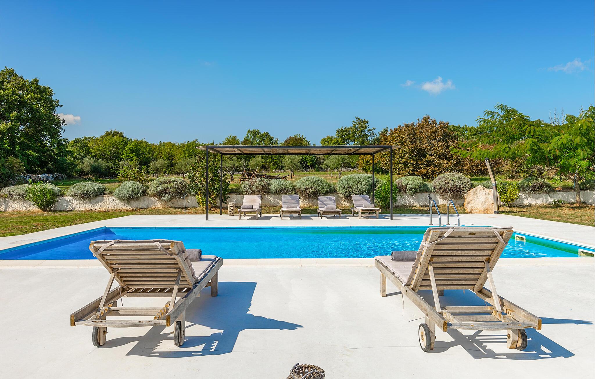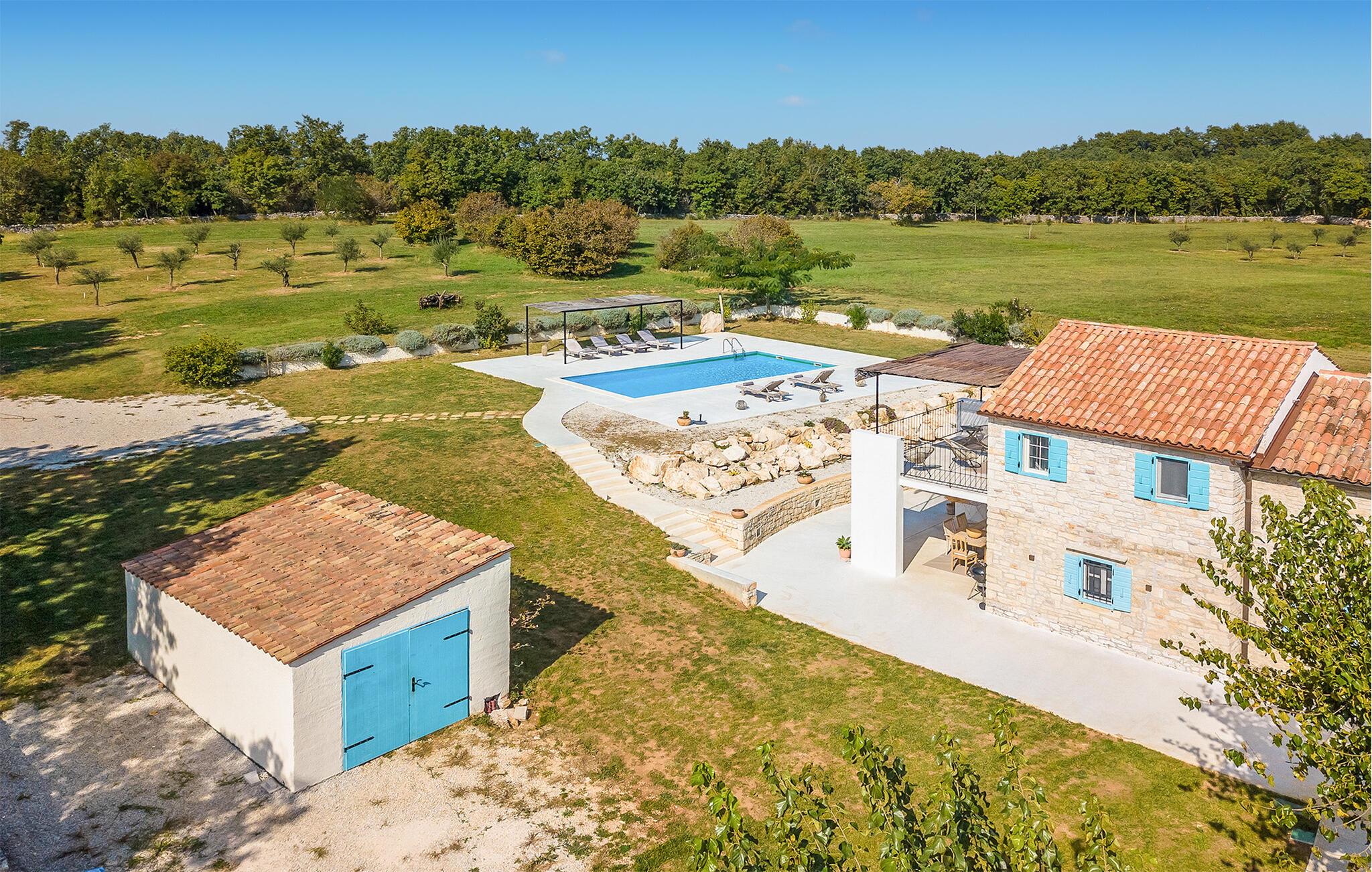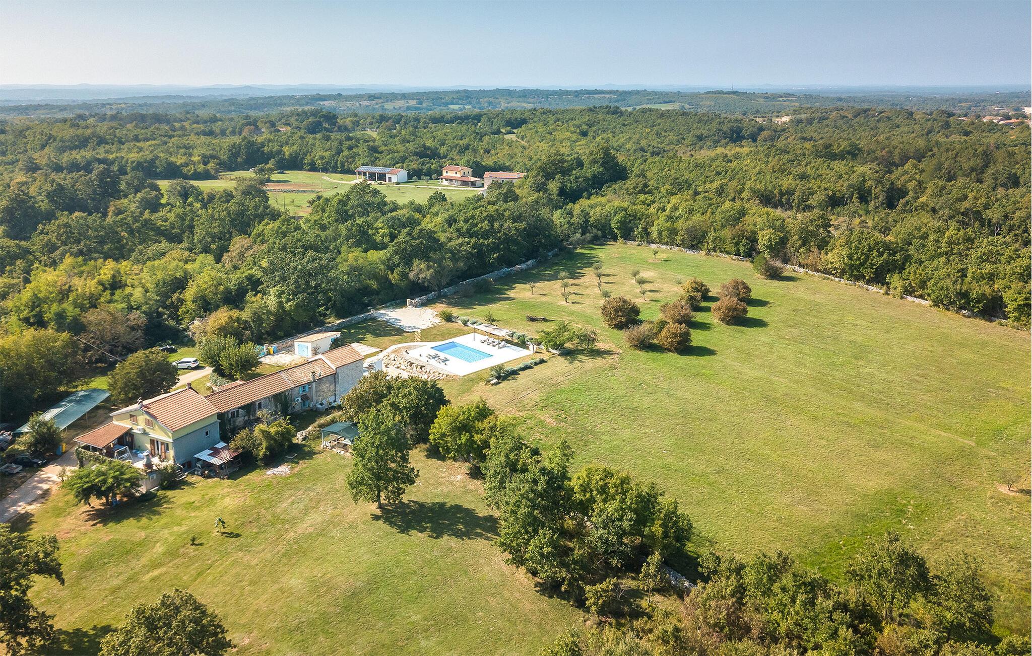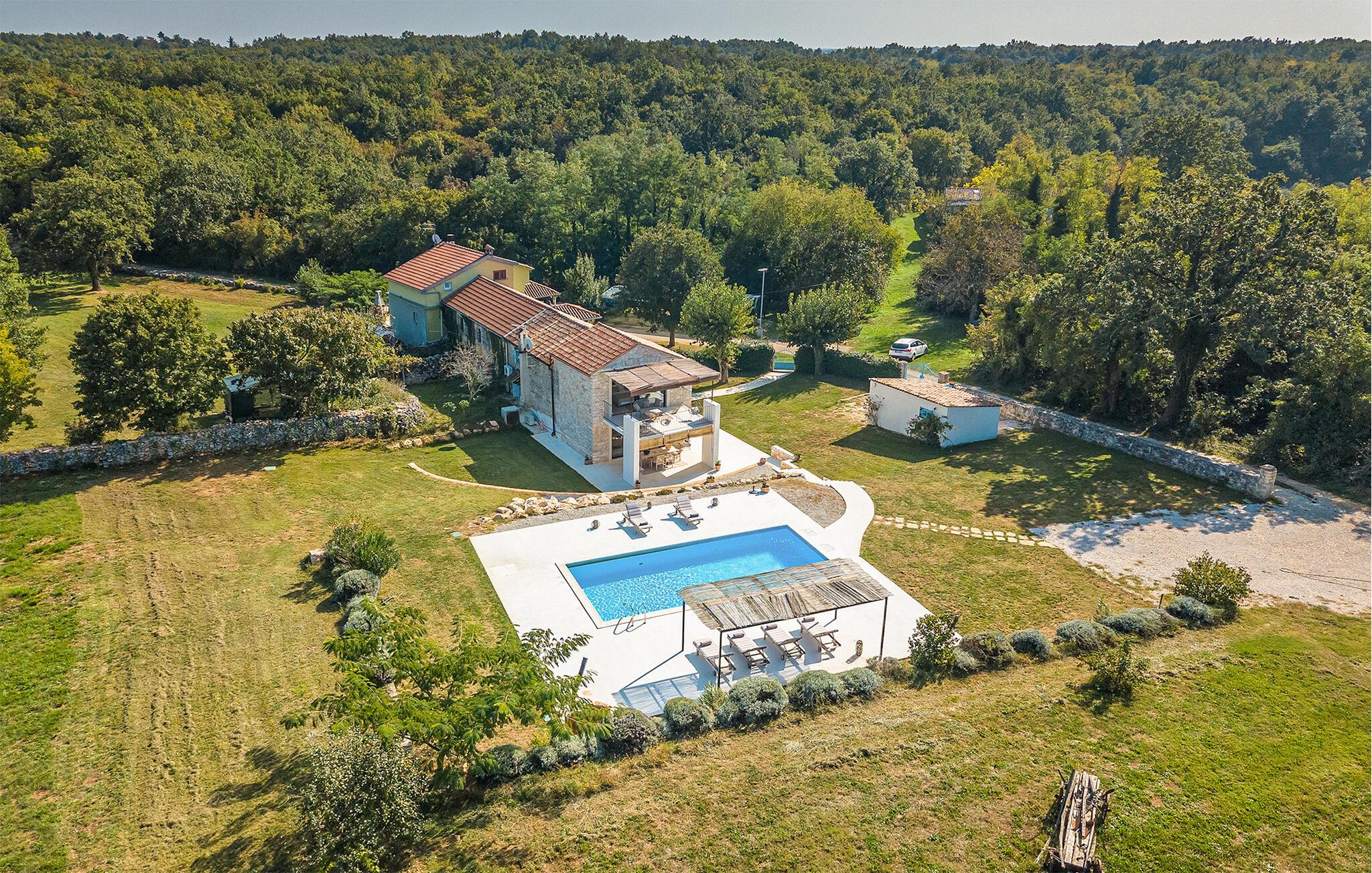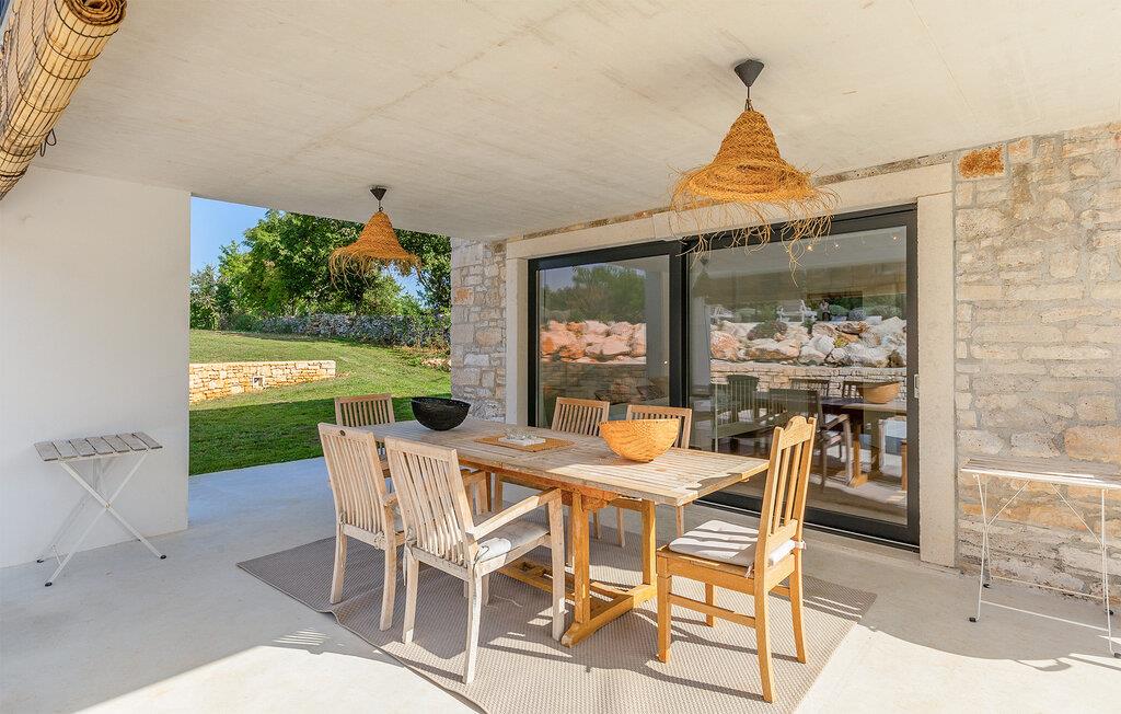 Dette smukt restaurerede traditionelle gamle stenhus, kombineret med moderne stilopgraderinger, ligger på en stor grund med enge og skove rundt omkring. Placeringen er absolut fredelig og afslappende, så du vil kun høre fugle synge. Det eneste, der bryder den afslappende grønne atmosfære, er den smukke og store blå swimmingpool, med sine 50m2. Solsenge og parasoller er der for din tid ude ved poolen, mens dine børn leger og har det sjovt. Det rummelige område omkring poolen giver dig mulighed for at føle dig godt tilpas og nyde udendørslivet. Den overdækkede terrasse har et spisebord, så I kan nyde lækre måltider udenfor. Den omhyggeligt restaurerede Villa Natura med sine stenvægge og trælofter har en masse karakter. I stueetagen vil villaen byde dig velkommen med en åben stue med køkken og spisebord til op til 6 gæster. Der er et hyggeligt lyst soveværelse i samme etage. Trætrapper fører til den øverste etage, som har yderligere 2 soveværelser med dobbeltsenge. Et af soveværelserne har eget badeværelse for din komfort. Der er yderligere et lækkert badeværelse med bruser på denne etage samt separat toilet. Den moderne overdækkede terrasse på første sal byder på en vidunderlig udsigt over marken og dens fantastiske oliventræer. Derudover har værelset i stueetagen og det øverste værelse med terrasse meget store glasvægge, som tilfører naturligt lys og følelsen af at bringe det ydre ind. Om aftenen er det rart at nyde de smukke oplyste omgivelser under det magiske stjernehimmel. Med Villa Natura er du midt i naturen, men ikke for langt væk fra den næste større by - den nærmeste kystby er Porec - kun 20 minutters kørsel. BEMÆRK: Nye billeder kommer til foråret :) Istrien er virkelig en fryd for øjet. Dens vandløb strømmer til havet gennem dybe dale og kløfter, som leder tankerne hen på de gamle lokale myter om kæmper. Bølgende bakker har udsigt over markerne og dalene med små byer oppe på toppene, der minder om nogle gamle malerier. Dette stenhus ligger uden for en lille landsby i Istrien, det er helt stille og afslappende, men alligevel er det travle turistcenter i Porec og strandene kun en kort køretur væk. I Pula og Trieste finder du internationale lufthavne (Ryanair, FlyGlobespan, Thomson, Norwegian Air Shuttle, Tuifly, German Wings, Sterling, Wizzair og mange russiske charterflyvninger). Turistbyen Porec ligger 15 minutter væk, og Rovinj og Pula og andre højdepunkter er kun en kort køretur væk. Kun 15 minutter væk fra ejendommen kan du finde de nærmeste strande med en masse rolige steder at slappe af.