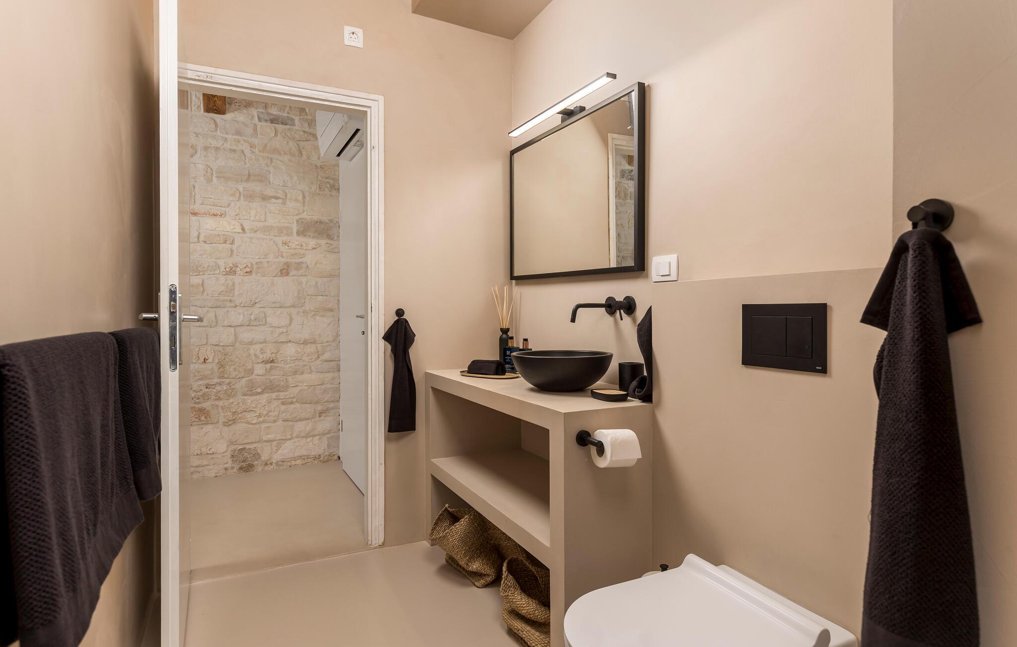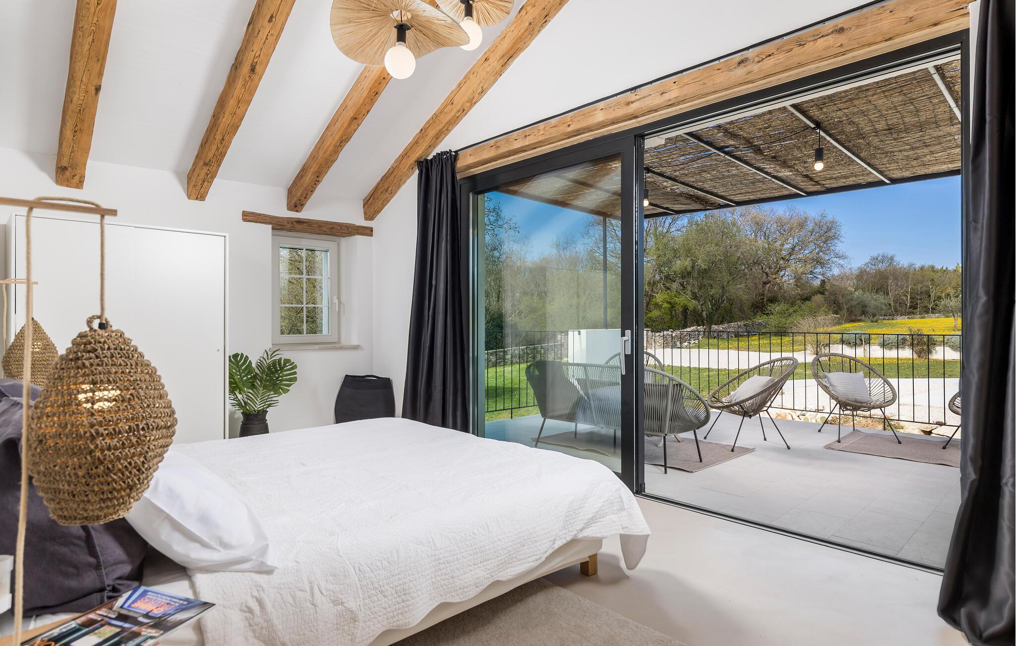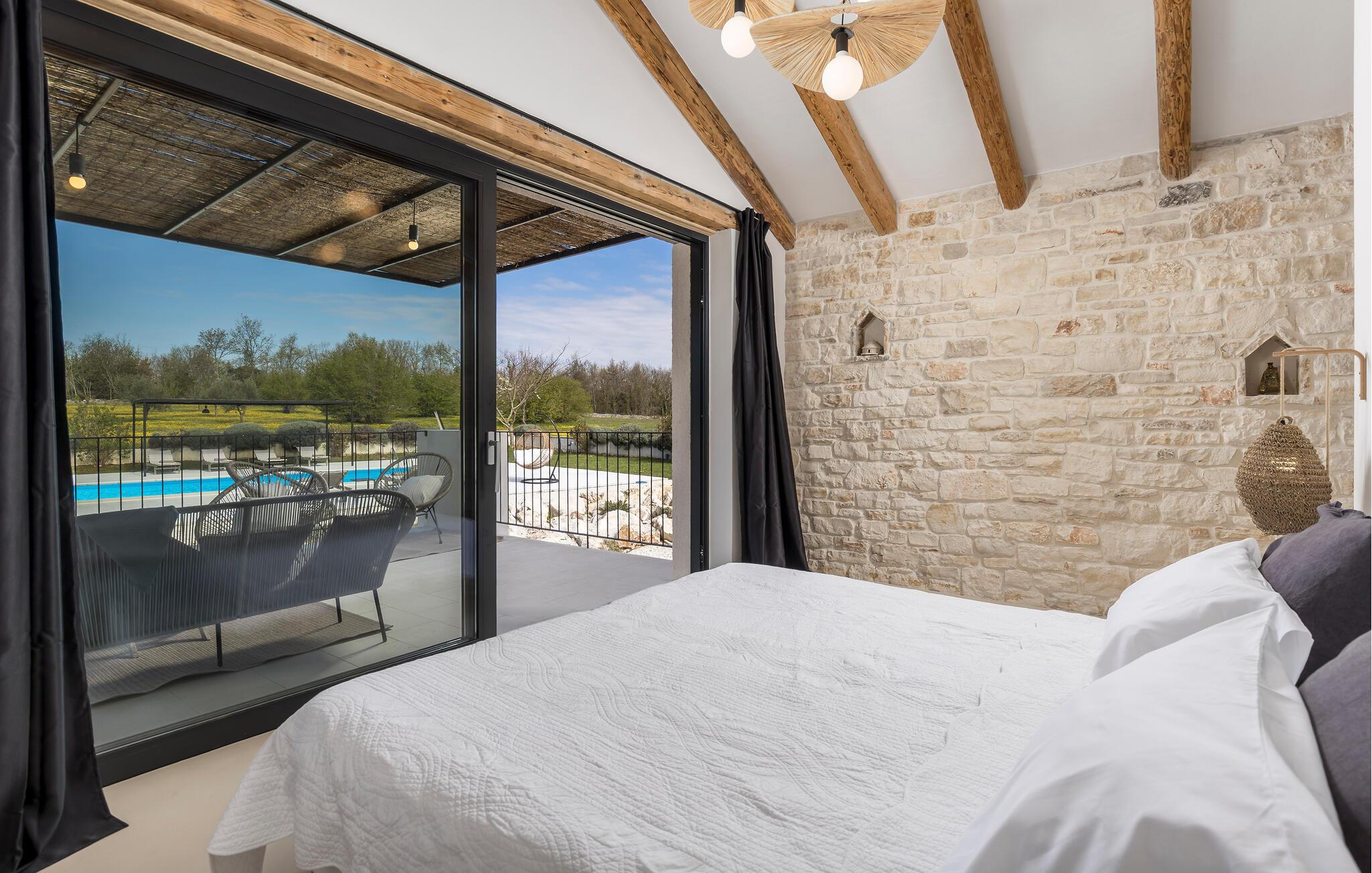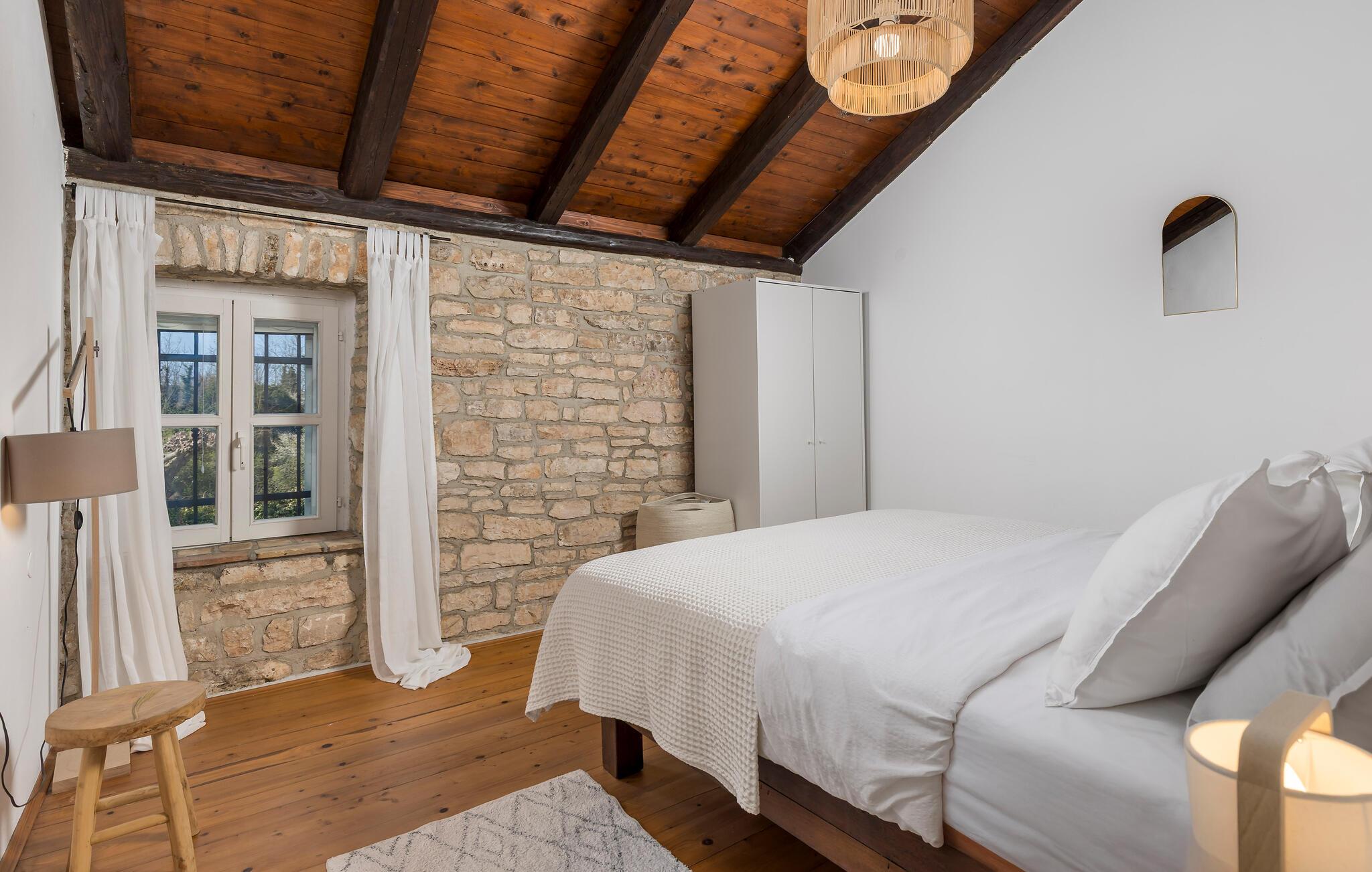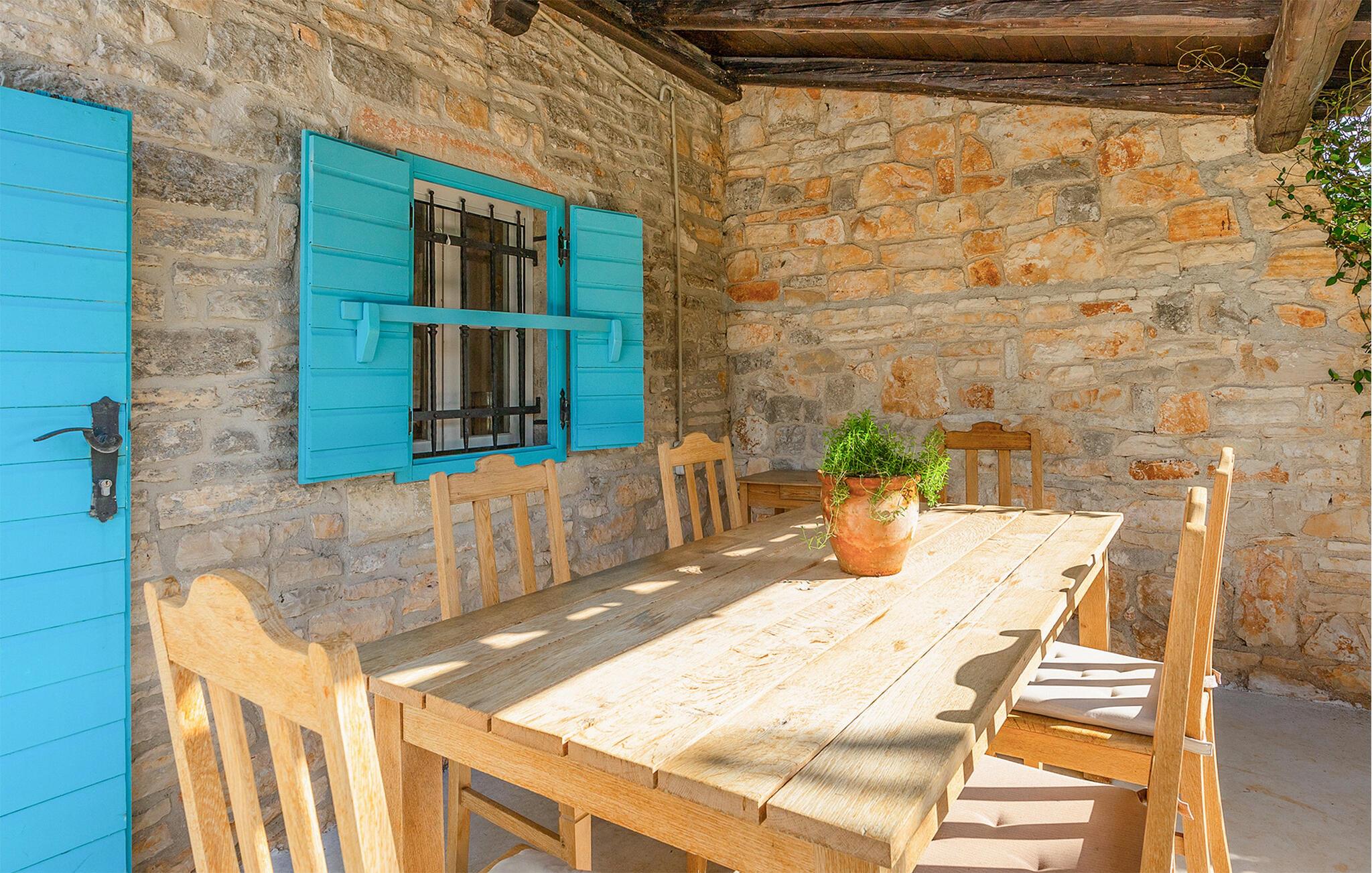 Dette smukt restaurerede traditionelle gamle stenhus, kombineret med moderne stilopgraderinger, ligger på en stor grund med enge og skove rundt omkring. Placeringen er absolut fredelig og afslappende, så du vil kun høre fugle synge. Det eneste, der bryder den afslappende grønne atmosfære, er den smukke og store blå swimmingpool, med sine 50m2. Solsenge og parasoller er der for din tid ude ved poolen, mens dine børn leger og har det sjovt. Det rummelige område omkring poolen giver dig mulighed for at føle dig godt tilpas og nyde udendørslivet. Den overdækkede terrasse har et spisebord, så I kan nyde lækre måltider udenfor. Den omhyggeligt restaurerede Villa Natura med sine stenvægge og trælofter har en masse karakter. I stueetagen vil villaen byde dig velkommen med en åben stue med køkken og spisebord til op til 6 gæster. Der er et hyggeligt lyst soveværelse i samme etage. Trætrapper fører til den øverste etage, som har yderligere 2 soveværelser med dobbeltsenge. Et af soveværelserne har eget badeværelse for din komfort. Der er yderligere et lækkert badeværelse med bruser på denne etage samt separat toilet. Den moderne overdækkede terrasse på første sal byder på en vidunderlig udsigt over marken og dens fantastiske oliventræer. Derudover har værelset i stueetagen og det øverste værelse med terrasse meget store glasvægge, som tilfører naturligt lys og følelsen af at bringe det ydre ind. Om aftenen er det rart at nyde de smukke oplyste omgivelser under det magiske stjernehimmel. Med Villa Natura er du midt i naturen, men ikke for langt væk fra den næste større by - den nærmeste kystby er Porec - kun 20 minutters kørsel. BEMÆRK: Nye billeder kommer til foråret :) Istrien er virkelig en fryd for øjet. Dens vandløb strømmer til havet gennem dybe dale og kløfter, som leder tankerne hen på de gamle lokale myter om kæmper. Bølgende bakker har udsigt over markerne og dalene med små byer oppe på toppene, der minder om nogle gamle malerier. Dette stenhus ligger uden for en lille landsby i Istrien, det er helt stille og afslappende, men alligevel er det travle turistcenter i Porec og strandene kun en kort køretur væk. I Pula og Trieste finder du internationale lufthavne (Ryanair, FlyGlobespan, Thomson, Norwegian Air Shuttle, Tuifly, German Wings, Sterling, Wizzair og mange russiske charterflyvninger). Turistbyen Porec ligger 15 minutter væk, og Rovinj og Pula og andre højdepunkter er kun en kort køretur væk. Kun 15 minutter væk fra ejendommen kan du finde de nærmeste strande med en masse rolige steder at slappe af.