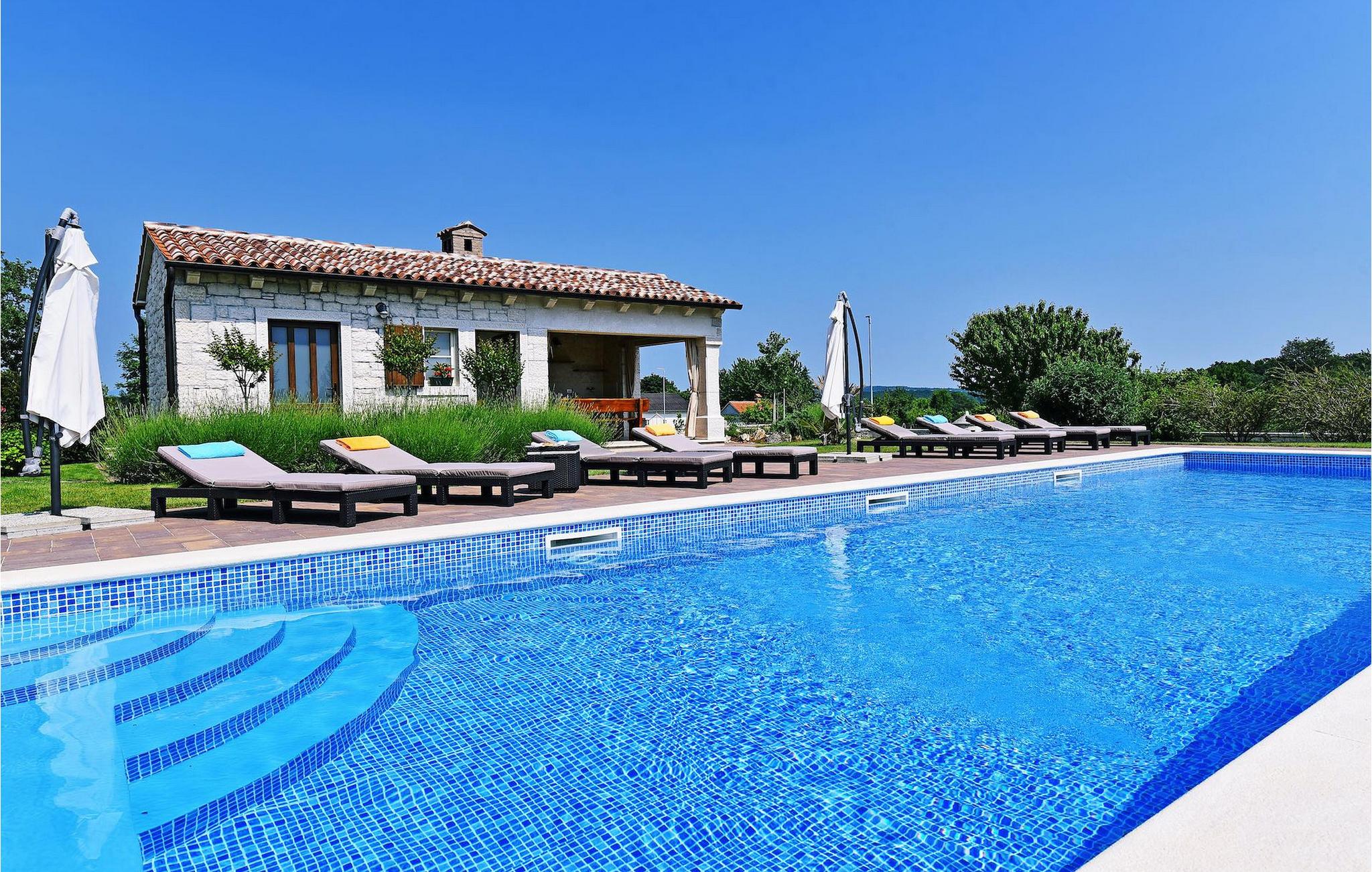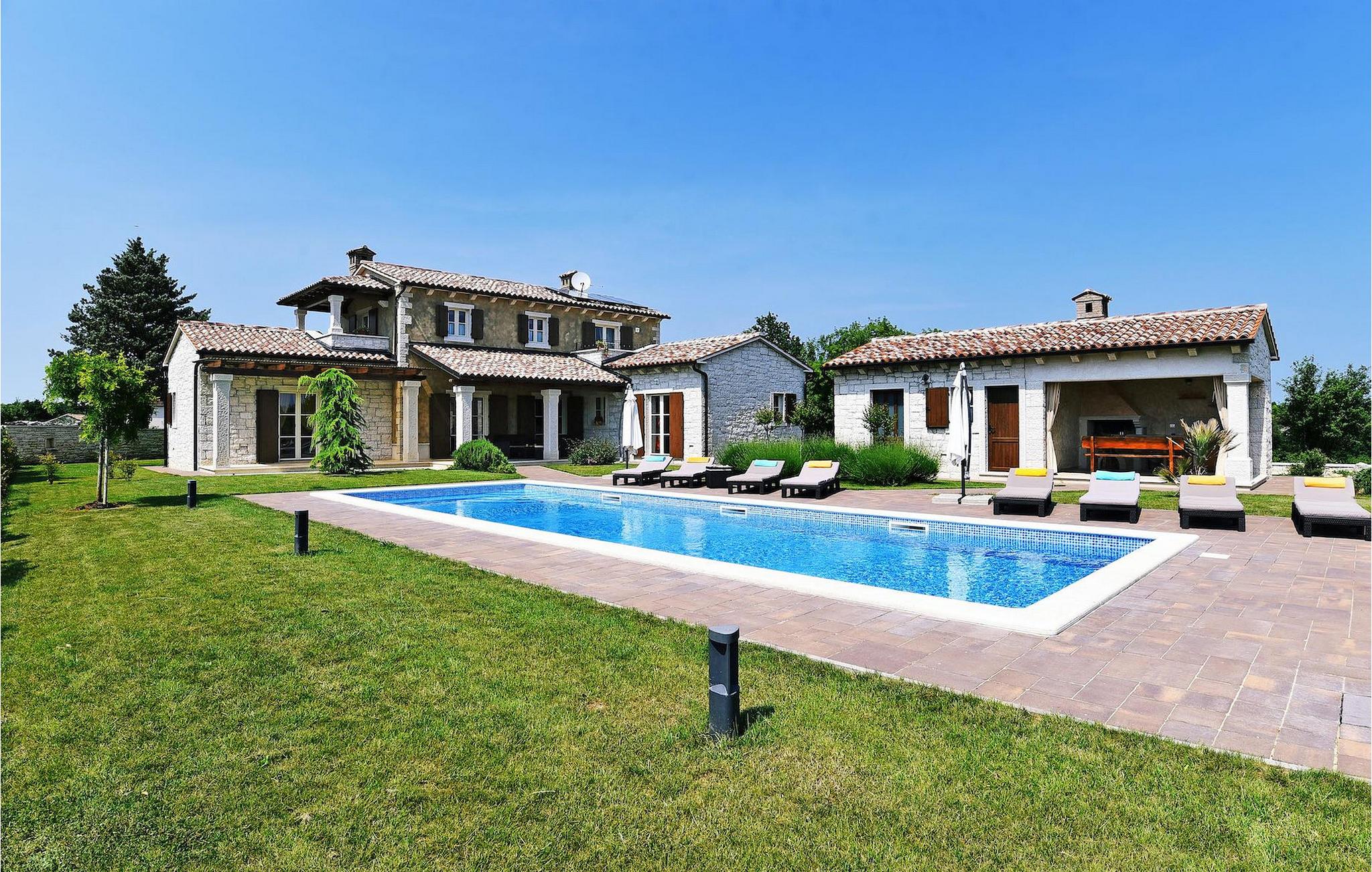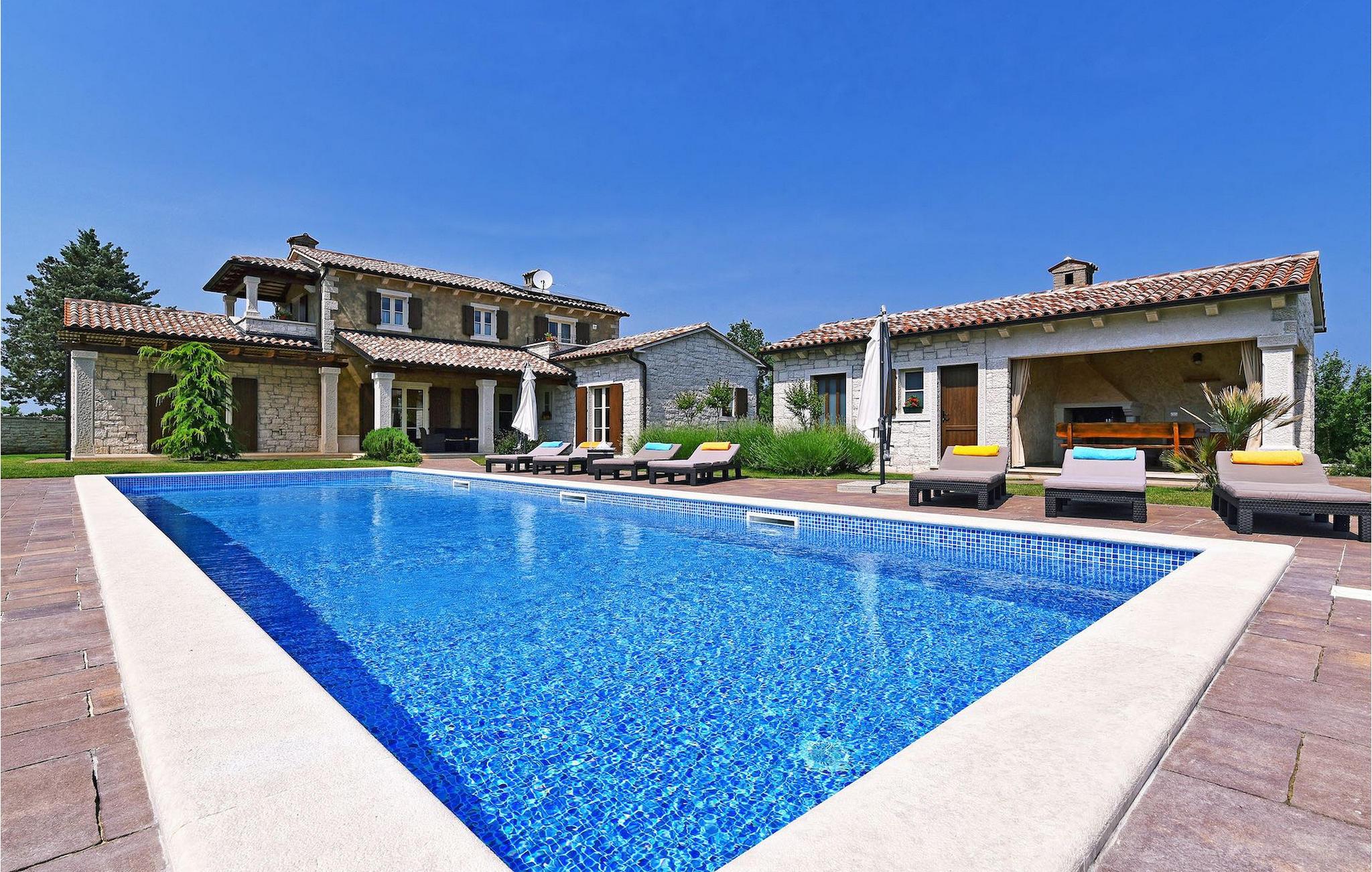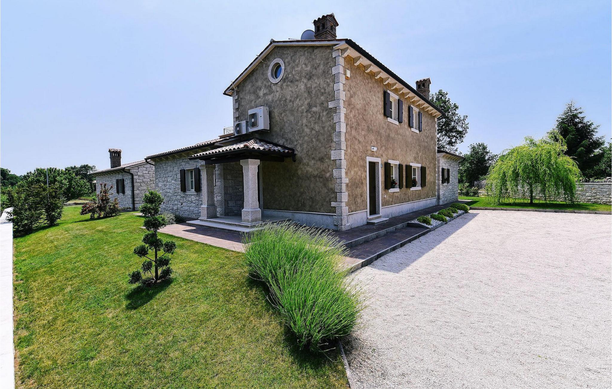 Denne nybyggede villa ligger i udkanten af en lille landsby i Istrien. Den tilbyder fred og ro, men er kun få minutters kørsel fra strandene og turistattraktioner. I stueetagen er der en stor stue og to soveværelser med eget badeværelse. På øverste etage er der yderligere to soveværelser med eget badeværelse. Udenfor er der en stor privat pool, en overdækket spiseplads, liggestole og privat parkering. Denne villa med aircondition er omgivet af grønne enge og skove.