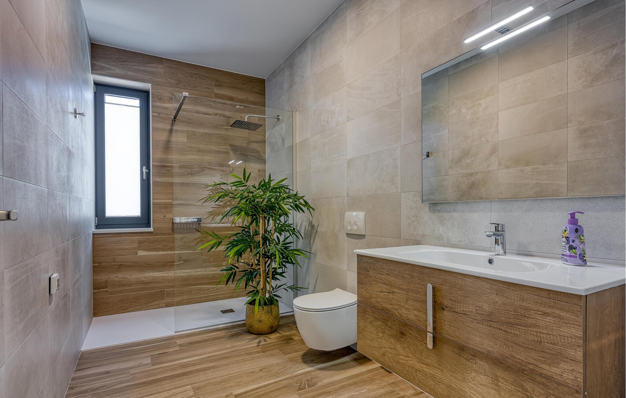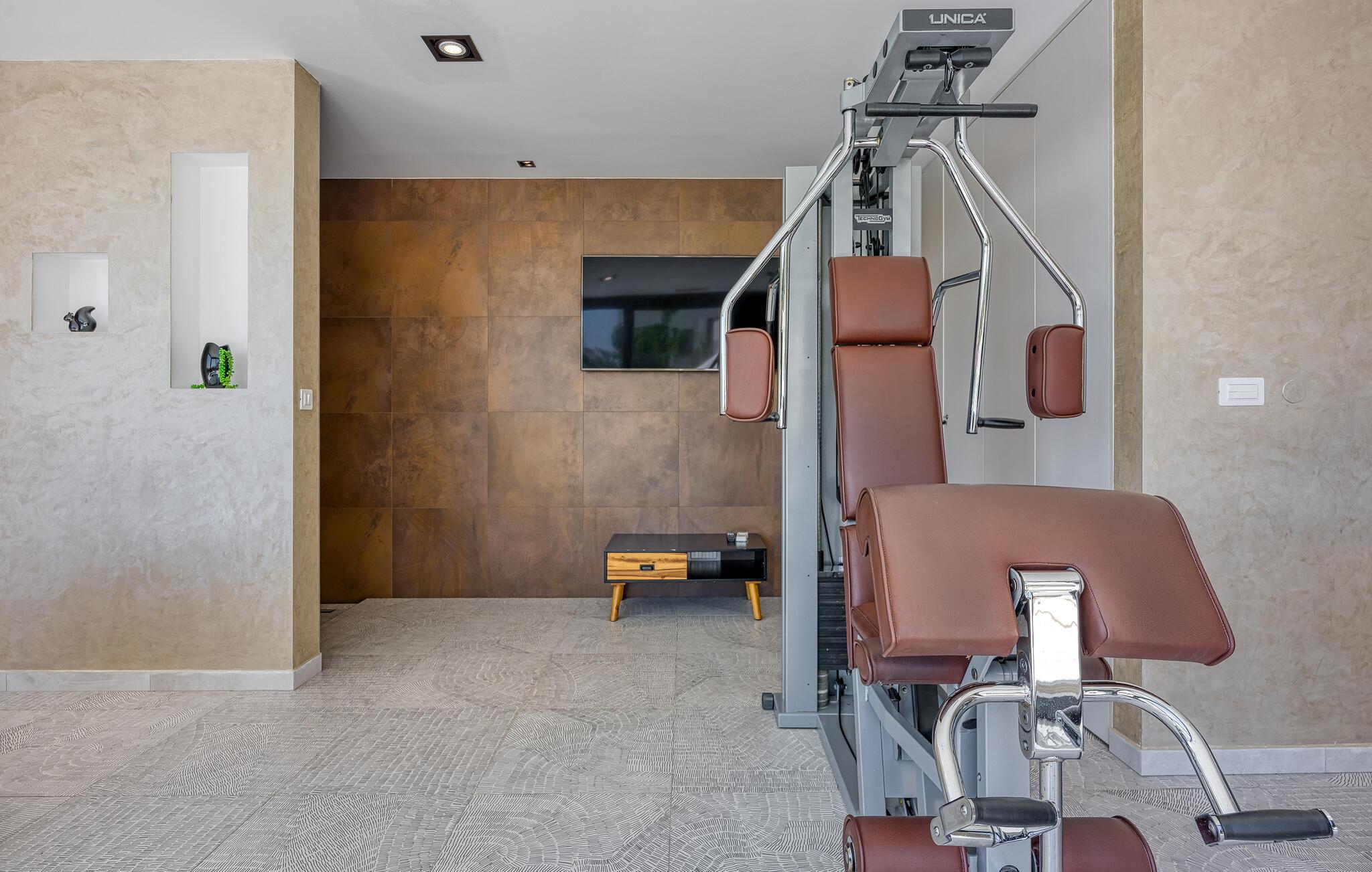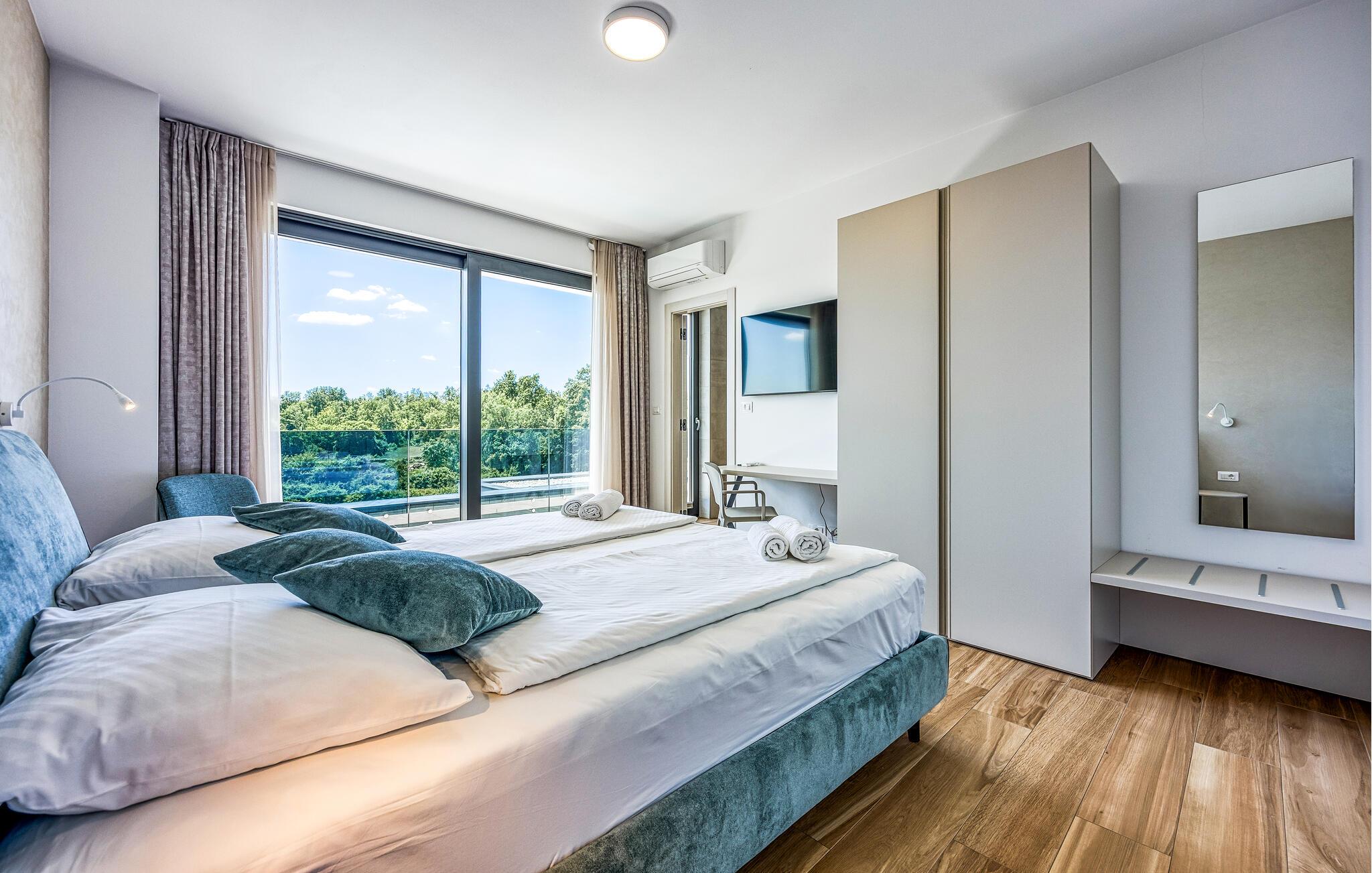 Indvendigt er villaen ikke mindre fantastisk, startende med dit eget wellness-område med et indendørs spabad med udsigt over poolområdet. I stueetagen er der en hyggelig og rummelig opholdsstue, samt et fuldt udstyret køkken med spiseplads til hele gruppen. Takket være villaens store vinduer er hvert værelse lyse og luftige. I stueetagen finder du også et af soveværelserne med en king-size seng og eget badeværelse. De resterende tre soveværelser, alle med eget badeværelse, er placeret på første sal. I alt kan villaen nemt rumme op til 8 gæster, hvilket gør den ideel til 2 familier. Når du er ovenpå, vil udsigten over det omkringliggende område tage pusten fra dig, sørg for at nyde dem ordentligt!