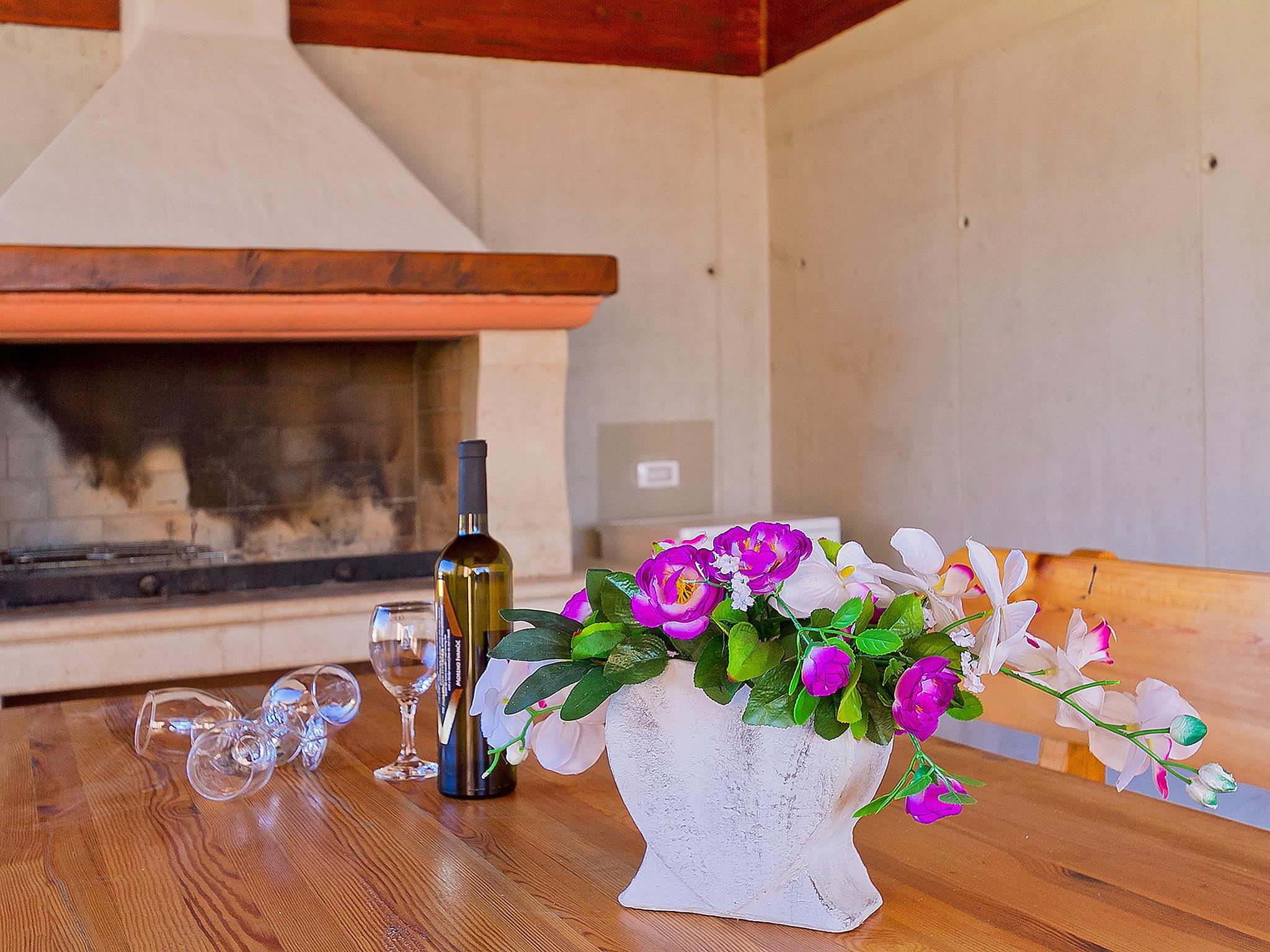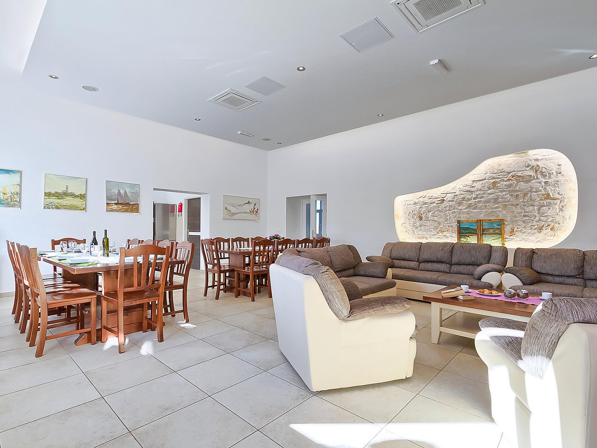 10-room villa 300 m2 on 2 levels. Living/dining room 60 m2 with 2 double sofabeds (150 cm, length 190 cm), satellite TV and DVD. Exit to the swimming pool. 1 room 22 m2 with 1 french bed (160 cm, length 200 cm), shower/WC and air conditioning. 1 room 22 m2 with 1 french bed (160 cm, length 200 cm), air conditioning. 1 room 9 m2 with 2 beds (80 cm, length 190 cm), air conditioning. Open kitchen (4 hot plates, oven, dishwasher, microwave, freezer). Shower/WC, sep. WC. Upper floor: 3 rooms 18 m2, each room with 1 french bed (160 cm, length 200 cm), shower/WC and air conditioning. 3 rooms 18 m2, each room with 2 beds (80 cm, length 200 cm), shower/WC and air conditioning. Forced-air heating. Terrace 5 m2, roofed. Terrace furniture, deck chairs (10). Distant view of the sea. Facilities: children's high chair, baby cot. Internet (WiFi, free).