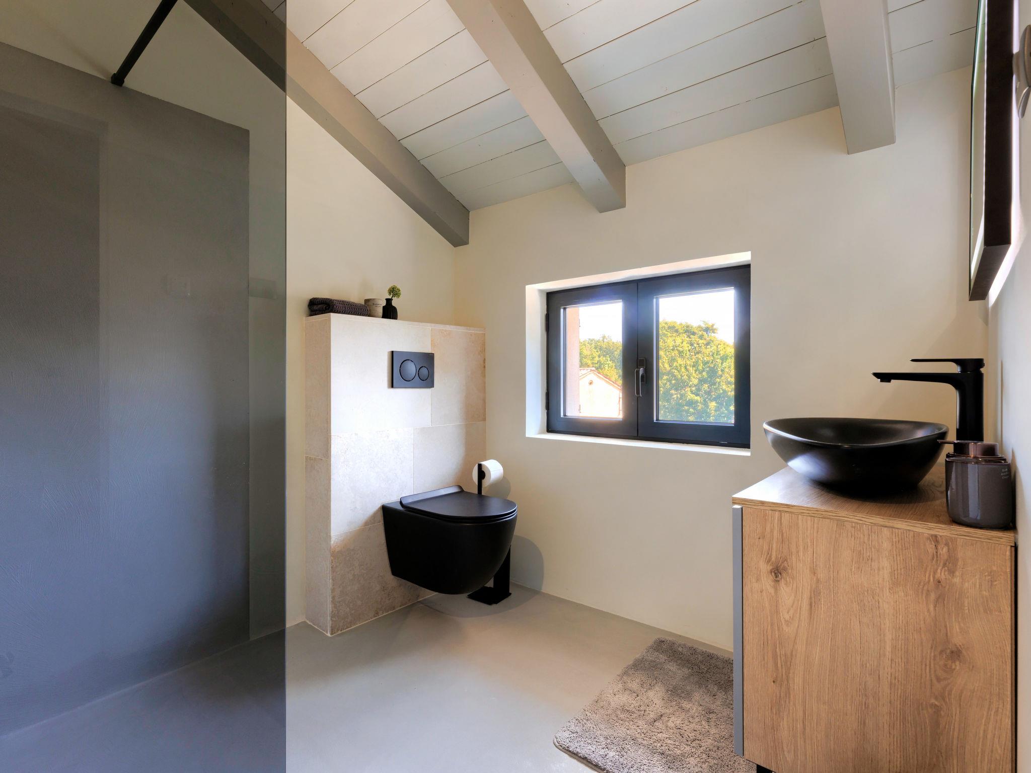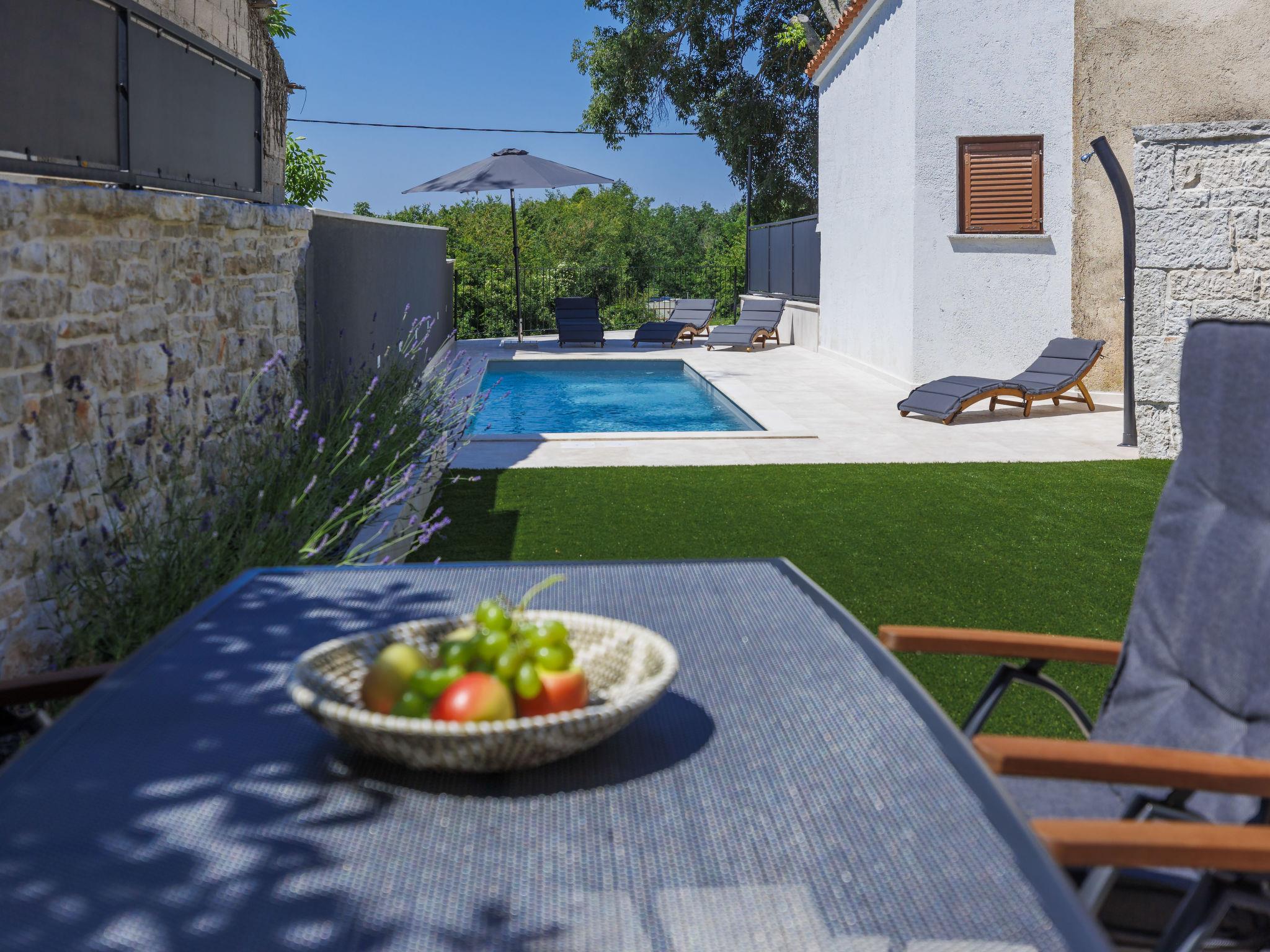 Beautiful terraced house "Villa Luca", 3 storeys, renovated in 2022. In the hamlet Muntrilj 4 km from the centre of Tinjan, in a sunny position, 20 km from the sea. Private: property 200 m2 (fenced), swimming pool angular (22 m2, depth 150 cm, seasonal availability: 01.May. - 01.Oct.) with internal staircase. Outdoor shower, terrace (15 m2), garden furniture, barbecue, pool maintenance by the owner/gardener. In the house: internet access, washing machine. Parking (for 2 cars) at the house on the premises. Shop 4 km, restaurant 4 km, bar 4 km, bus stop 3.5 km, pebble beach 20 km, rocky beach 20 km. Walking paths from the house 100 m, cycle lane 150 m. Nearby attractions: Adrenalin park 8 km. The owner does not accept any youth groups.