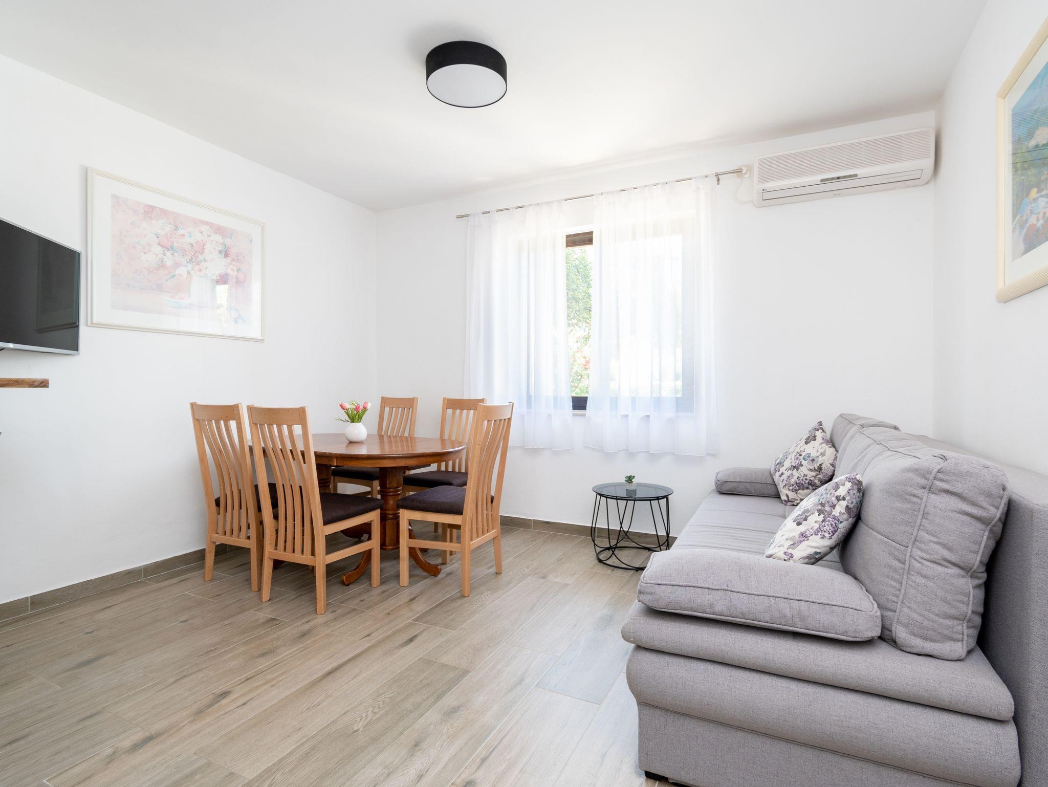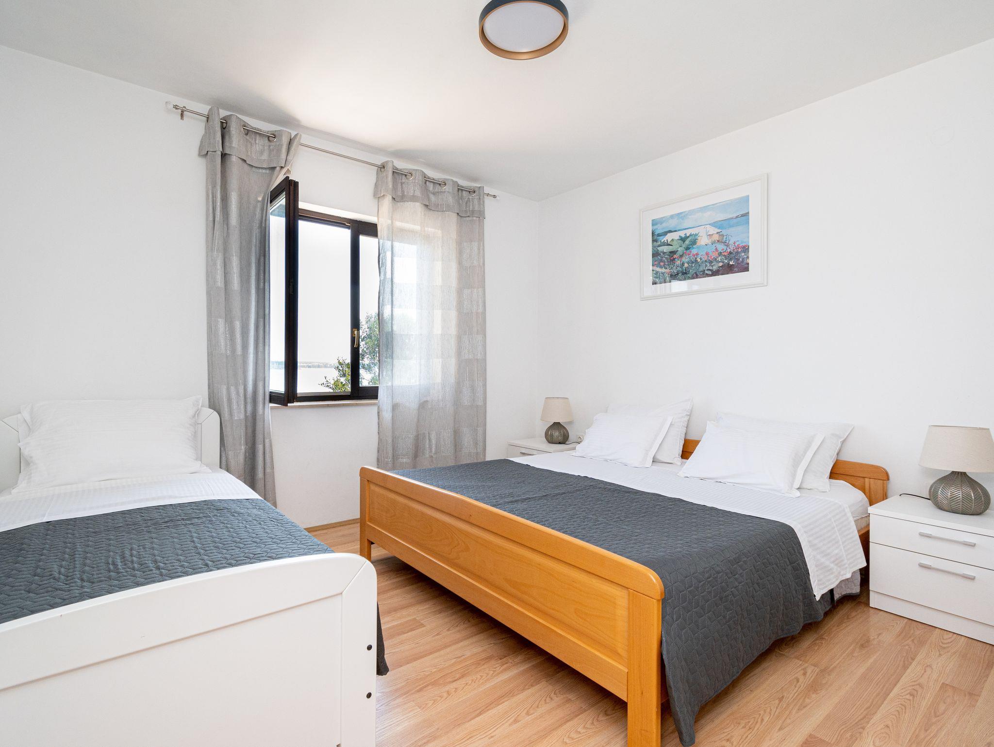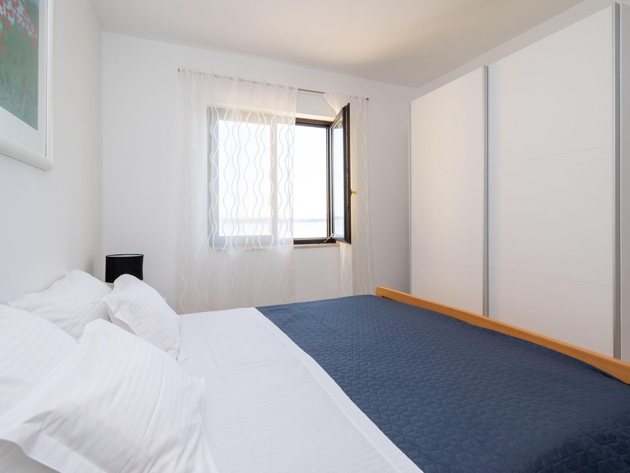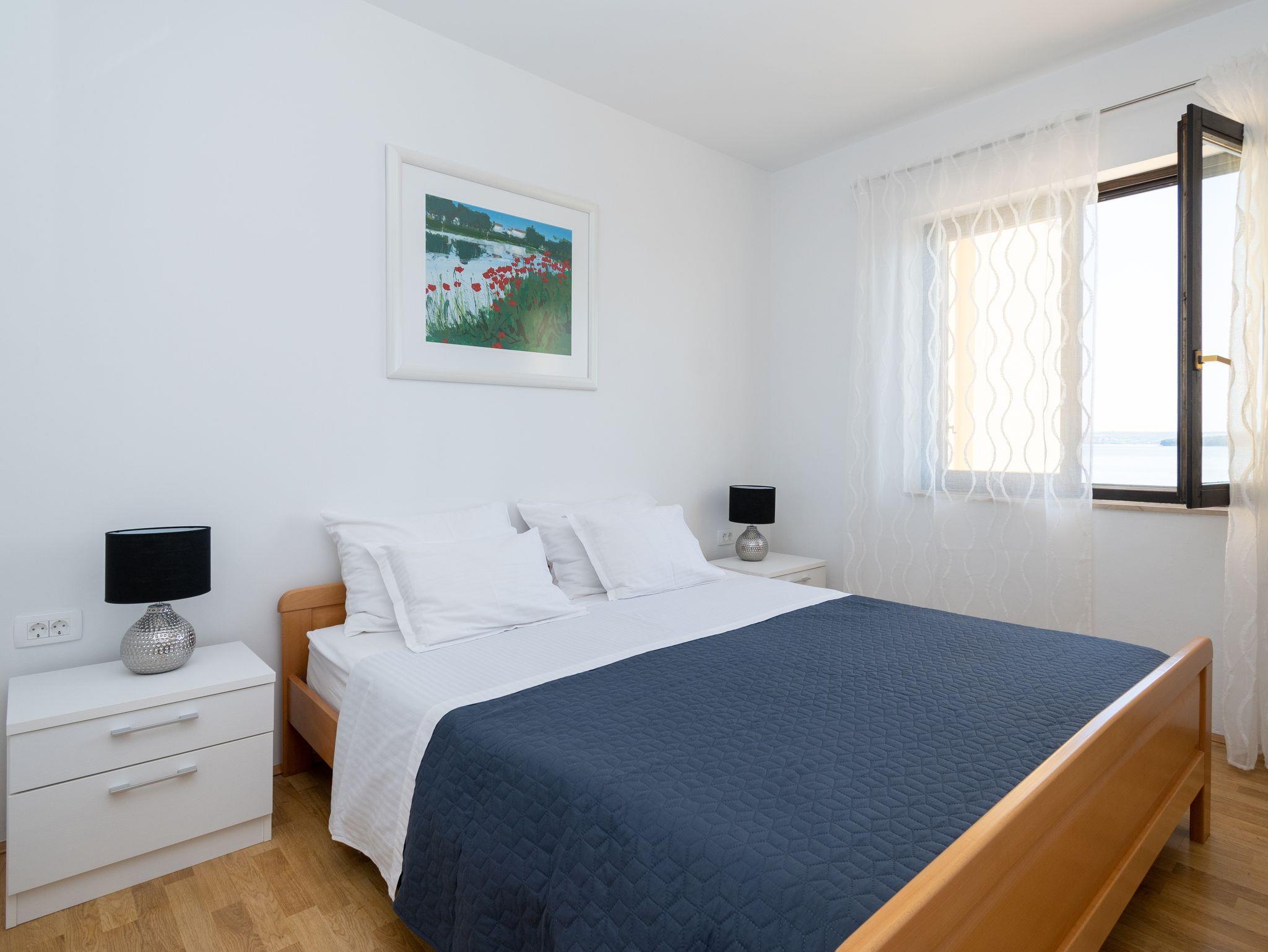 Ferienwohnung bietet Platz für 5 Gäste. Die Betten sind in Schlafzimmern, die es 2 gibt, innerhalb einer Gesamtfläche von 54m2, angeordnet. Die Gäste haben eine eigene Terrasse zur Verfügung, auf der sie in warmen Sommernächten genießen können. Das Apartment bietet Meerblick. Es ist erlaubt, Speisen auf dem Gemeinschafts-Grill vorzubereiten. Unterkunftseinheit hat Räume, die von dem Rest der Einheit abgetrennt werden. IM PREIS INBEGRIFFEN: Kurtaxe, Endreinigung, Klimatisierung, Parkplatz, Internet, Bootsanlegeplatz, Bügeleisen, Föhn, tragbarer Grill, Sonnenschirm, Liegestühle. VERBINDLICHE ZUSÄTZLICHE KOSTEN: Aufzahlung für Kurzaufenthalte (prozentualer Zuschlag pro Nächtigungsanzahl: 30% - 1, 20% - 2, 10% - 3). Die Verfügbarkeit zusätzlicher Dienstleistungen in Ihrem reservierten Termin und die Preise derselben (falls nicht aufgeführt) müssen im Voraus überprüft werden. Zusätzliche Dienstleistungen die in der Zahlungsaufforderung nicht aufgeführt sind werden direkt beim Vermieter bezahlt, angenommen der Gast nutzt auch diese. Ermäßigung auf den Grundpreis: Gratistag 28=25 (bei einem Aufenthalt von 28 oder mehr Tagen erhalten Sie 3 kostenlose Tage für den Aufenthalt bis 31.12.26).