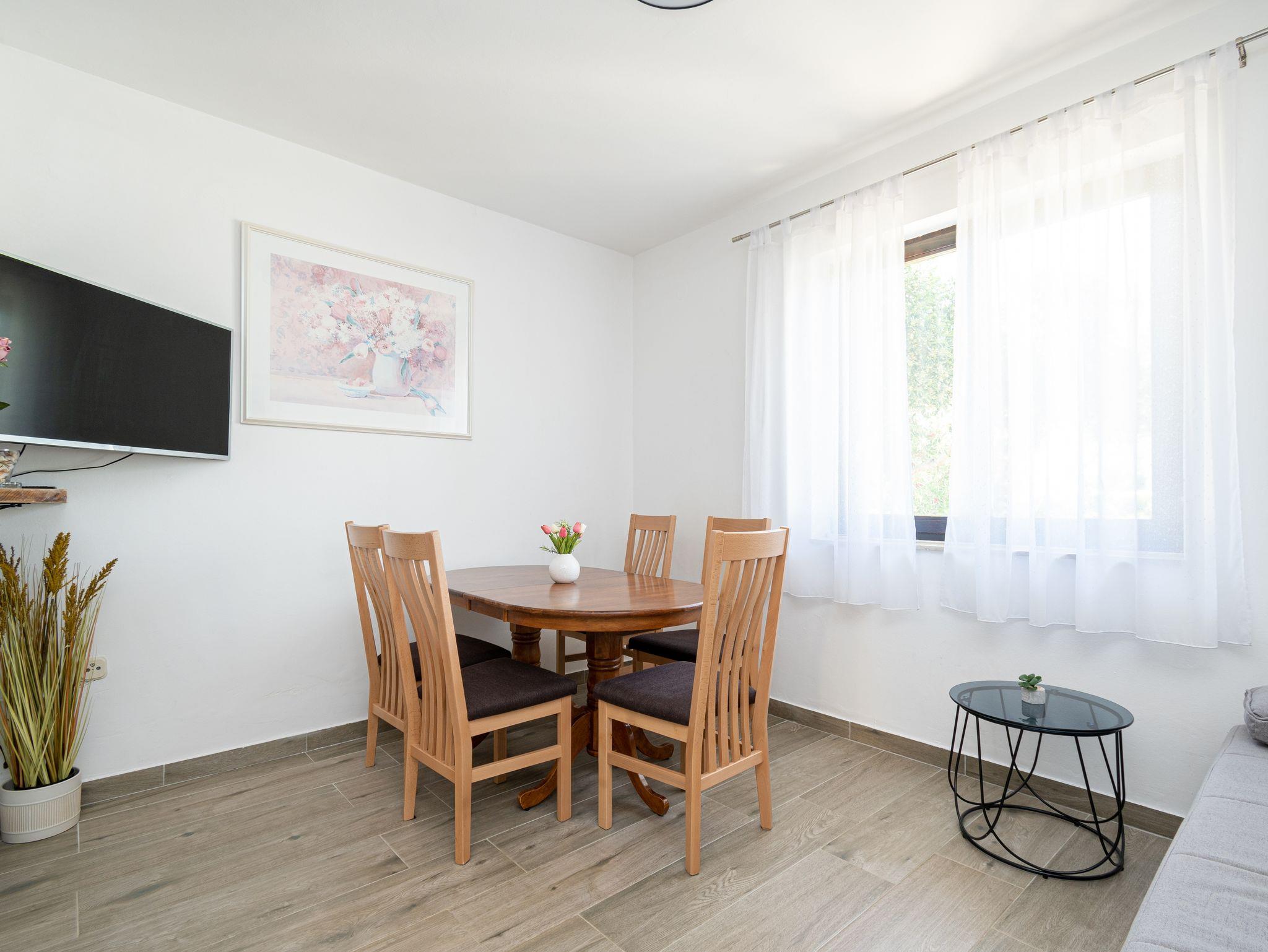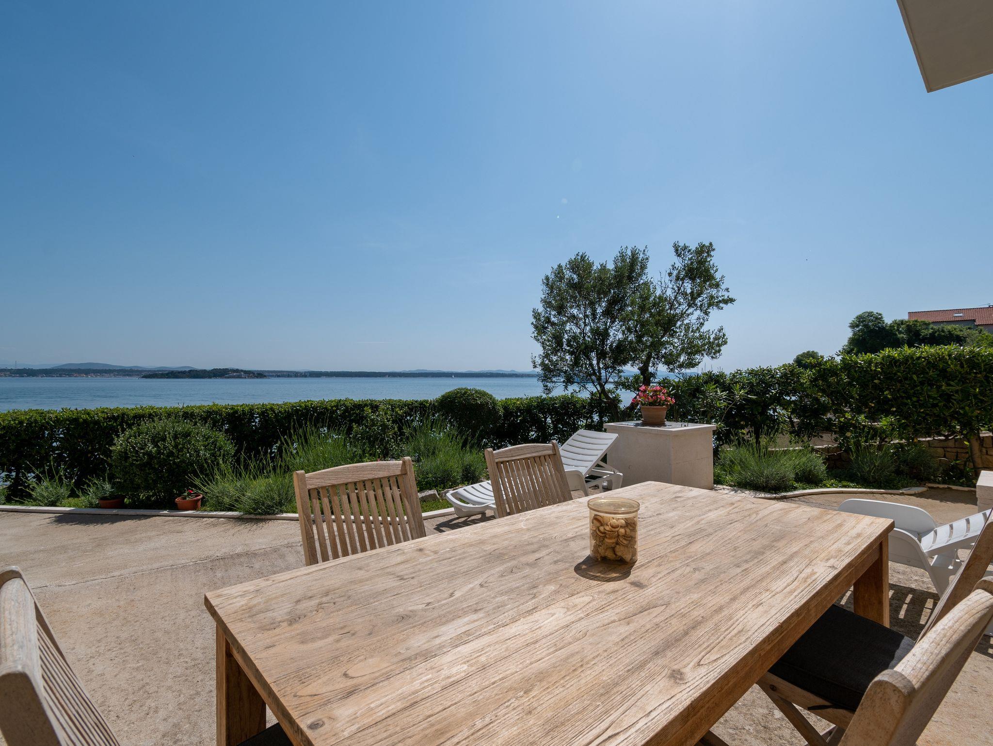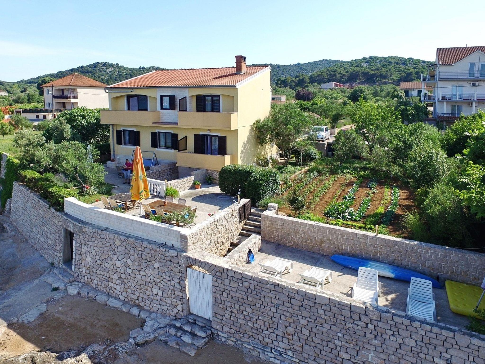 Ferienwohnung bietet Platz für 5 Gäste. Die Betten sind in Schlafzimmern, die es 2 gibt, innerhalb einer Gesamtfläche von 54m2, angeordnet. Die Gäste haben eine eigene Terrasse zur Verfügung, auf der sie in warmen Sommernächten genießen können. Das Apartment bietet Meerblick. Es ist erlaubt, Speisen auf dem Gemeinschafts-Grill vorzubereiten. Unterkunftseinheit hat Räume, die von dem Rest der Einheit abgetrennt werden. IM PREIS INBEGRIFFEN: Kurtaxe, Endreinigung, Klimatisierung, Parkplatz, Internet, Bootsanlegeplatz, Bügeleisen, Föhn, tragbarer Grill, Sonnenschirm, Liegestühle. VERBINDLICHE ZUSÄTZLICHE KOSTEN: Aufzahlung für Kurzaufenthalte (prozentualer Zuschlag pro Nächtigungsanzahl: 30% - 1, 20% - 2, 10% - 3). Die Verfügbarkeit zusätzlicher Dienstleistungen in Ihrem reservierten Termin und die Preise derselben (falls nicht aufgeführt) müssen im Voraus überprüft werden. Zusätzliche Dienstleistungen die in der Zahlungsaufforderung nicht aufgeführt sind werden direkt beim Vermieter bezahlt, angenommen der Gast nutzt auch diese. Ermäßigung auf den Grundpreis: Gratistag 28=25 (bei einem Aufenthalt von 28 oder mehr Tagen erhalten Sie 3 kostenlose Tage für den Aufenthalt bis 31.12.26).