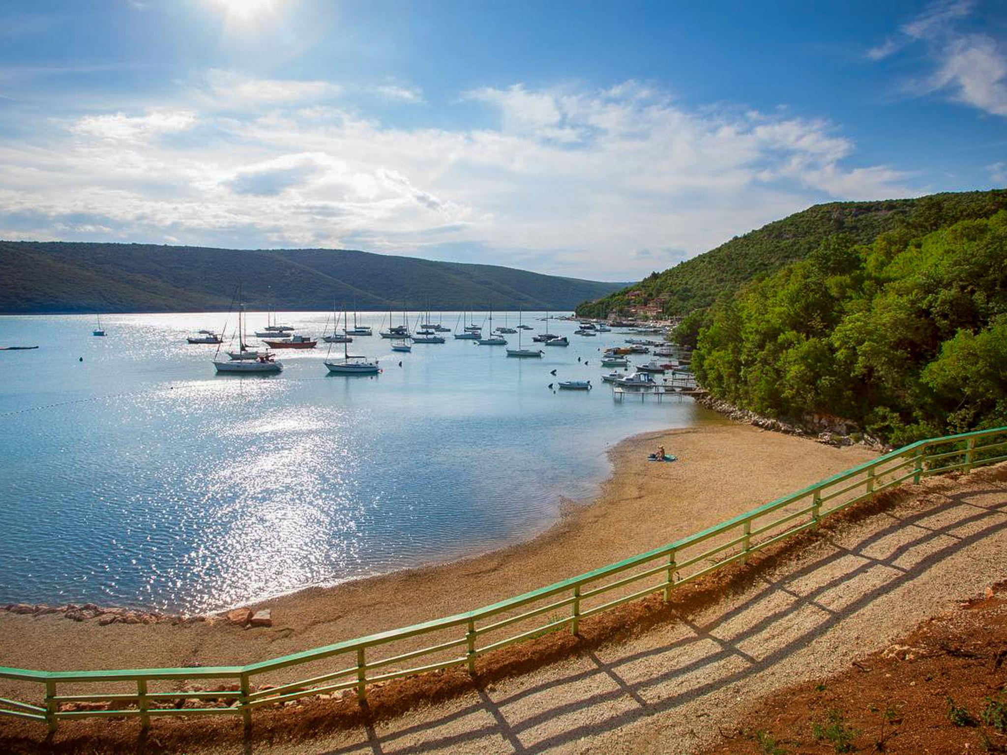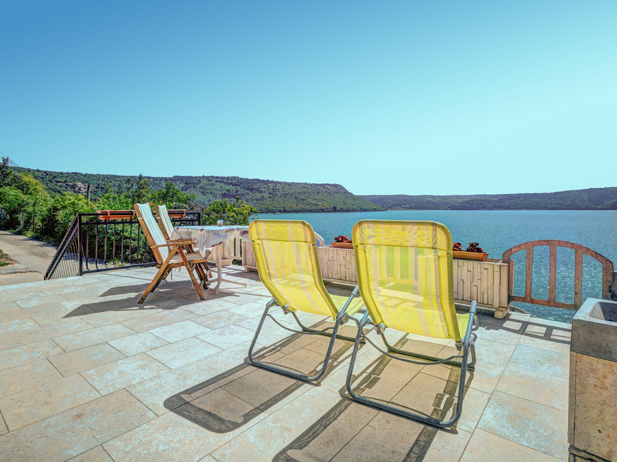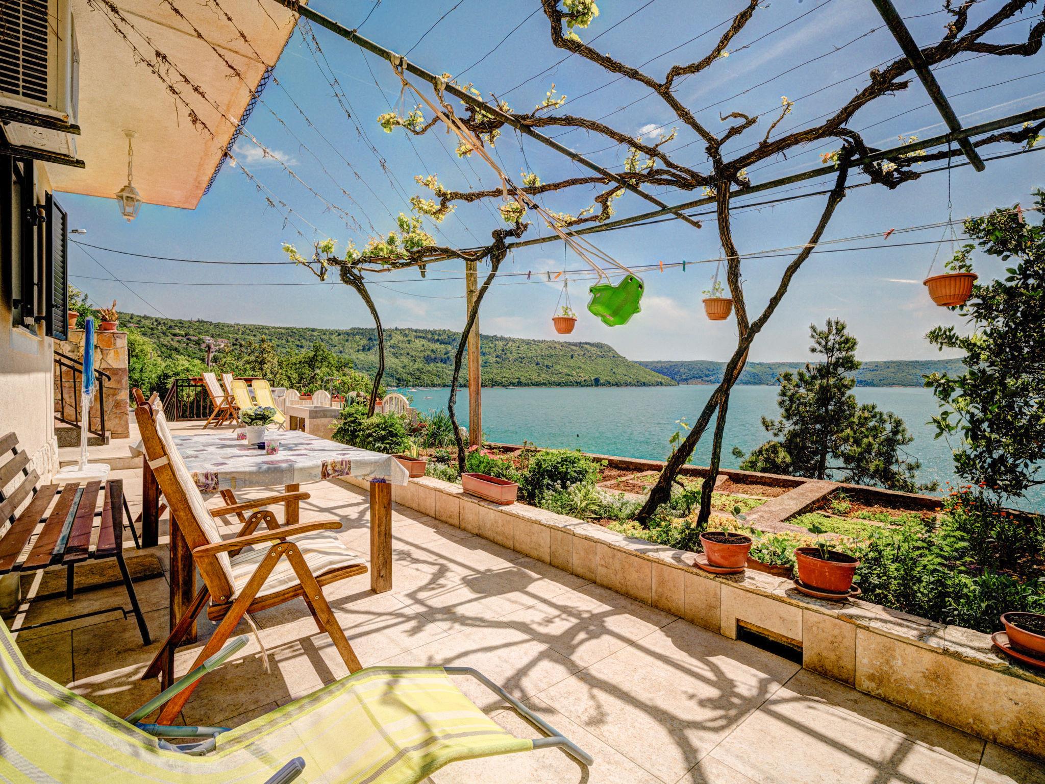 3-family house "More". 100 m from the centre of Trget, 10 km from the centre of Labin, in a quiet, sunny, elevated position, 30 m from the sea, 30 m from the beach. In the house: internet access. Single garage. Shop, restaurant 100 m, bus stop 5.3 km, pebble beach 1 km, concrete beach 30 m. 38 steps to the concrete beach. For shared use: traditional tavern with open-hearth fireplace, dining table and terrace furniture.