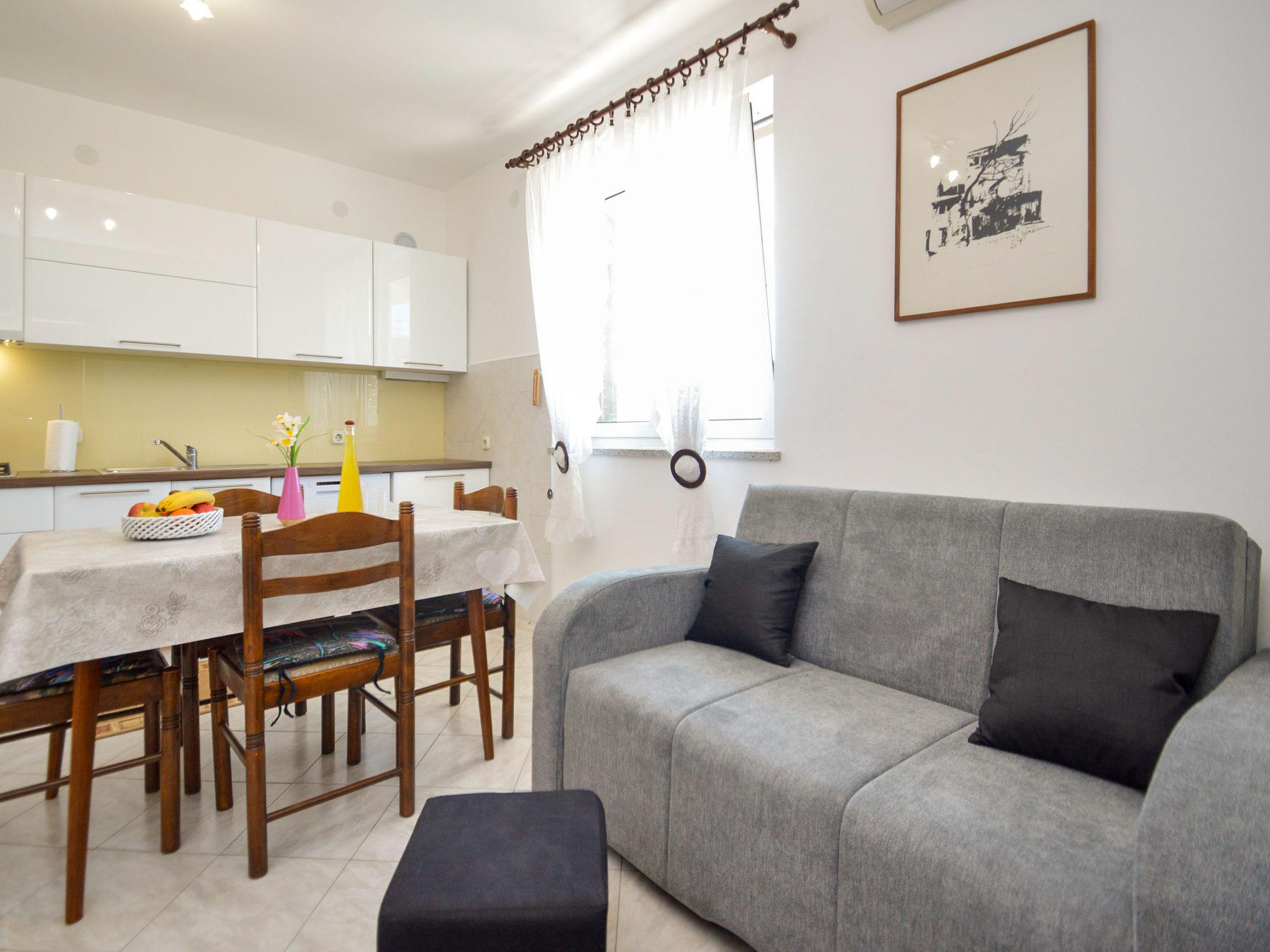 2-room apartment 40 m2, on the ground floor. Object suitable for 2 adults + 1 child. Living/dining room with satellite TV and air conditioning. 1 room with 1 bed (90 cm, length 200 cm), 1 double bed (2 x 90 cm, length 190 cm). Open kitchen (4 hot plates, dishwasher, microwave, freezer). Shower/WC. Terrace 20 m2. Terrace furniture, deck chairs. Marvellous panoramic view of the sea. Facilities: iron. Internet (WiFi, free).