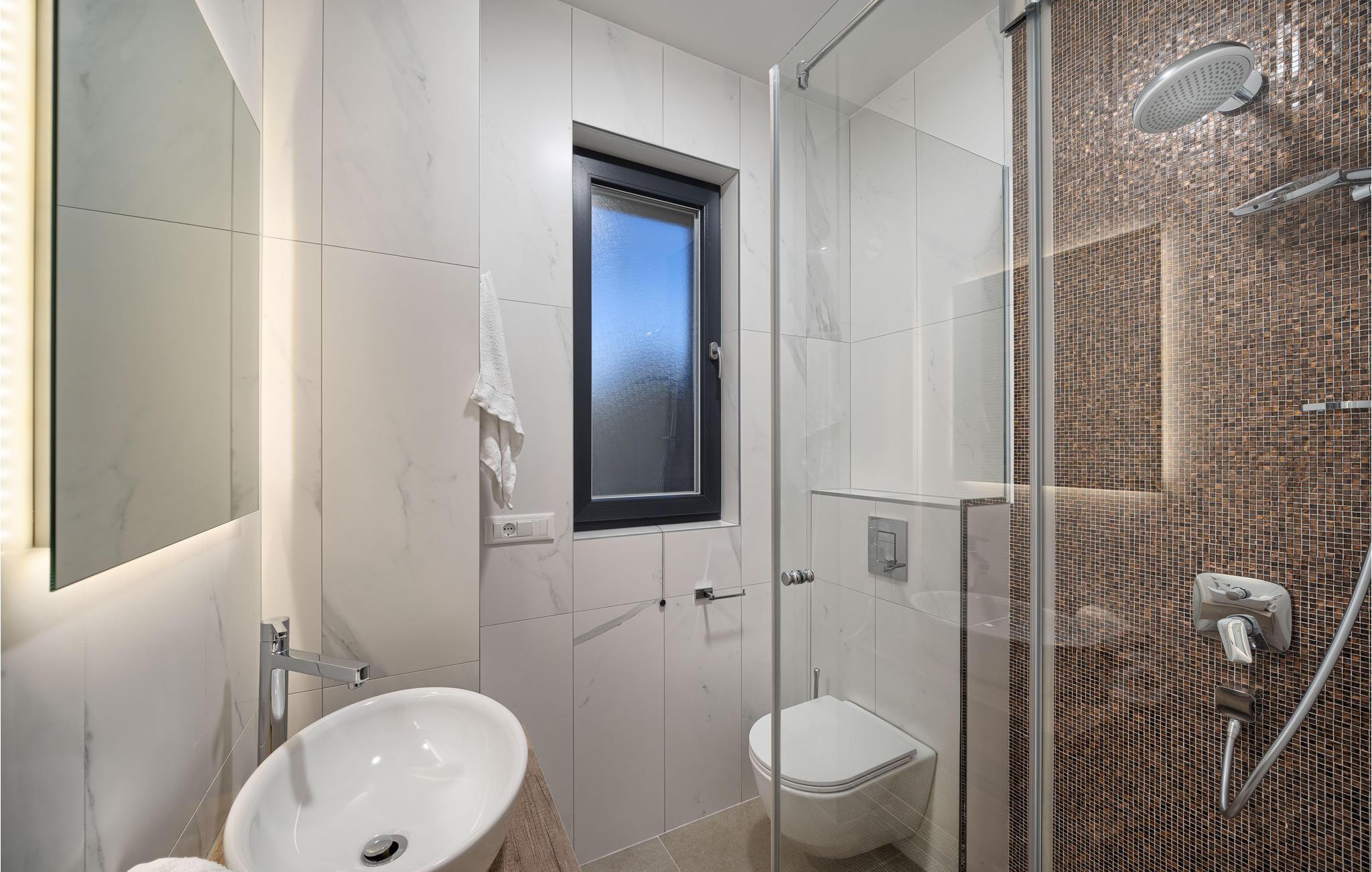 De smagfulde møbler kombineret med varme dekorationer skaber en vidunderlig atmosfære, hvor man hurtigt kommer til at føle sig godt tilpas. Her kan I tilbringe hyggelige stunder med familien uden at skulle undvære noget på jeres ferie. I kælderen er der garage, badeværelse og et vidunderligt wellnessområde med boblebad og sauna. I stueetagen er der en terrasse, hvor der er en overløbspool, grill og liggestole. Dette hus byder på alt, hvad I har brug for til ferien, og den ekstra atmosfære skabes af store glasflader, der giver en smuk panoramaudsigt over havet.
