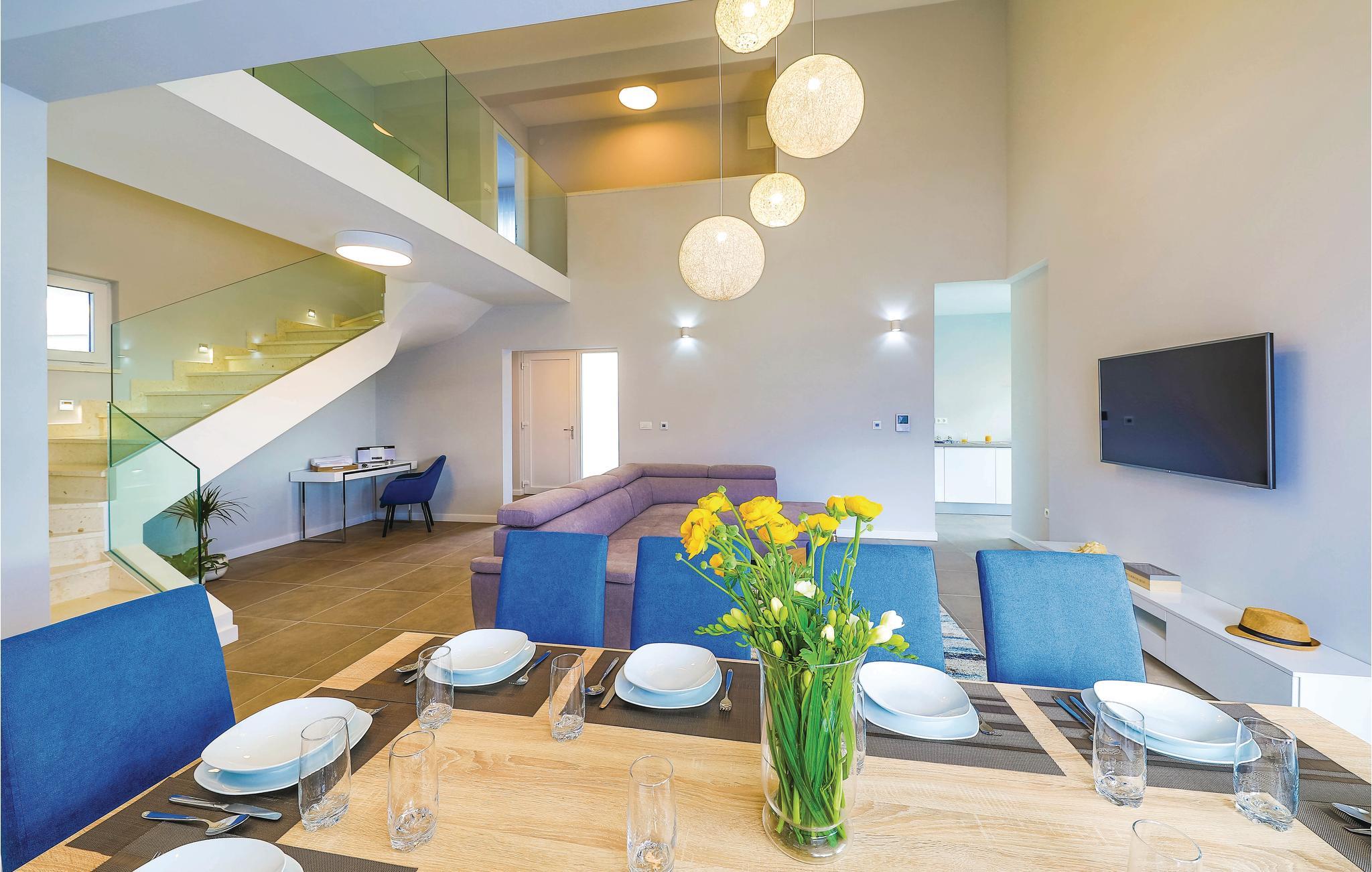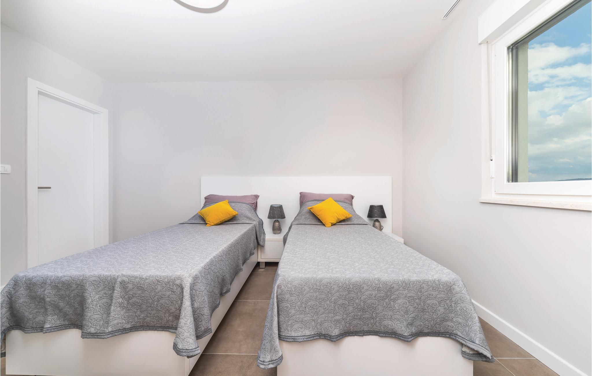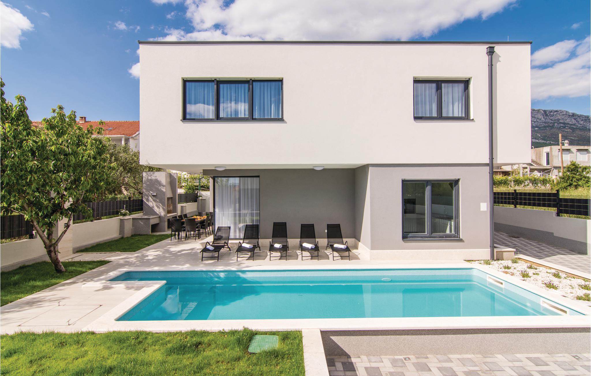 Dette fantastiske feriehus med privat pool rummer fem soveværelser, fem badeværelser, en stue med spisekrog der er åben mod køkkenet og huset ligger på en komplet indhegnet grund med pool, grill og legeplads til familiens små. Bag huset ligger et yderligere helt identisk hus (CDC304), så lej begge, til en ferie for større grupper på op til tyve personer ad gangen. Bemærk venligst at gæsterne fra nabohuset benytter jeres grund som adgangsvej til deres hus. Byen Kaštel Kambelovac er en af ialt syv Kaštelbyer, der ligger som perler på snor og er forbundet af en promenade. Her er alle betingelser opfyldt til en behagelig middelhavsferie, bl.a. en smuk marina, som det er en oplevelse at gå tur på. Besøg de nærliggende historiske byer Trogir og Split.