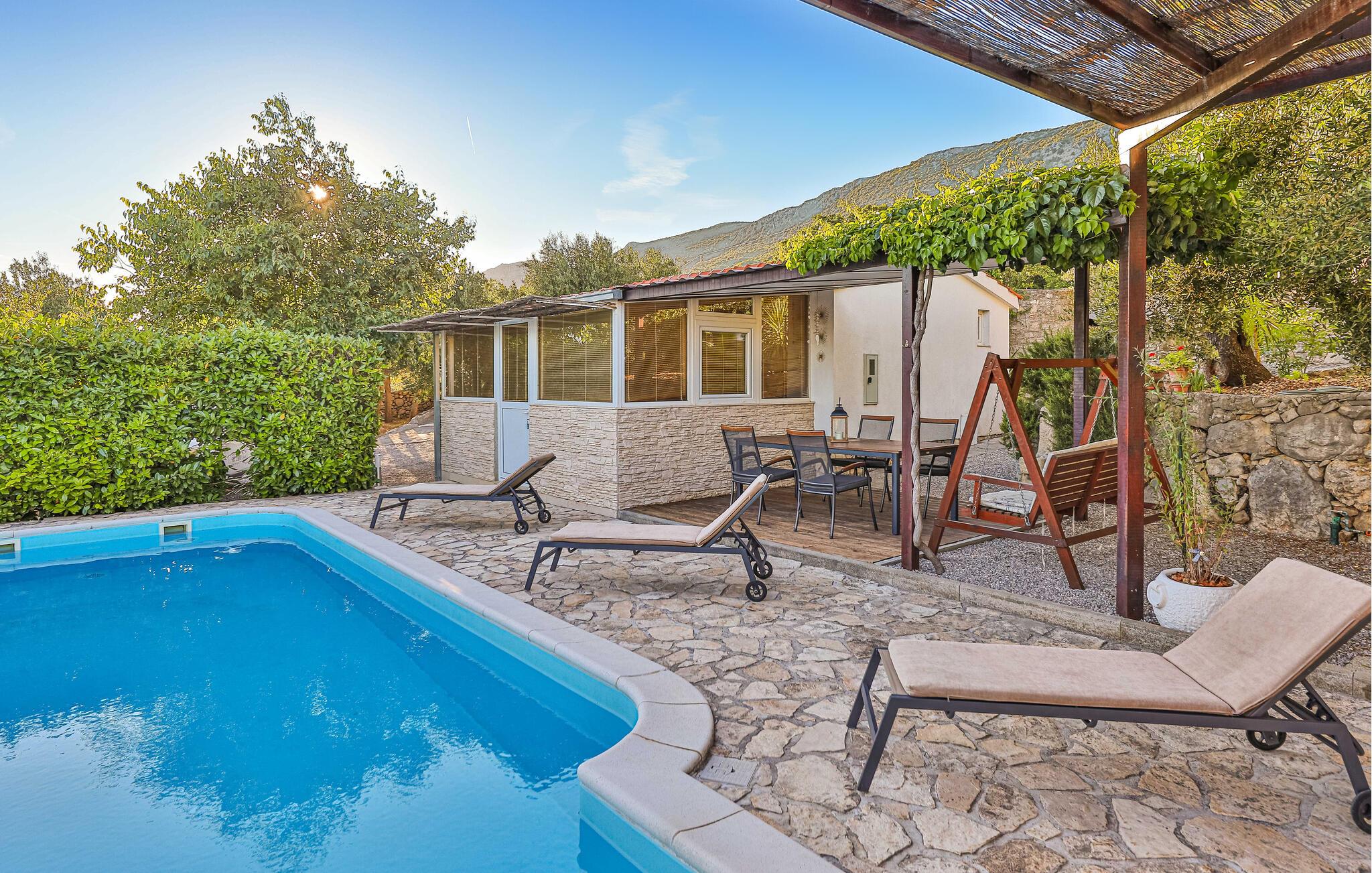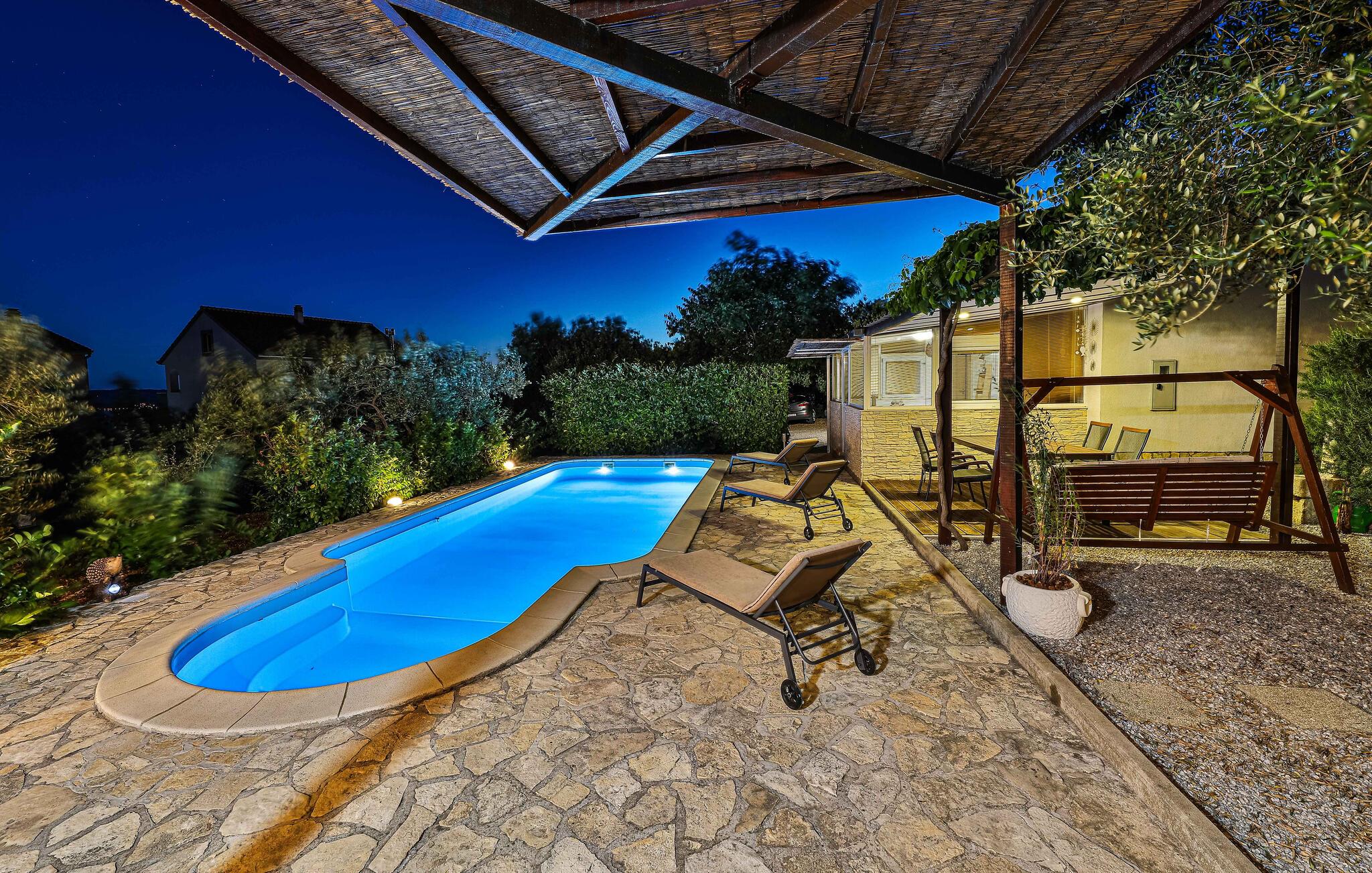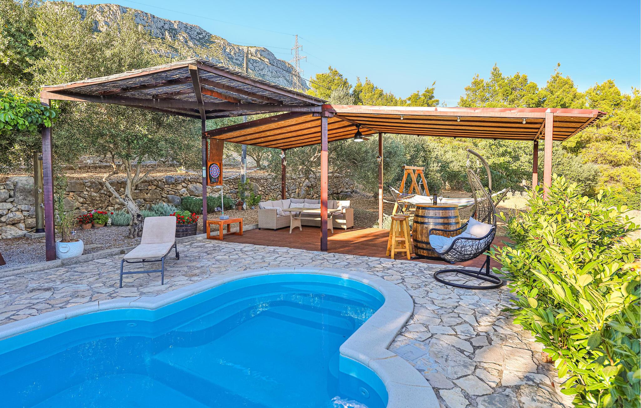 Dette feriehus ligger på en grund omkring 500 m fra hovedvejen, omgivet af grøn natur og oliventræer. Fra terrassen ved poolen har I delvis udsigt til havet. Denne bungalow består af et soveværelse med dobbeltseng og en enkeltseng, badeværelse samt en stue med køkken og endnu en soveplads. I højre side af huset, lige ved poolterrassen, er der en grill med træbord og bænke til hyggeligt samvær. Huset ligger ved et godt udgangspunkt, da lufthavnen, marina og den historiske bykerne af Trogir, Salona og Split ikke ligger langt herfra.