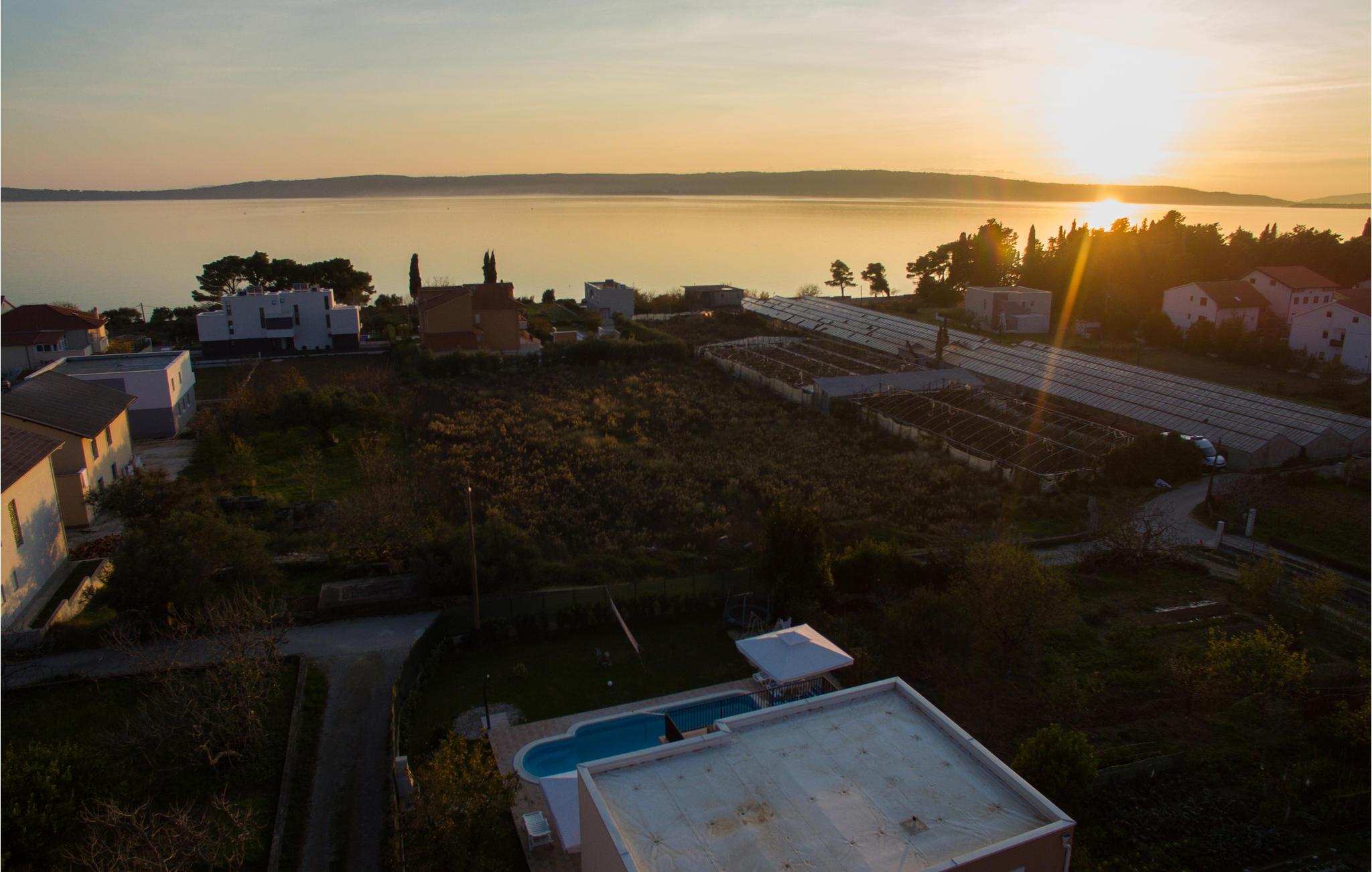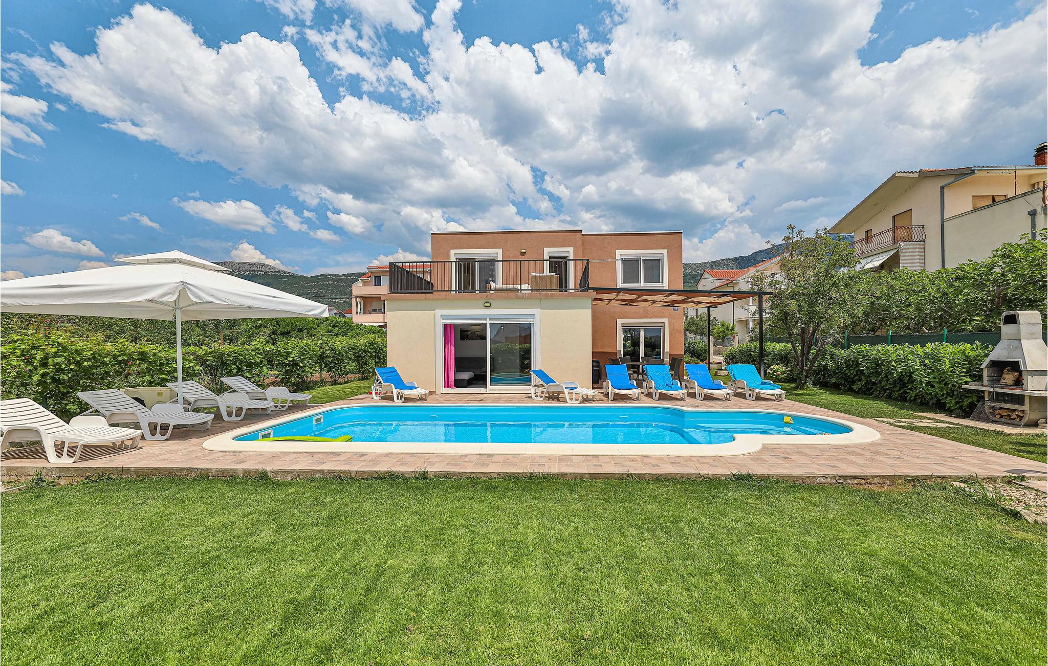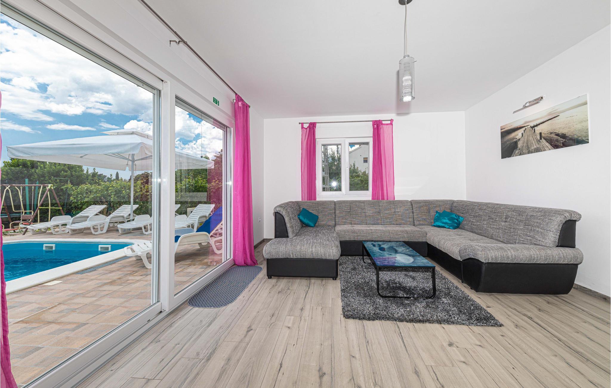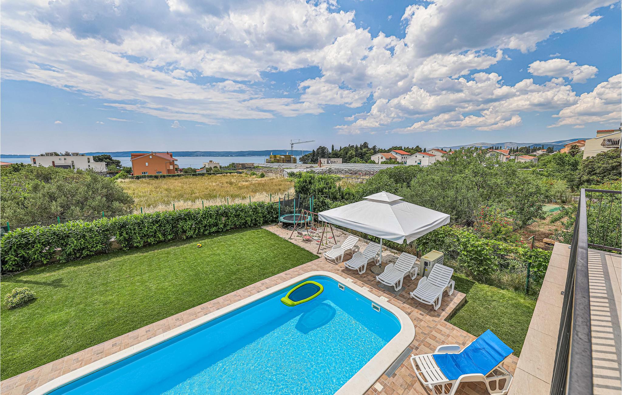 Hold jeres rigtig dejlige ferie i dette stilrene feriehus med pool. Huset ligger på en indhegnet grund med parkeringsplads, og på husets sydside ligger der en pool. Ferieboligen er fordelt på stueplan med køkken og spisestue, soveværelser, badeværelse og et ekstra wc samt en rummelig stue. På første sal er der endnu tre soveværelser, to badeværelser og en stor terrasse med udsigt over havet. Den skønne bolig ligger lige i nærheden af havet, promenaden og en restaurant. Tag på udflugter til Split, Trogir og til den historiske ruinby Salona. Til huset hører også to barnecykler.