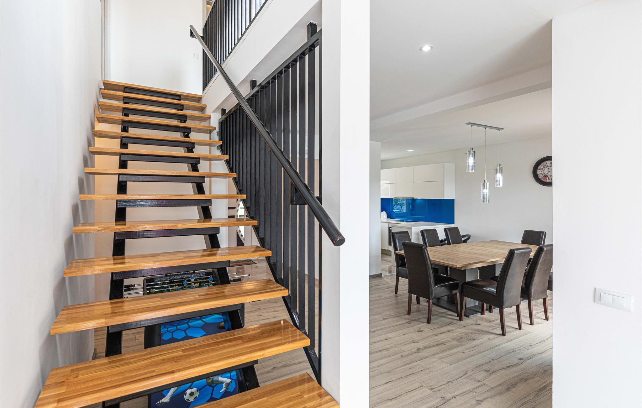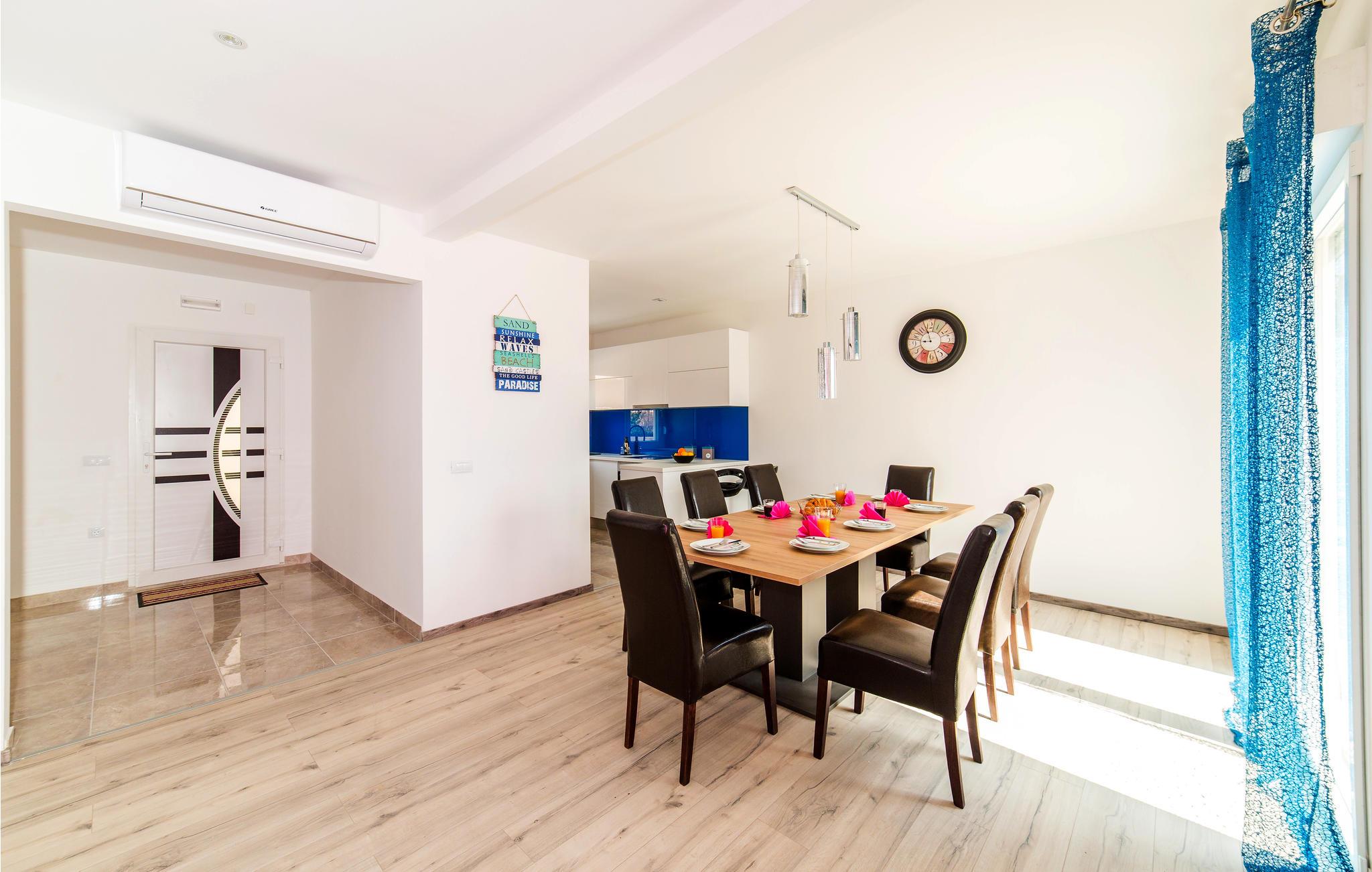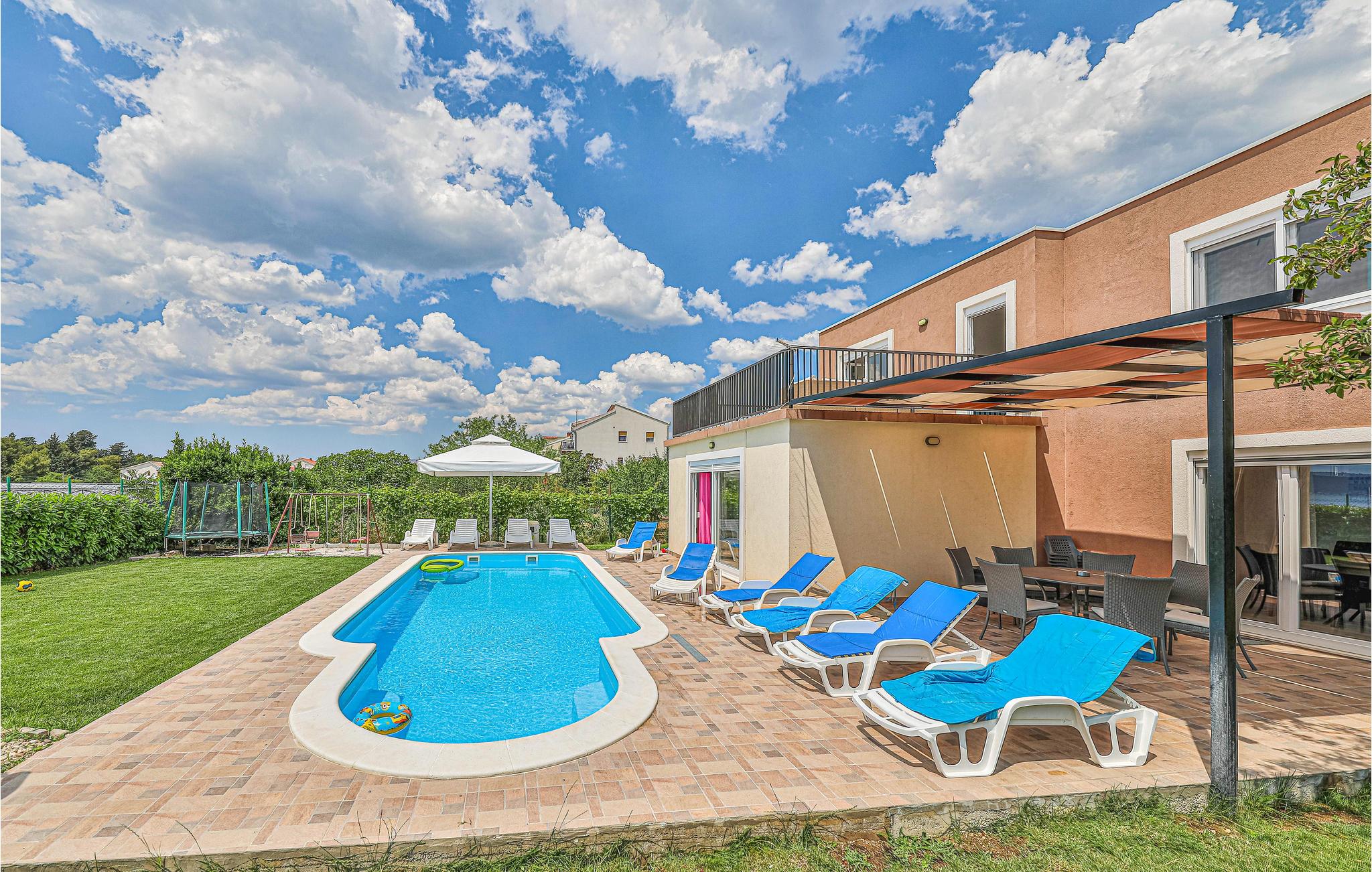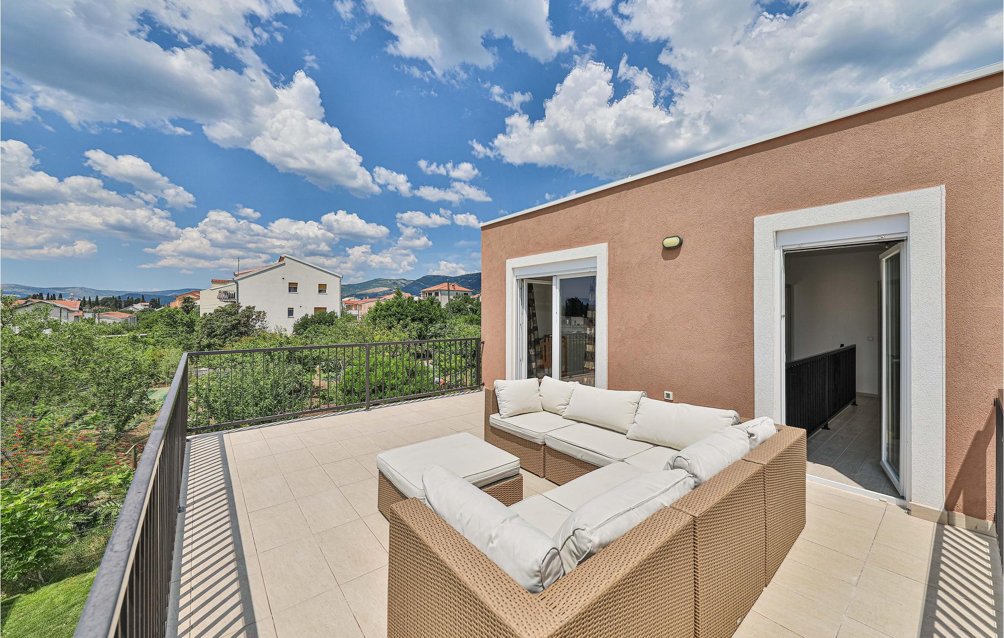 Hold jeres rigtig dejlige ferie i dette stilrene feriehus med pool. Huset ligger på en indhegnet grund med parkeringsplads, og på husets sydside ligger der en pool. Ferieboligen er fordelt på stueplan med køkken og spisestue, soveværelser, badeværelse og et ekstra wc samt en rummelig stue. På første sal er der endnu tre soveværelser, to badeværelser og en stor terrasse med udsigt over havet. Den skønne bolig ligger lige i nærheden af havet, promenaden og en restaurant. Tag på udflugter til Split, Trogir og til den historiske ruinby Salona. Til huset hører også to barnecykler.