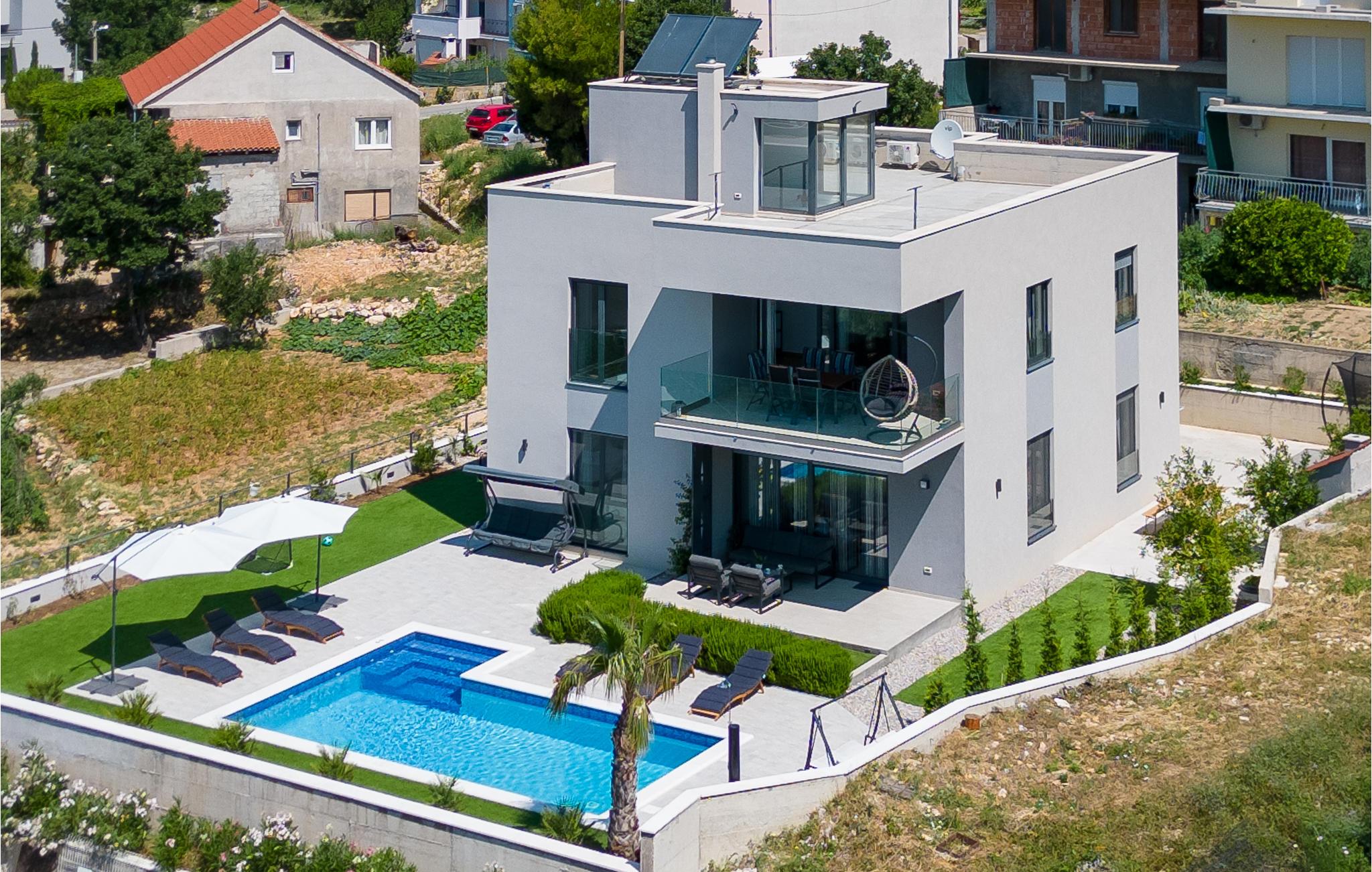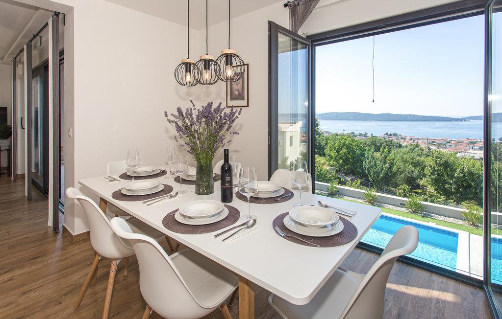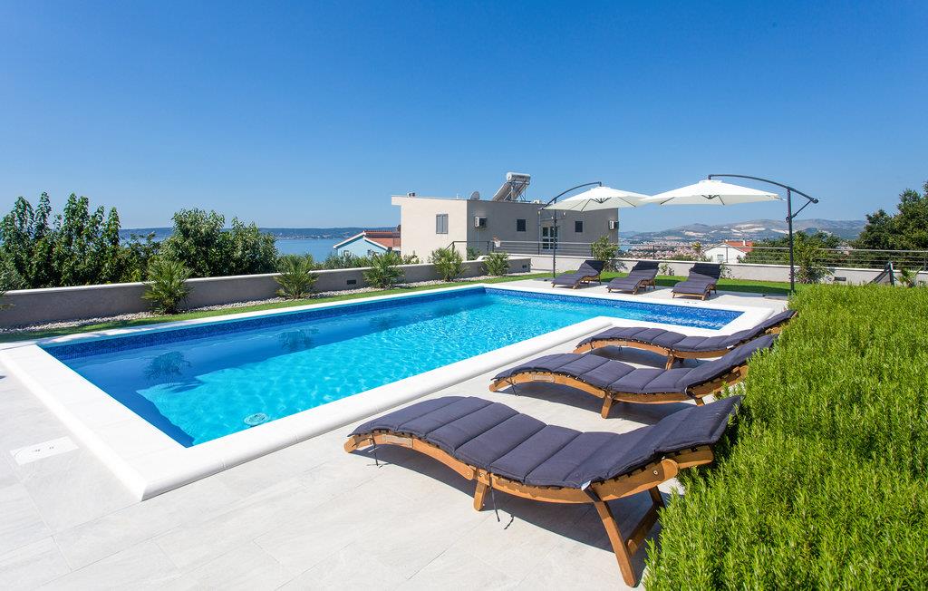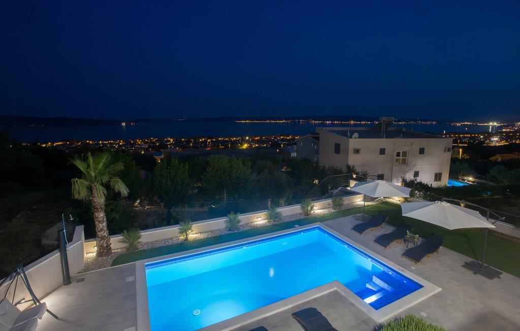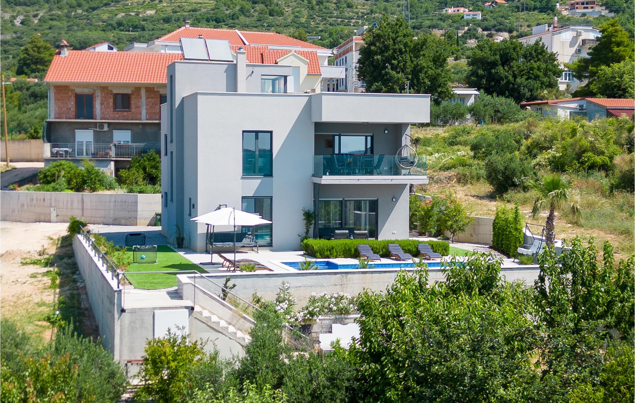 Dette store feriehus byder jer velkommen mellem Trogir og Split. De højkvalitets og smagfuldt indrettede værelser strækker sig over to etager og byder på plads til selv en stor familie eller til flere familier. Her finder I alt hvad I behøver for en vellykket ferie, for huset byder på gode faciliteter for store og små.