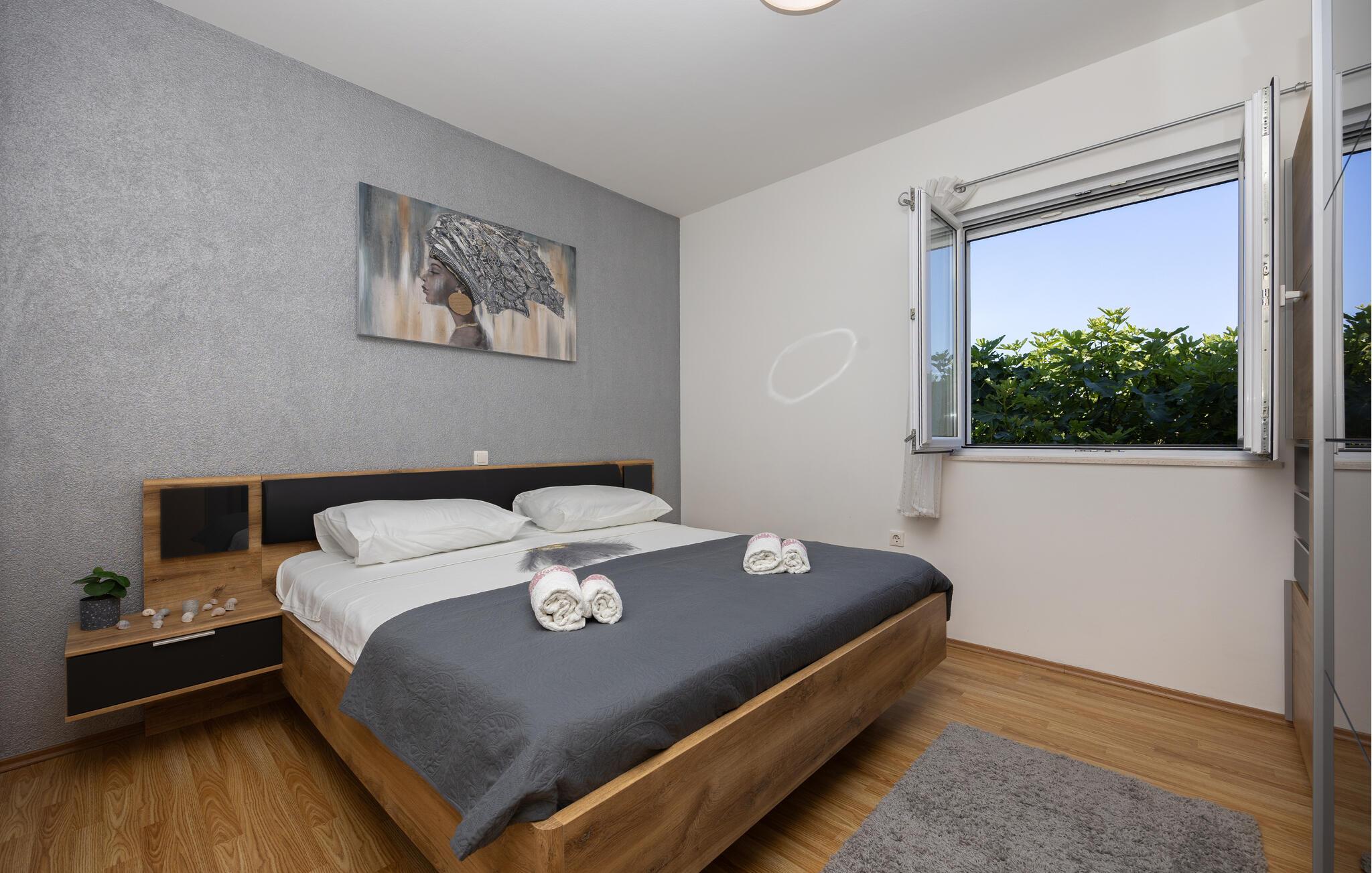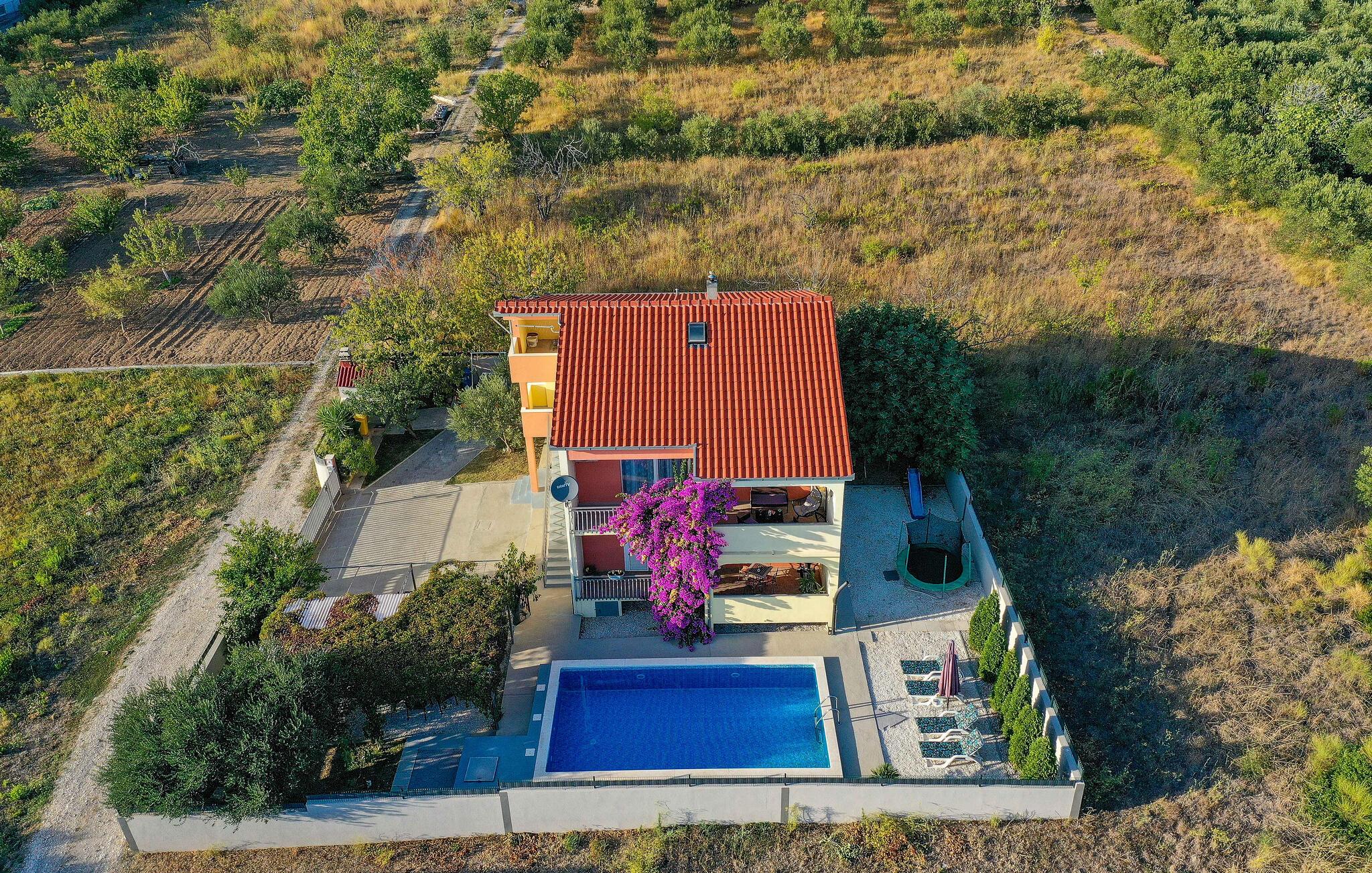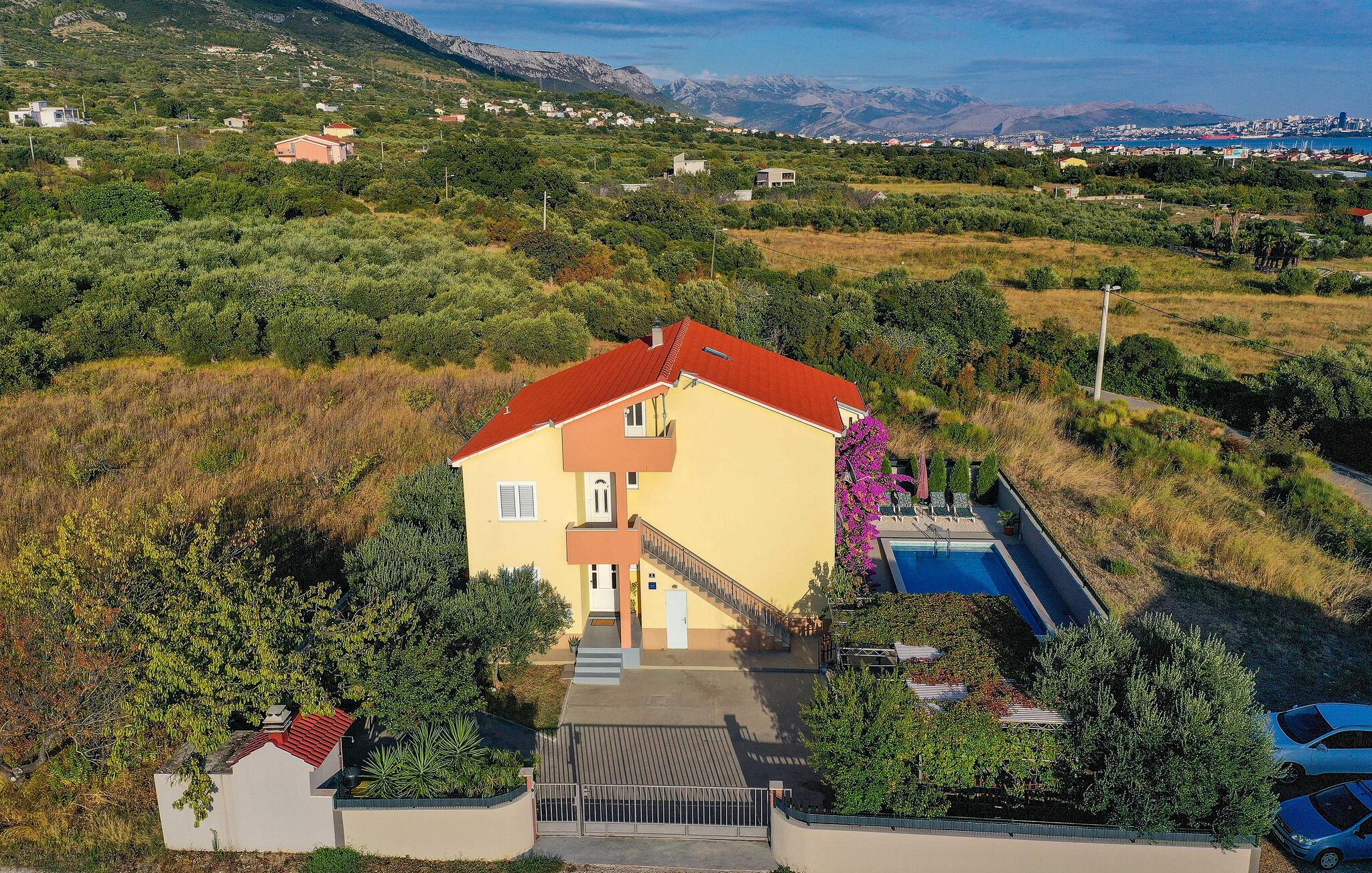 Dette feriehus med pool og dejlig have rummer to lejligheder, der er forbundet med udendørs trapper og er ideel til ferie med to familier. Lejlighederne er ens udstyret og rummer begge tre soveværelser, et badeværelse og en stor stue med åben forbindelse til køkken og med spiseafdeling. Grunden er komplet indhegnet, her kan I trygt lade jeres børn lege og tage en forfriskende svømmetur i poolen sammen. Fra terrassen har i en dejlig udsigt over Kastelbugten, som med garanti vil fæstne sig på nethinden. Der er kun en kort køretur til de historiske byer Trogir og Split.