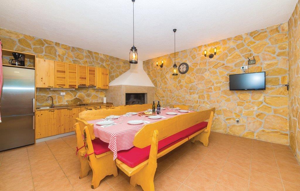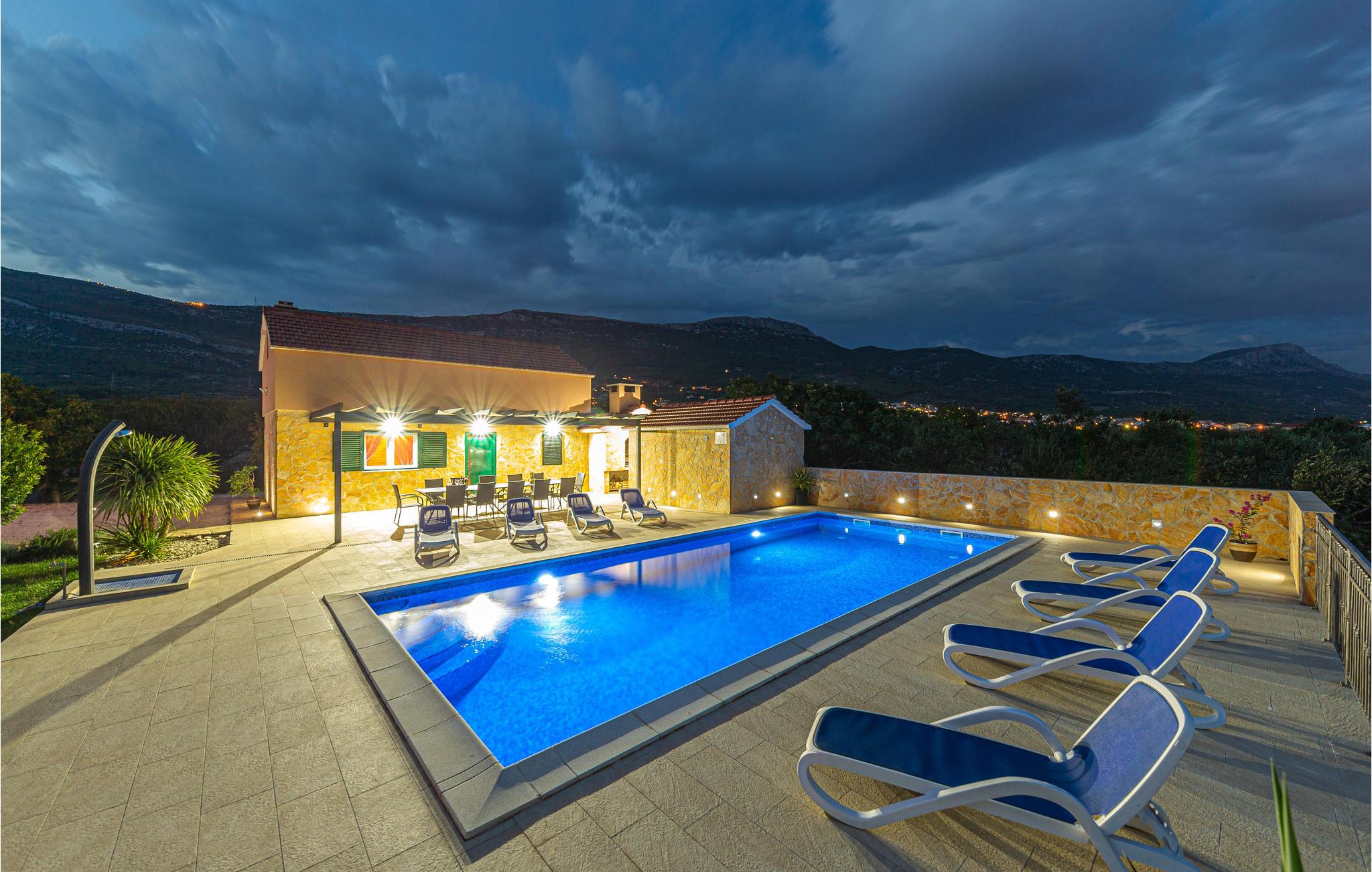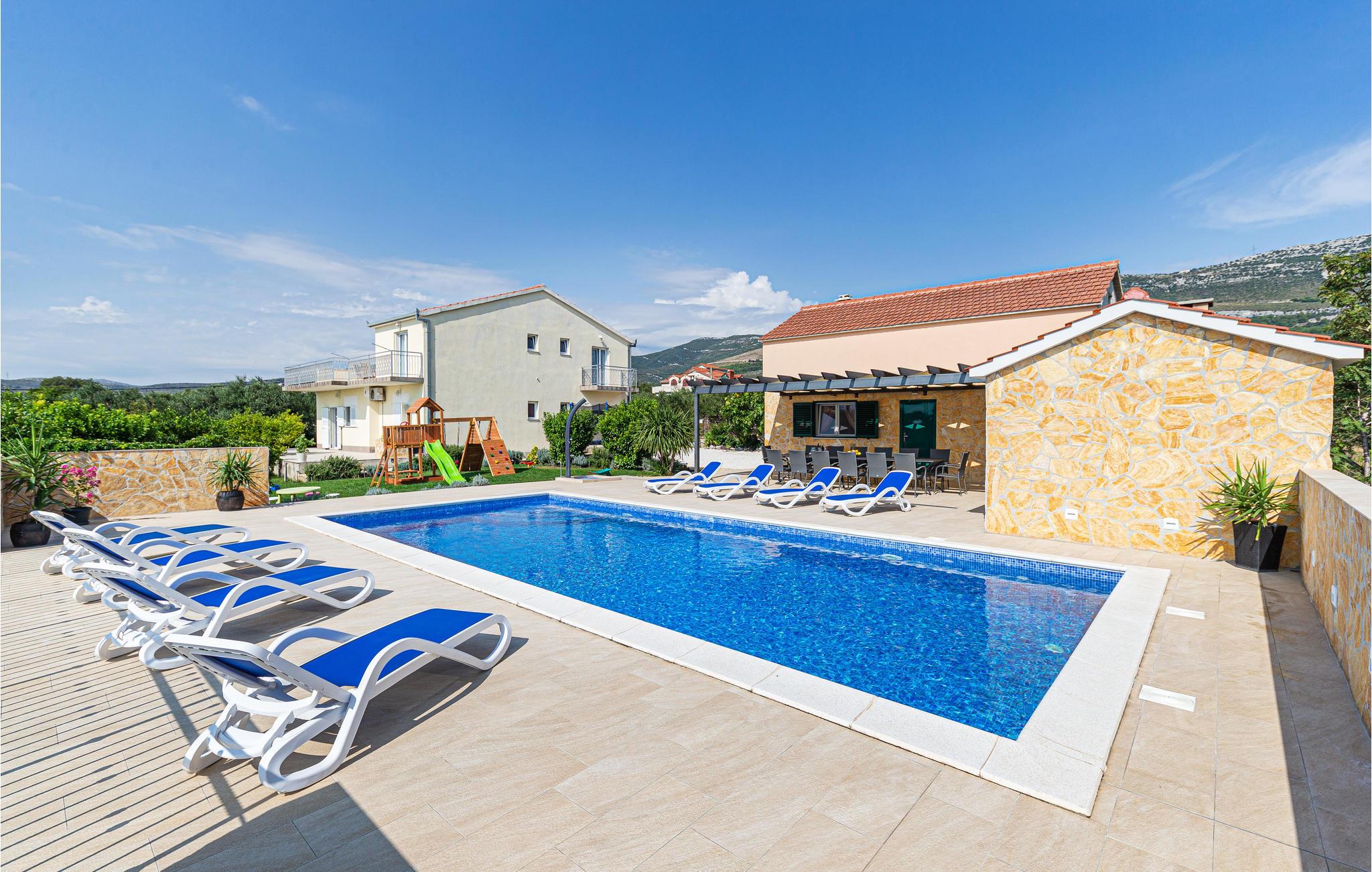 Moderne og smagfuldt indrettet feriehus med pool, her kan I holden en dejlig ferie. I huset er der to separate lejligheder (udendørs trappe). I stueplan ligger de fire soveværelser, på øverste etage er der to soveværelser. I kan tage en dejlig forfriskende svømmetur i poolen, der ligger ved siden af den store terrasse, hvor der er et godt udstyret udendørs køkken hvor der er en grill. I den store have kan jeres børn lege trygt og I må gerne høste fra havens frugttræer og i køkkenhaven. Takket være de dejligt ugenerte omgivelser kan I holde en afslappet ferie, hvor I kan nyde udsigten ud over Kastelbugten. Lige i nærheden af et slagteri. Tag også en tur til en af Europas smukkeste byer - Split, der har en særlig charme, pga sine mange gamle bygninger og sin beliggenhed ved havet.