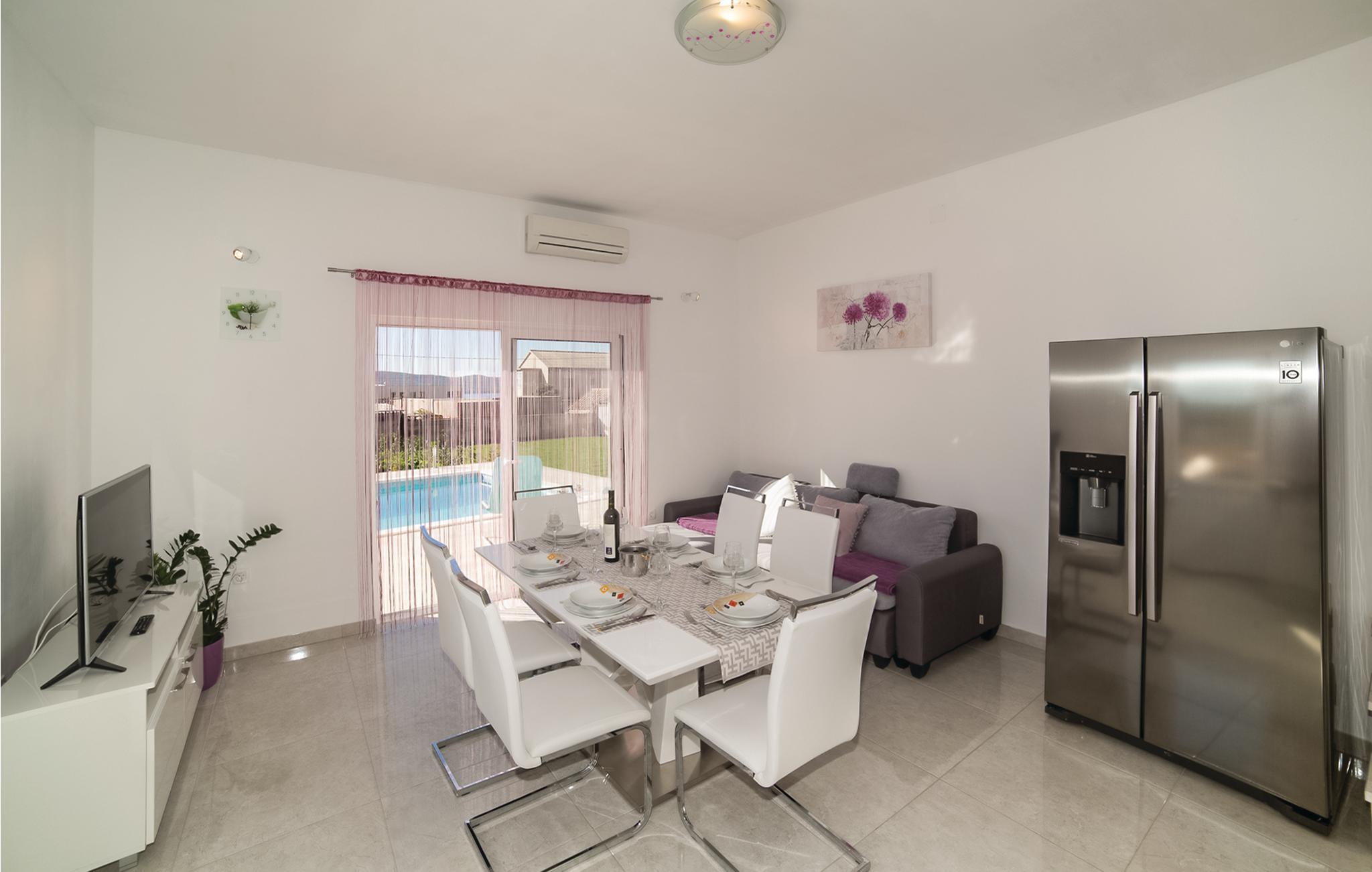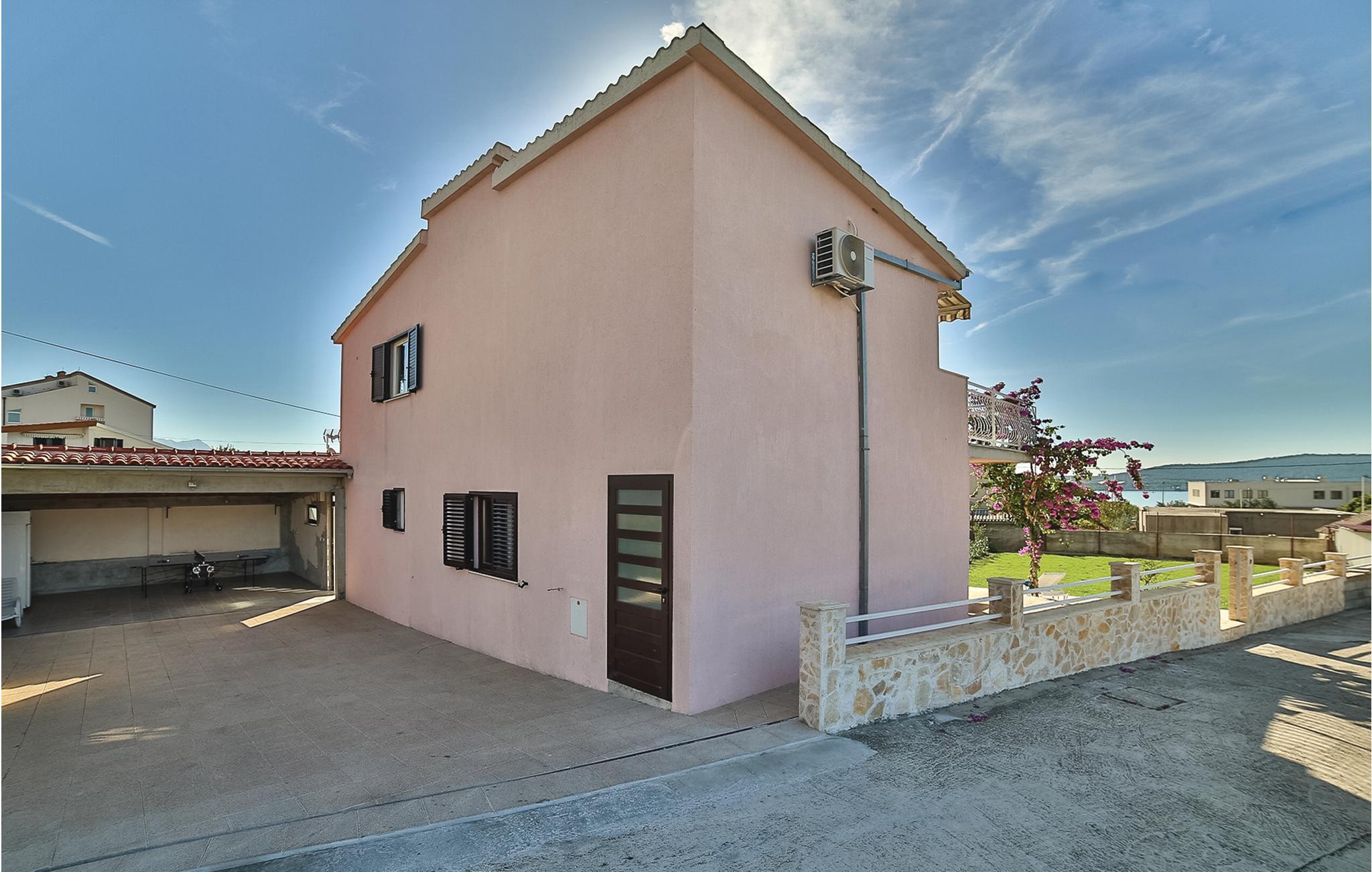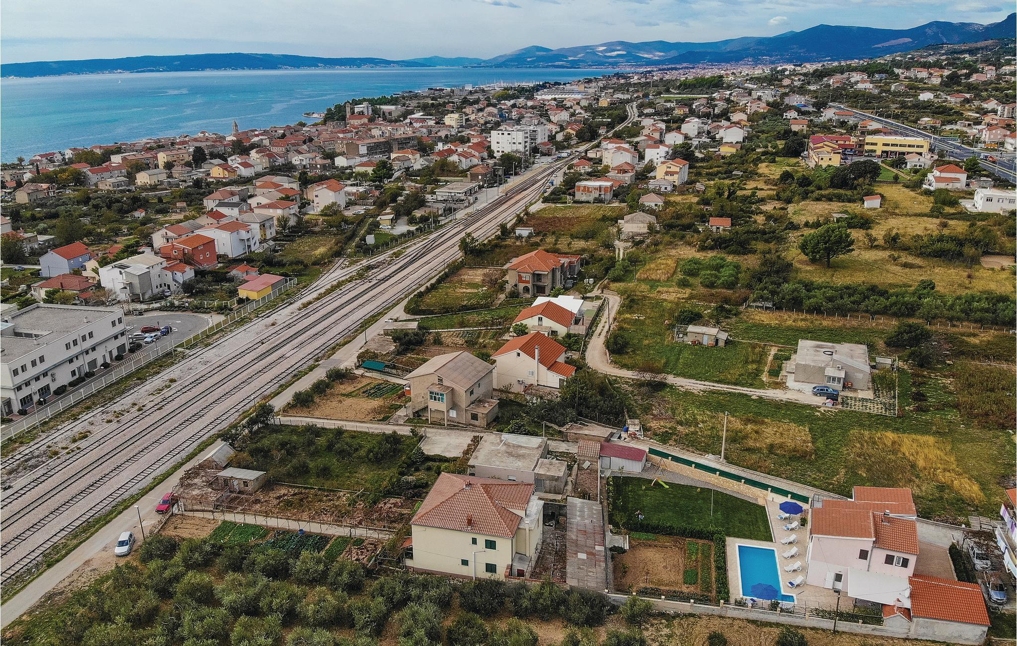 Dette charmerende feriehus med pool og velplejet have består af to dejligt indrettede lejligheder med terrasser. Fra rummene i stueetagen kommer I direkte ud til poolen, til terrassen med grillplads og til haven. I haven bliver der dyrket sæsonens lækre grøntsager. Trænger I til lidt motion, er der desuden et badmintonnet og et bordtennisbord. På grund af den nærliggende gade og gode togforbindelser er det meget nemt at komme til byerne Split og Trogir. Her kan I finde et stort tilbud af spændende fritidsaktiviteter. To af husets fire parkeringspladser er overdækket.