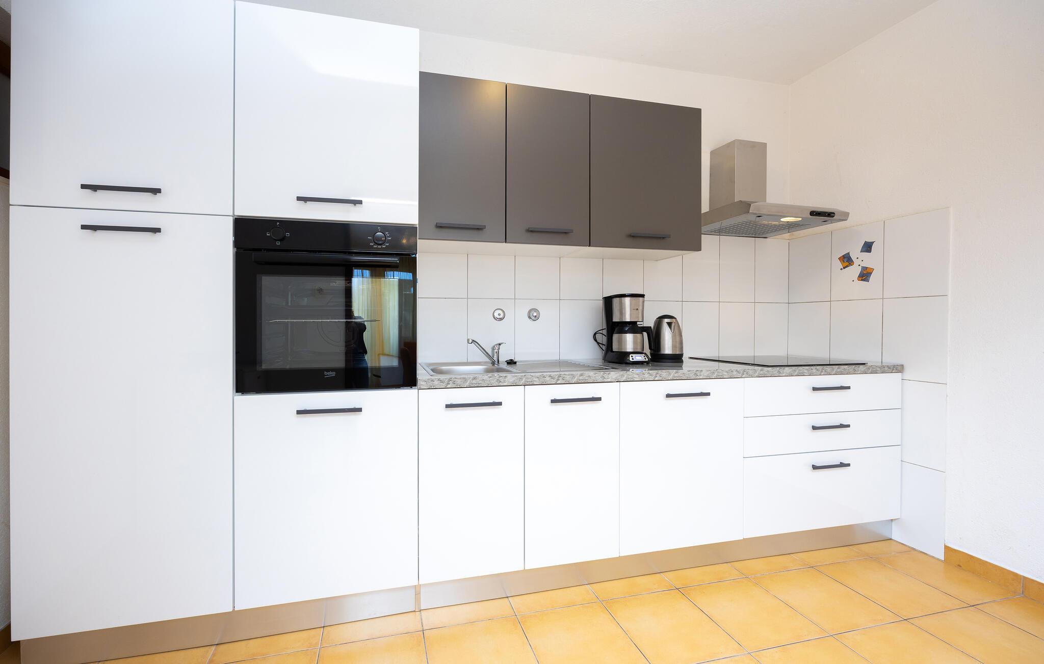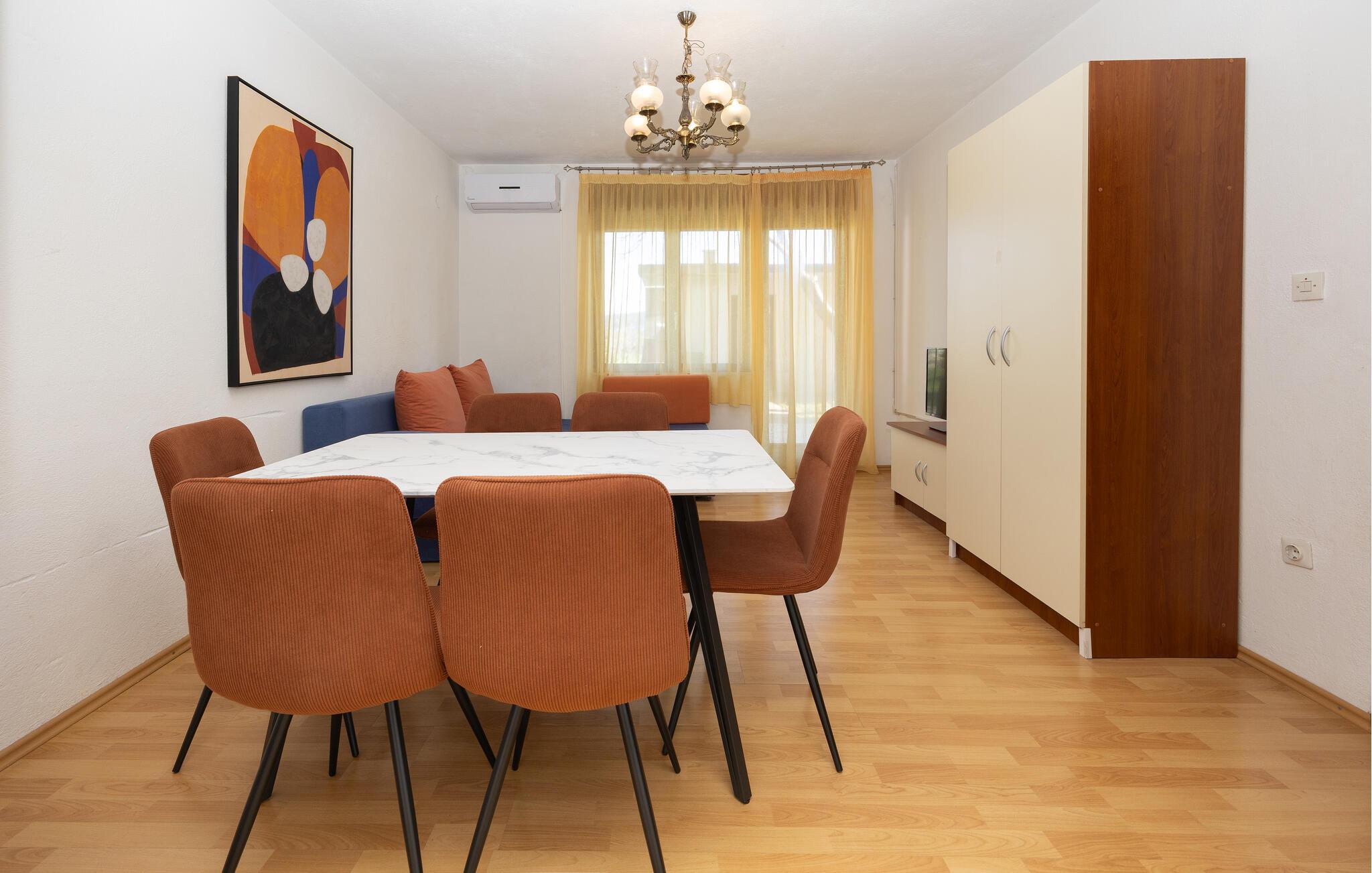 Denne ferielejlighed ligger i det naturbeskyttede område Pantan, kun ca. to km fra Trogirs livlige centrum. Foran huset er der en stor have, en terrasse hvor I kan slappe af og en fælles grill. Der er kun 50 m til den nærmeste sandstrand, gå gennem stien i haven. Besøg Split, hvis riviera er centrum for mange interessante former for arrangementer sommer som vinter. Her kan I også se Diokletians palads og Hl. Dujes katedral. I kan også smutte en tur til det nærliggende Trogir, hvis gamle bydel er med på UNESCOs kulturarvsliste.