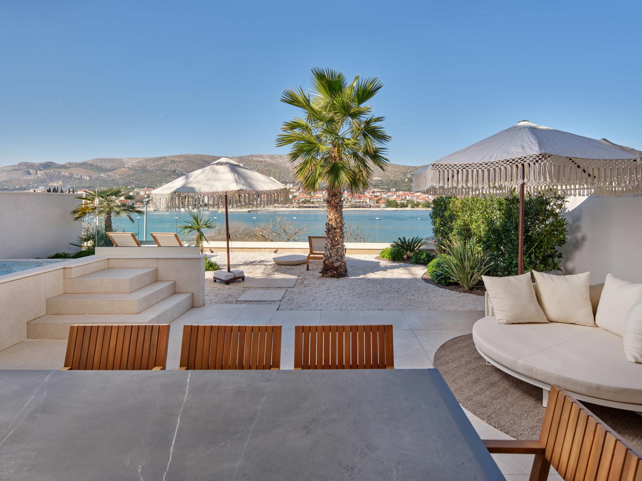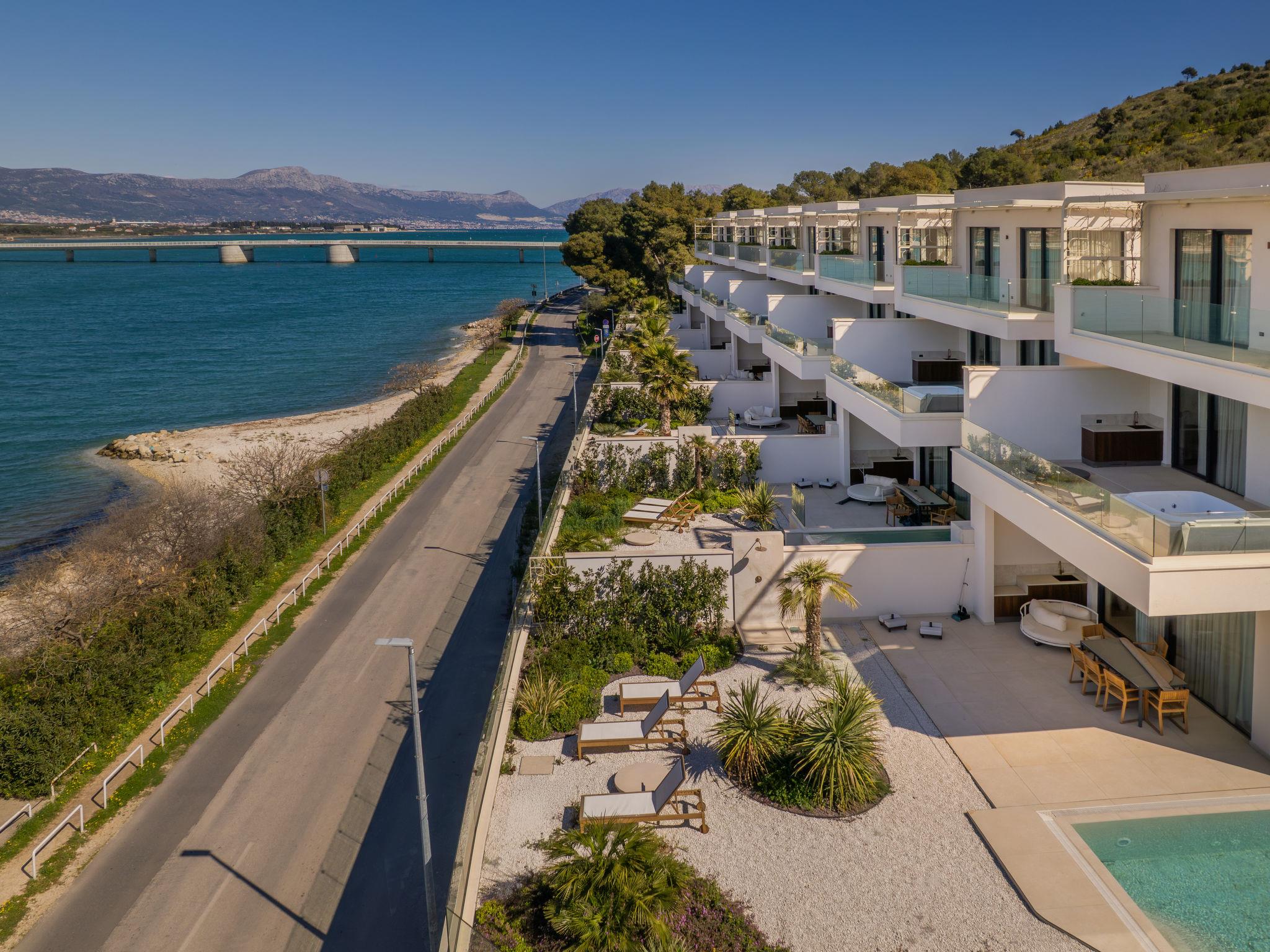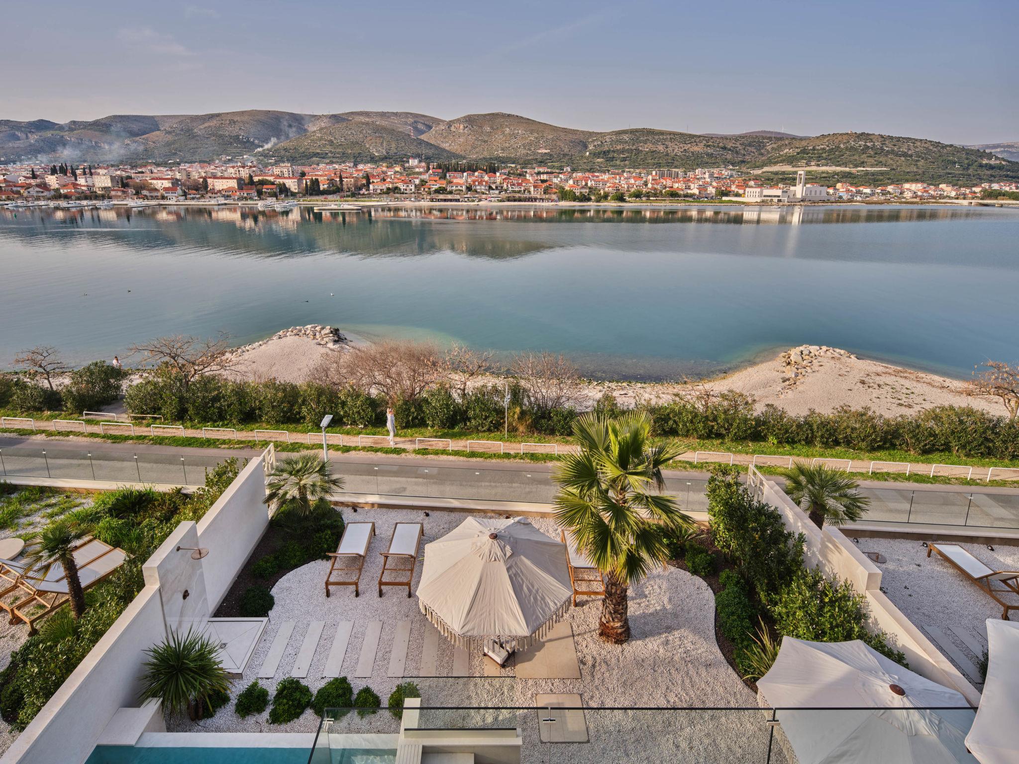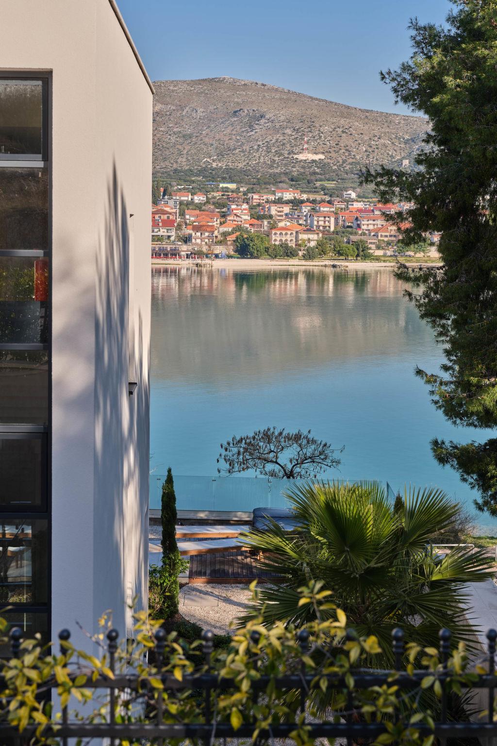 Villa "Mistral", 3 storeys, built in 2024. 700 m from the centre of Trogir, 10 m from the sea, 10 m from the beach, road to cross, north facing position. Private: property 400 m2, swimming pool angular, heated (20 m2, depth 150 cm, seasonal availability: 01.Mar. - 01.Nov.). Outdoor shower, hot tub, terrace (40 m2). In the complex: reception, restaurant, internet access, sauna, fitness room, massage (extra). Air conditioning, washing machine, tumble dryer. Parking at the house on the premises, communal covered parking. E-charging station. Shop 500 m, supermarket 1 km, restaurant 700 m, bus stop 500 m, pebble beach 10 m. Please note: lift to 2nd floor. Airfield 5 km from the property.