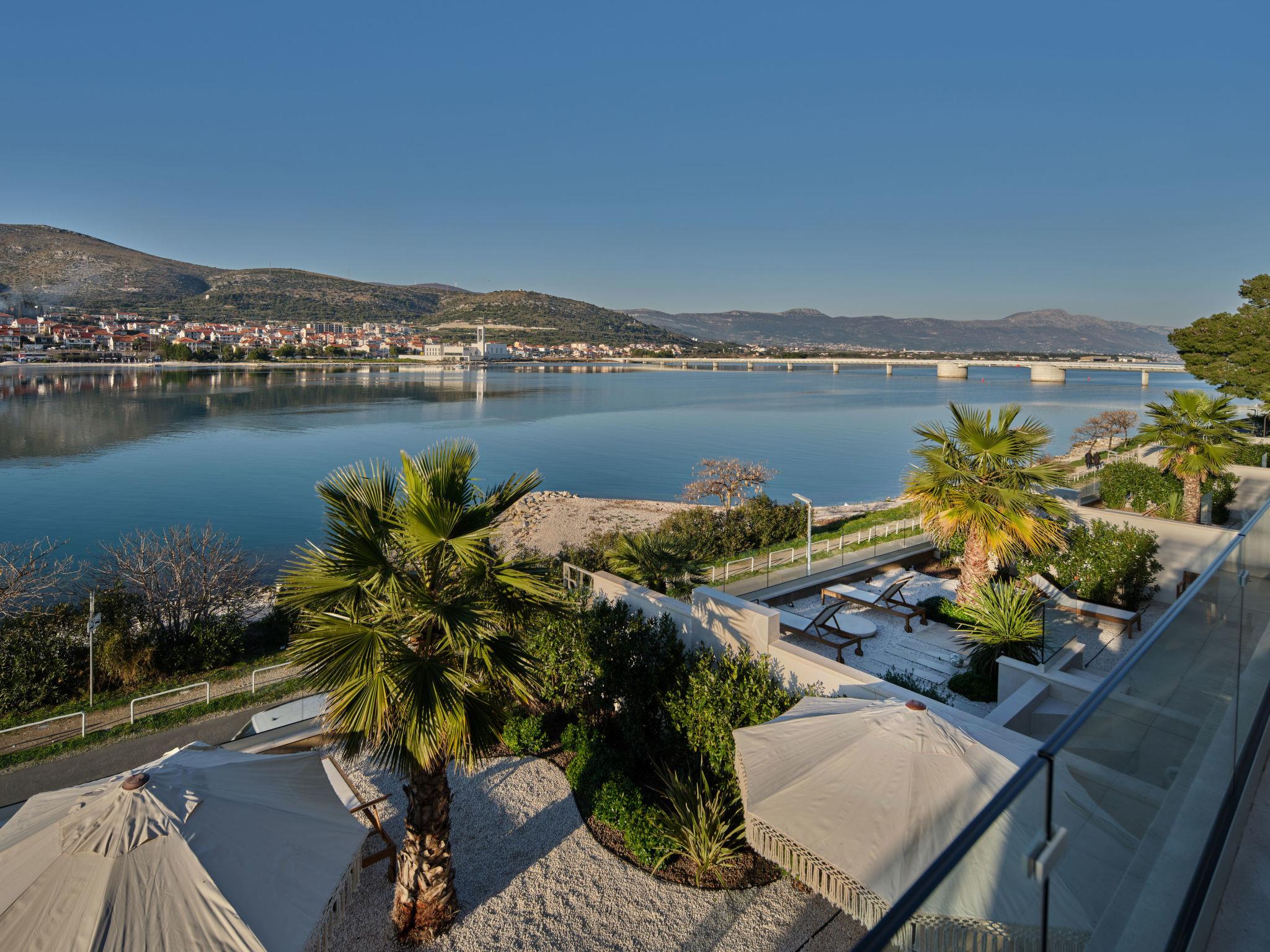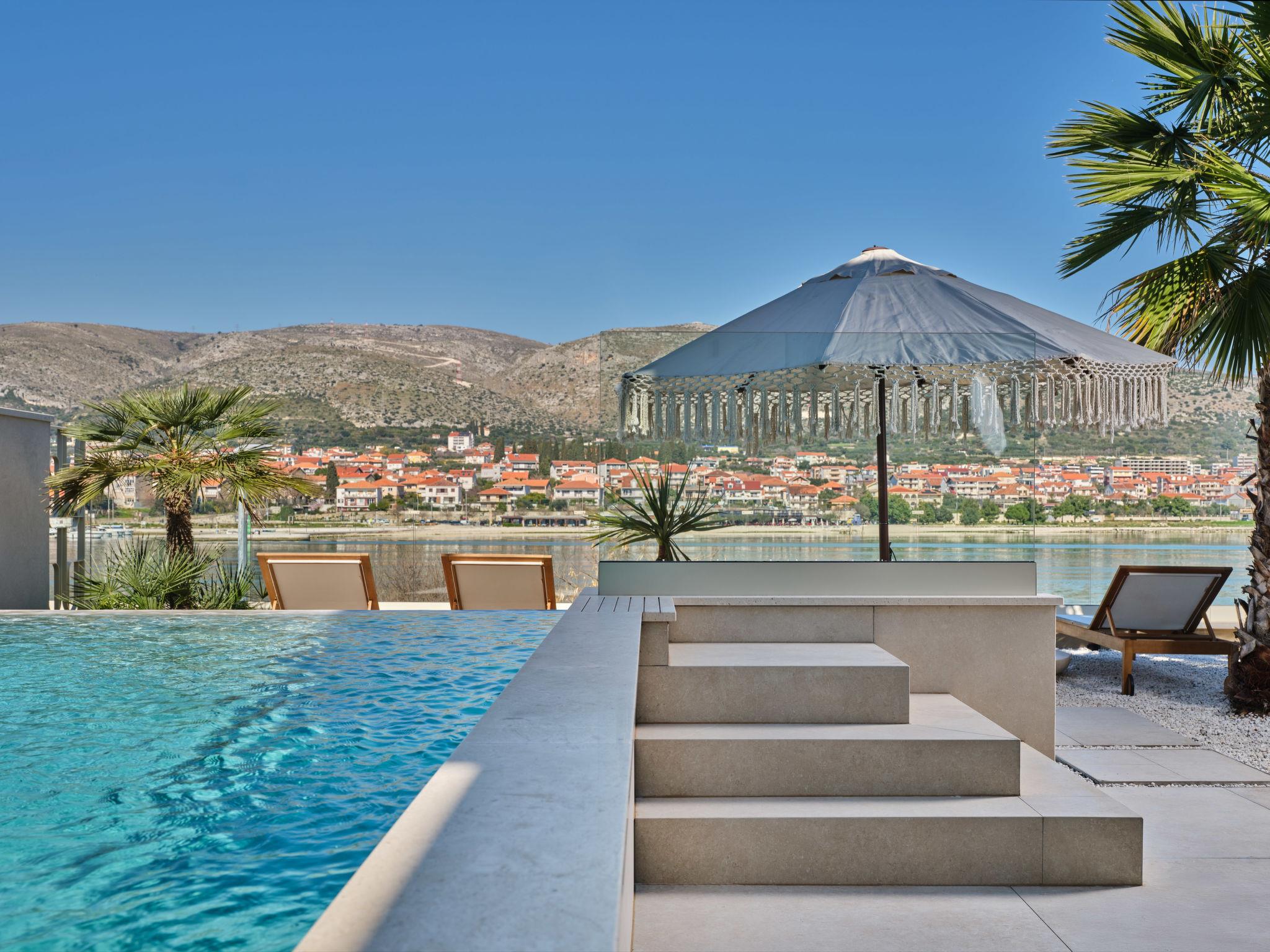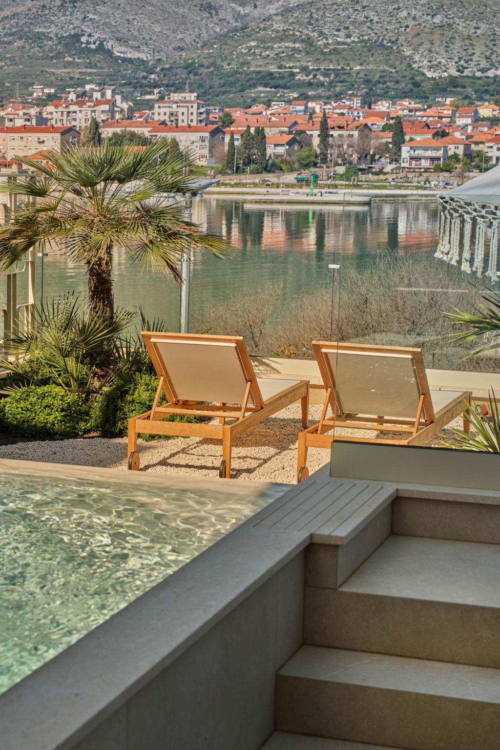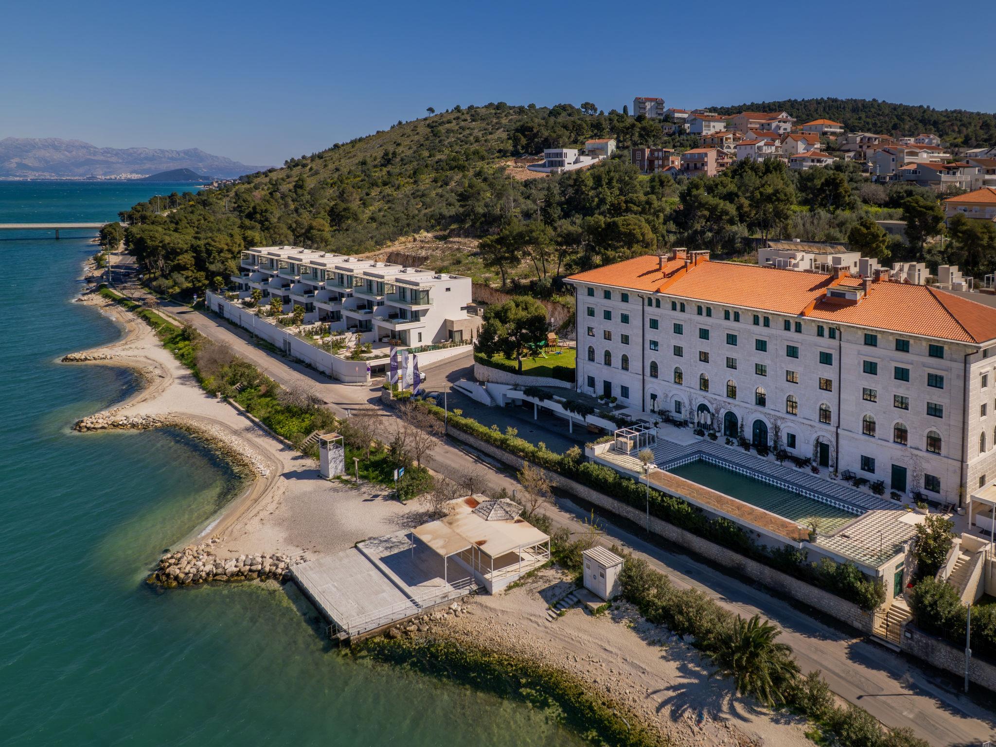 Villa "Mistral", 3 storeys, built in 2024. 700 m from the centre of Trogir, 10 m from the sea, 10 m from the beach, road to cross, north facing position. Private: property 400 m2, swimming pool angular, heated (20 m2, depth 150 cm, seasonal availability: 01.Mar. - 01.Nov.). Outdoor shower, hot tub, terrace (40 m2). In the complex: reception, restaurant, internet access, sauna, fitness room, massage (extra). Air conditioning, washing machine, tumble dryer. Parking at the house on the premises, communal covered parking. E-charging station. Shop 500 m, supermarket 1 km, restaurant 700 m, bus stop 500 m, pebble beach 10 m. Please note: lift to 2nd floor. Airfield 5 km from the property.
