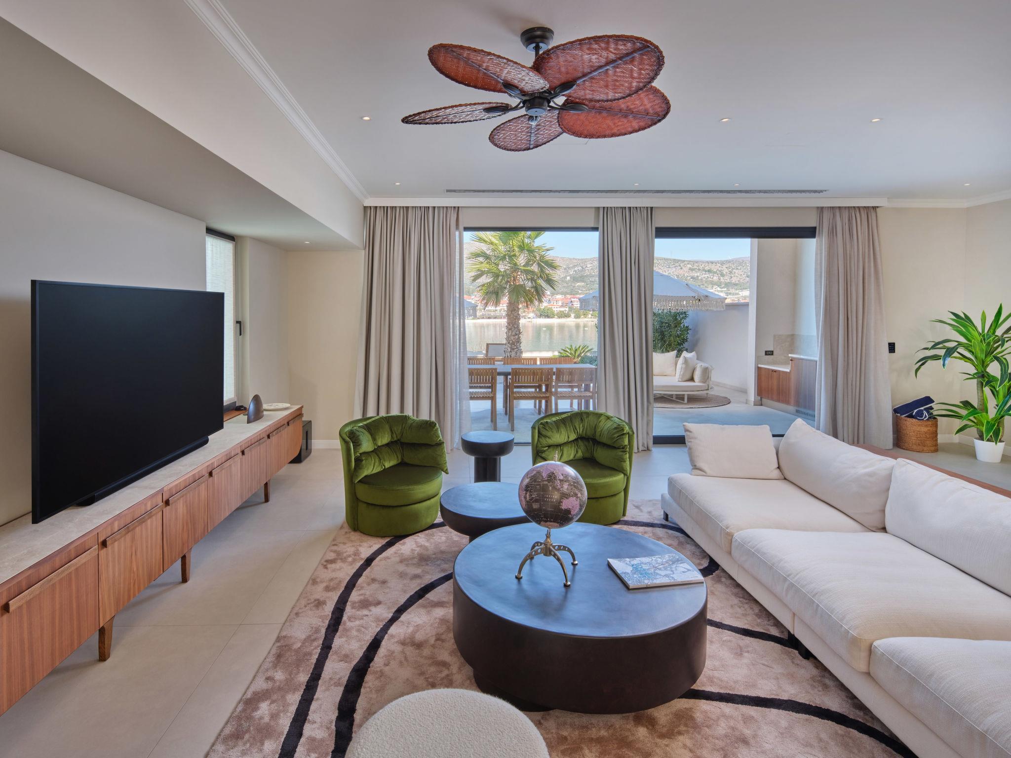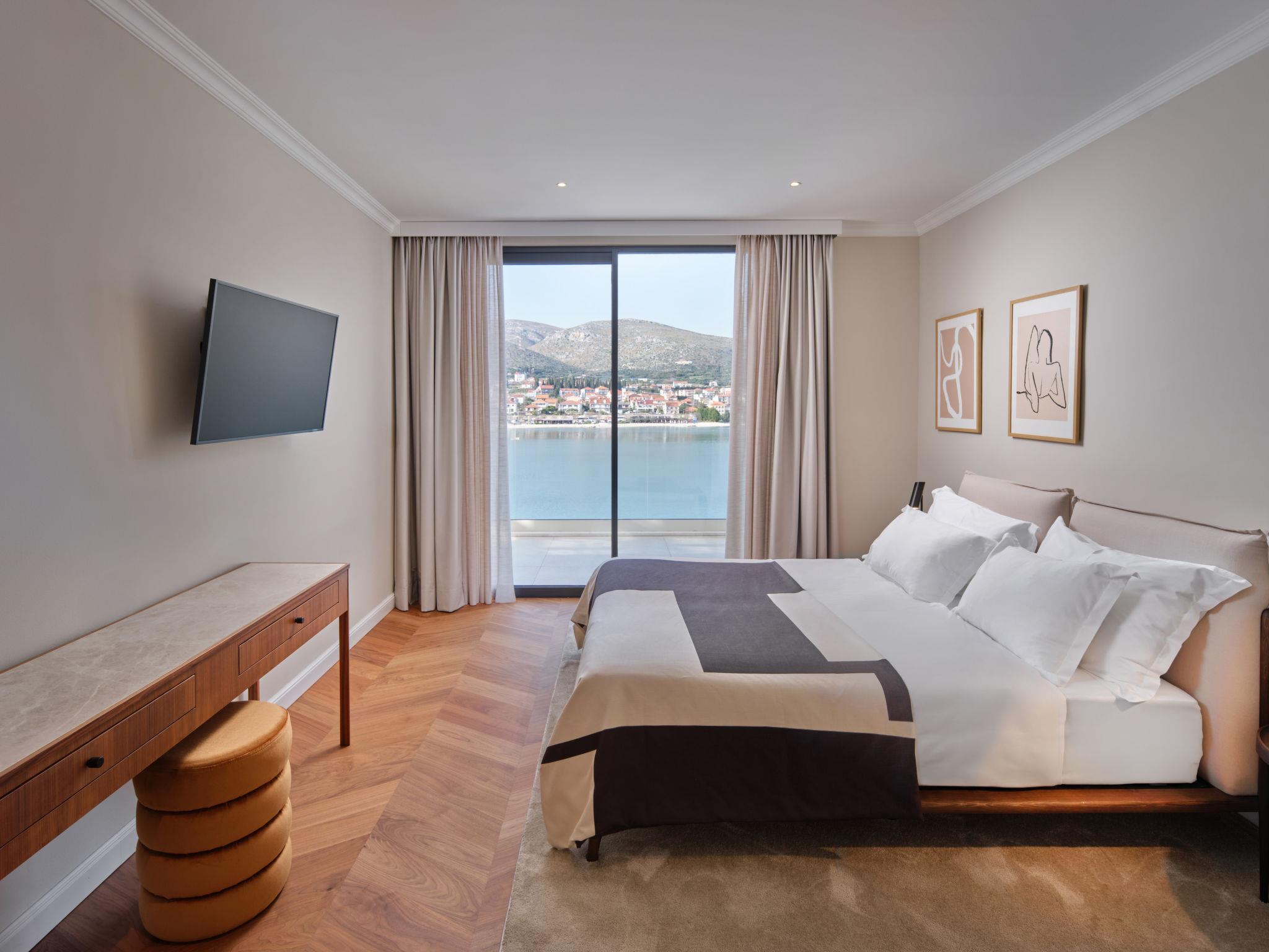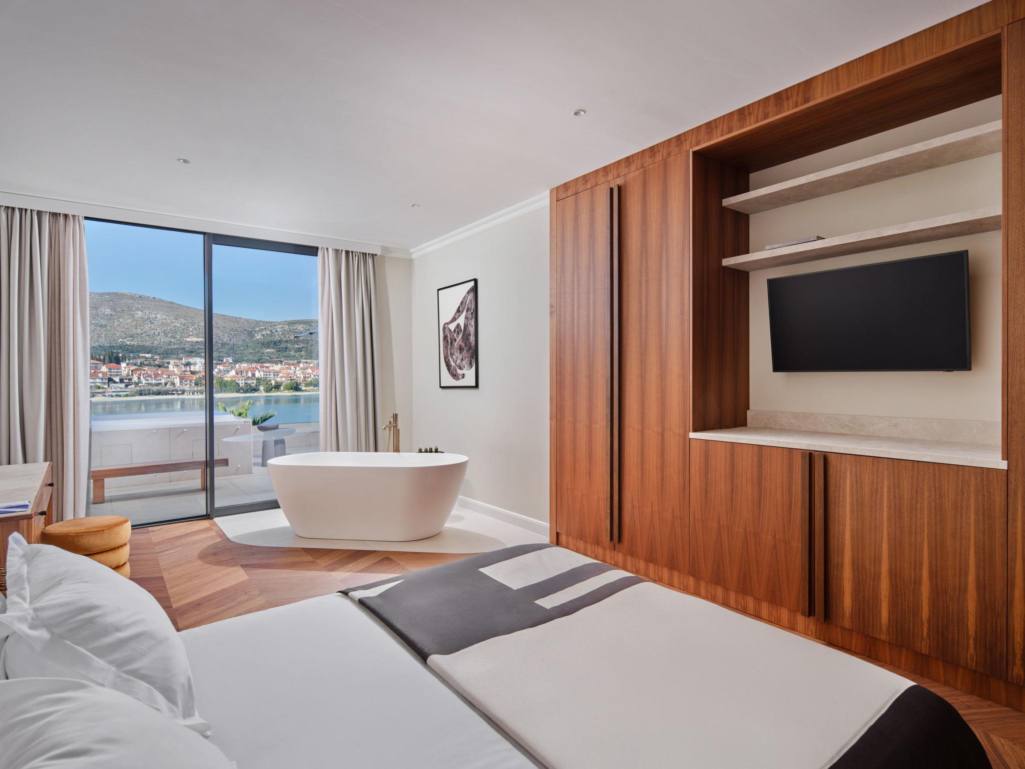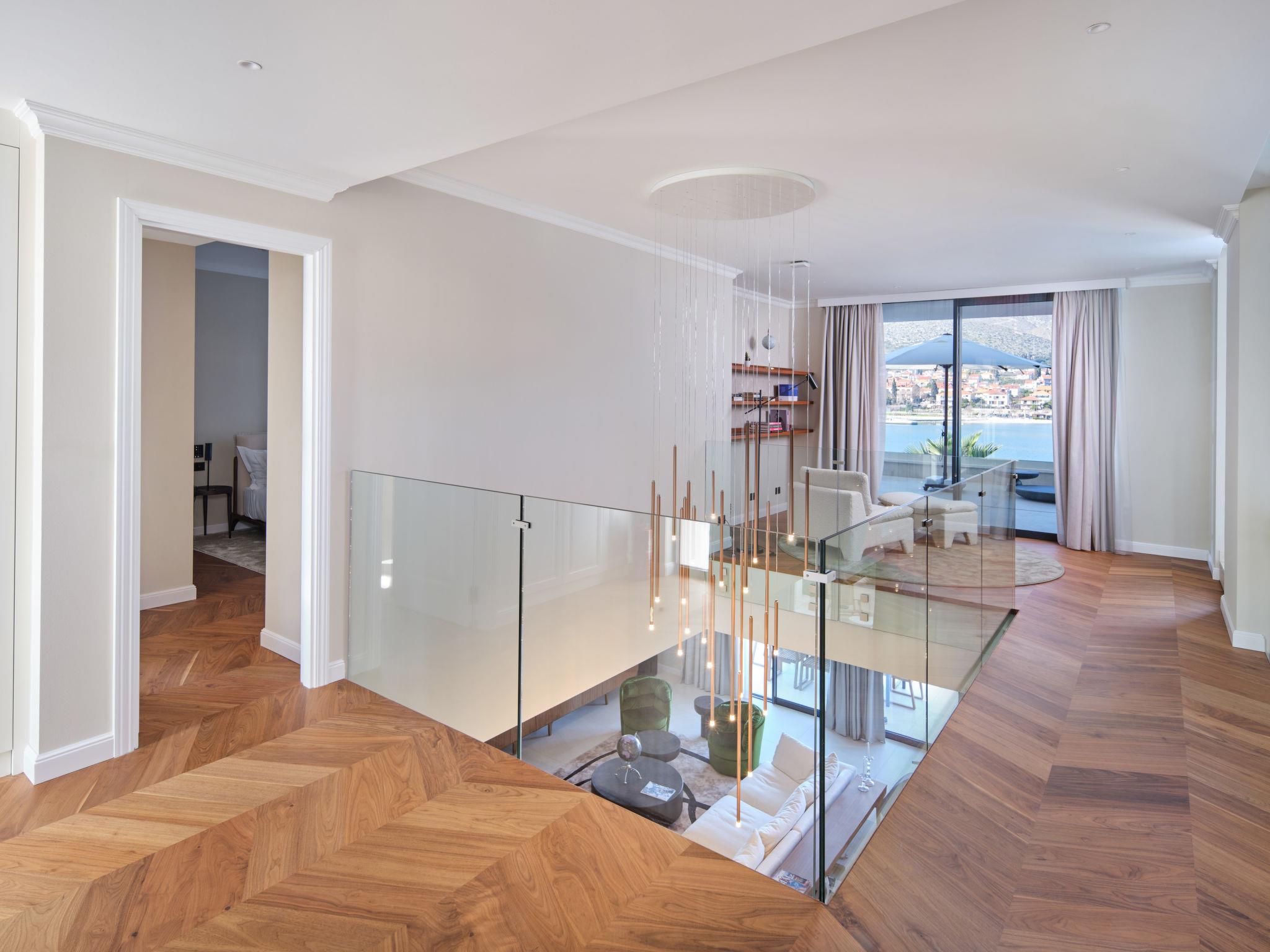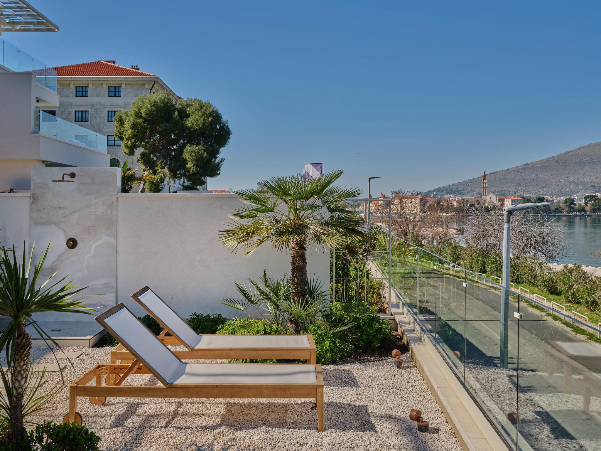 Villa "Mistral", 3 storeys, built in 2024. 700 m from the centre of Trogir, 10 m from the sea, 10 m from the beach, road to cross, north facing position. Private: property 400 m2, swimming pool angular, heated (20 m2, depth 150 cm, seasonal availability: 01.Mar. - 01.Nov.). Outdoor shower, hot tub, terrace (40 m2). In the complex: reception, restaurant, internet access, sauna, fitness room, massage (extra). Air conditioning, washing machine, tumble dryer. Parking at the house on the premises, communal covered parking. E-charging station. Shop 500 m, supermarket 1 km, restaurant 700 m, bus stop 500 m, pebble beach 10 m. Please note: lift to 2nd floor. Airfield 5 km from the property.
