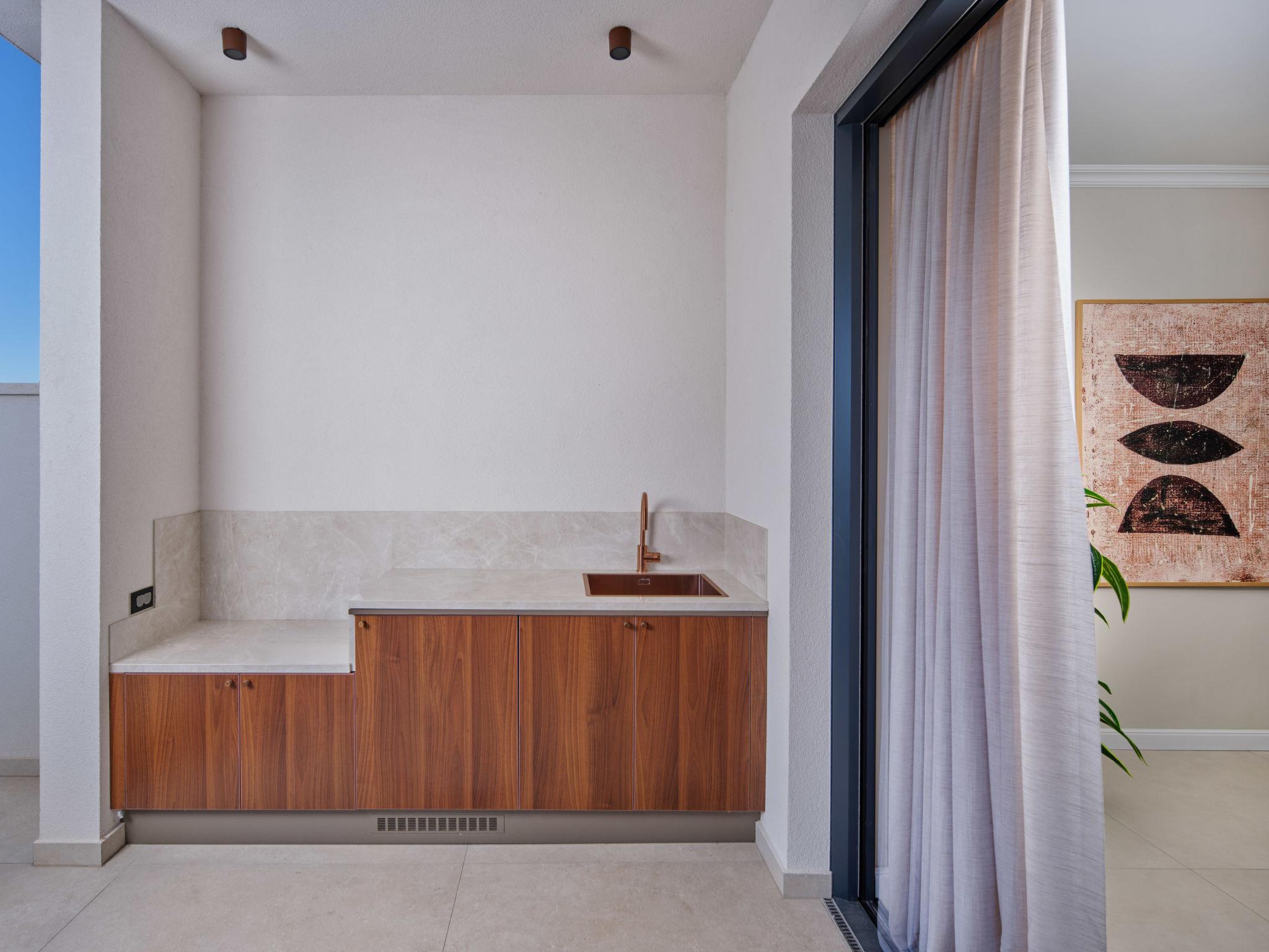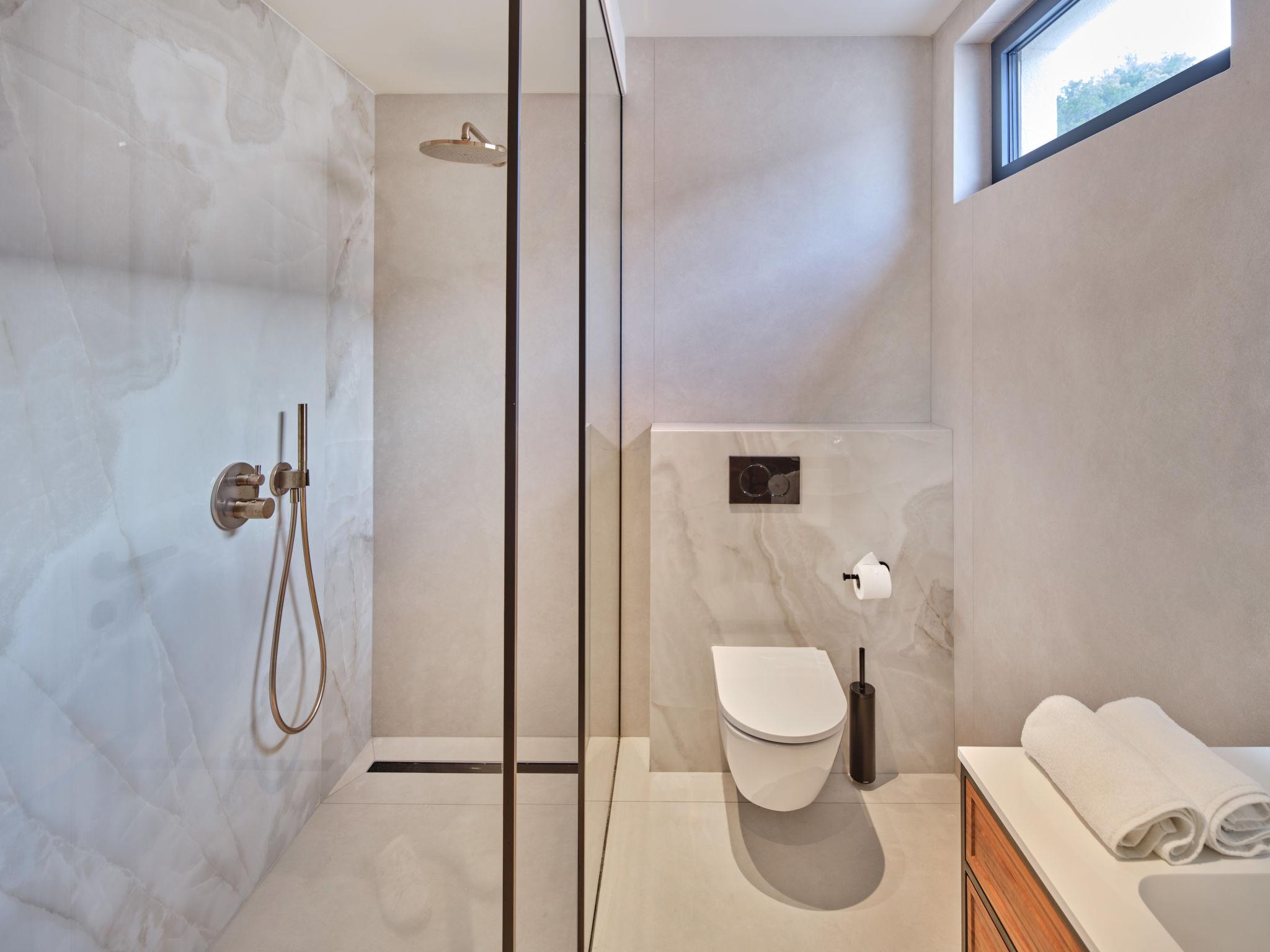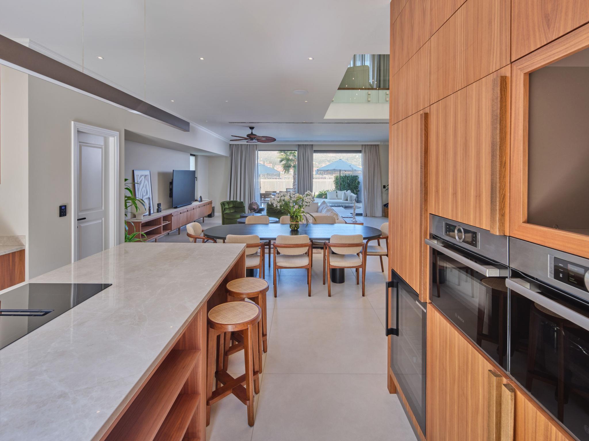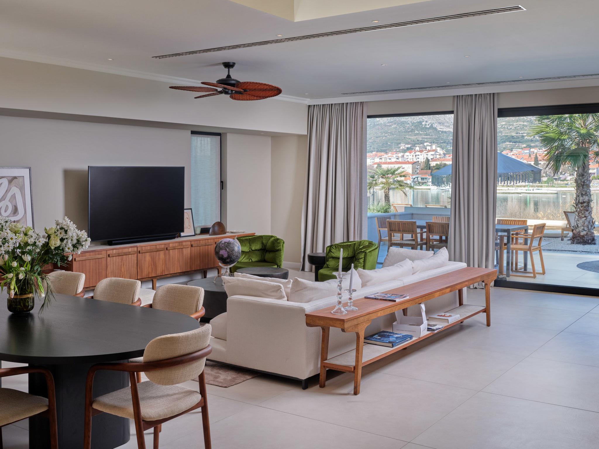 Villa "Mistral", 3 storeys, built in 2024. 700 m from the centre of Trogir, 10 m from the sea, 10 m from the beach, road to cross, north facing position. Private: property 400 m2, swimming pool angular, heated (20 m2, depth 150 cm, seasonal availability: 01.Mar. - 01.Nov.). Outdoor shower, hot tub, terrace (40 m2). In the complex: reception, restaurant, internet access, sauna, fitness room, massage (extra). Air conditioning, washing machine, tumble dryer. Parking at the house on the premises, communal covered parking. E-charging station. Shop 500 m, supermarket 1 km, restaurant 700 m, bus stop 500 m, pebble beach 10 m. Please note: lift to 2nd floor. Airfield 5 km from the property.