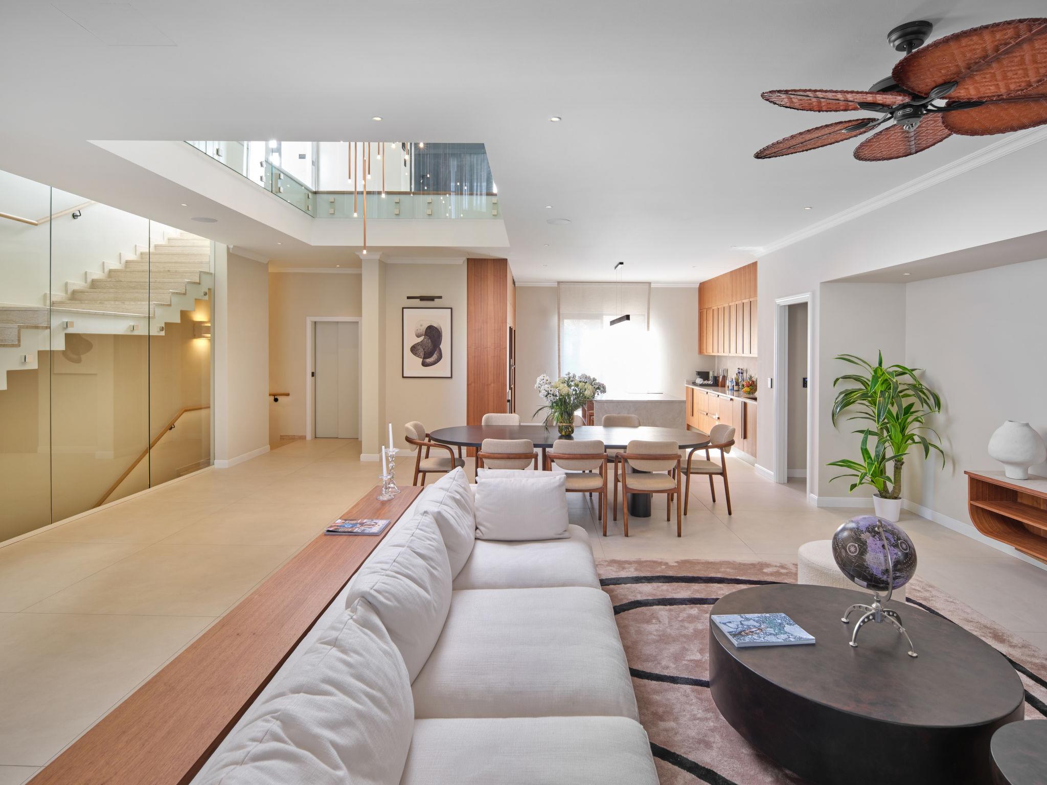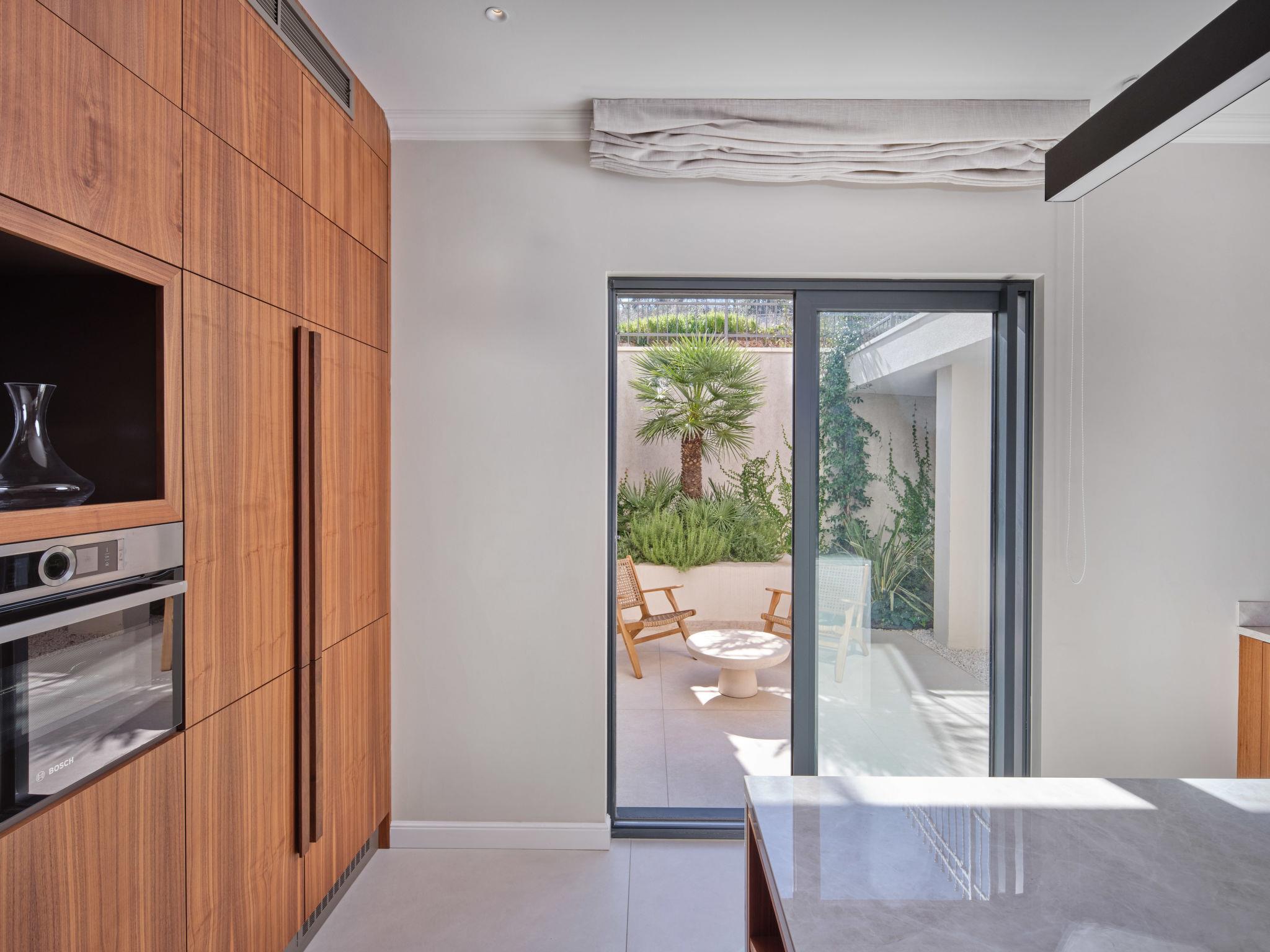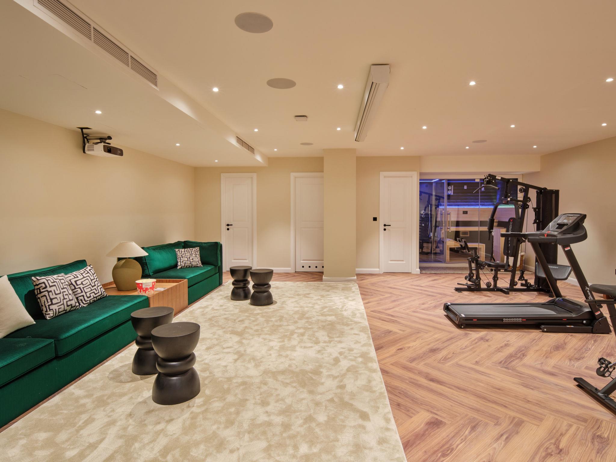 7-room villa 350 m2 on 3 levels, north facing position. Living/dining room with satellite TV (flat screen), fan. Exit to the terrace. 2 rooms, each room with 1 french bed (180 cm, length 200 cm), shower/WC and satellite TV (flat screen). Exit to the terrace. 1 room with 1 french bed (180 cm, length 200 cm), bath/shower/WC and satellite TV (flat screen). Exit to the terrace. 2 rooms, each room with 2 double sofabeds (2 x 90 cm, length 200 cm), satellite TV (flat screen). Open kitchen (oven, dishwasher, 4 induction hot plates, toaster, kettle, microwave, freezer, electric coffee machine, cooking island). Sep. WC. On the lower ground floor: playroom with shower/WC and Home cinema. Balcony 8 m2, balcony 2 m2, terrace 14 m2 partly roofed. Terrace furniture, deck chairs (4). Marvellous view of the sea. Facilities: washing machine, sauna, safe, iron, baby cot (extra), hair dryer. Internet (WiFi, free).