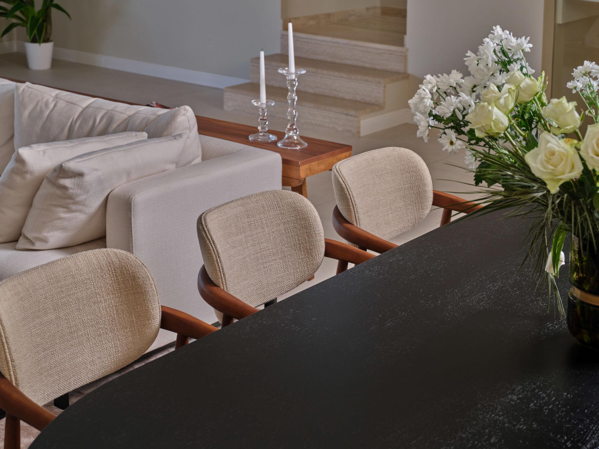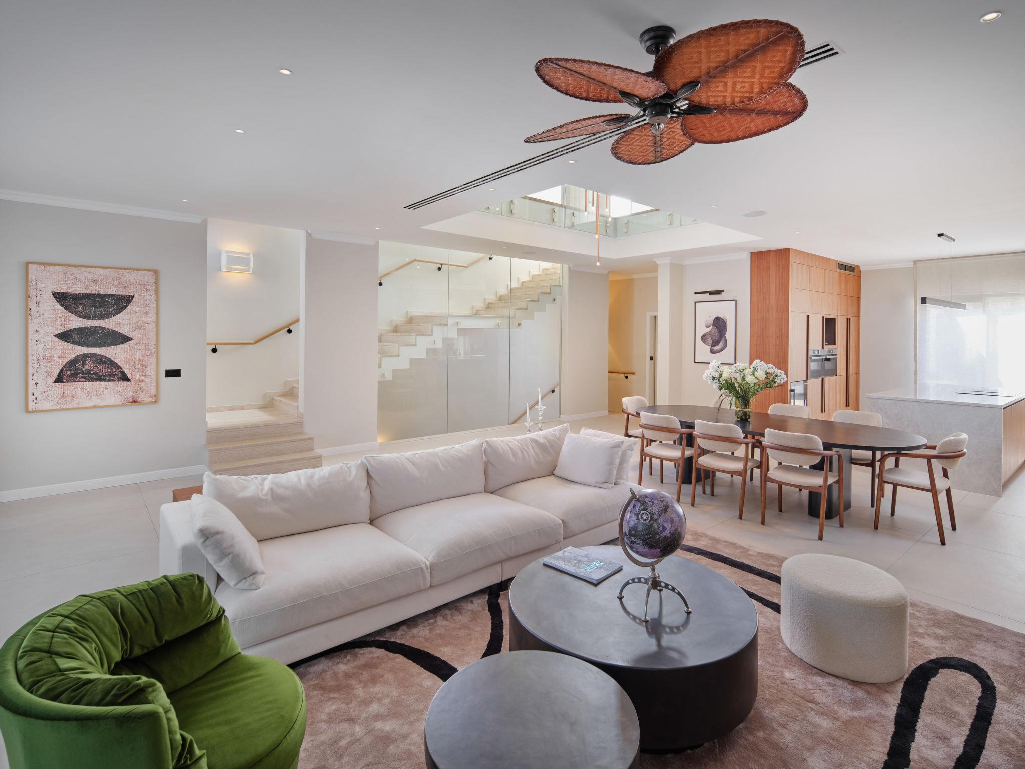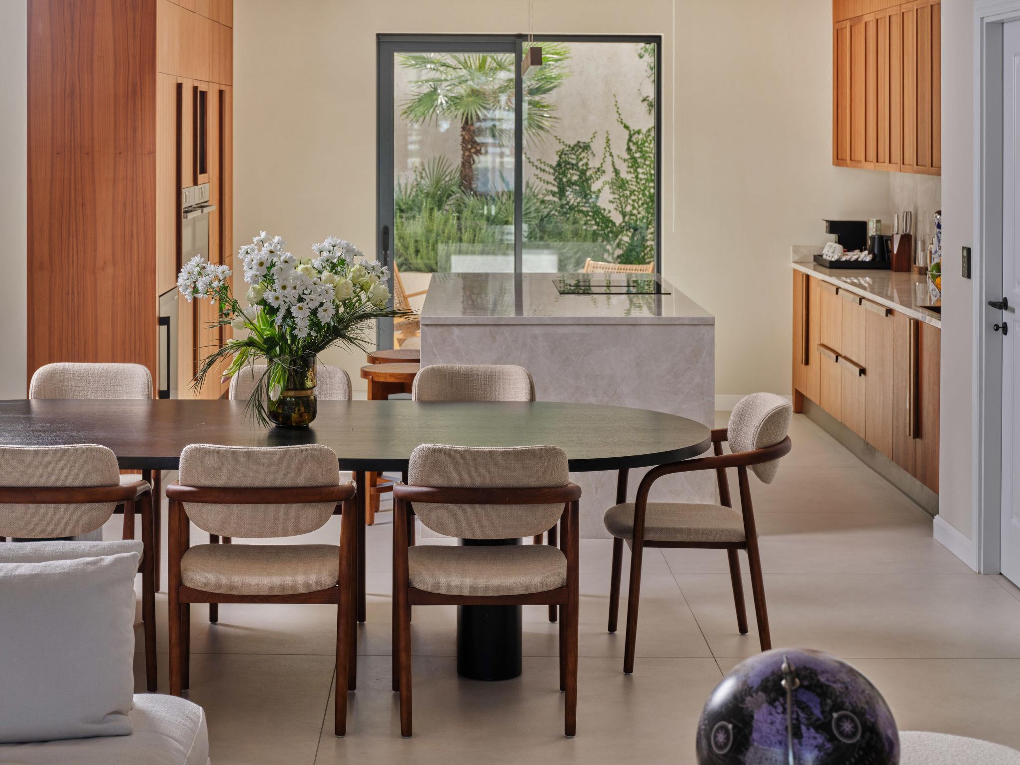 7-room villa 350 m2 on 3 levels, north facing position. Living/dining room with satellite TV (flat screen), fan. Exit to the terrace. 2 rooms, each room with 1 french bed (180 cm, length 200 cm), shower/WC and satellite TV (flat screen). Exit to the terrace. 1 room with 1 french bed (180 cm, length 200 cm), bath/shower/WC and satellite TV (flat screen). Exit to the terrace. 2 rooms, each room with 2 double sofabeds (2 x 90 cm, length 200 cm), satellite TV (flat screen). Open kitchen (oven, dishwasher, 4 induction hot plates, toaster, kettle, microwave, freezer, electric coffee machine, cooking island). Sep. WC. On the lower ground floor: playroom with shower/WC and Home cinema. Balcony 8 m2, balcony 2 m2, terrace 14 m2 partly roofed. Terrace furniture, deck chairs (4). Marvellous view of the sea. Facilities: washing machine, sauna, safe, iron, baby cot (extra), hair dryer. Internet (WiFi, free).