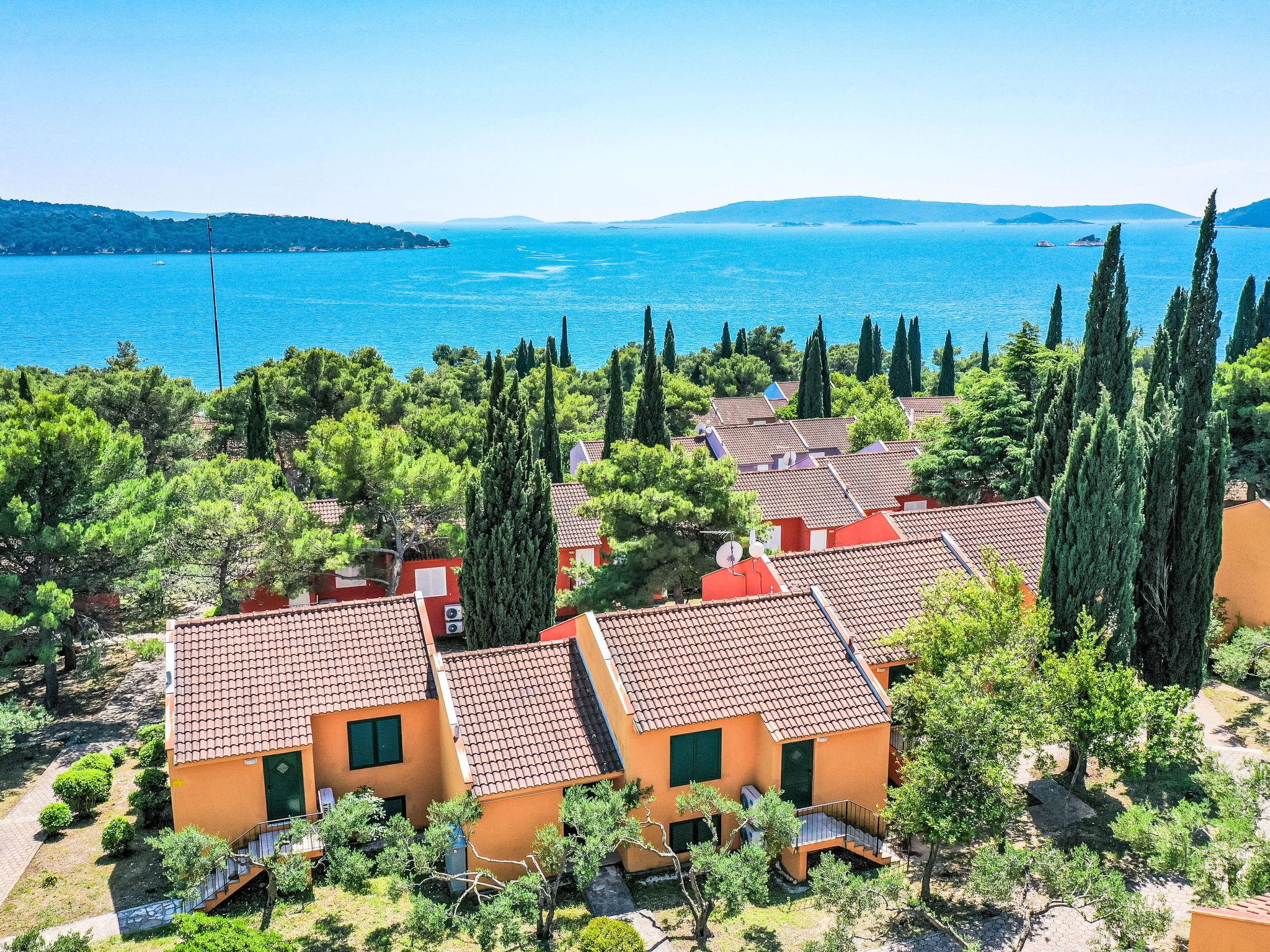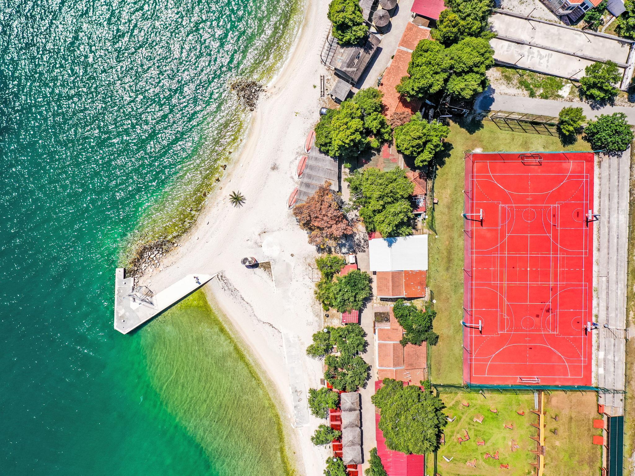 Resort "Medena". In the district of Seget Donji 3 km from the centre of Trogir, 30 km from the centre of Split, at the seaside. For shared use: property with plants and trees, 3 swimming pools (31 m2, depth 140 cm, seasonal availability: 01.Apr. - 01.Nov.) with internal staircase. Children's pool, outdoor shower, tennis (extra), basketball (extra), children's playground. In the complex: reception, restaurant, internet access, laundry. Available: bicycles (extra). Breakfast full board half board possible on request (extra). Airport transfer (extra). Parking (extra) on the premises. Bus stop 650 m. Object suitable for 4 adults + 1 child. Please note: airfield 8 km from the property. The photograph shows a typical example. 1 sofabed in living/dining area is only for 1 child up to 12 years old. For shared use mini golf and cageball court (on request, extra).
