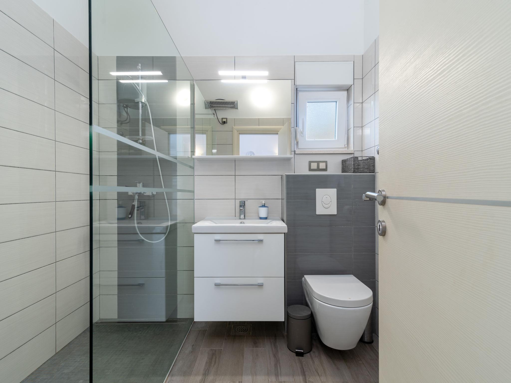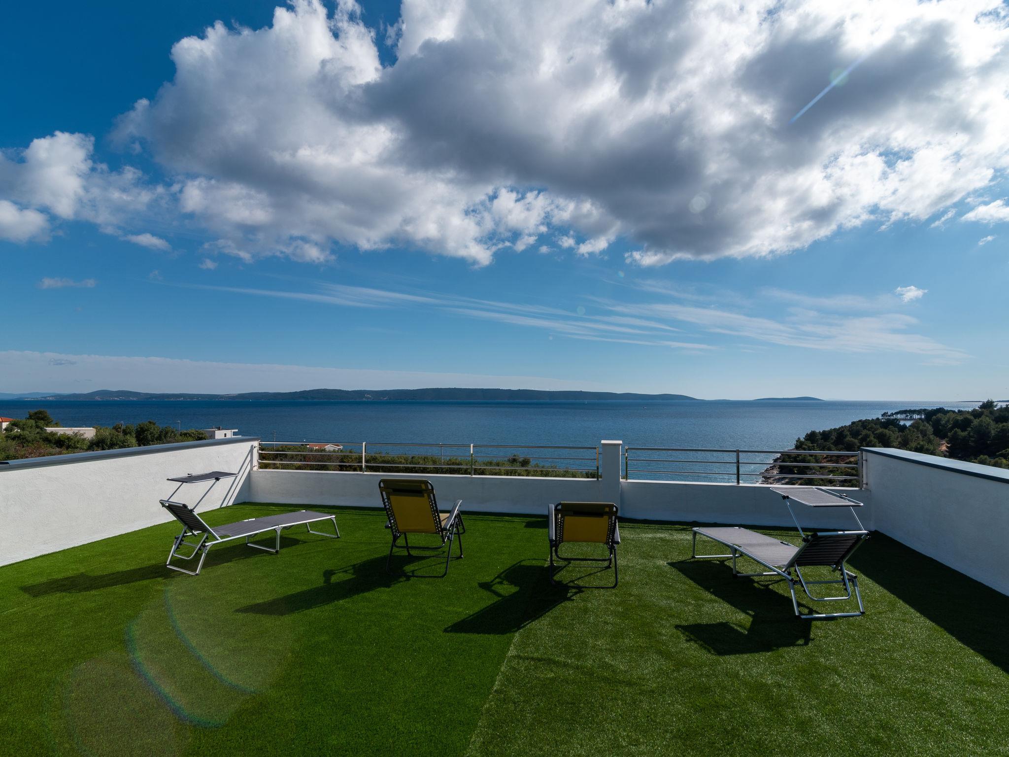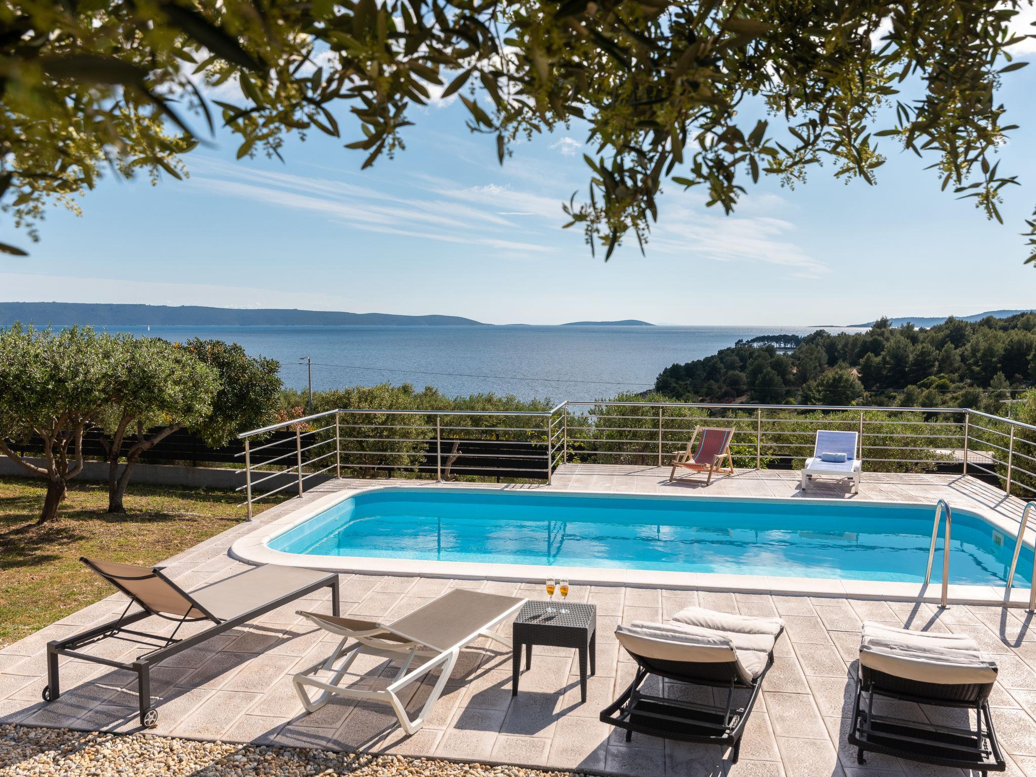 Okrug Gornji (Ciovo): House "Ria with heated pool". 1.5 km from the centre of Okrug Gornji, 5 km from the centre of Trogir, in a quiet, sunny position, 180 m from the sea, 180 m from the beach. Private: property 1'200 m2 (fenced), trees, swimming pool heated (26 m2, depth 150 cm, seasonal availability: 04.Apr. - 06.Nov.). Outdoor shower, garden furniture, barbecue. In the house: internet access, roof terrace, washing machine. Motor access to the house (50 m via unmade road). Parking (for 3 cars) at the house on the premises. Shop 500 m, supermarket 1.5 km, restaurant 1.5 km, bus stop 500 m, pebble beach 180 m. Please note: airfield 10 km from the property. The unit consists of a big house (100 m2) and a smaller house (46 m2), rented as one unit.