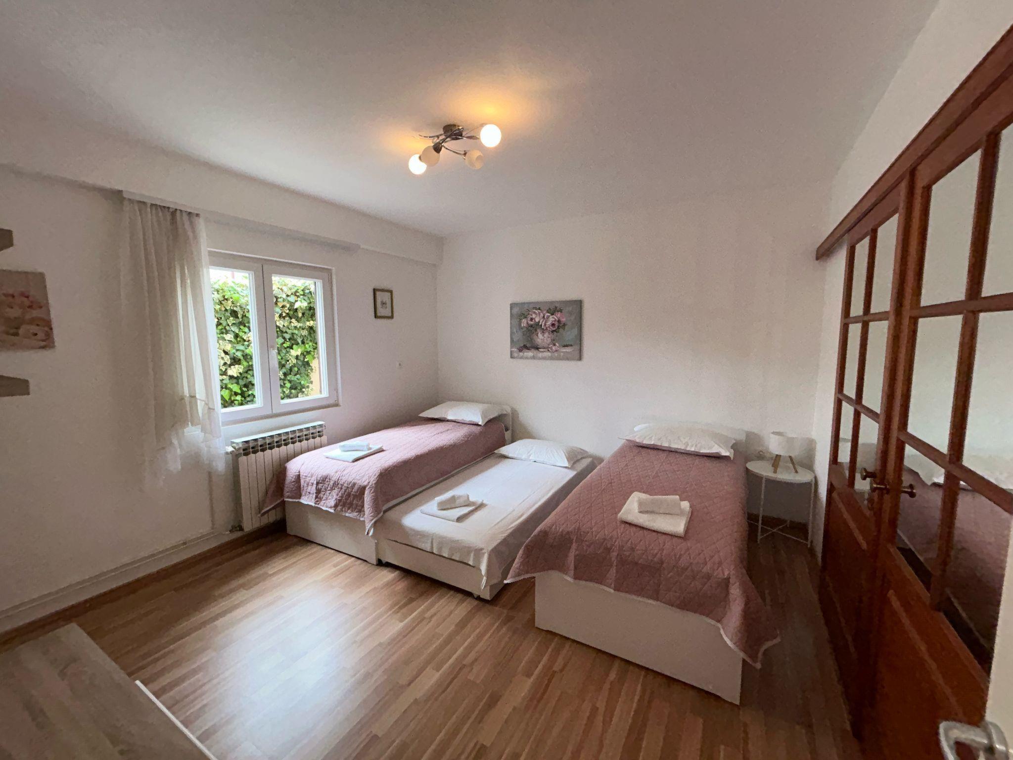 Apartment Carpe Diem has an area of 85 m2 (located on the ground floor) and consists of a kitchen and a large living room with a sofa bed for two people, two spacious bedrooms with double beds, bathroom with shower. Washing machine on request (no charge). Air conditioning for cooling and heating. There are four parking places without charge. Outside terrace has an area of 50 m2 with stone table and benches, including a small cottage with a fireplace. Garden suitable for children.