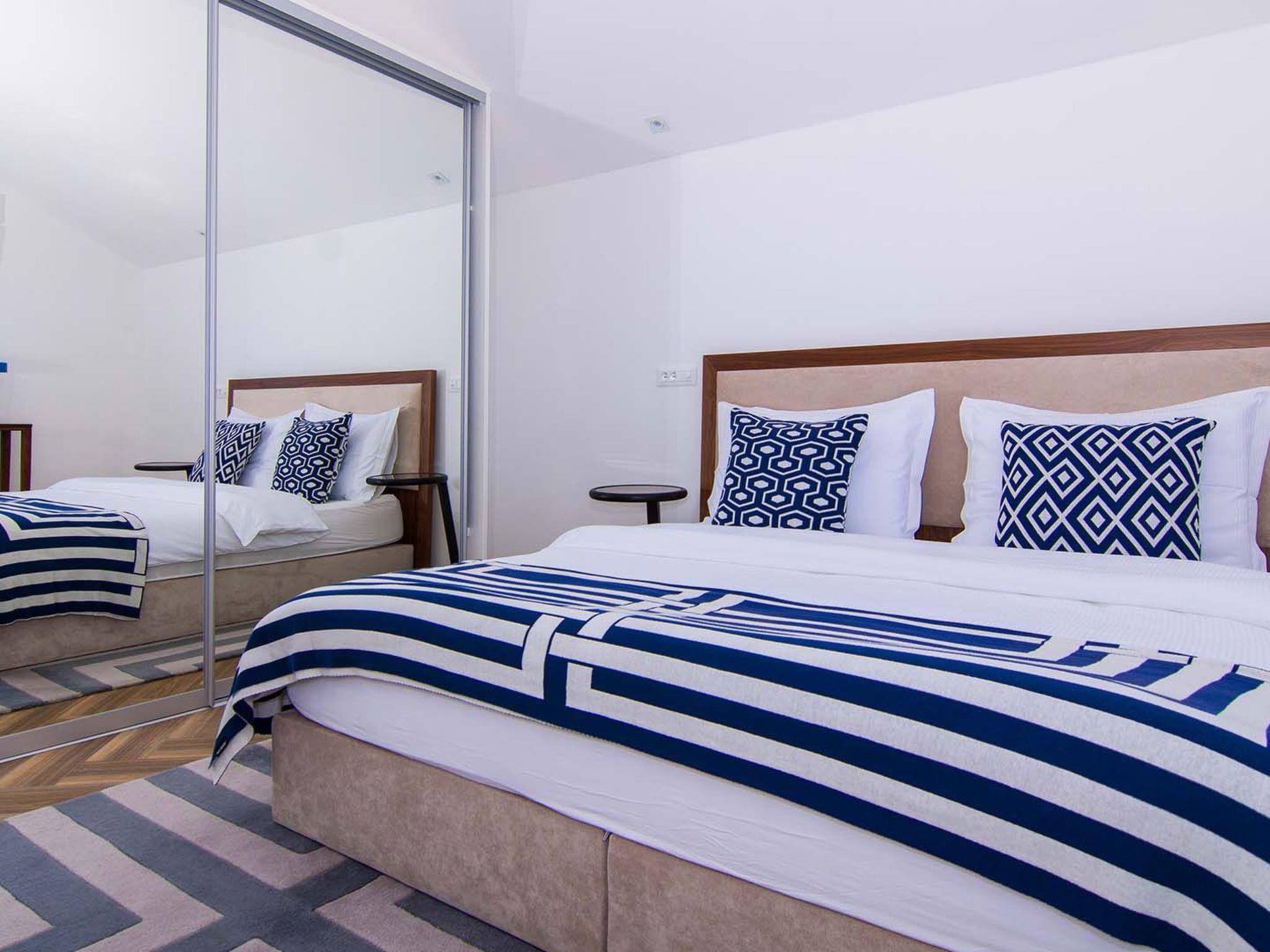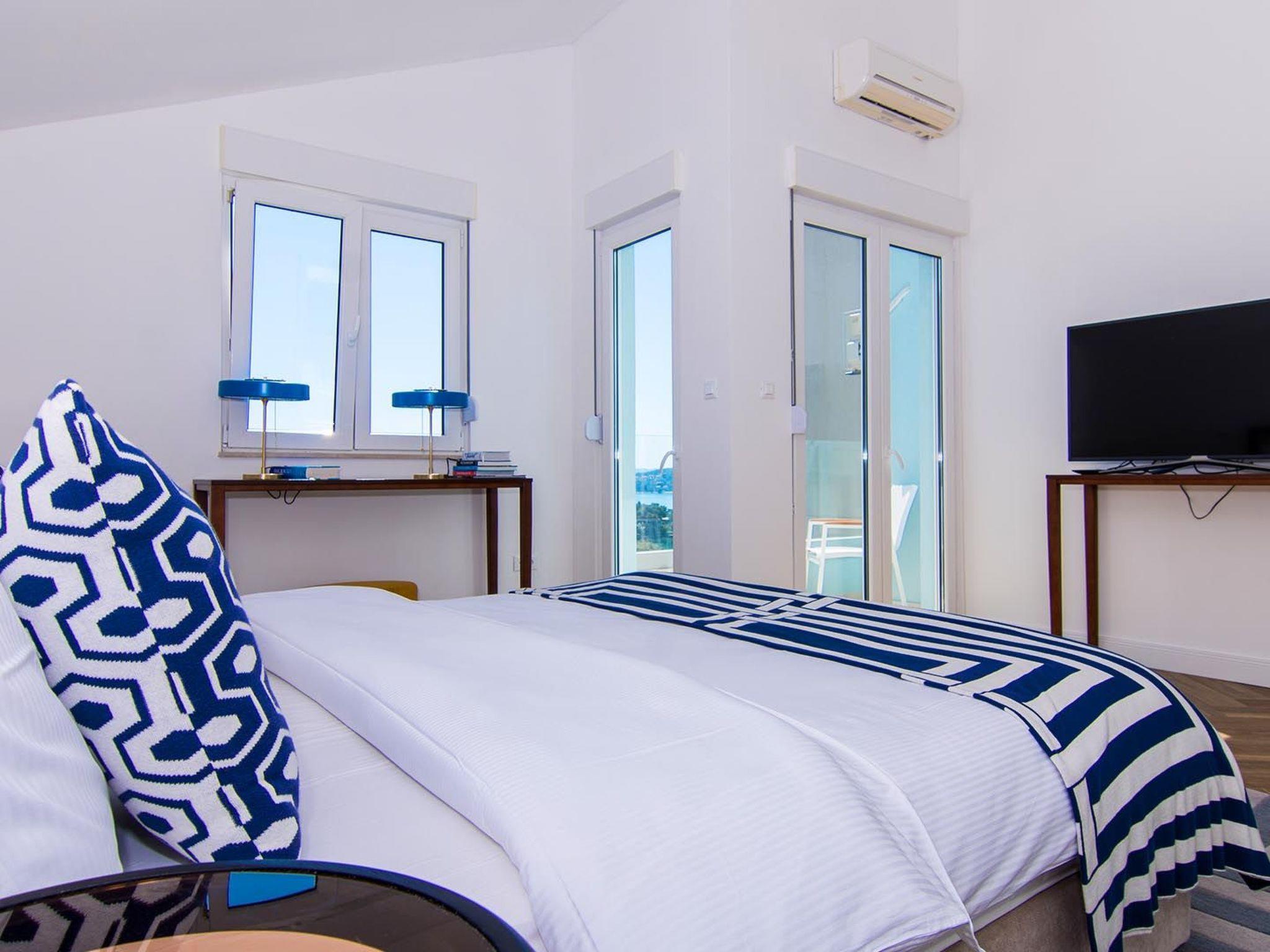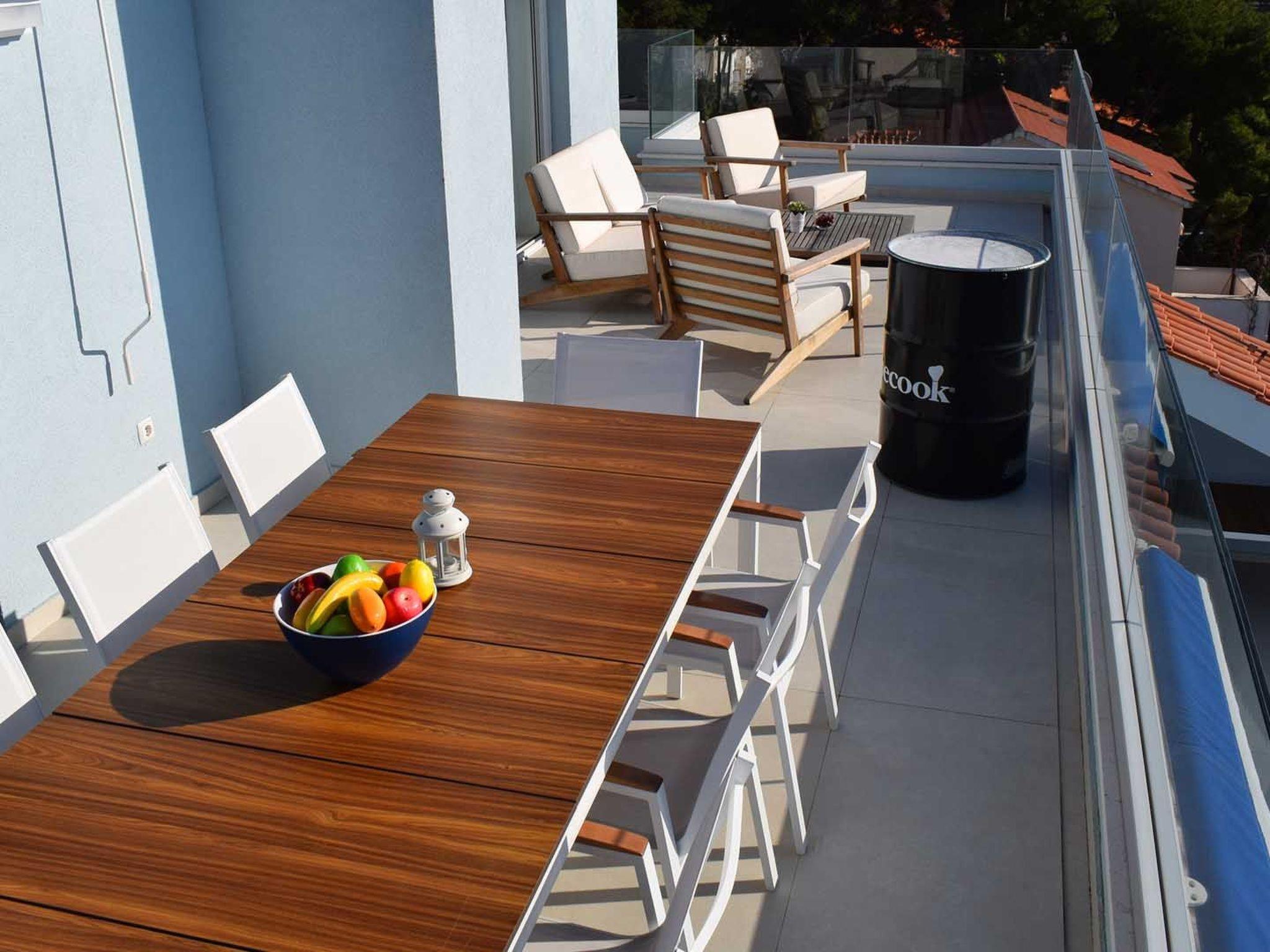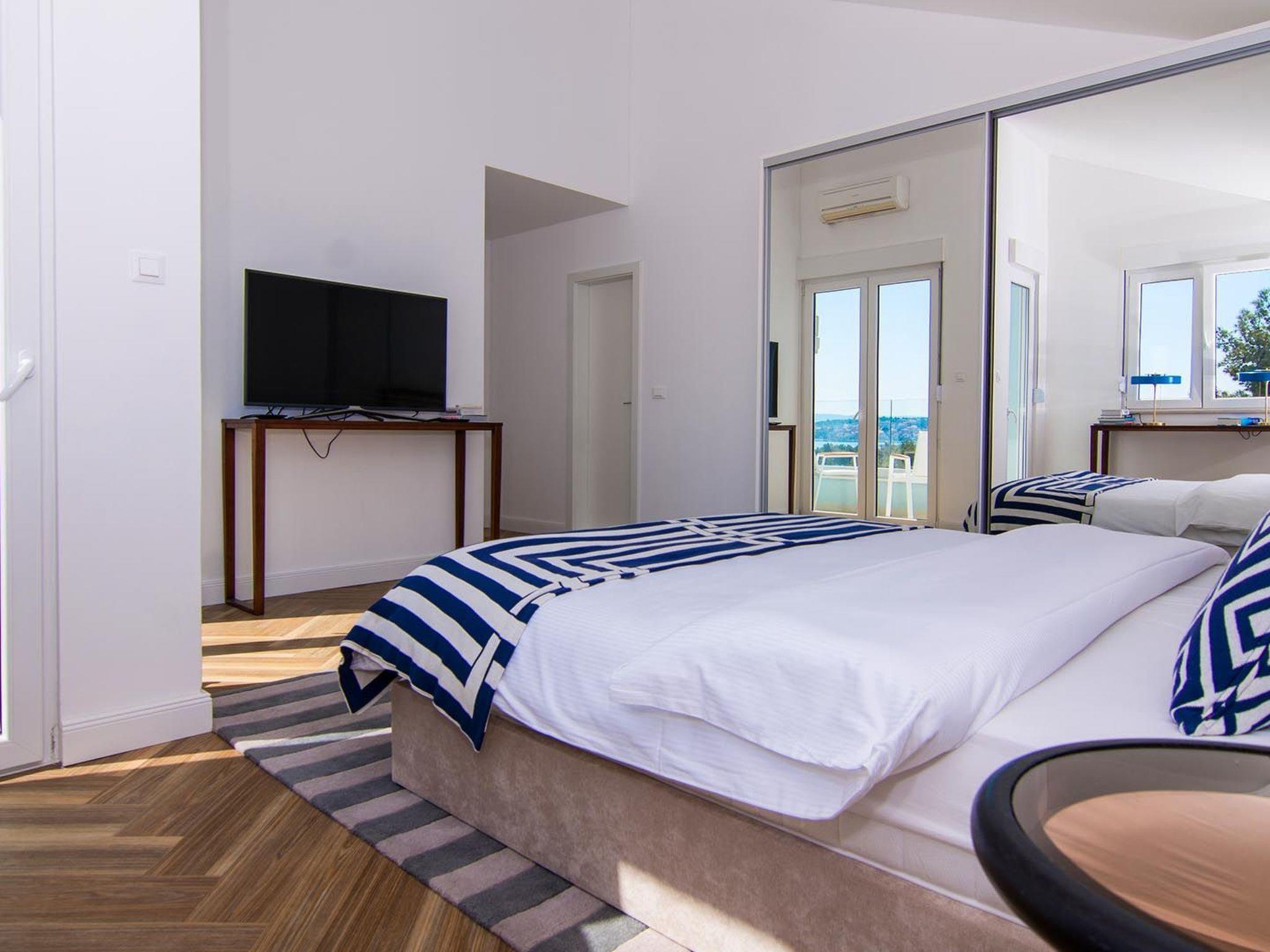 Apartment White Sky is a duplex apartment. The apartment consists of 5 double bedrooms with adjoining bathrooms, 1 half-bath, comfortable and elegantly furnished living room with dining area and completely equipped open concept kitchen. Living room has access to a spacious balcony with breathtaking sea view stretching over the surrounding coast. Stylish interior gives the entire apartment a distinctive character and charm. The apartment covers the area of 200 m2 with addition of 60 m2 of balcony. Apartment White Sky can accommodate up to 11 persons. Penthouse apartment White Sky is fully air conditioned and equipped with Wi-fi, SAT-TV, iron and ironing board, baby cot, high chair, stove, oven, hood, large refrigerator with freezer, dish washer, microwave (available on request), electric kettle, coffee maker, washing machine and hair dryer. Property offers free parking. Enjoy your stay in luxurious seaview apartment White Sky and spend an unforgettable holiday on island Ciovo!