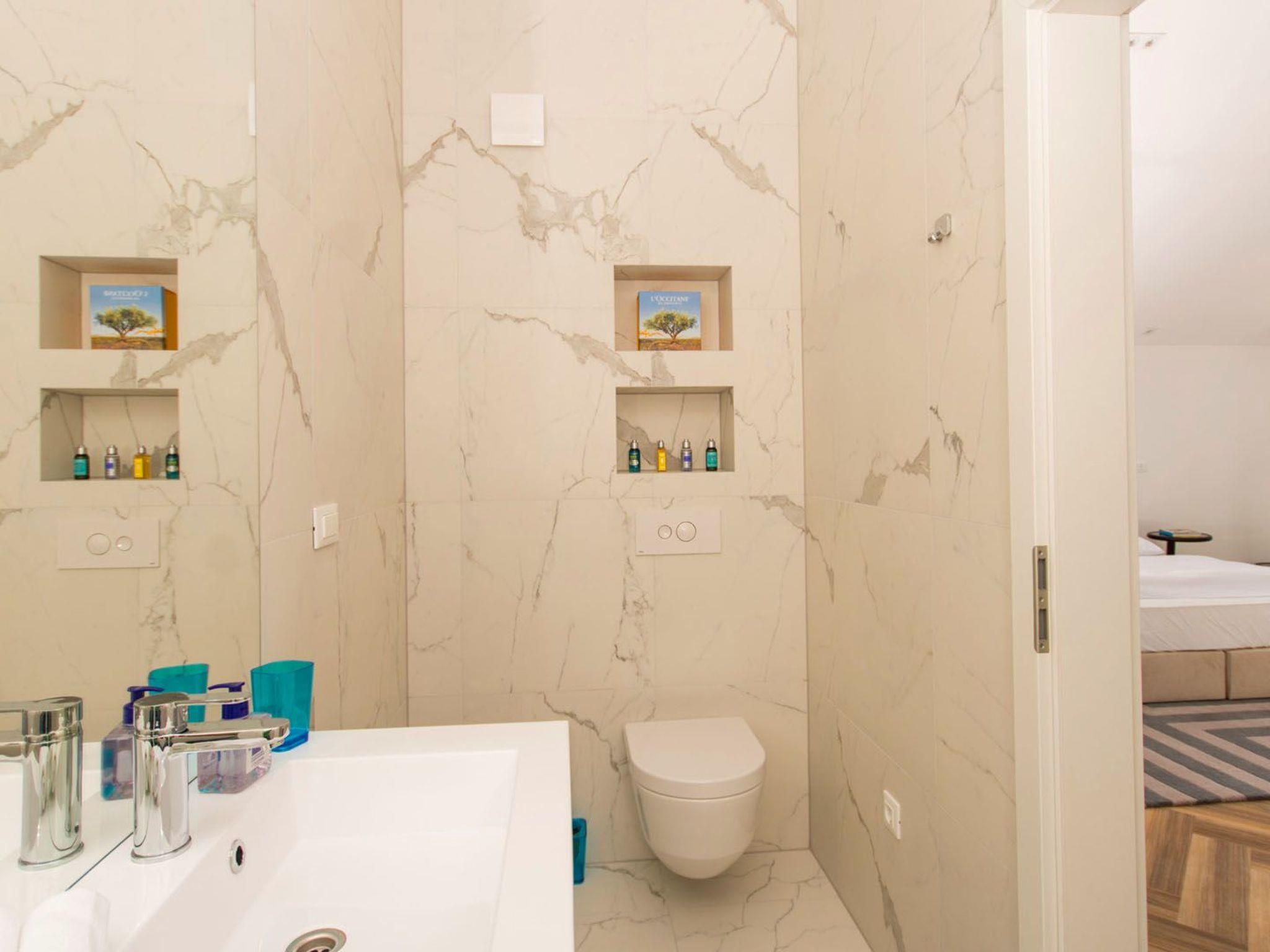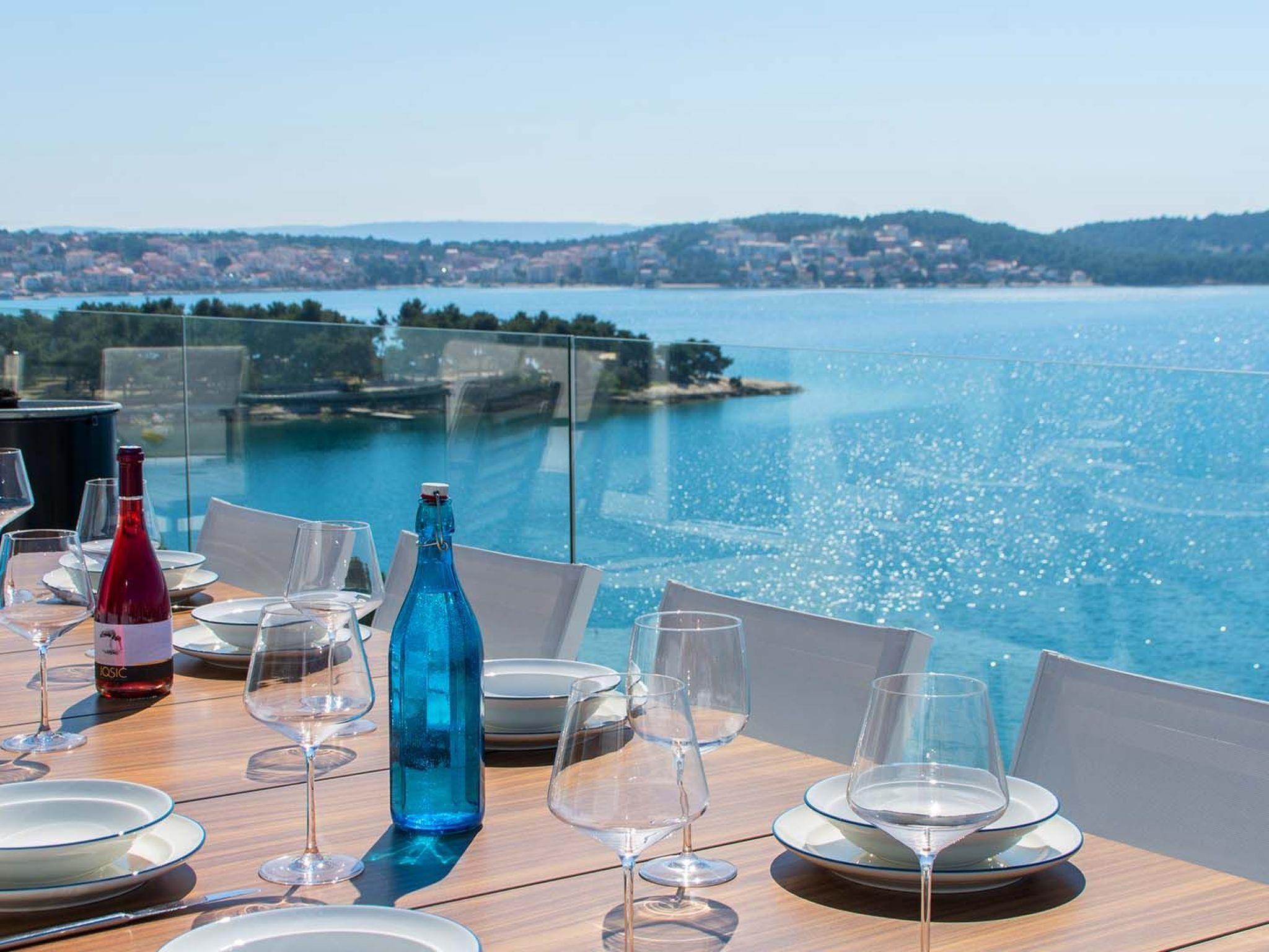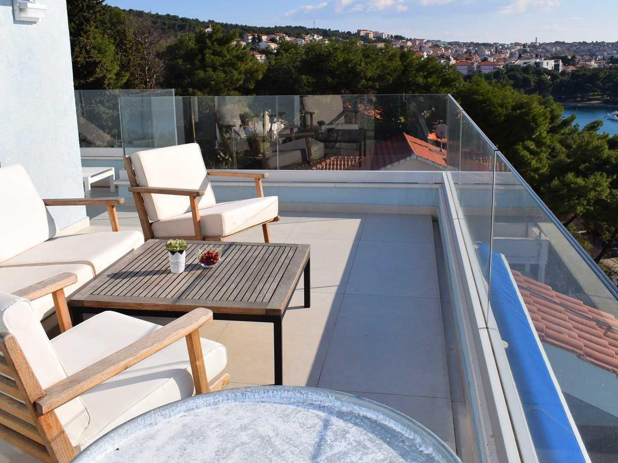Apartment White Sky is a duplex apartment. The apartment consists of 5 double bedrooms with adjoining bathrooms, 1 half-bath, comfortable and elegantly furnished living room with dining area and completely equipped open concept kitchen. Living room has access to a spacious balcony with breathtaking sea view stretching over the surrounding coast. Stylish interior gives the entire apartment a distinctive character and charm. The apartment covers the area of 200 m2 with addition of 60 m2 of balcony. Apartment White Sky can accommodate up to 11 persons. Penthouse apartment White Sky is fully air conditioned and equipped with Wi-fi, SAT-TV, iron and ironing board, baby cot, high chair, stove, oven, hood, large refrigerator with freezer, dish washer, microwave (available on request), electric kettle, coffee maker, washing machine and hair dryer. Property offers free parking. Enjoy your stay in luxurious seaview apartment White Sky and spend an unforgettable holiday on island Ciovo!