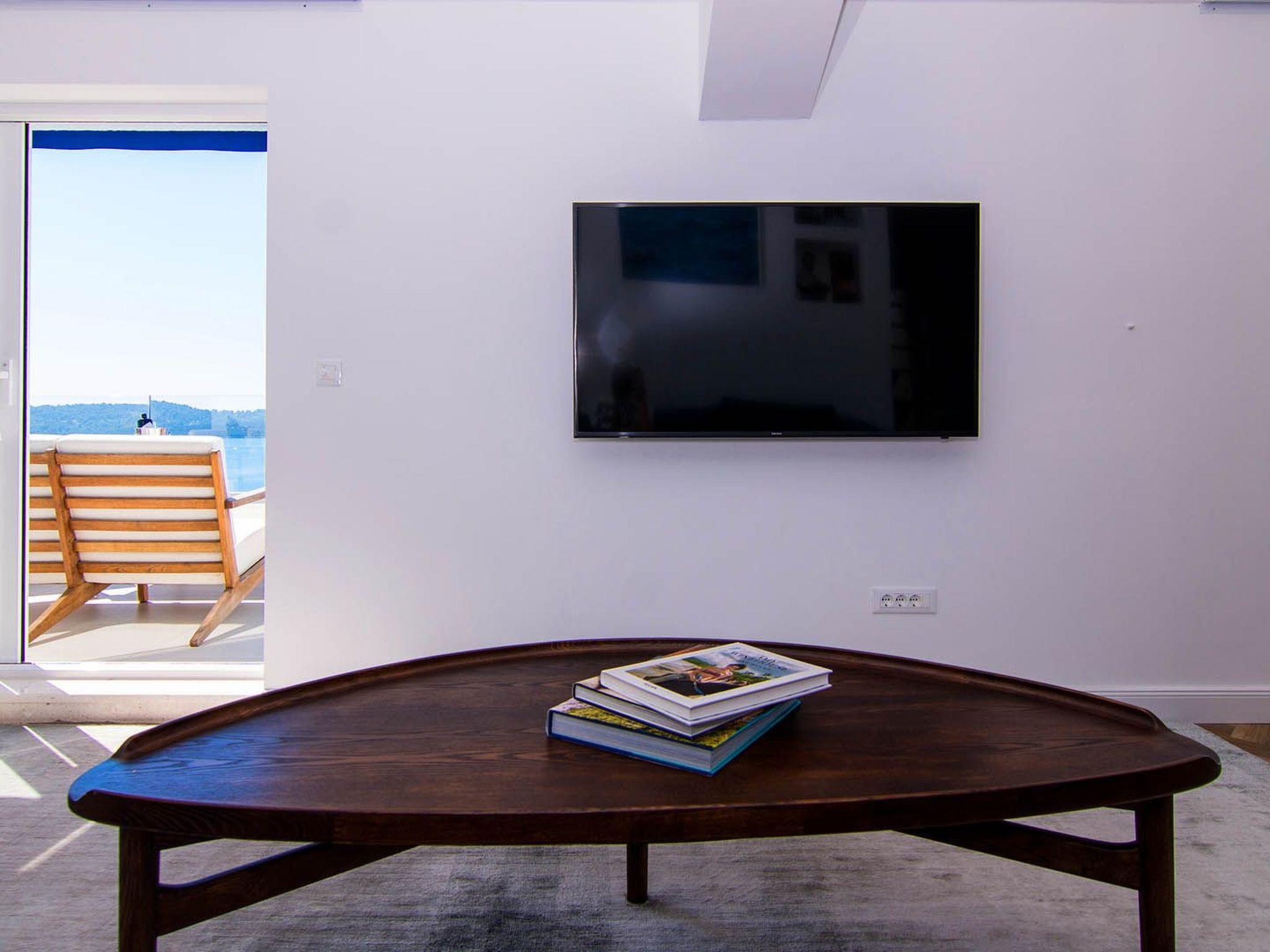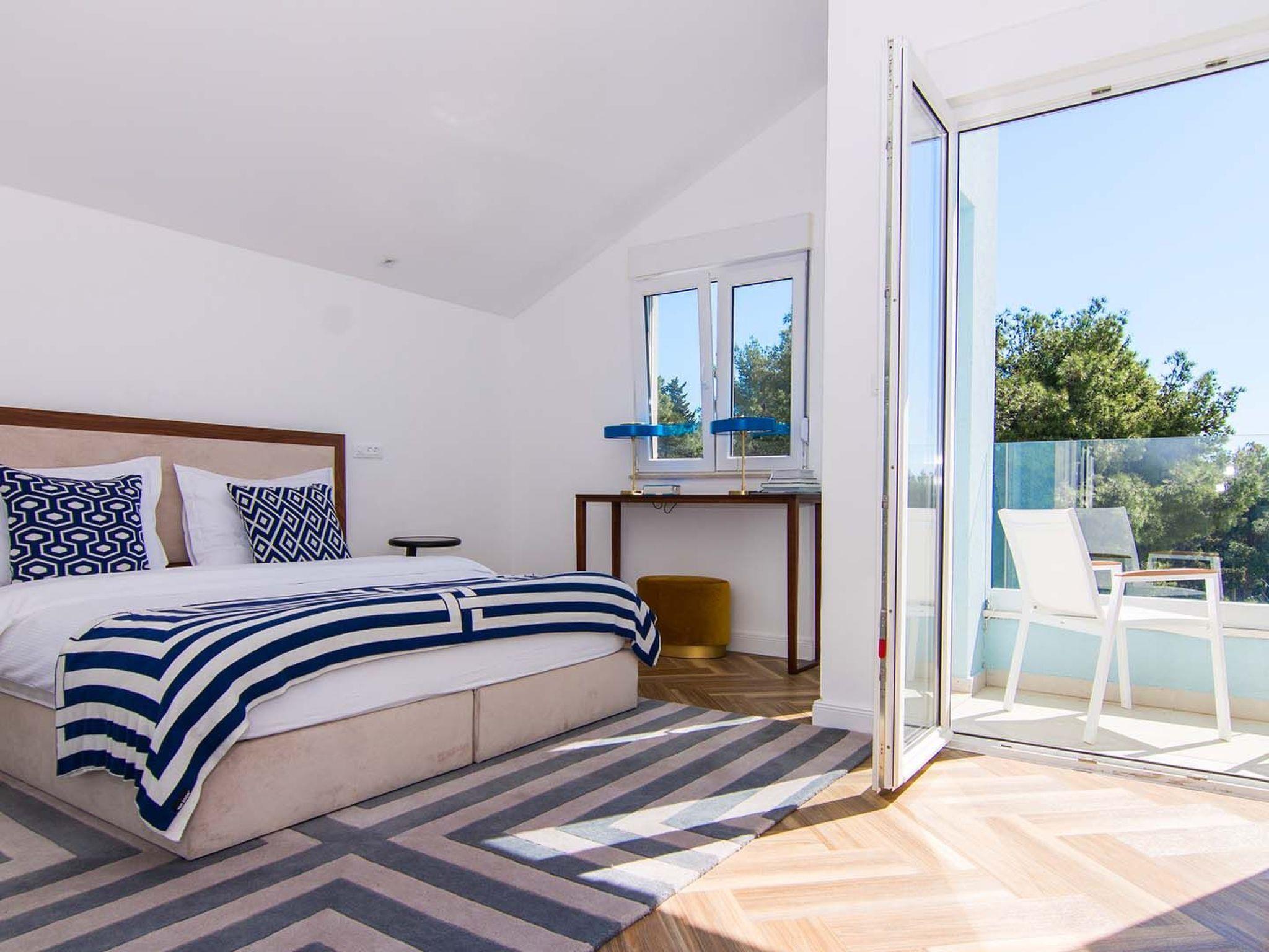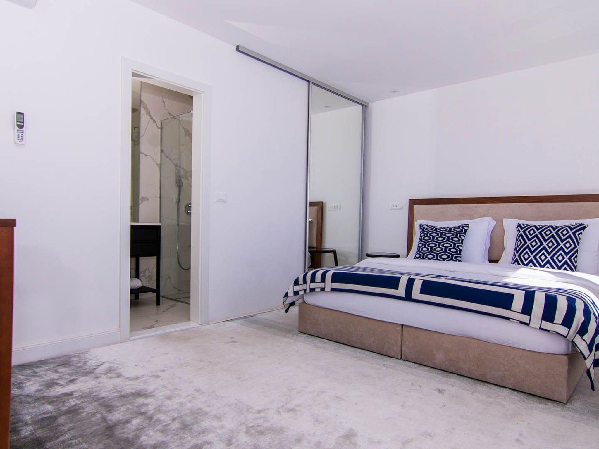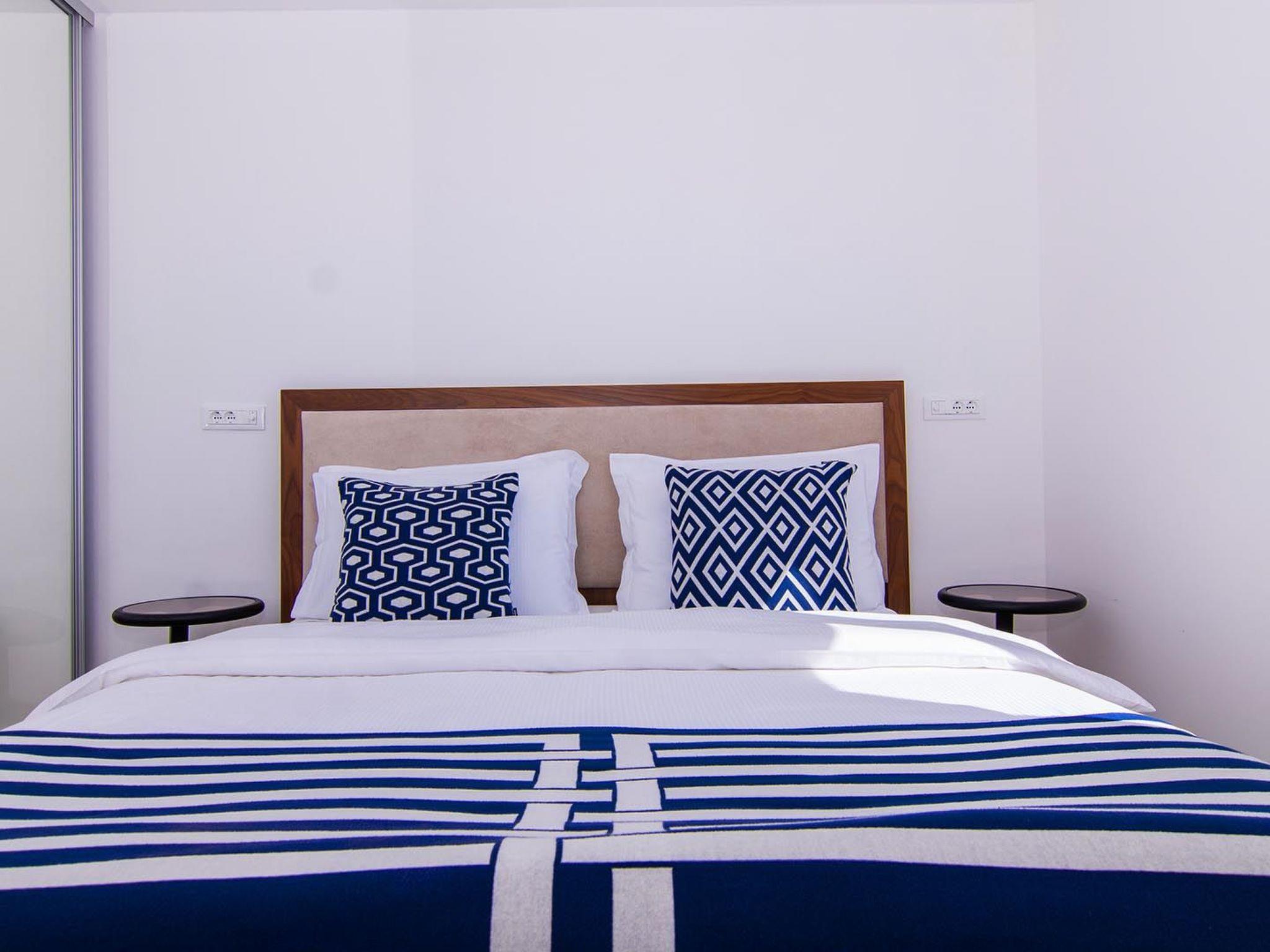 Apartment White Sky is a duplex apartment. The apartment consists of 5 double bedrooms with adjoining bathrooms, 1 half-bath, comfortable and elegantly furnished living room with dining area and completely equipped open concept kitchen. Living room has access to a spacious balcony with breathtaking sea view stretching over the surrounding coast. Stylish interior gives the entire apartment a distinctive character and charm. The apartment covers the area of 200 m2 with addition of 60 m2 of balcony. Apartment White Sky can accommodate up to 11 persons. Penthouse apartment White Sky is fully air conditioned and equipped with Wi-fi, SAT-TV, iron and ironing board, baby cot, high chair, stove, oven, hood, large refrigerator with freezer, dish washer, microwave (available on request), electric kettle, coffee maker, washing machine and hair dryer. Property offers free parking. Enjoy your stay in luxurious seaview apartment White Sky and spend an unforgettable holiday on island Ciovo!