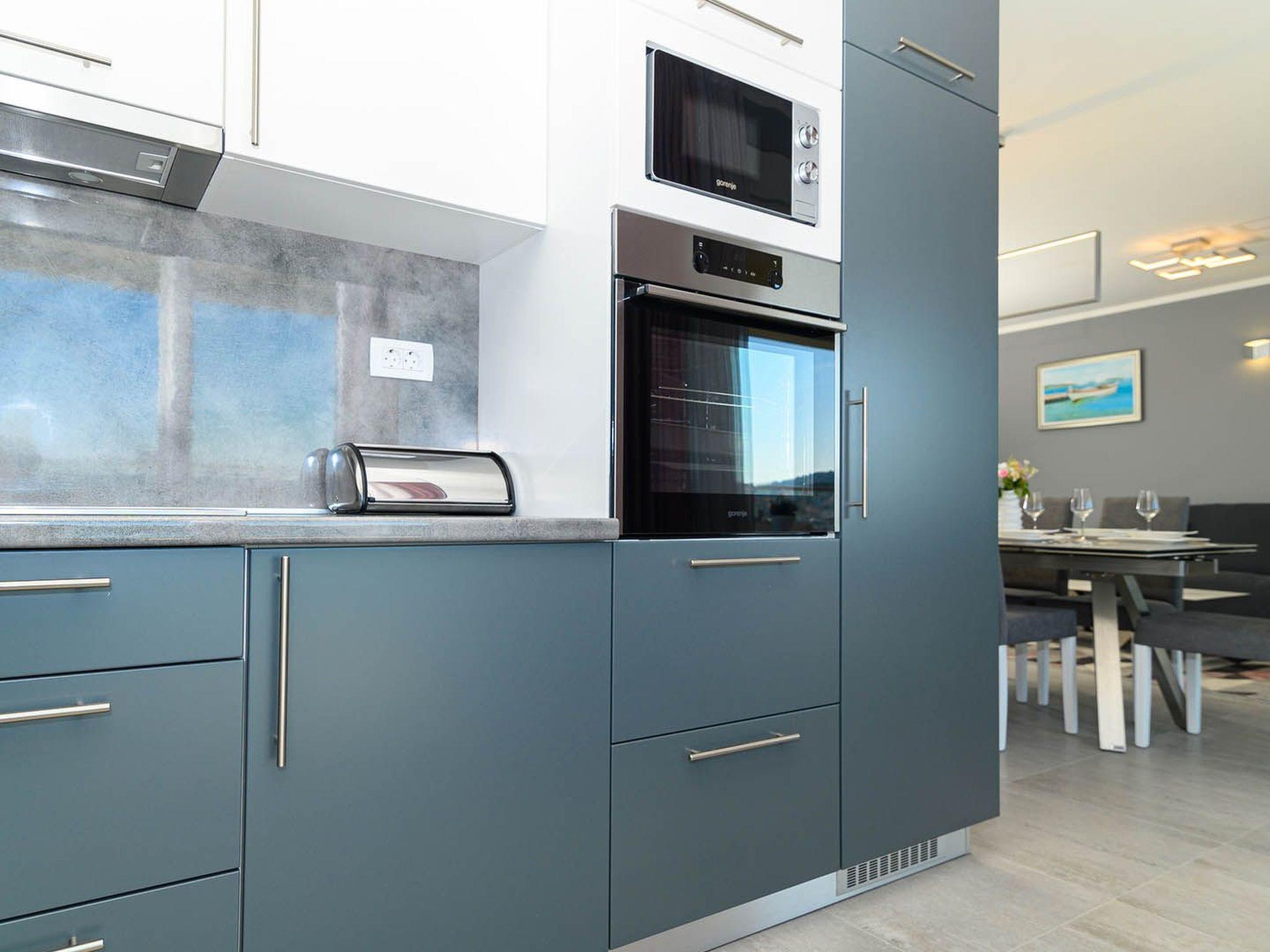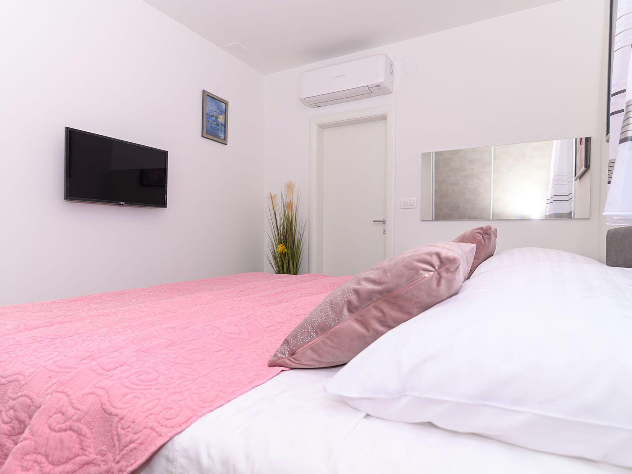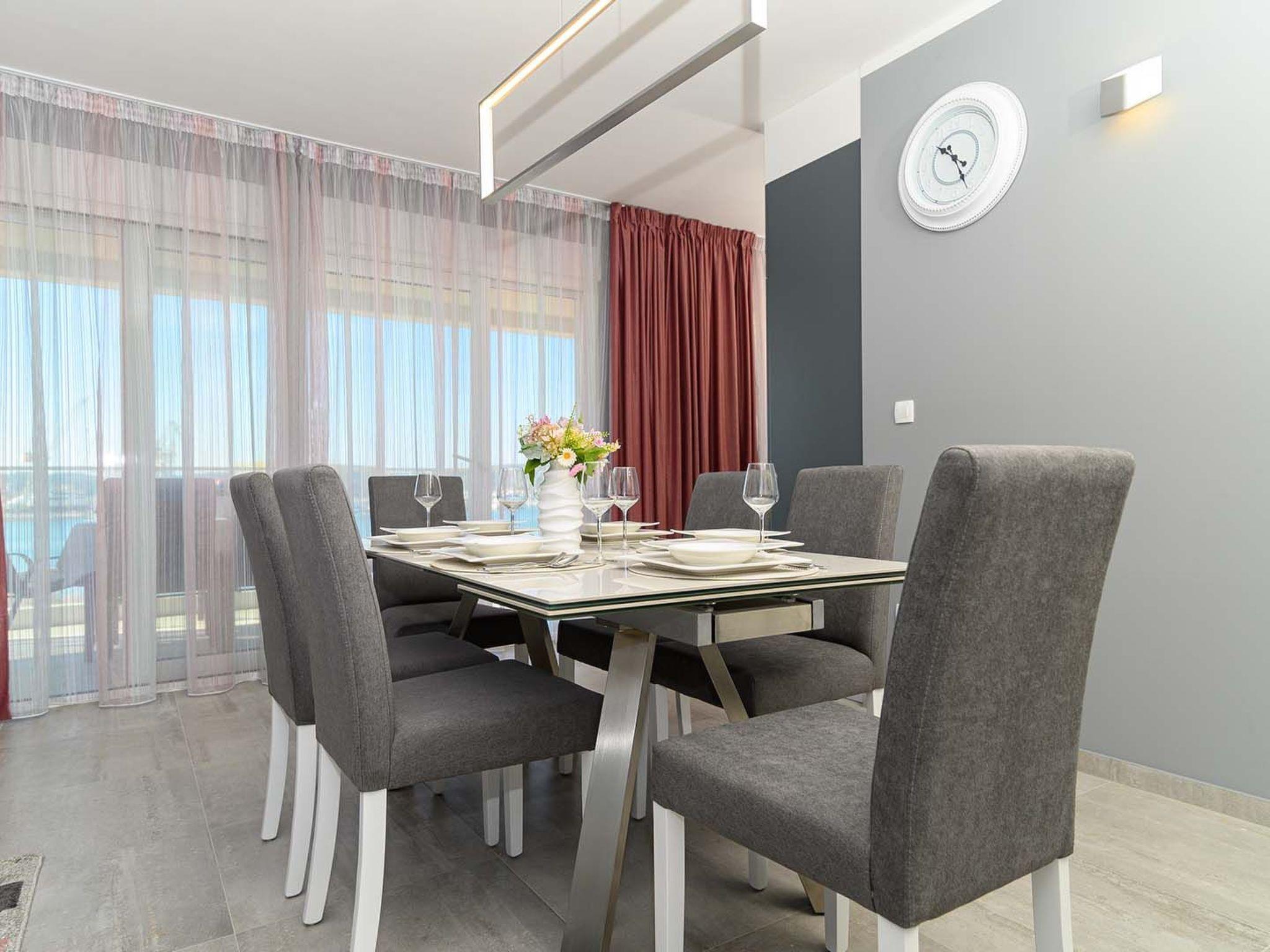 This stylish and airy apartment is located on the third floor of an apartment building and can be accessed by stairs or elevator. The apartment consists of 2 elegantly furnished bedrooms equipped with air condition, SAT-TV and double beds (one bed can be separated into 2 single beds), 2 bathrooms with shower, fully equipped kitchen, living room with dining area and a covered seaview balcony which can be accessed through a large sliding glass door. Apartment Style is a suitable accommodation for up to 4 persons.Breathtaking view from the balcony spreading over the nearby island of Ciovo and the marina is what gives this apartment a special charm and the feeling of being a true oasis of peace and relaxation.Apartment Style is fully air conditioned and equipped with SAT-TV, wi-fi internet, iron and ironing board, baby cot, high chair, safe, mosquito nets, electric stove, oven, hood, refrigerator with freezer, dishwasher, microwave, electric kettle, coffee maker (filter), toaster, barbecue equipment, outdoor barbecue, washing machine, dryer and hair dryer. The property offers parking, 1 outdoor and 1 in the garage, free of charge.