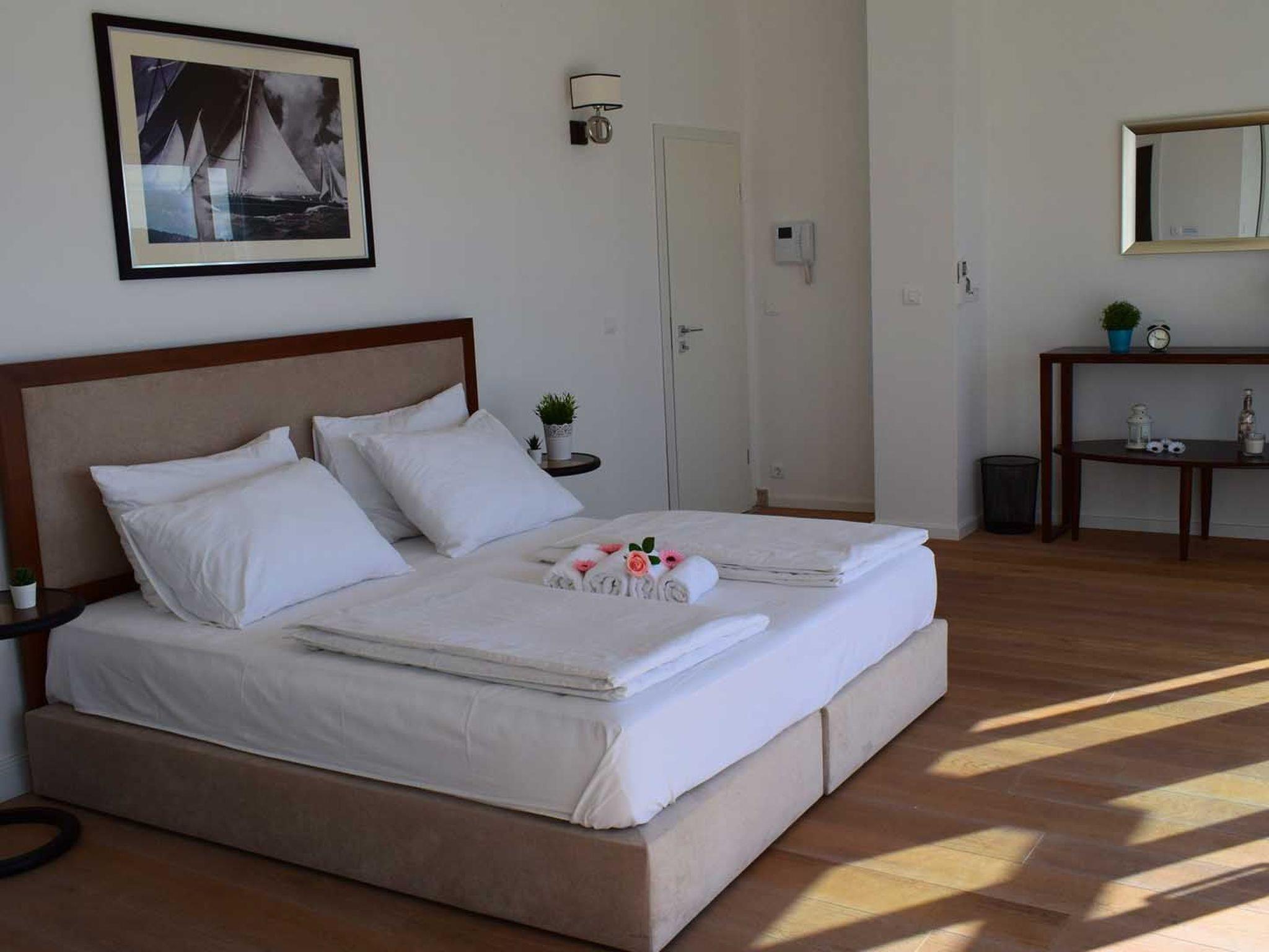 The first, second and third floor are designed as resting areas with bedrooms and adjoining bathrooms, connected with indoor staircase. The first and second floor consist of 2 luxurious bedrooms with large double beds, French balconies overlooking the sea and en suite bathrooms with showers.