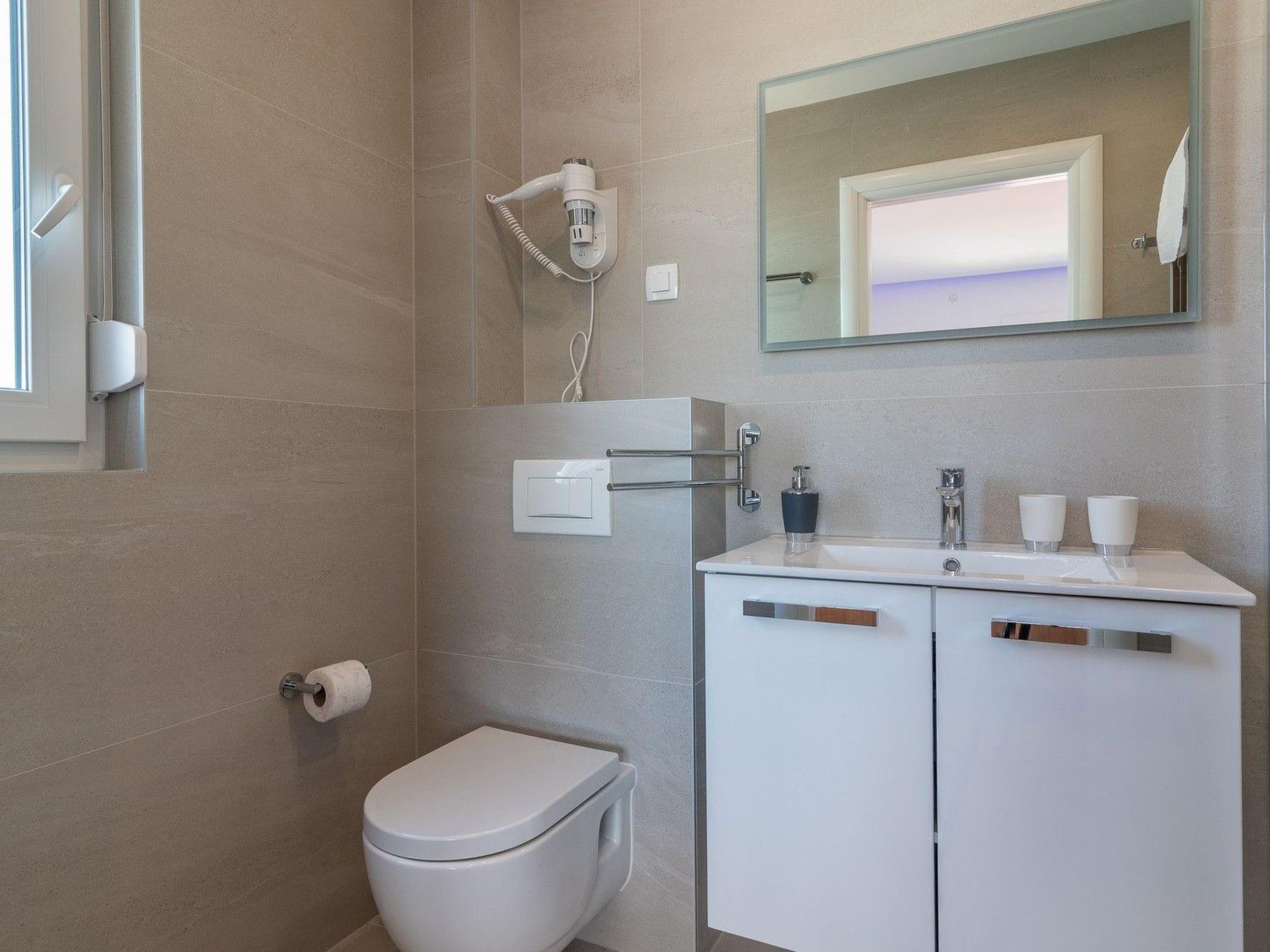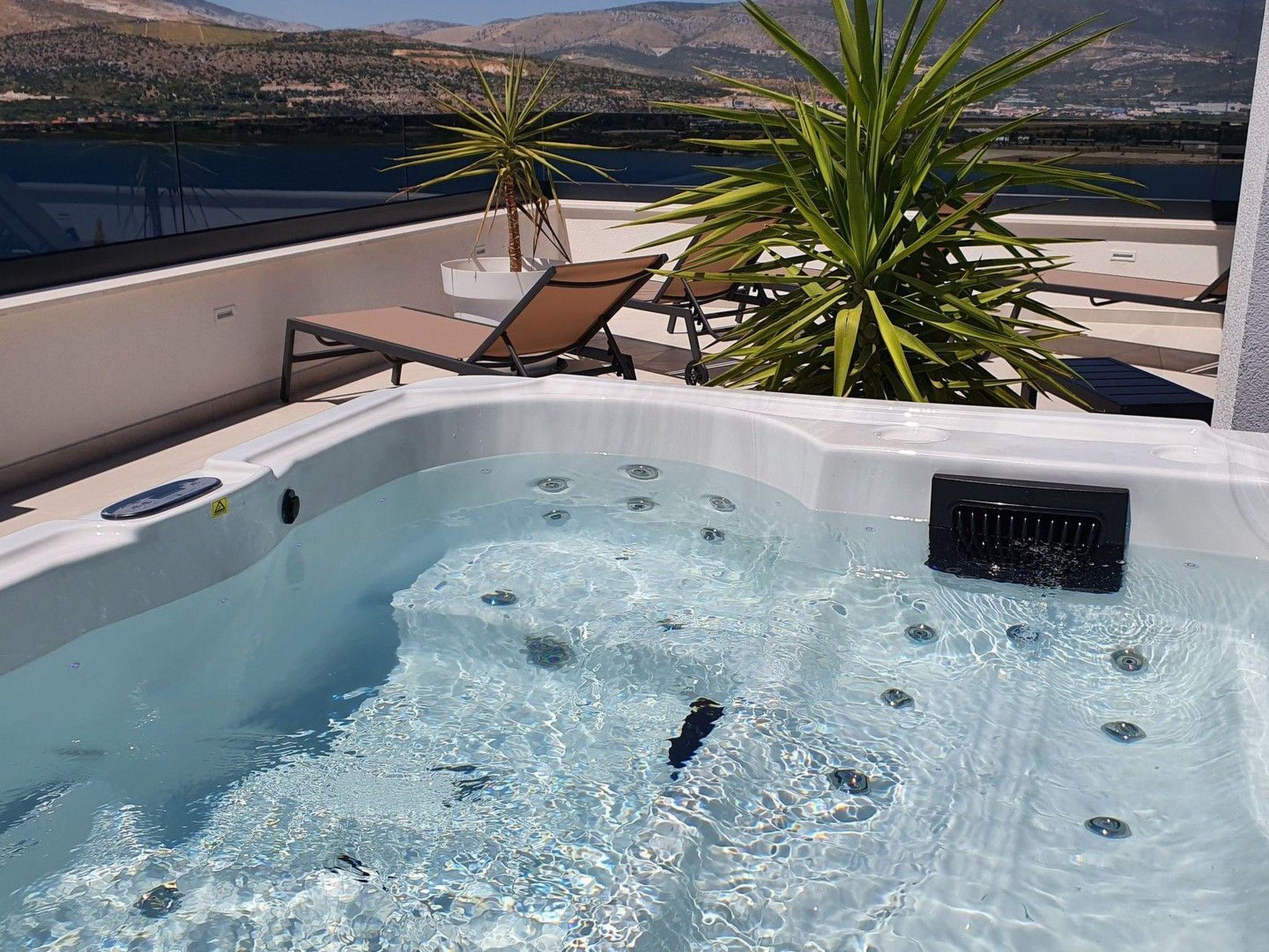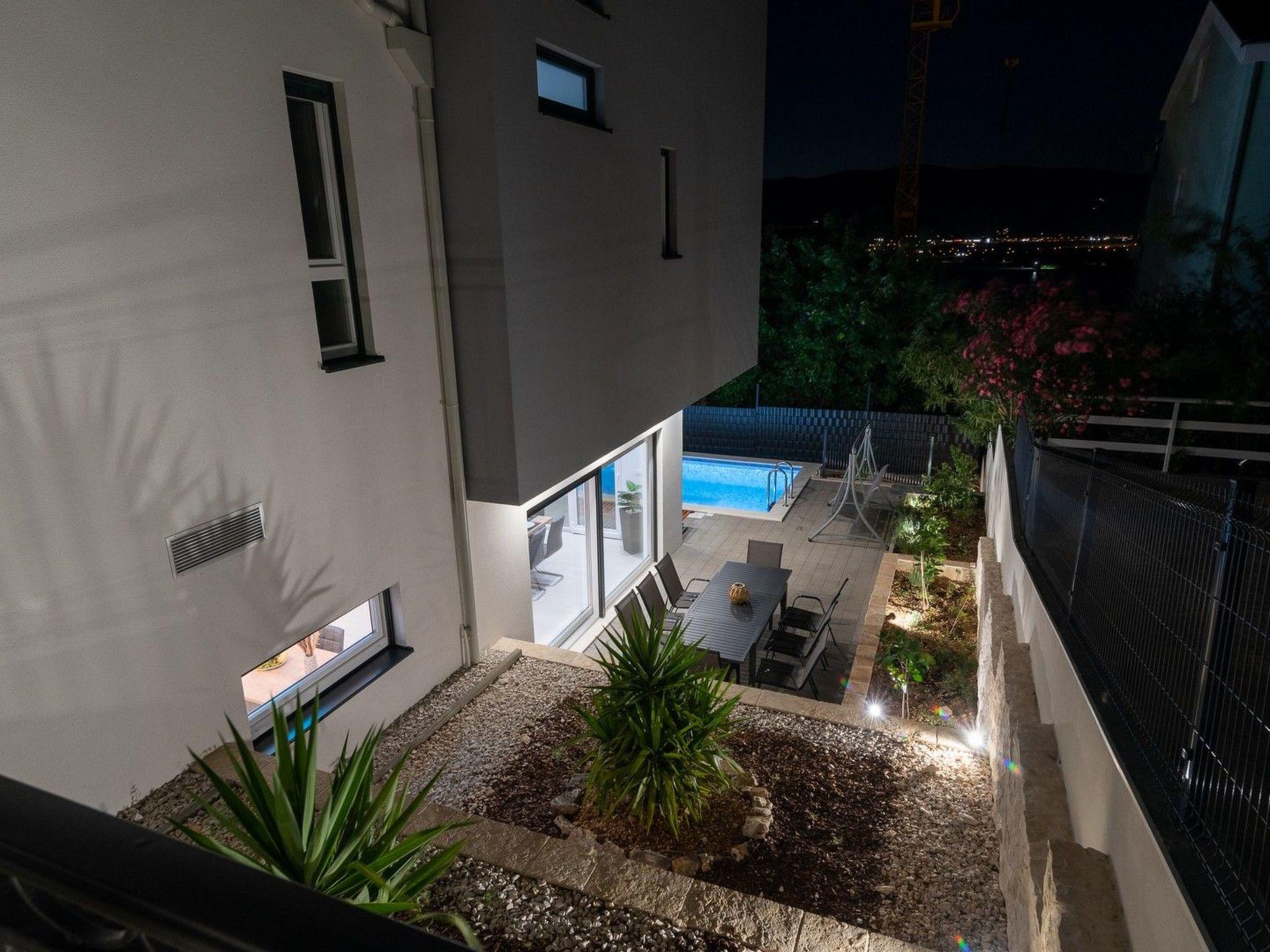 Luxury villa Fantasy covers 380 m2 of living area divided on ground, first and second floor levels. Luxurious interior rich with natural light creates an ambience of a modern and comfortable holiday villa where every guest can feel at home. Villa Fantasy has 4 bedrooms, 5 bathrooms, 1 half-bath and can comfortably accommodate up to 8 persons. There is a possibility of accommodating 2 additional persons on a sofa bed only if one or both additional persons are children.The ground floor is designed as a lounge area with a spacious open concept living room, fully equipped kitchen with dining area, 1 bathroom with shower, 1 half-bath as well as a recreation room equipped with a multifunctional workout station and table football/pool table. Living room has access to the outdoor area with pool through a sliding glass door.Contemporary staircase leads to the first floor level, designed as a resting area which consists of 3 air conditioned bedrooms with double beds (180 x 200 cm) and SAT-TV, each with its own en suite bathroom with shower. Two bedrooms have seaview, while in other two bedrooms the bed can be separated into 2 single beds if necessary.Master bedroom is located on the second floor level and equipped with a king-size double bed (180 x 200 cm), air condition, SAT-TV and en suite bathroom with shower. Master bedroom has access to a spacious balcony with a breathtaking seaview, where guests can relax in an outdoor jacuzzi, soak in the sunshine on the sun loungers or sip a glass of wine over a sunset on the outdoor lounge area.