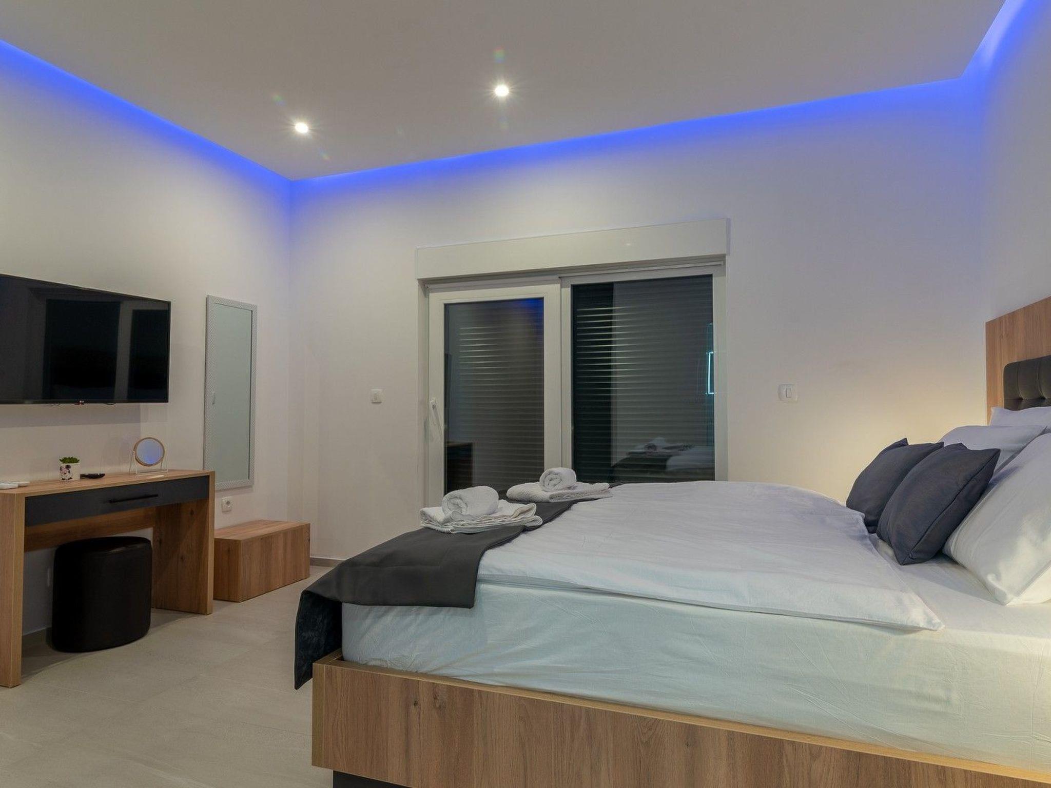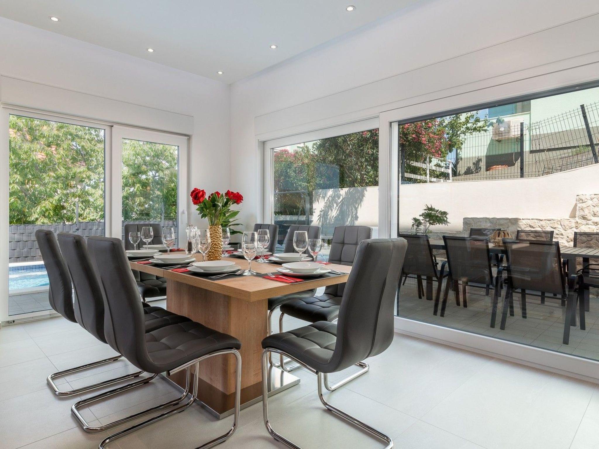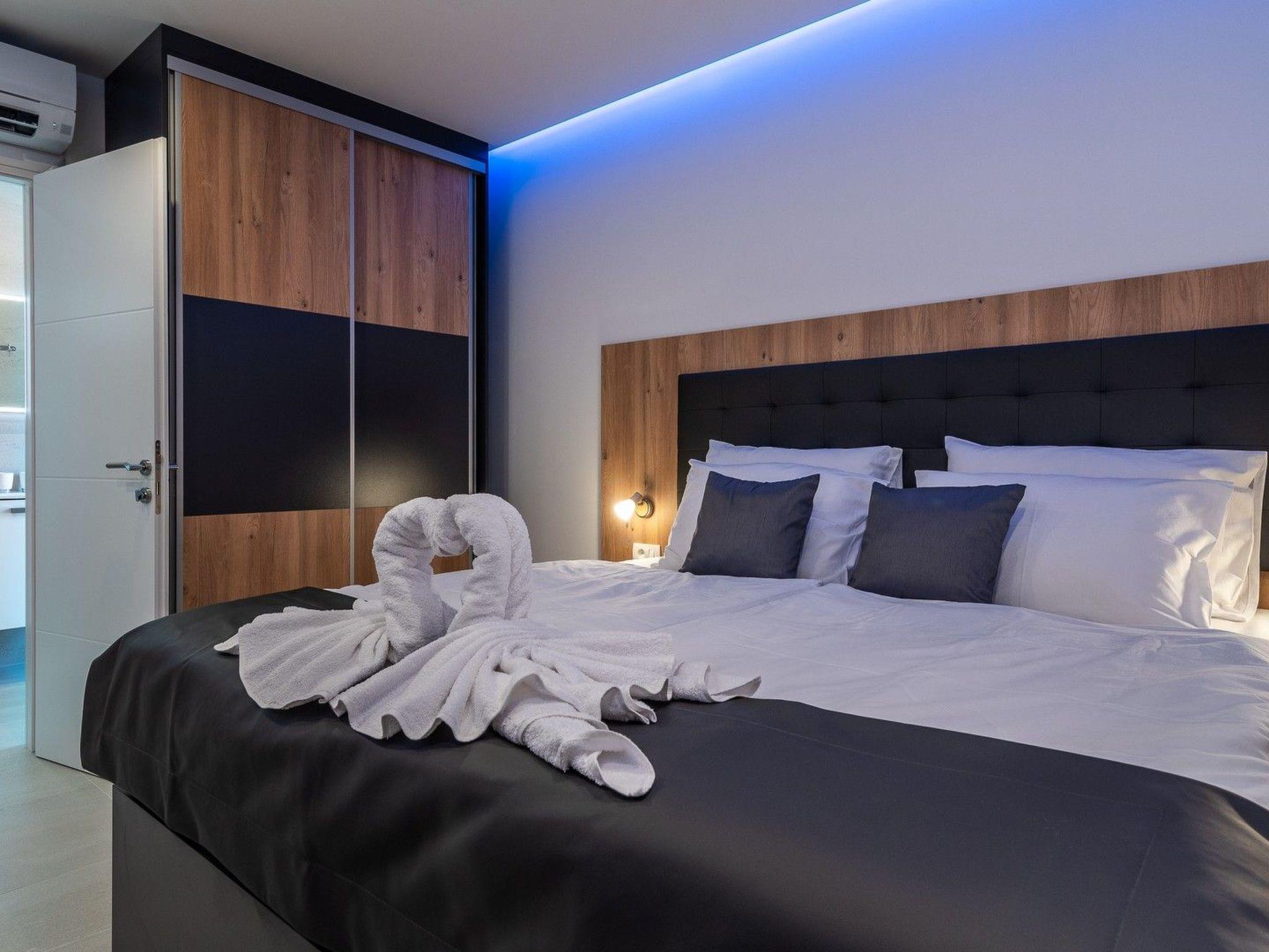 Luxury villa Fantasy covers 380 m2 of living area divided on ground, first and second floor levels. Luxurious interior rich with natural light creates an ambience of a modern and comfortable holiday villa where every guest can feel at home. Villa Fantasy has 4 bedrooms, 5 bathrooms, 1 half-bath and can comfortably accommodate up to 8 persons. There is a possibility of accommodating 2 additional persons on a sofa bed only if one or both additional persons are children.The ground floor is designed as a lounge area with a spacious open concept living room, fully equipped kitchen with dining area, 1 bathroom with shower, 1 half-bath as well as a recreation room equipped with a multifunctional workout station and table football/pool table. Living room has access to the outdoor area with pool through a sliding glass door.Contemporary staircase leads to the first floor level, designed as a resting area which consists of 3 air conditioned bedrooms with double beds (180 x 200 cm) and SAT-TV, each with its own en suite bathroom with shower. Two bedrooms have seaview, while in other two bedrooms the bed can be separated into 2 single beds if necessary.Master bedroom is located on the second floor level and equipped with a king-size double bed (180 x 200 cm), air condition, SAT-TV and en suite bathroom with shower. Master bedroom has access to a spacious balcony with a breathtaking seaview, where guests can relax in an outdoor jacuzzi, soak in the sunshine on the sun loungers or sip a glass of wine over a sunset on the outdoor lounge area.