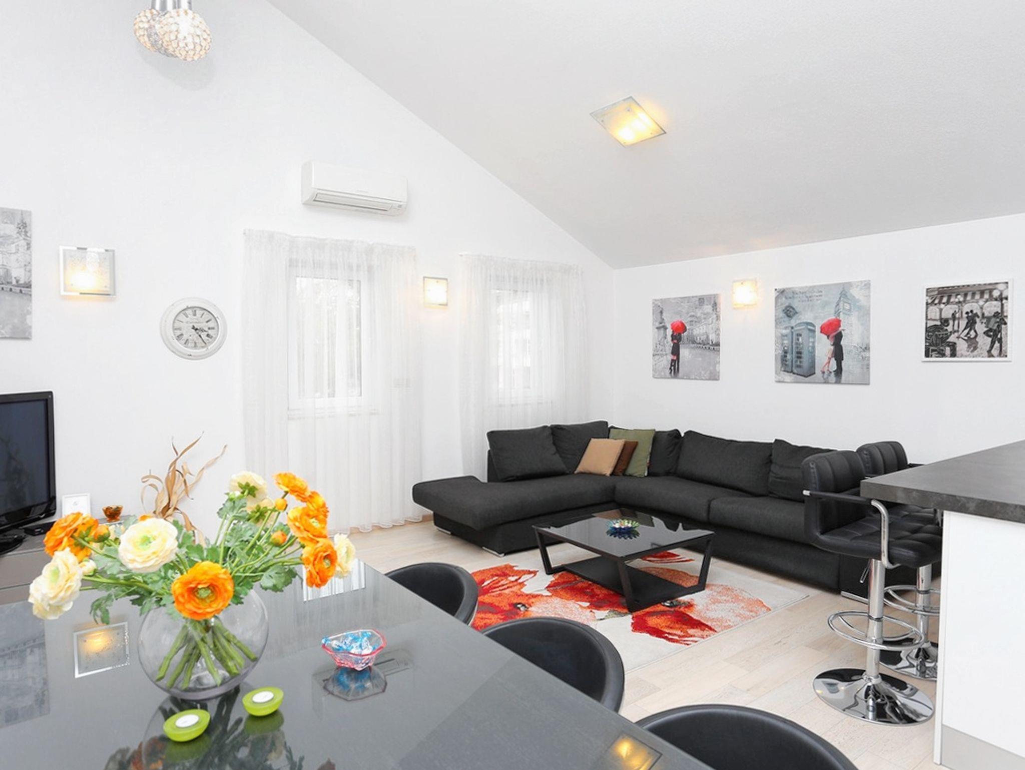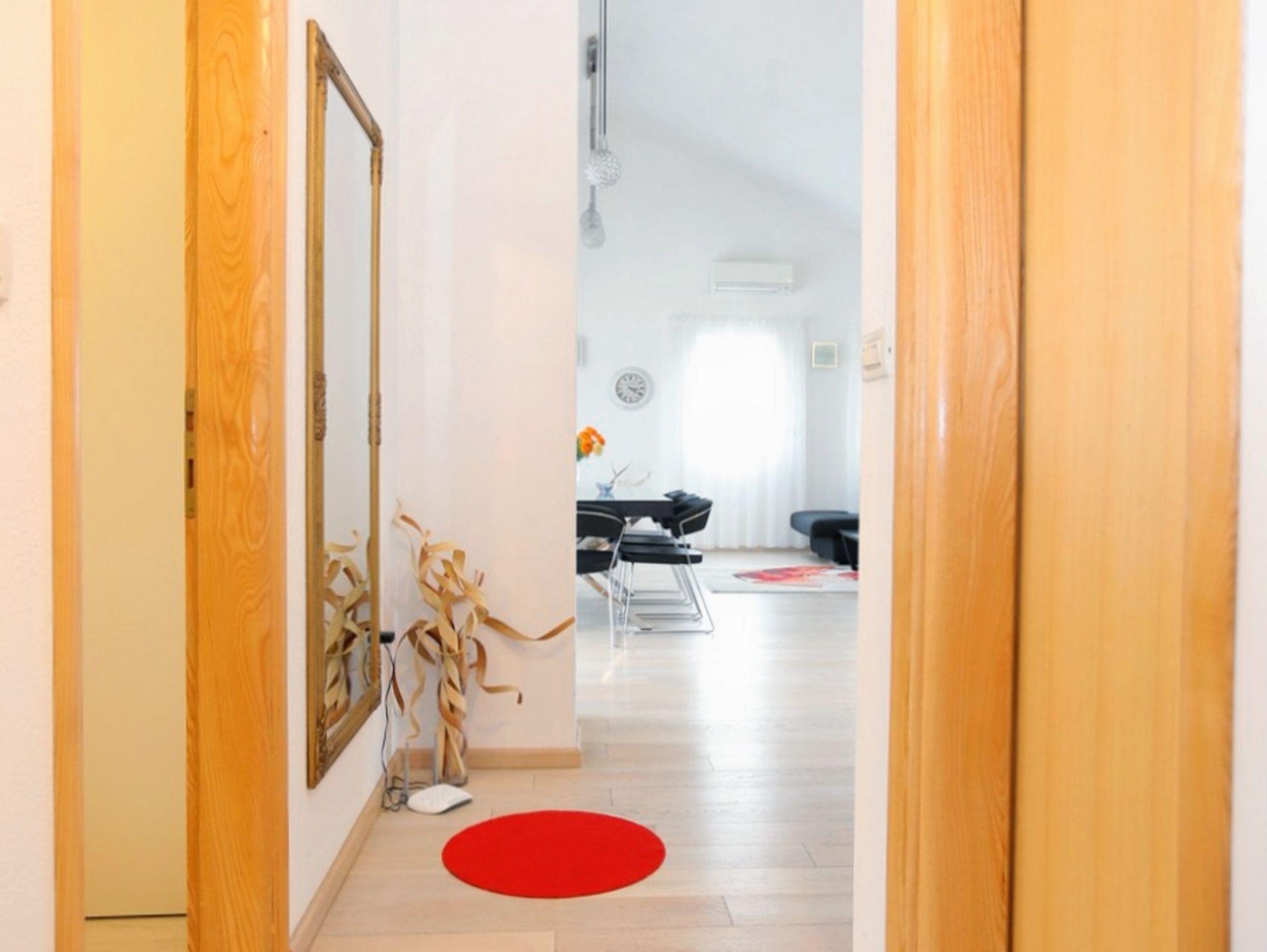 Ferienwohnung bietet Platz für 6 Gäste. Die Betten sind in Schlafzimmern, die es 2 gibt, und in Wohnzimmer, innerhalb einer Gesamtfläche von 81m2, angeordnet. Die Gäste haben eine eigene Terrasse zur Verfügung, auf der sie in warmen Sommernächten genießen können. Das Apartment bietet Meerblick. IM PREIS INBEGRIFFEN: Kurtaxe, Endreinigung, Klimatisierung, Parkplatz, Internet, Kinderbett, Bügeleisen, Bügelbrett, Föhn. VERBINDLICHE ZUSÄTZLICHE KOSTEN: Aufzahlung für Kurzaufenthalte (prozentualer Zuschlag pro Nächtigungsanzahl: 30% - 1, 20% - 2, 10% - 3). Die Verfügbarkeit zusätzlicher Dienstleistungen in Ihrem reservierten Termin und die Preise derselben (falls nicht aufgeführt) müssen im Voraus überprüft werden. Zusätzliche Dienstleistungen die in der Zahlungsaufforderung nicht aufgeführt sind werden direkt beim Vermieter bezahlt, angenommen der Gast nutzt auch diese. Ermäßigung auf den Grundpreis: Gratistag 14=13 (bei einem Aufenthalt von 14 Tagen oder mehr erhalten Sie einen Gratistag für den Aufenthalt bis 31.12.26).