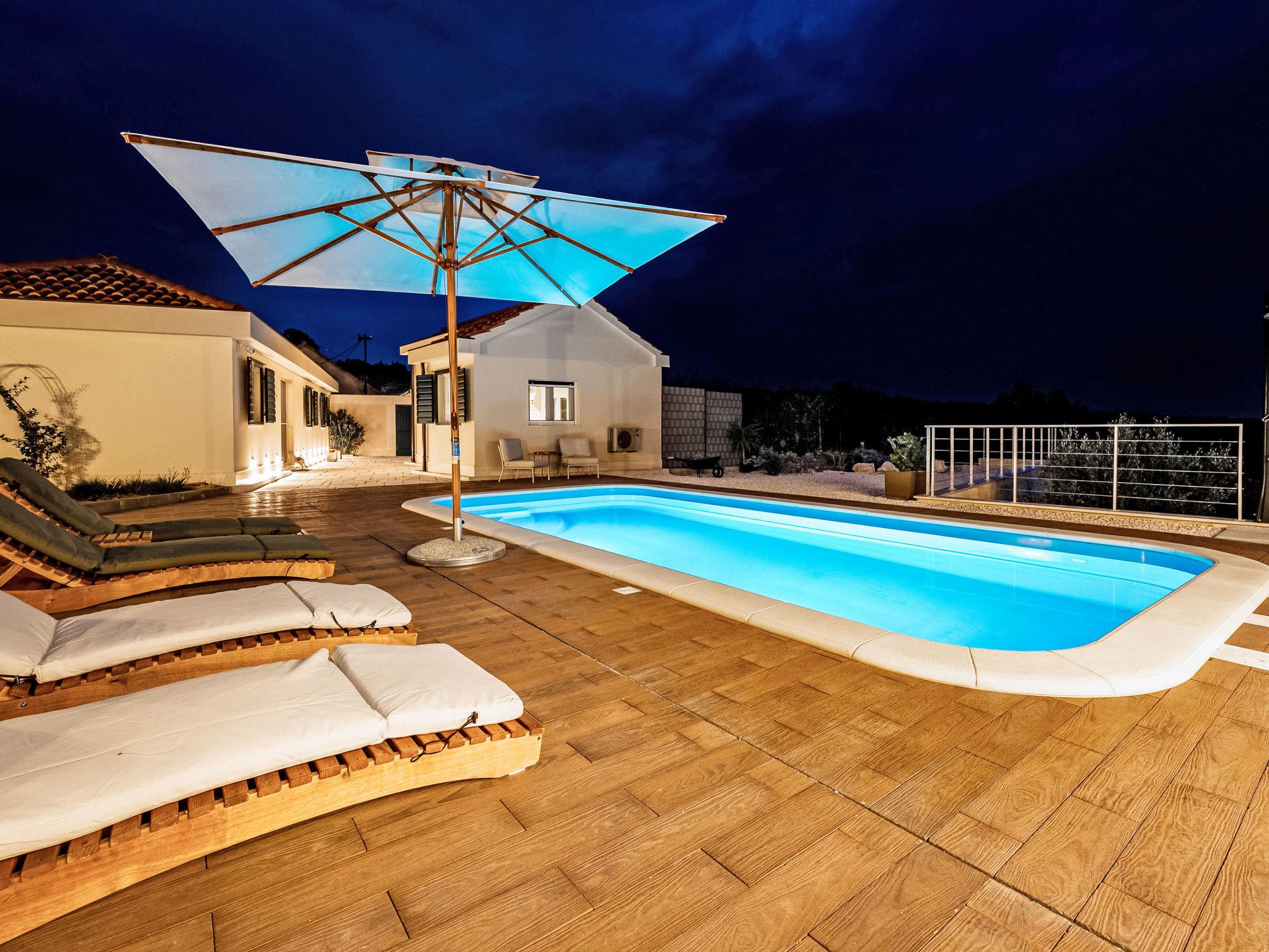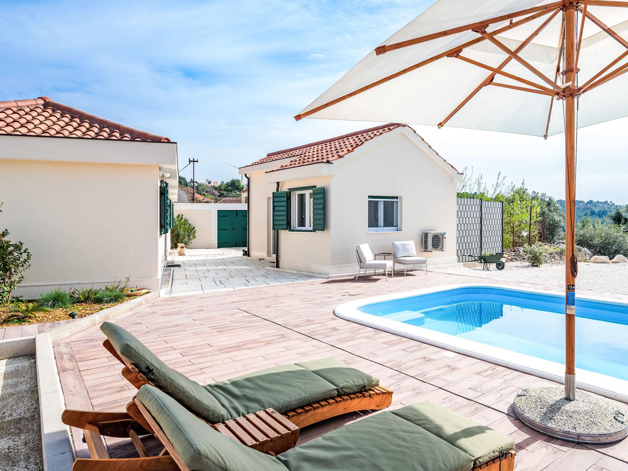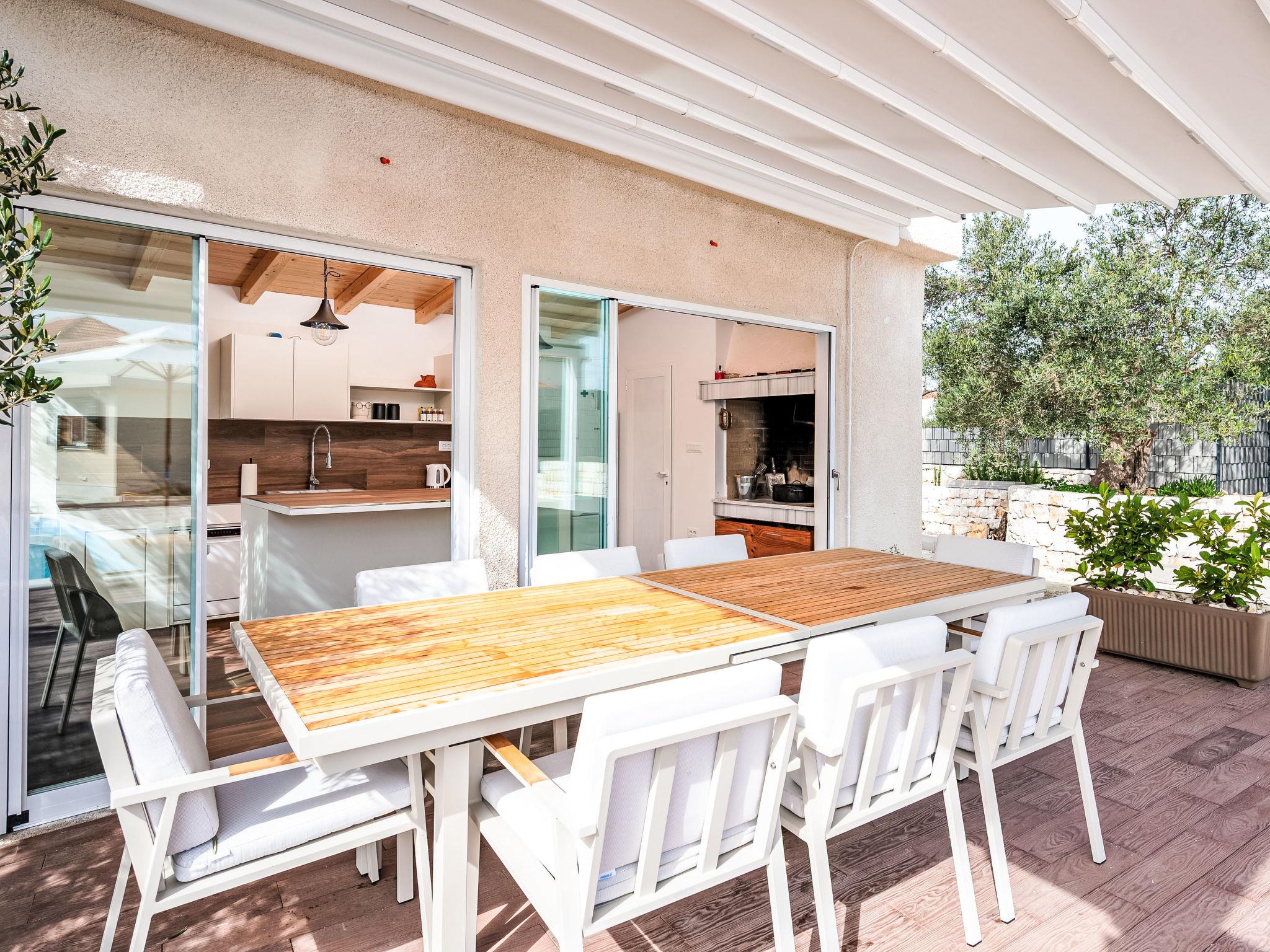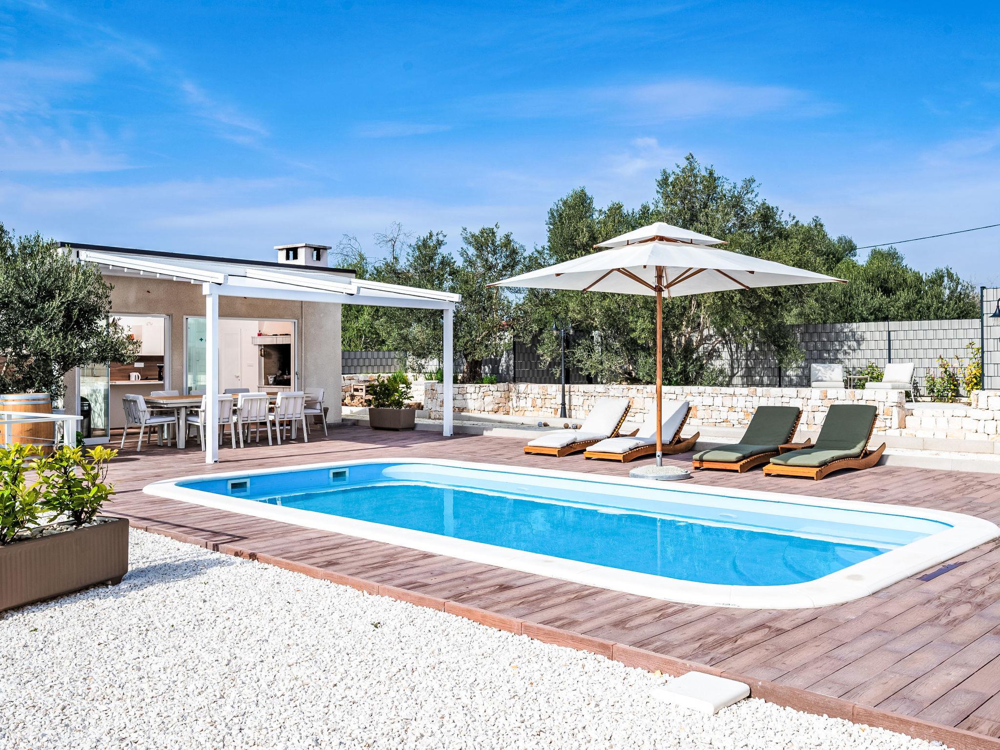 Beautiful single-family house "Hidden Gem". In the district of Žedno 4 km from the centre of Trogir, in a quiet, sunny position, 1.7 km from the sea, 1.7 km from the beach, in a cul-de-sac. Private: property 750 m2 (fenced), swimming pool angular, heated (7 x 4 m, 26 m2, depth 150 cm, seasonal availability: 01.May. - 01.Oct.). WC in the pool area, outdoor shower, table tennis, boules, terrace (17 m2), garden furniture, barbecue house. In the house: internet access, washing machine. Parking (for 2 cars) at the house on the premises. Shop 1.6 km, supermarket 5 km, restaurant 1.6 km, café 1.6 km, bus stop 400 m, pebble beach 1.7 km. Marina 7 m, golf course (9 hole) 25 km.