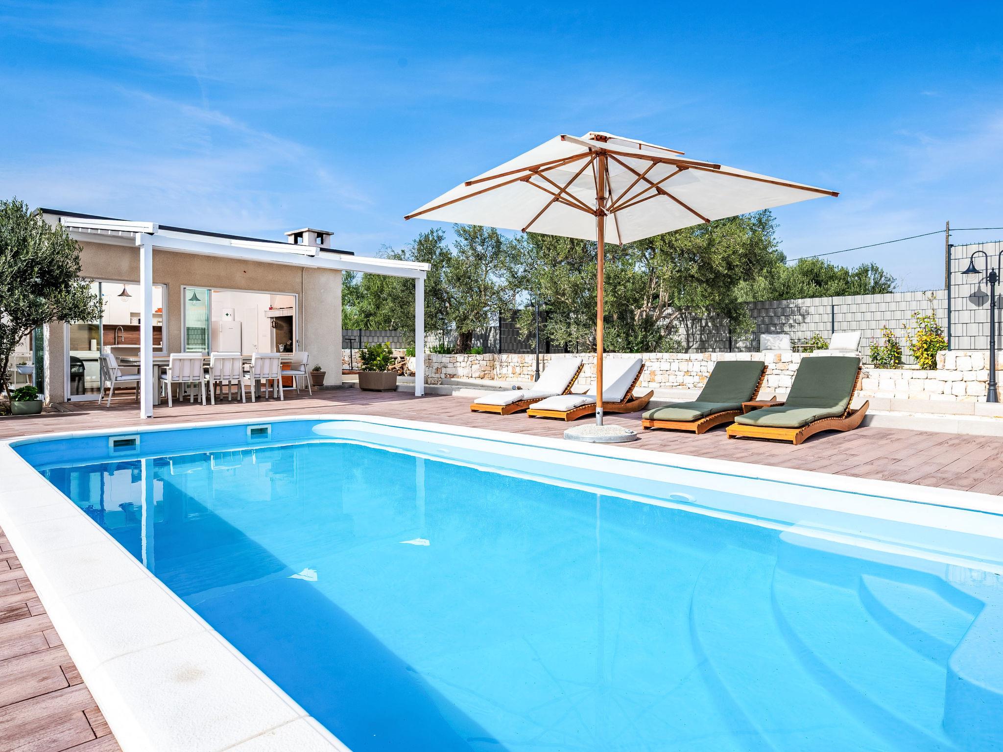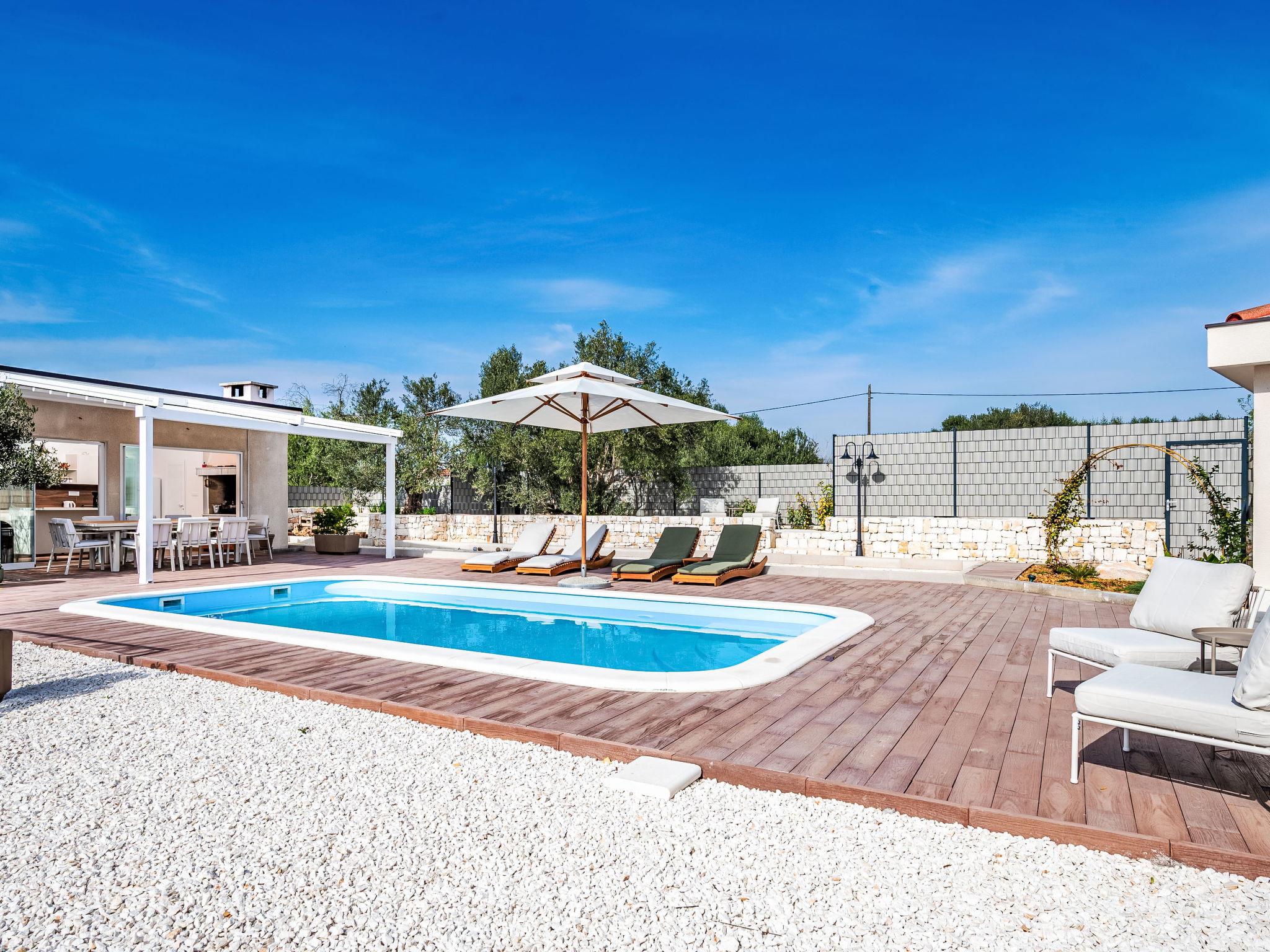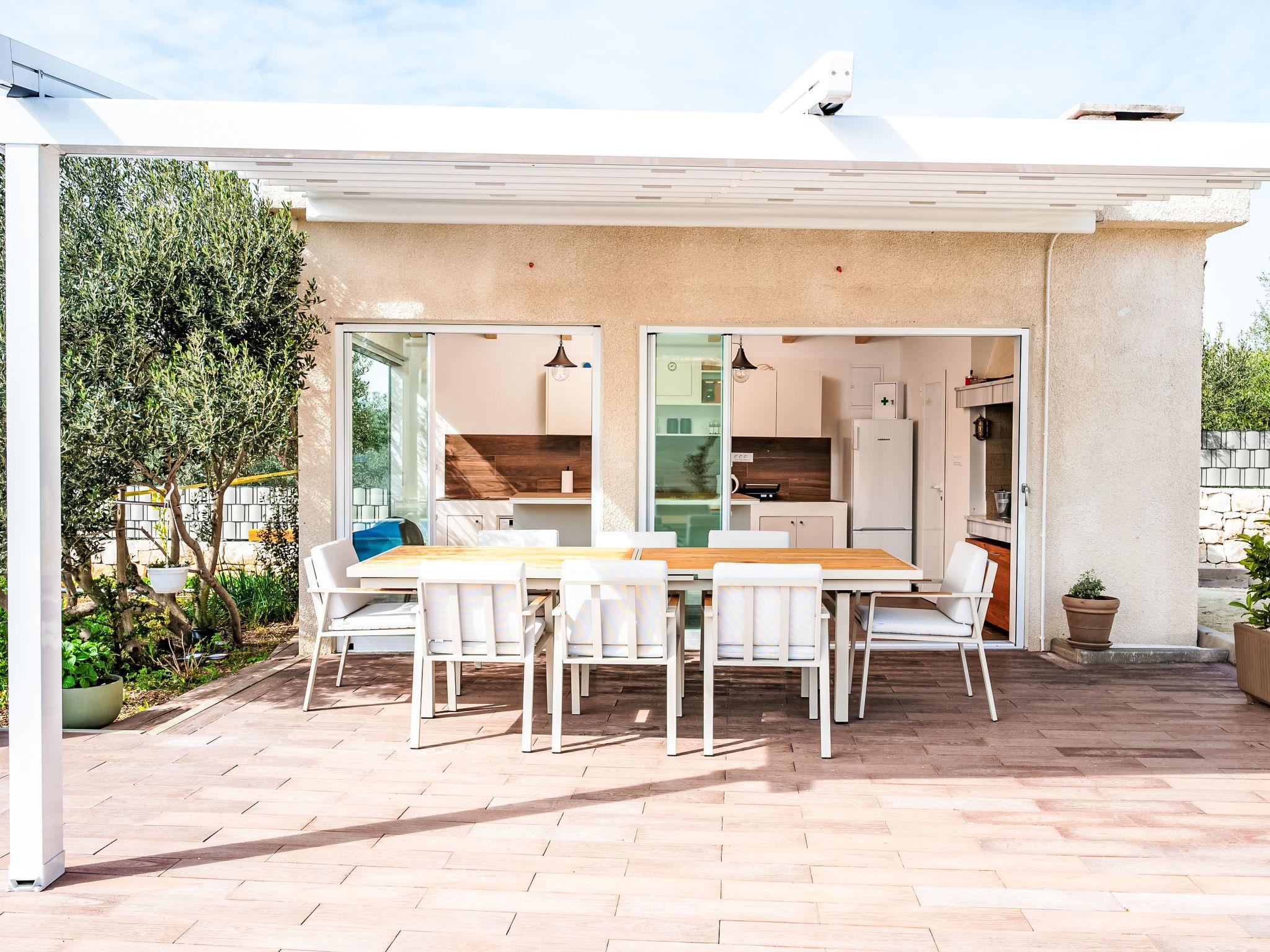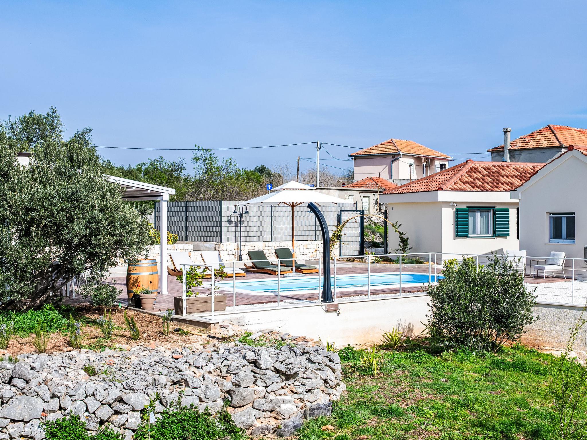 Beautiful single-family house "Hidden Gem". In the district of Žedno 4 km from the centre of Trogir, in a quiet, sunny position, 1.7 km from the sea, 1.7 km from the beach, in a cul-de-sac. Private: property 750 m2 (fenced), swimming pool angular, heated (7 x 4 m, 26 m2, depth 150 cm, seasonal availability: 01.May. - 01.Oct.). WC in the pool area, outdoor shower, table tennis, boules, terrace (17 m2), garden furniture, barbecue house. In the house: internet access, washing machine. Parking (for 2 cars) at the house on the premises. Shop 1.6 km, supermarket 5 km, restaurant 1.6 km, café 1.6 km, bus stop 400 m, pebble beach 1.7 km. Marina 7 m, golf course (9 hole) 25 km.