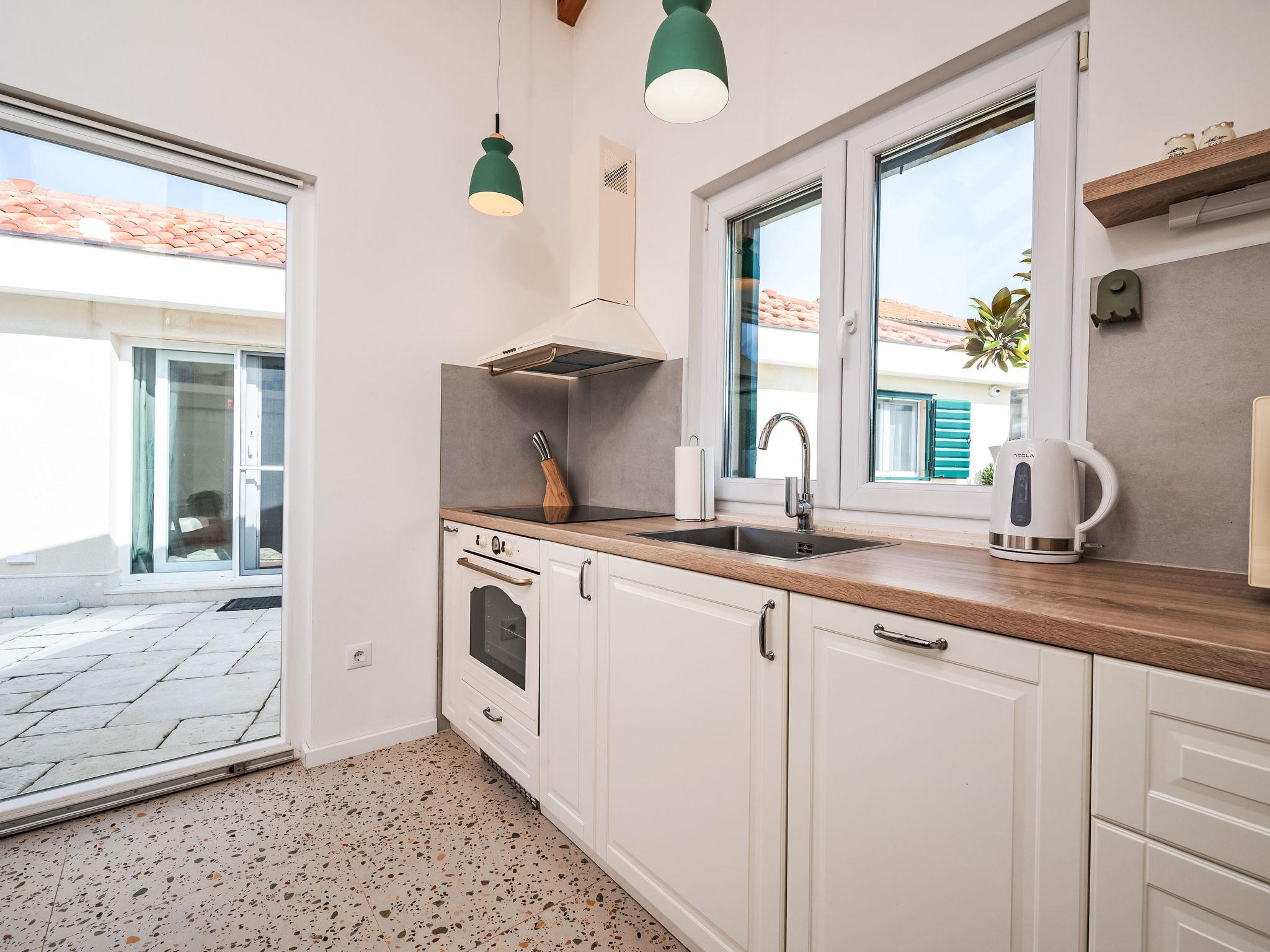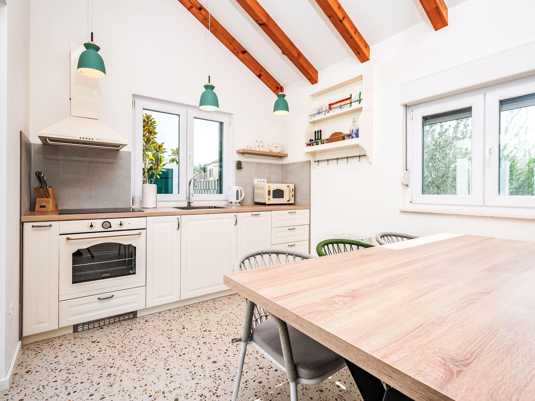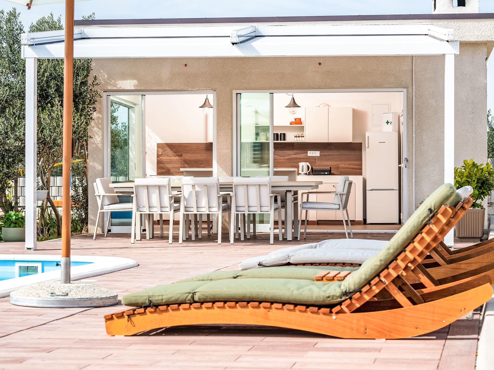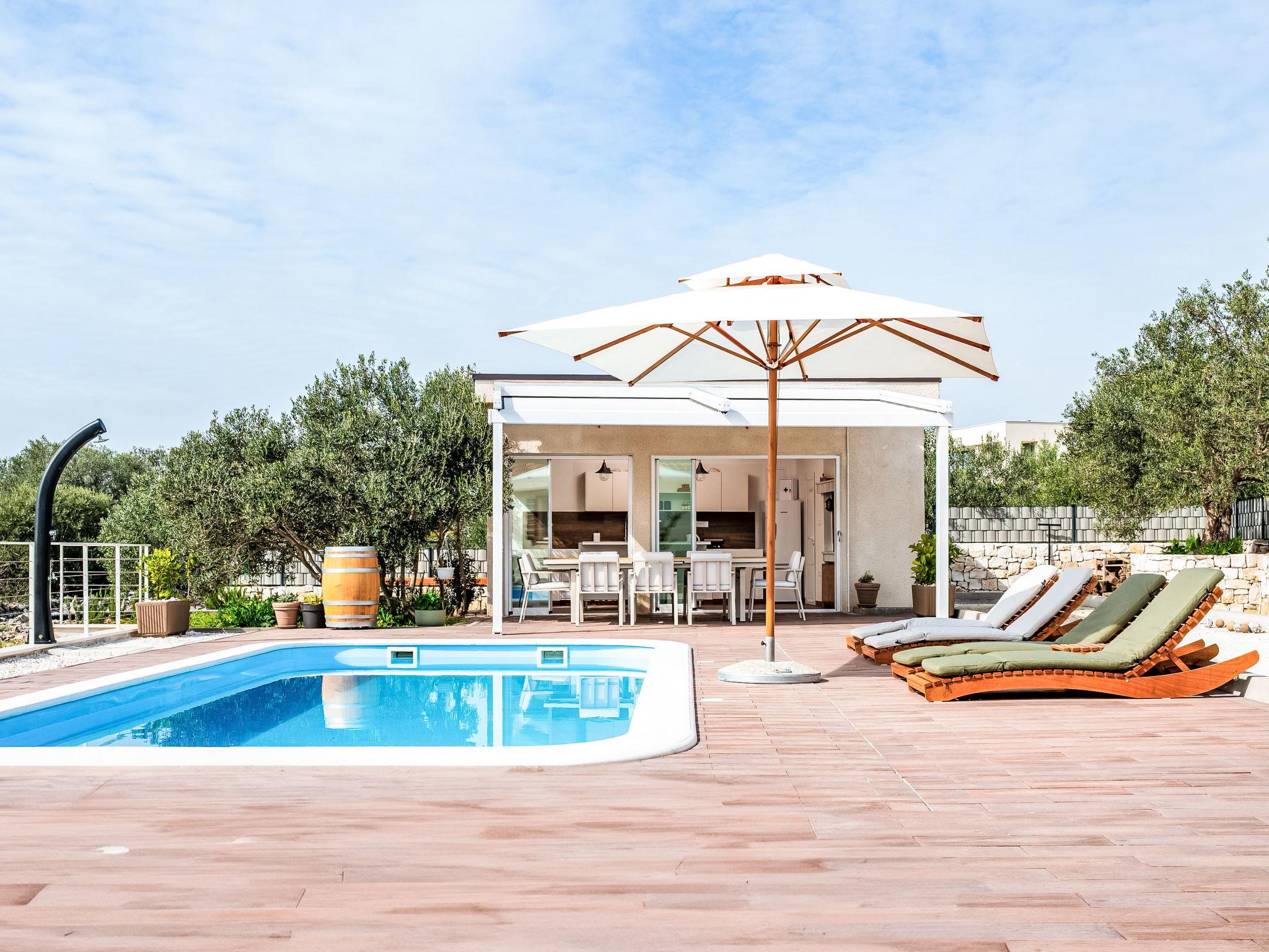 Beautiful single-family house "Hidden Gem". In the district of Žedno 4 km from the centre of Trogir, in a quiet, sunny position, 1.7 km from the sea, 1.7 km from the beach, in a cul-de-sac. Private: property 750 m2 (fenced), swimming pool angular, heated (7 x 4 m, 26 m2, depth 150 cm, seasonal availability: 01.May. - 01.Oct.). WC in the pool area, outdoor shower, table tennis, boules, terrace (17 m2), garden furniture, barbecue house. In the house: internet access, washing machine. Parking (for 2 cars) at the house on the premises. Shop 1.6 km, supermarket 5 km, restaurant 1.6 km, café 1.6 km, bus stop 400 m, pebble beach 1.7 km. Marina 7 m, golf course (9 hole) 25 km.