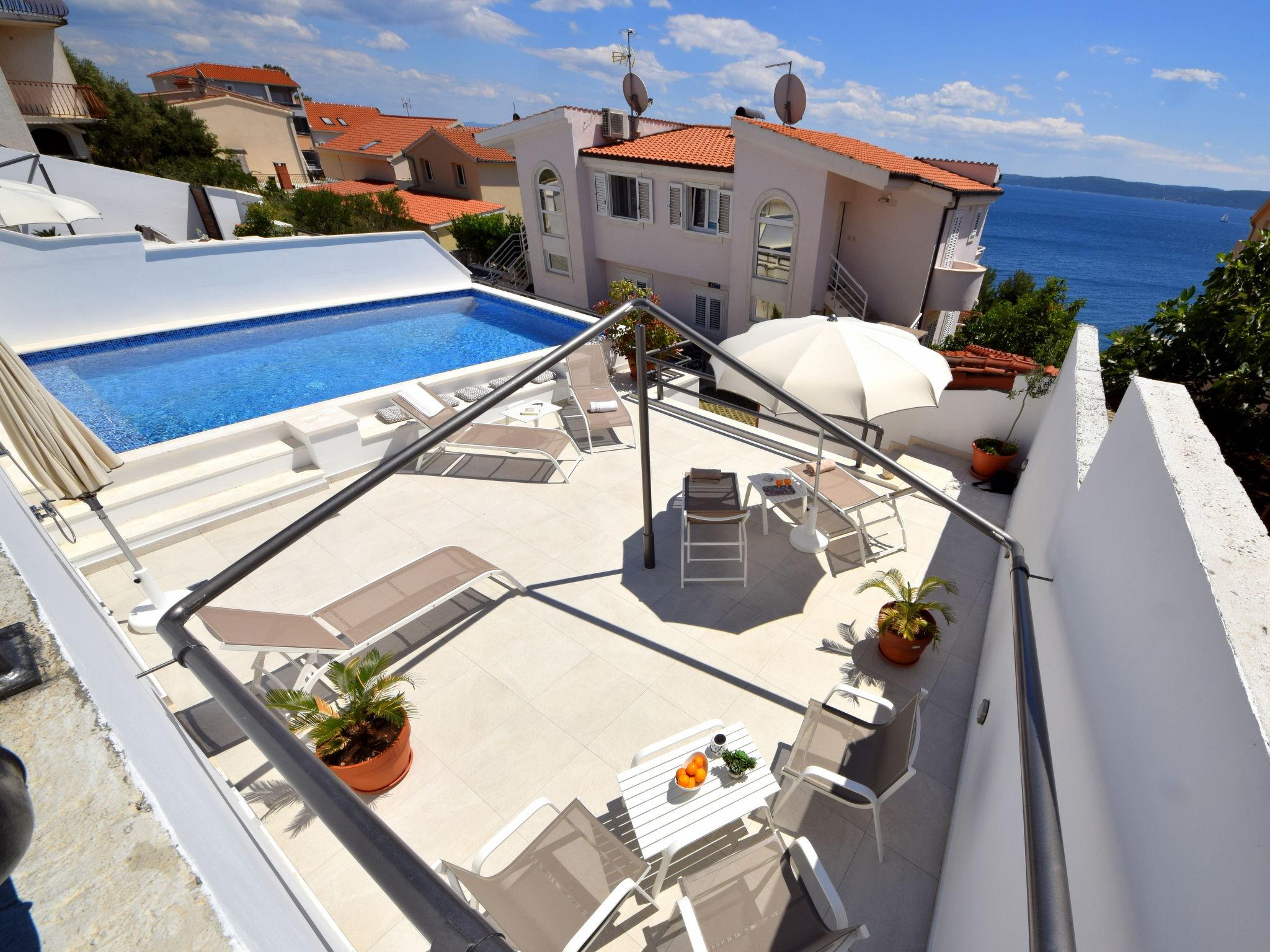 Okrug Gornji (Ciovo) 6 km from Trogir: Apartment house "Villa Meri". 1.5 km from the centre of Okrug Gornji, in a quiet, sunny, elevated position, 60 m from the sea, 60 m from the beach. For shared use: swimming pool angular (7 x 4 m, 30 m2, depth 140 cm, seasonal availability: 01.May. - 15.Oct.) with internal staircase. Outdoor shower, terrace (60 m2), garden furniture, barbecue. In the house: internet access. Motor access to the house. Parking at 100 m on the premises. Shop 250 m, restaurant 200 m, bus stop 1.8 km, pebble beach 150 m, rocky beach 60 m. Please note: airfield 6 km from the property. Additional accommodations can be booked. Property ref. HR4910.303 is situated on the same property.