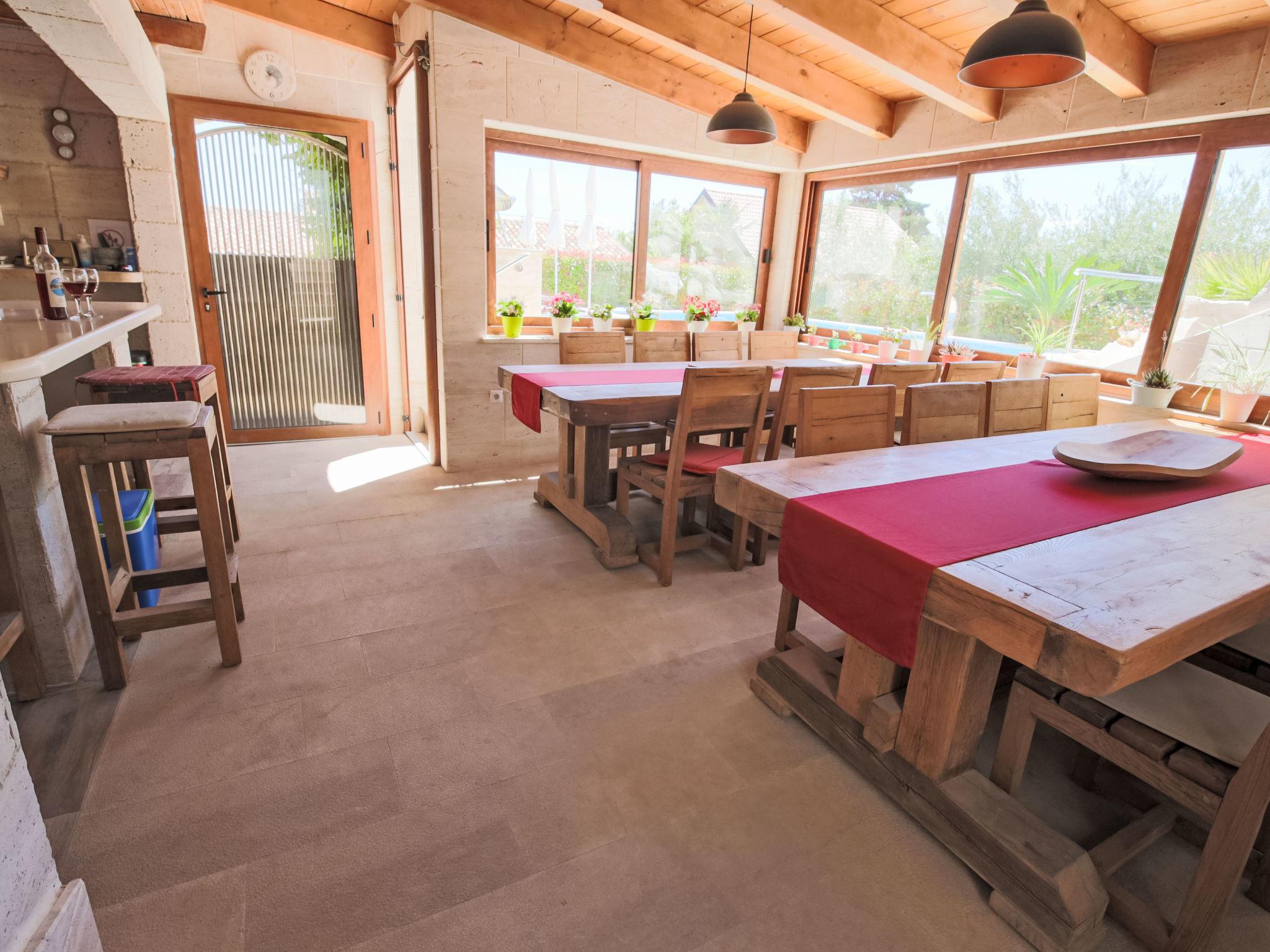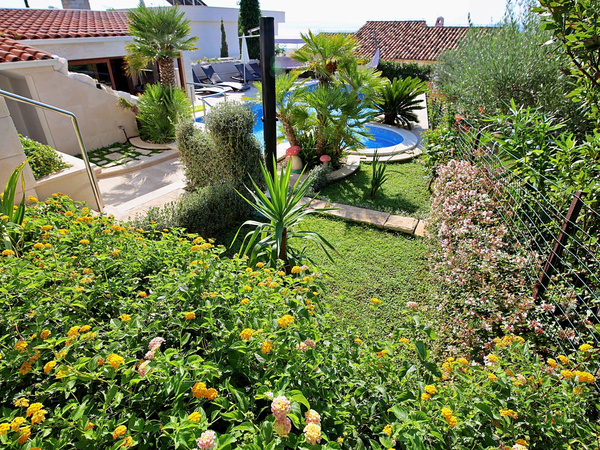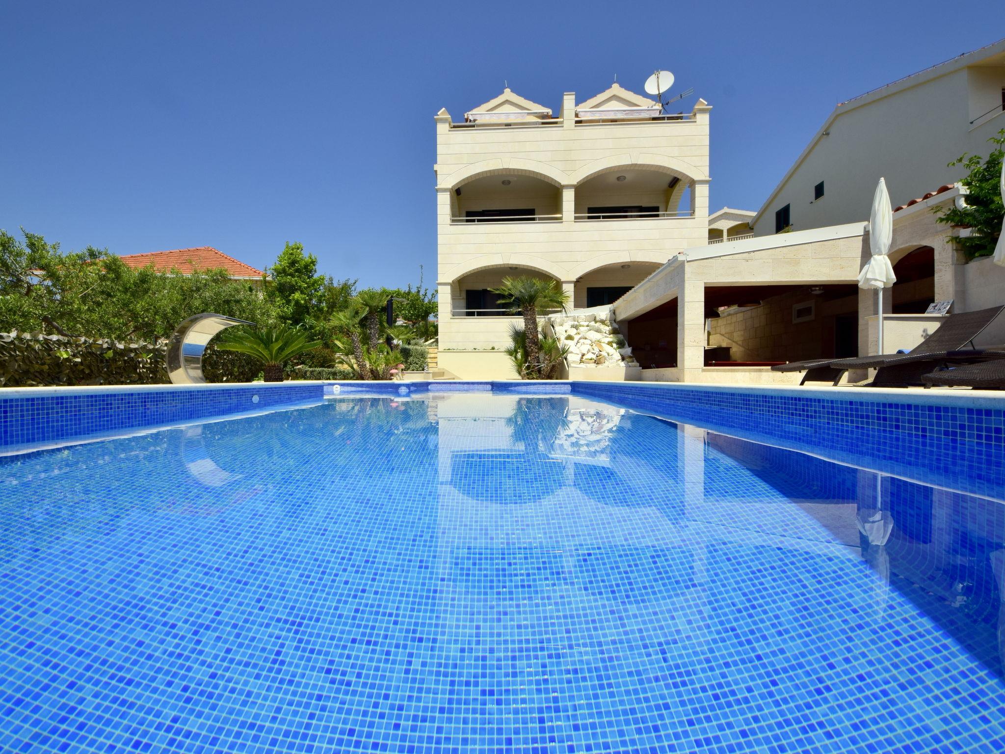 Okrug Gornji (Ciovo), 6 km from Trogir: Beautiful apartment house "Villa Andjelka". 1 km from the centre of Okrug Gornji, in a quiet, sunny, elevated position, 50 m from the sea, 50 m from the beach. For shared use: property, swimming pool heated (38 m2, depth 130 - 160 cm, seasonal availability: 25.Apr. - 03.Oct.) with internal staircase. WC in the pool area, outdoor shower, poolhouse with fridge, terrace, garden furniture, barbecue. In the house: internet access, sauna (extra). Washing machine, tumble dryer. Towel change 2 times per week. Parking at the house on the premises. E-charging station. Shop 200 m, restaurant 1 km, café 1 km, bus stop 1.7 km, pebble beach 500 m, rocky beach 50 m. Please note: Additional accommodations can be booked. Swimming pool with counterflow, geysir and hydromassage. For shared use: outdoor kitchen (fridge, ice maker, coffee machine, dishwasher).