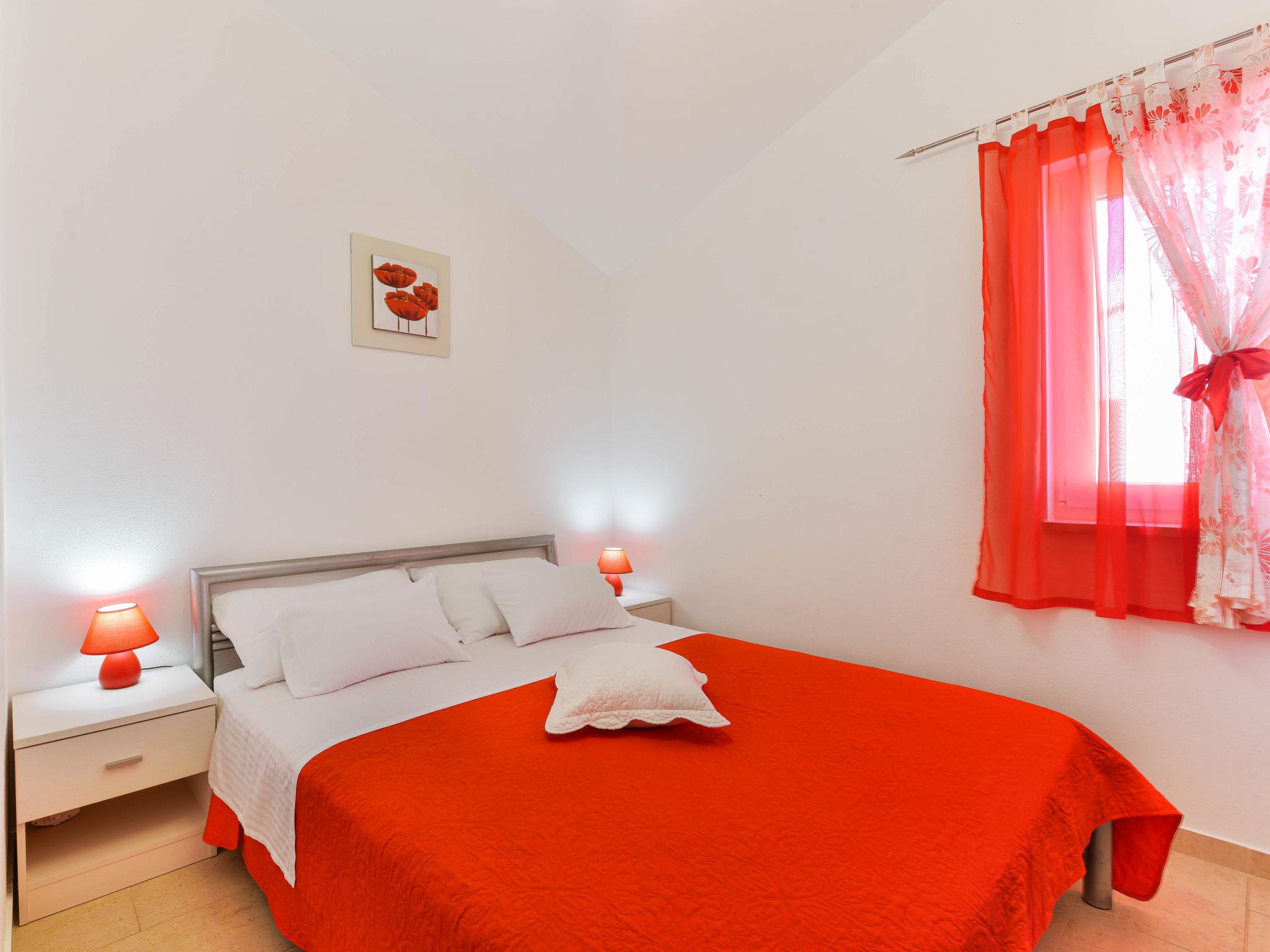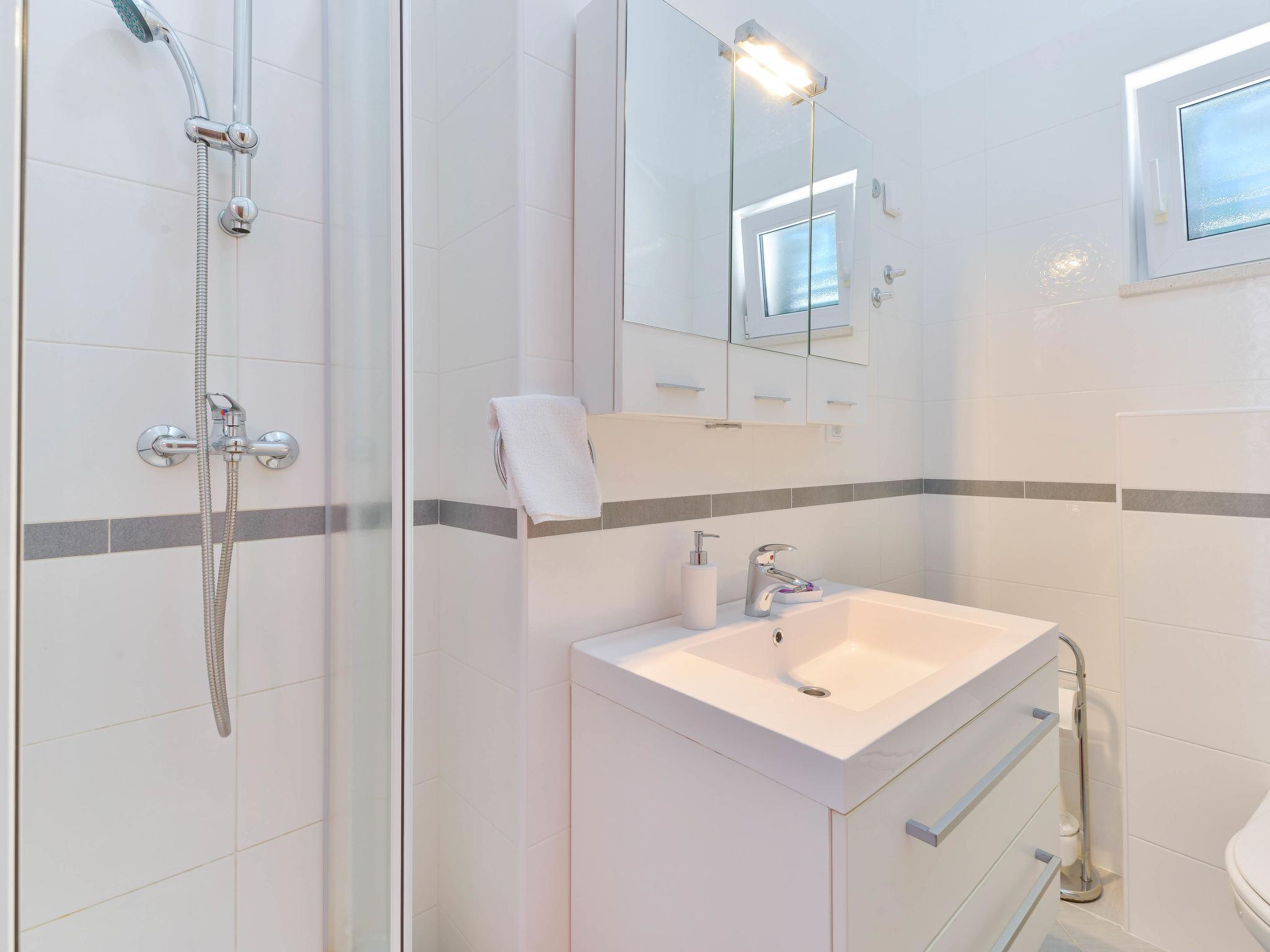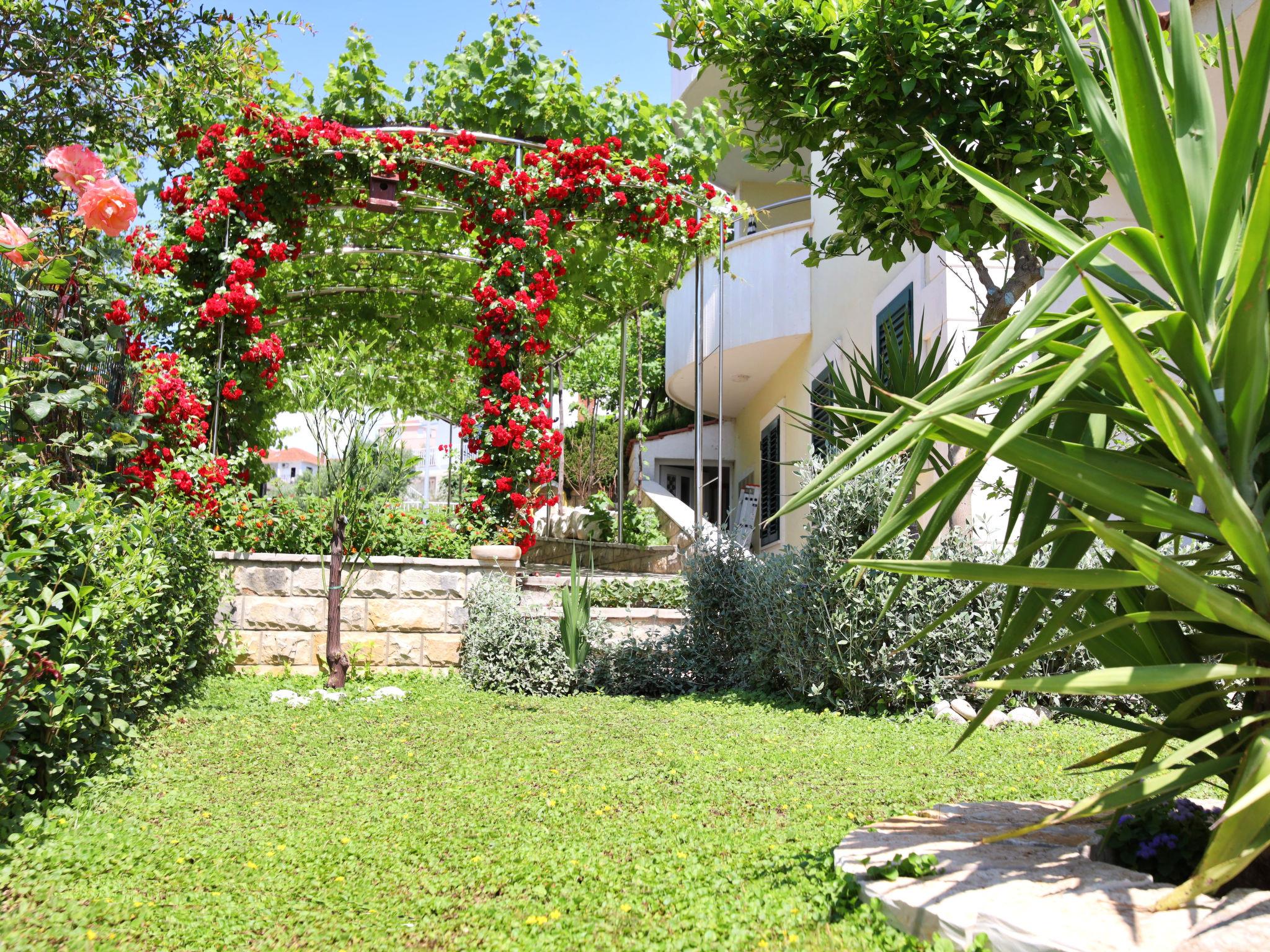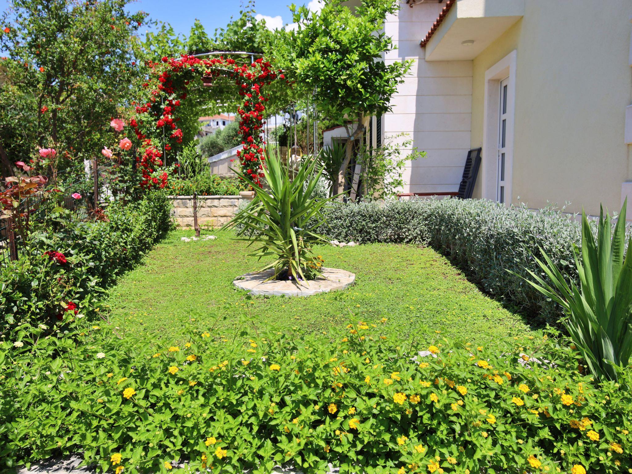 Okrug Gornji (Ciovo), 6 km from Trogir: Beautiful apartment house "Villa Andjelka". 1 km from the centre of Okrug Gornji, in a quiet, sunny, elevated position, 50 m from the sea, 50 m from the beach. For shared use: property, swimming pool heated (38 m2, depth 130 - 160 cm, seasonal availability: 25.Apr. - 03.Oct.) with internal staircase. WC in the pool area, outdoor shower, poolhouse with fridge, terrace, garden furniture, barbecue. In the house: internet access, sauna (extra). Washing machine, tumble dryer. Towel change 2 times per week. Parking at the house on the premises. E-charging station. Shop 200 m, restaurant 1 km, café 1 km, bus stop 1.7 km, pebble beach 500 m, rocky beach 50 m. Please note: Additional accommodations can be booked. Swimming pool with counterflow, geysir and hydromassage. For shared use: outdoor kitchen (fridge, ice maker, coffee machine, dishwasher).