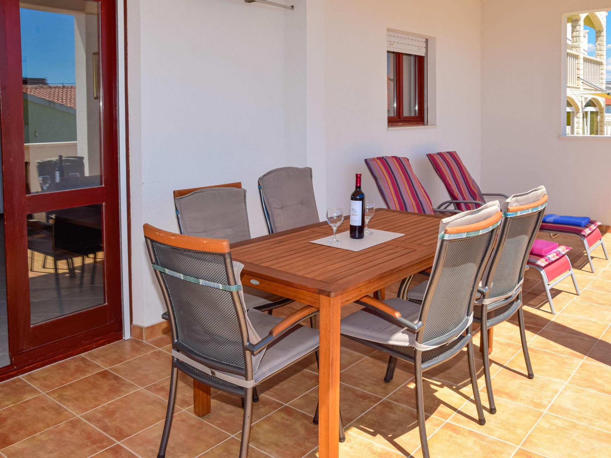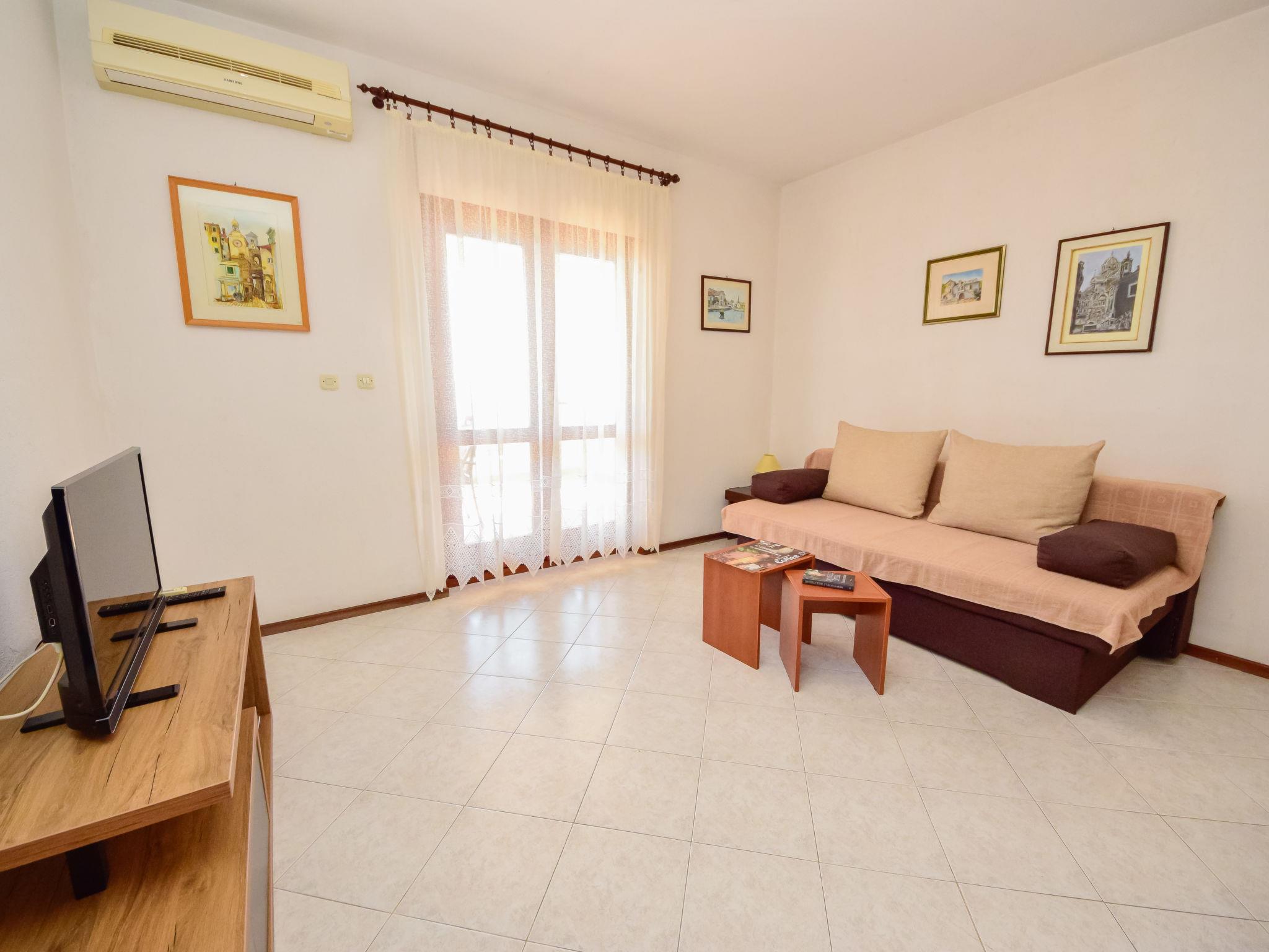 4-room apartment 90 m2 on 1st floor. Cosy furnishings: living/dining room 32 m2 with satellite TV and air conditioning. Exit to the terrace. 2 double bedrooms. 1 room with 1 bed (90 cm, length 190 cm). Kitchenette (4 hot plates, oven, freezer, electric coffee machine). Bath/bidet/WC, sep. WC. Large terrace 27 m2, roofed, south facing position. Terrace furniture, deck chairs (2). Marvellous view of the sea. Facilities: baby cot. Internet (WiFi, free). Internet WiFi available only in the period 01.05.-31.10.