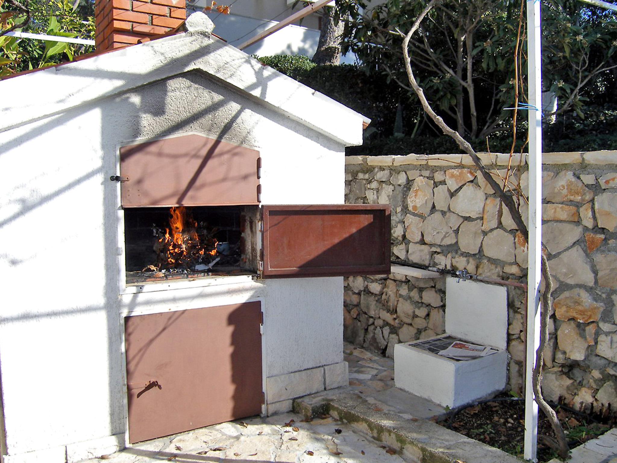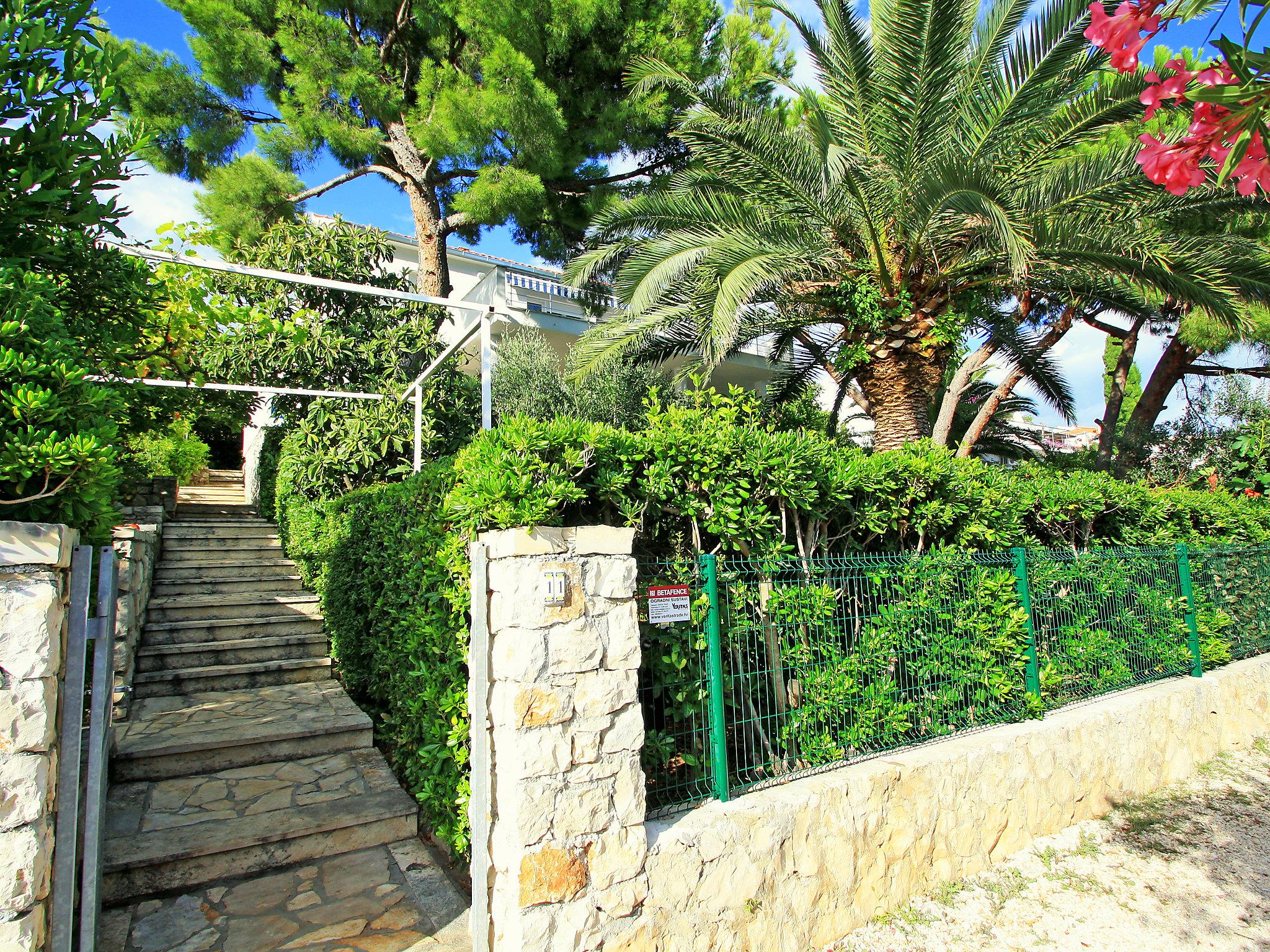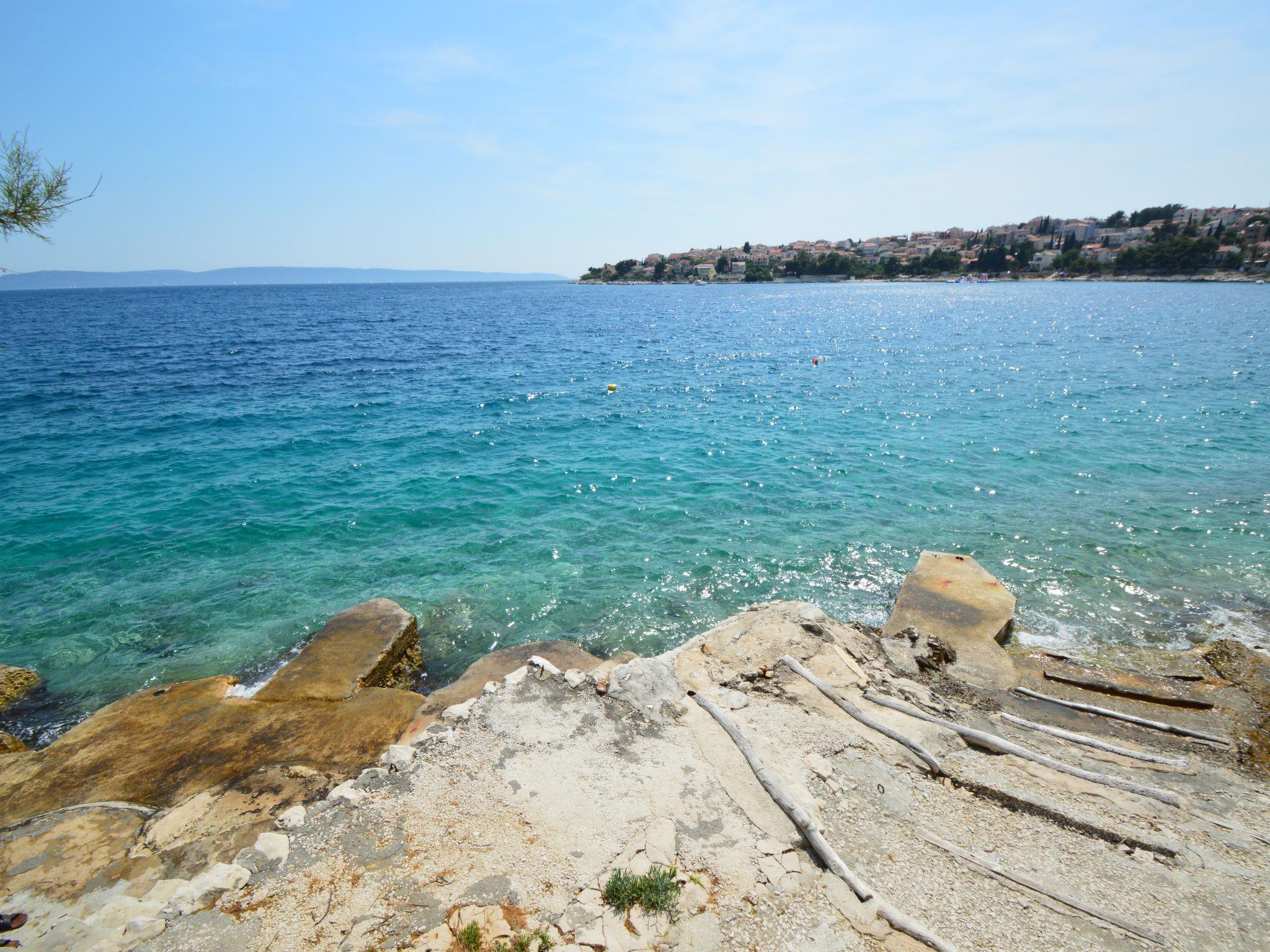 Okrug Gornji (Ciovo) 7 km from Trogir: 2-family house "Amiela", surrounded by trees. In the district of Mavarstica 1.5 km from the centre of Okrug Gornji, in a quiet, sunny position, 15 m from the sea, 15 m from the beach, in the countryside. For shared use: terraced garden (fenced) with flowers and trees. Outdoor shower, barbecue. In the house: internet access. Footpath (20 steps) to the house. Roofed, parking at 60 m on the premises. Shop 1.5 km, restaurant 1.5 km, bus stop 1.7 km, pebble beach 250 m, rocky beach 20 m, diving center 600 m, concrete beach 15 m.